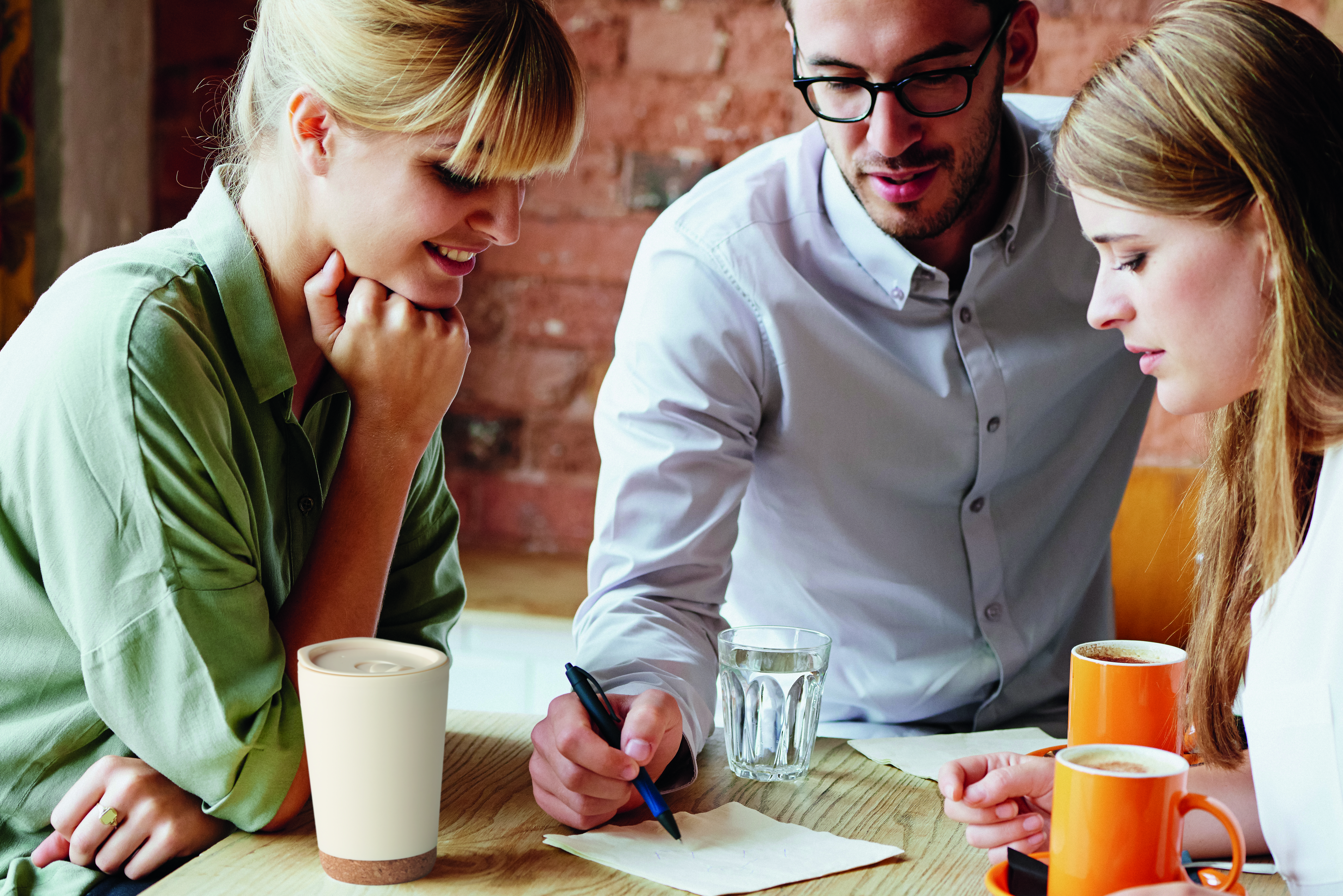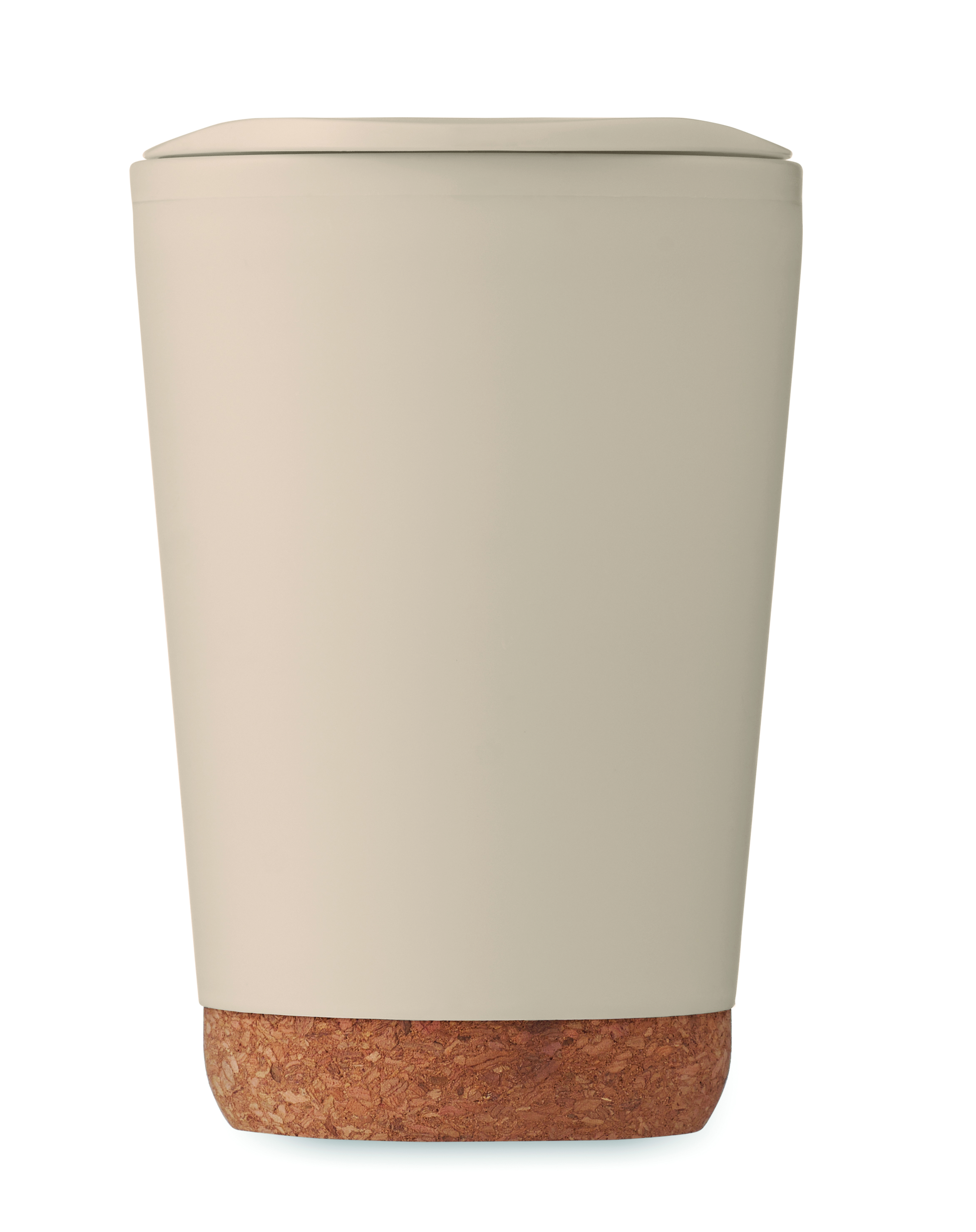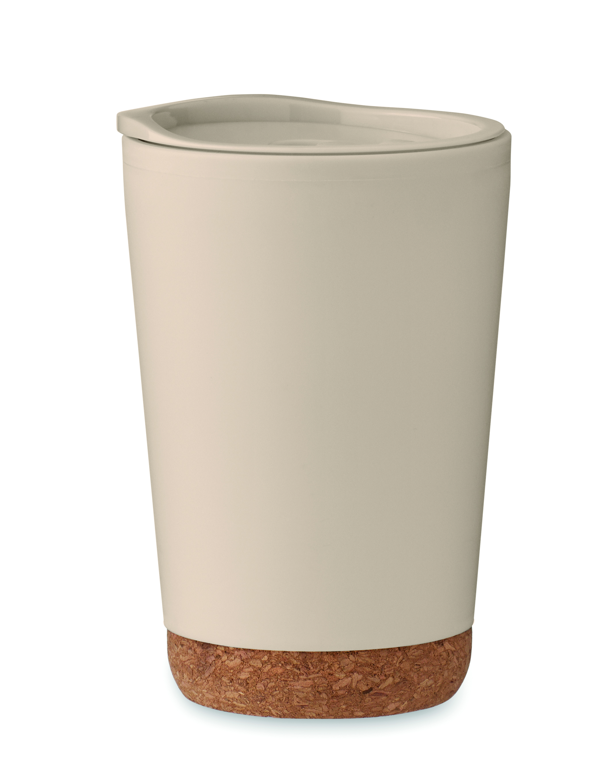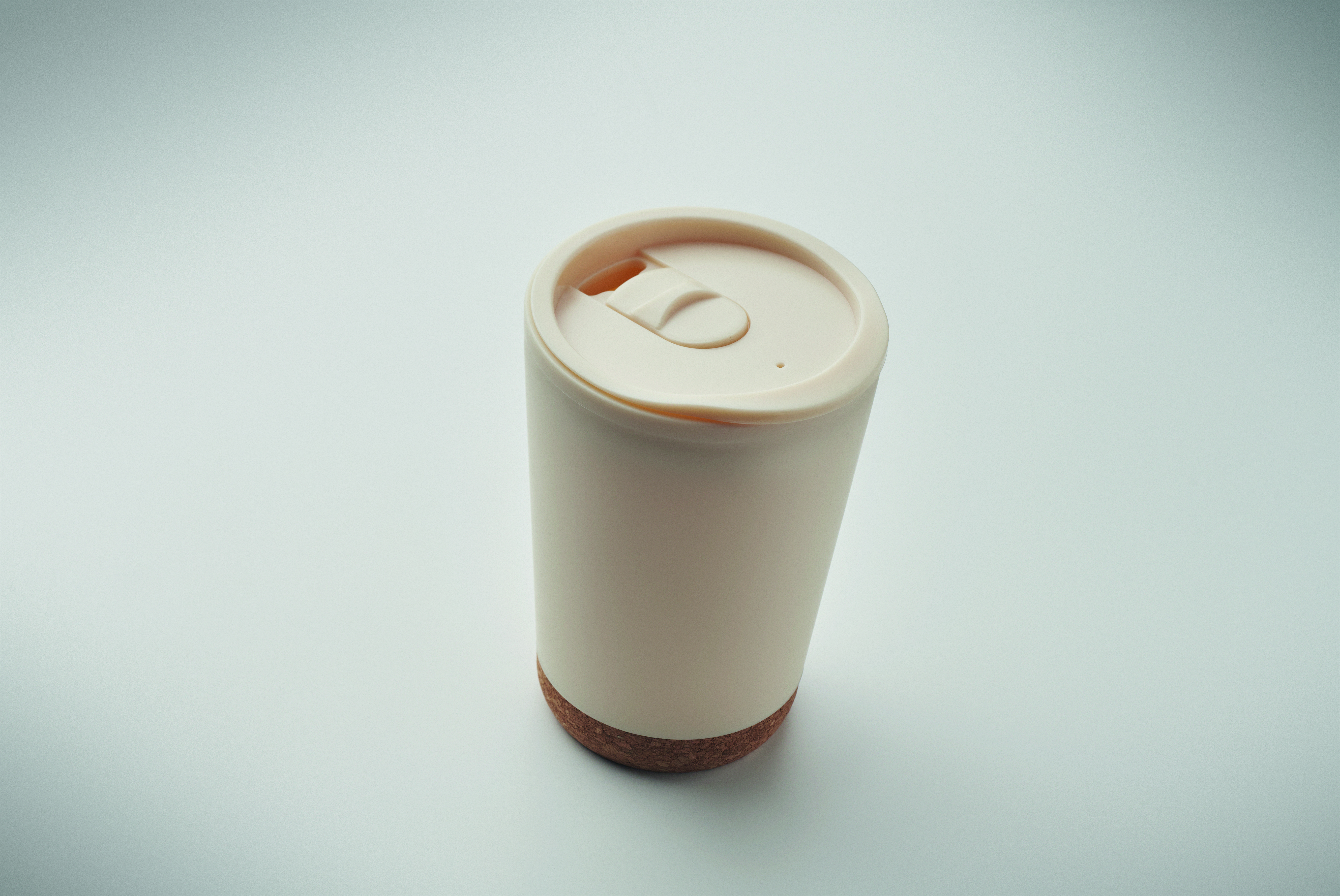 Kubek o podwójnych ściankach z PP z korkową podstawą i zamykaną pokrywką z ustnikiem z PS. Pojemność: 300 ml.