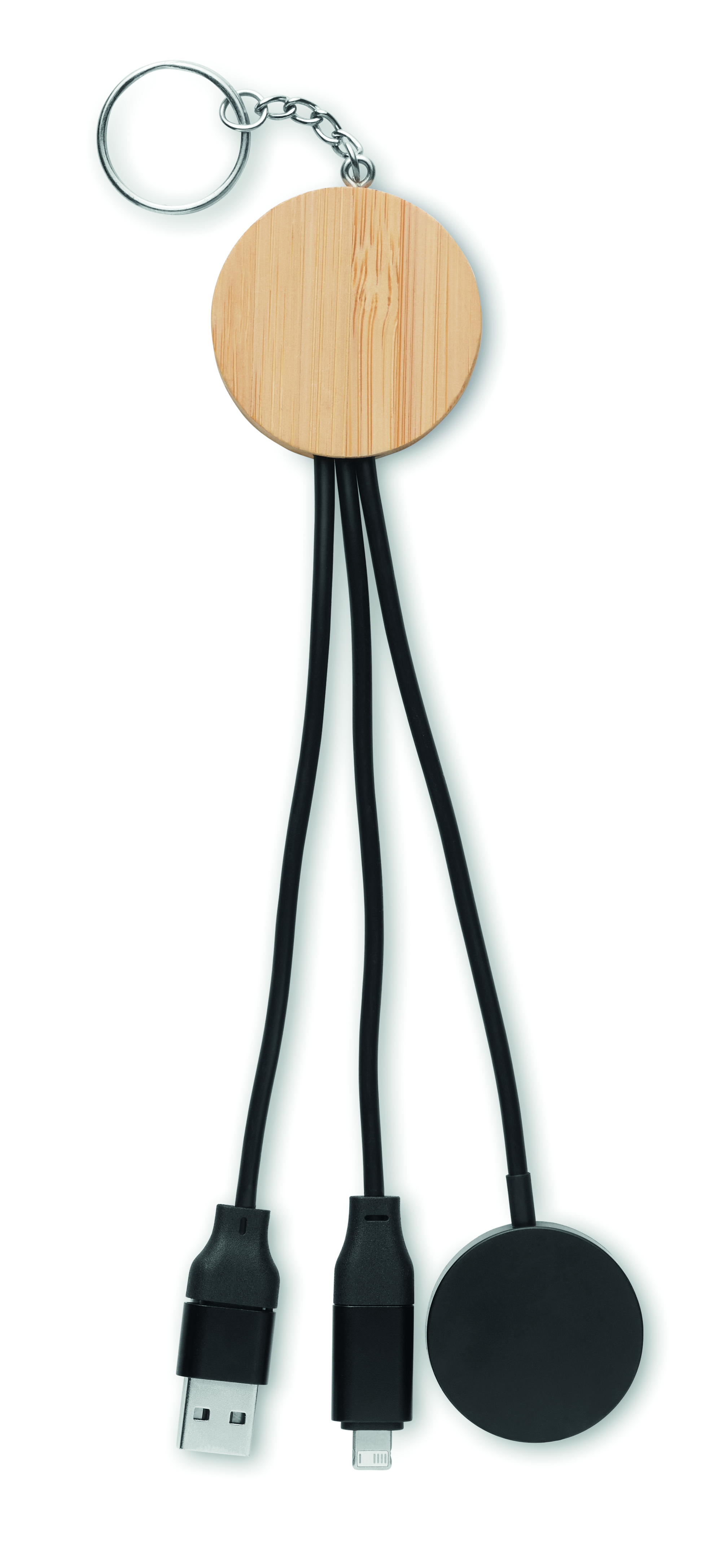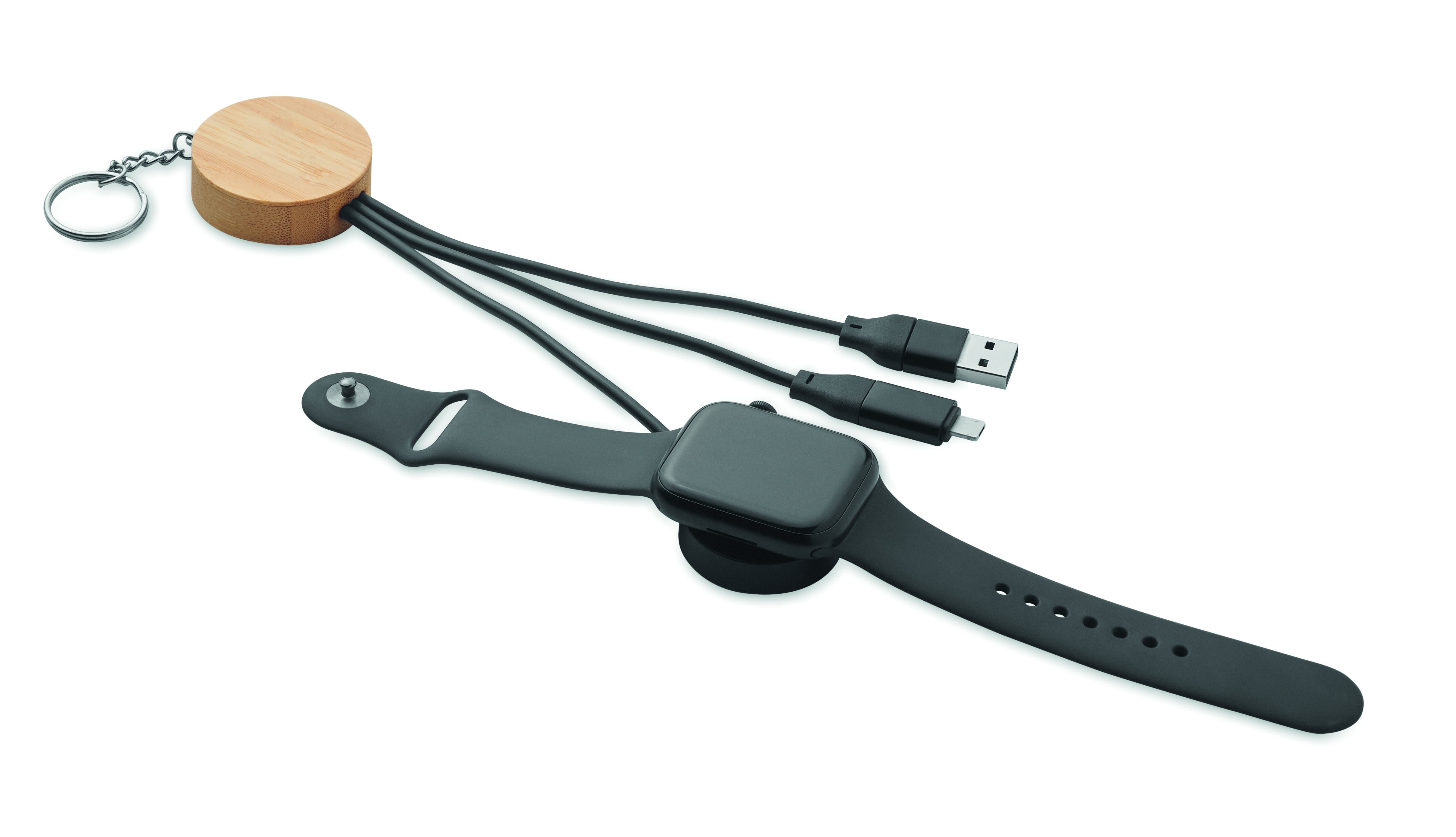 Kabel do ładowania 4 w 1 z bambusowymi detalami. Wejście: 2-w-1 Typ-C i Typ-A. Wyjście: Ładowanie zegarka (Samsung® i Apple®), typ-C i micro-B (2 w 1 pin).