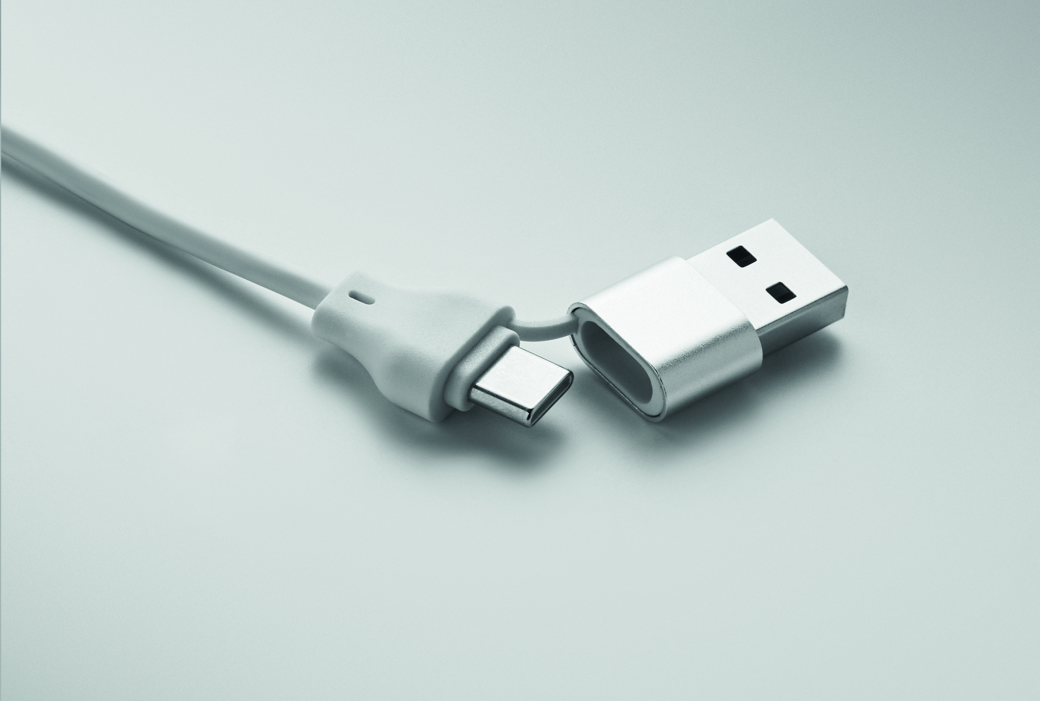 Kabel do ładowania 4 w 1 z bambusowymi detalami. Wejście: 2-w-1 Typ-C i Typ-A. Wyjście: Ładowanie zegarka (Samsung® i Apple®), typ-C i micro-B (2 w 1 pin).