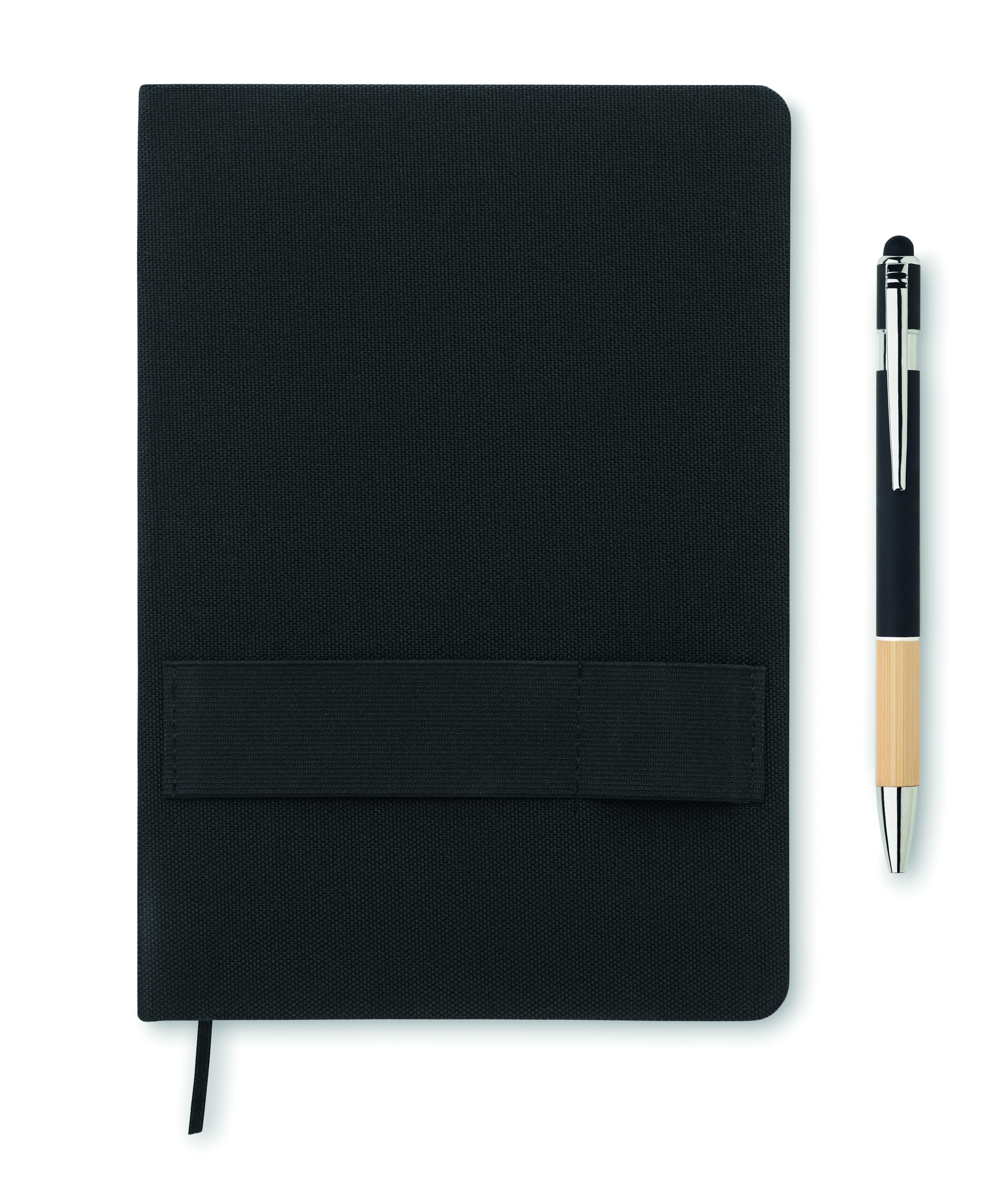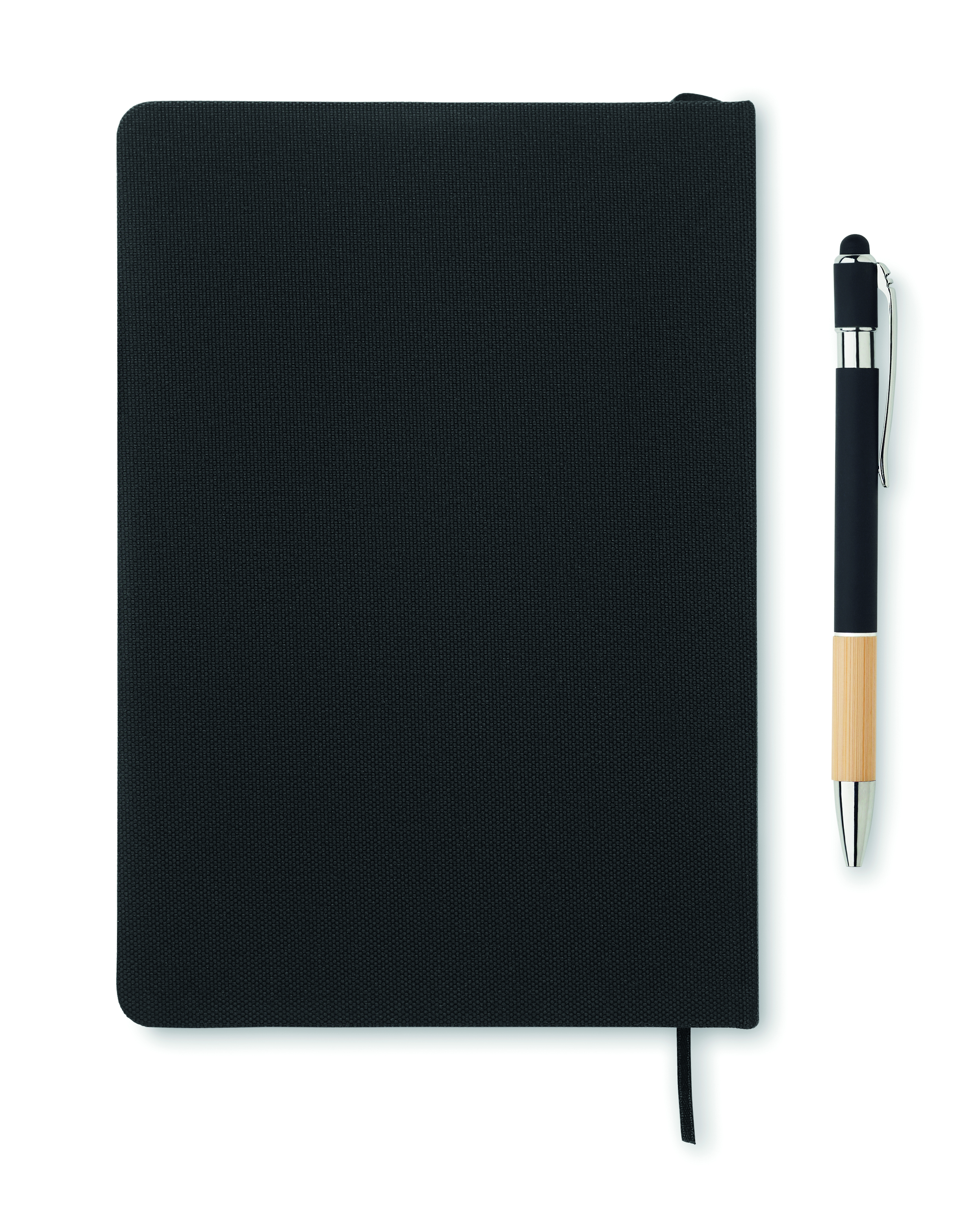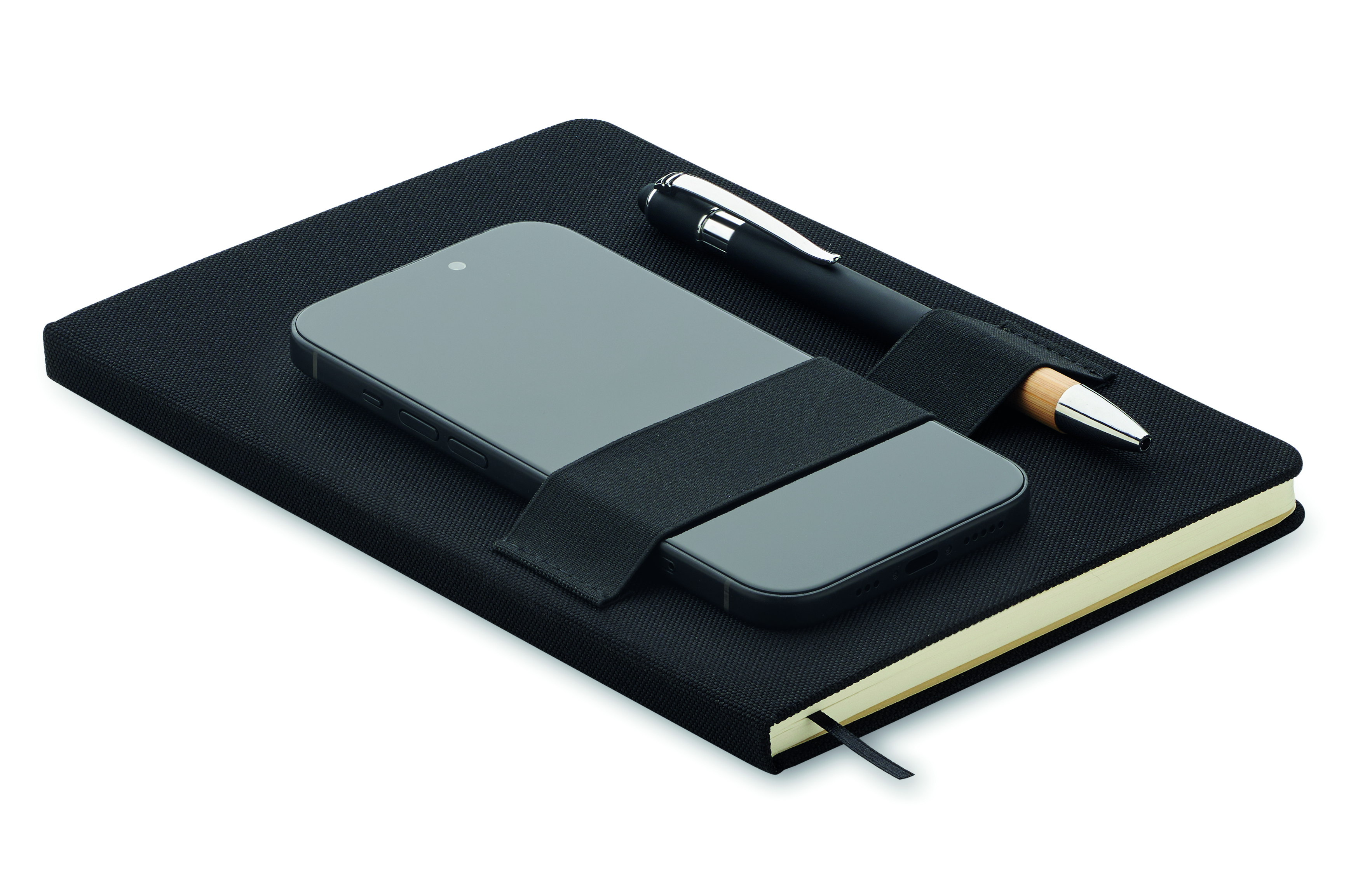 Zestaw z notesem A5 z twardą okładką 600D RPET. Z przodu elastyczna opaska na telefon i pętelka na długopis z bambusowym uchwytem. Oprawiony w etui. 160 stron w linie (80 kartek) z papieru pochodzącego z recyklingu. Elastyczny pasek zamykający. Wstążkowa zakładka. Niebieski tusz. FSC®-certified | FSC MIX CREDIT, P7.1 , FSC-C213206