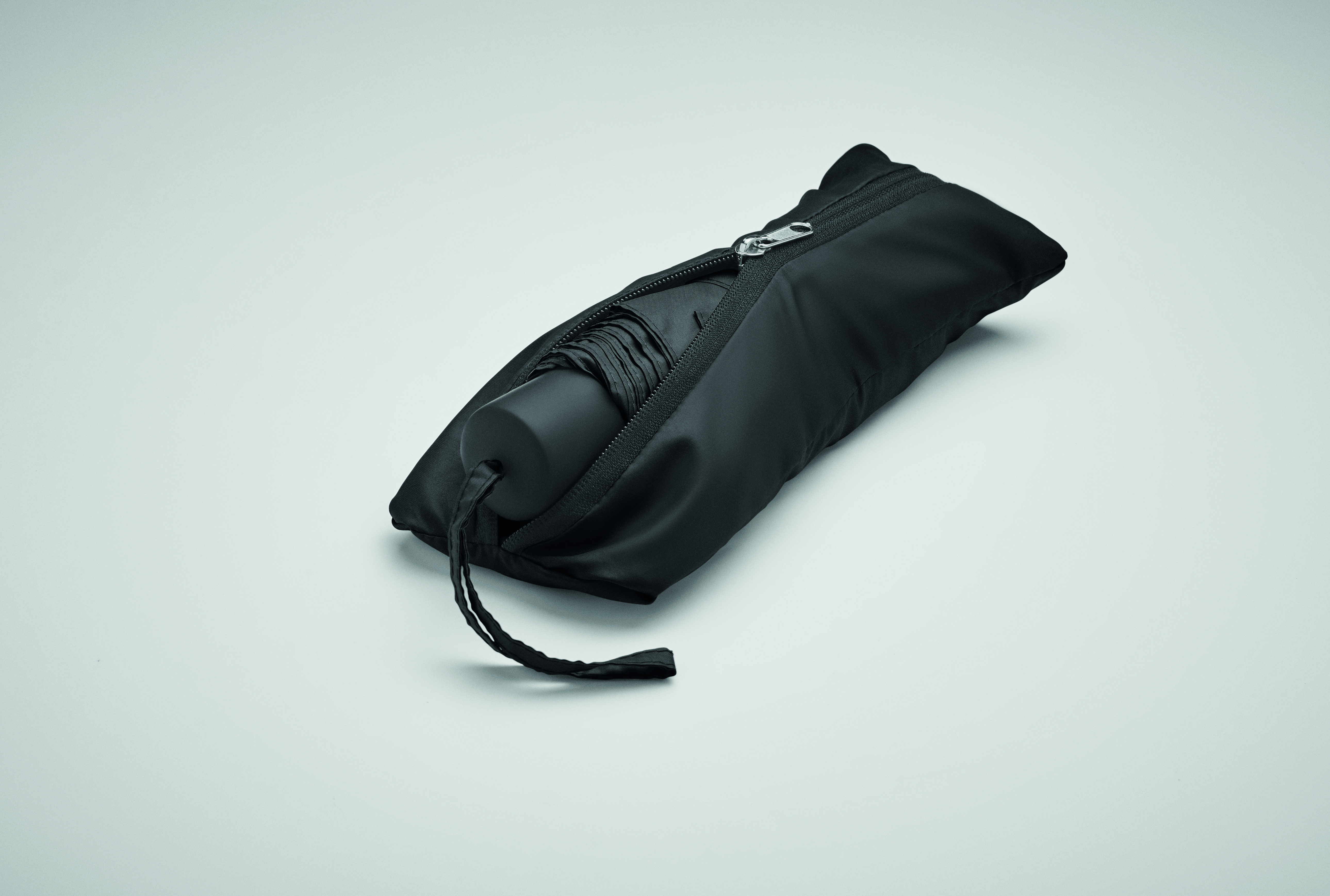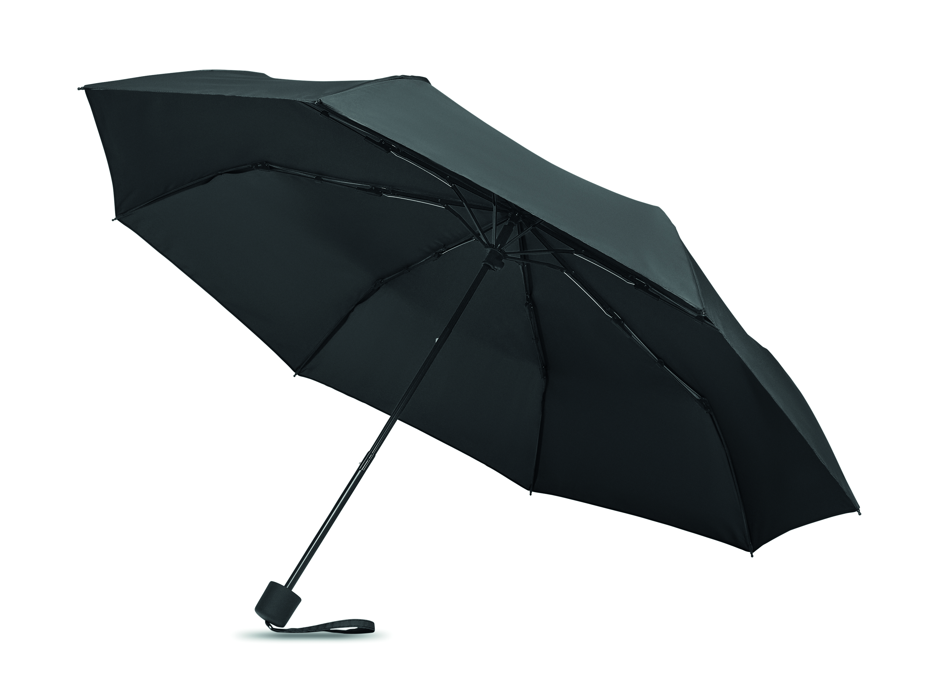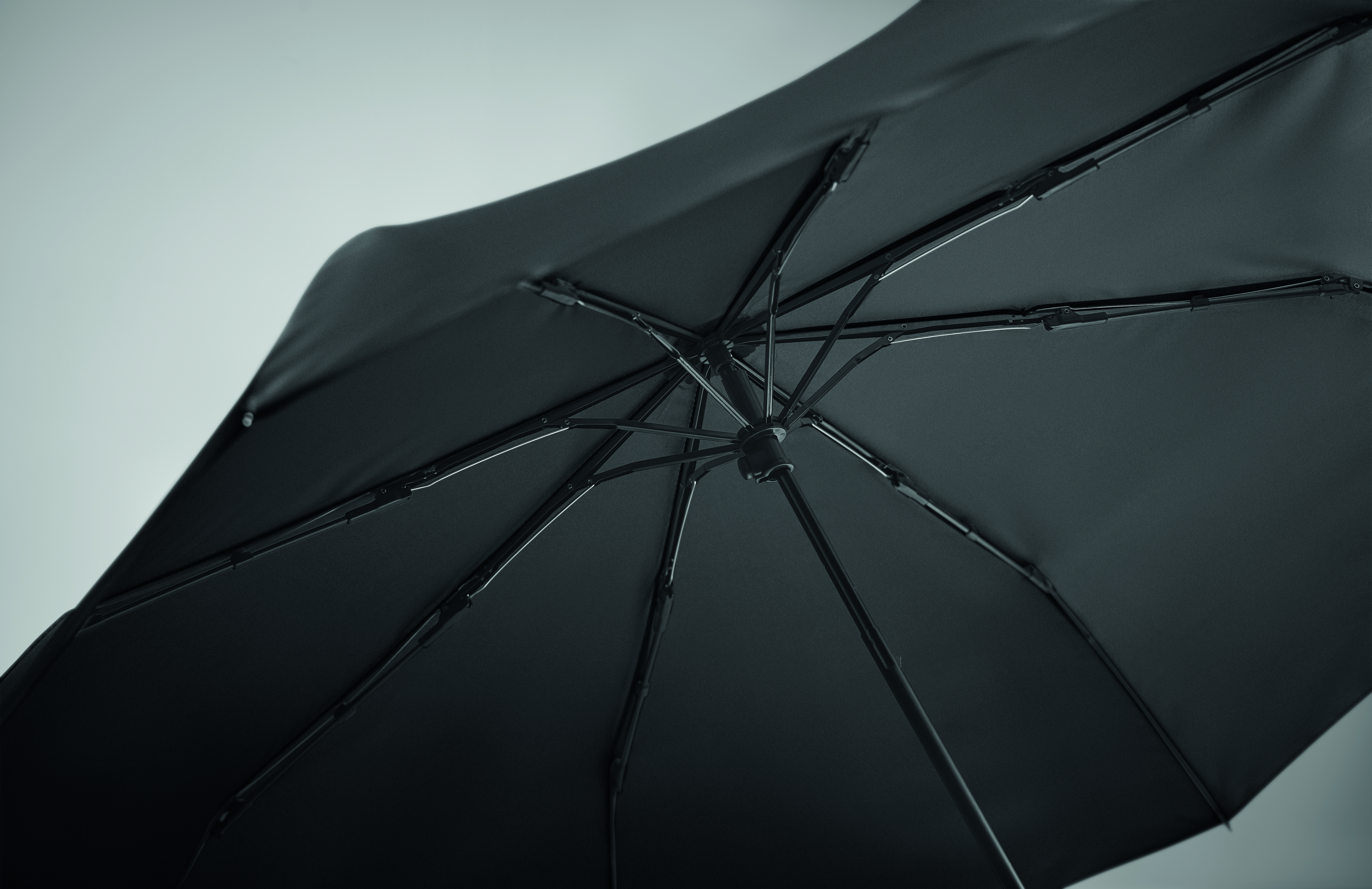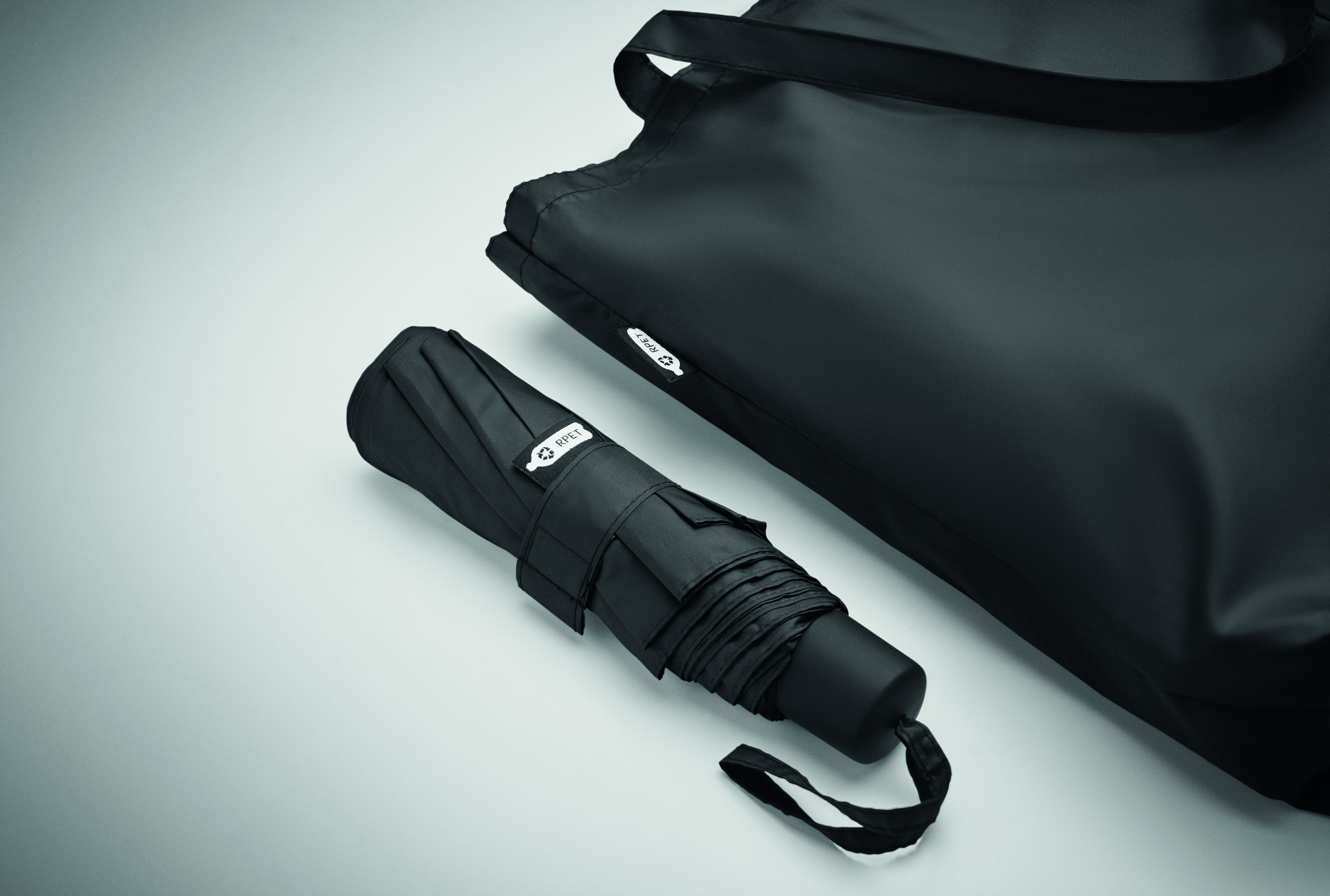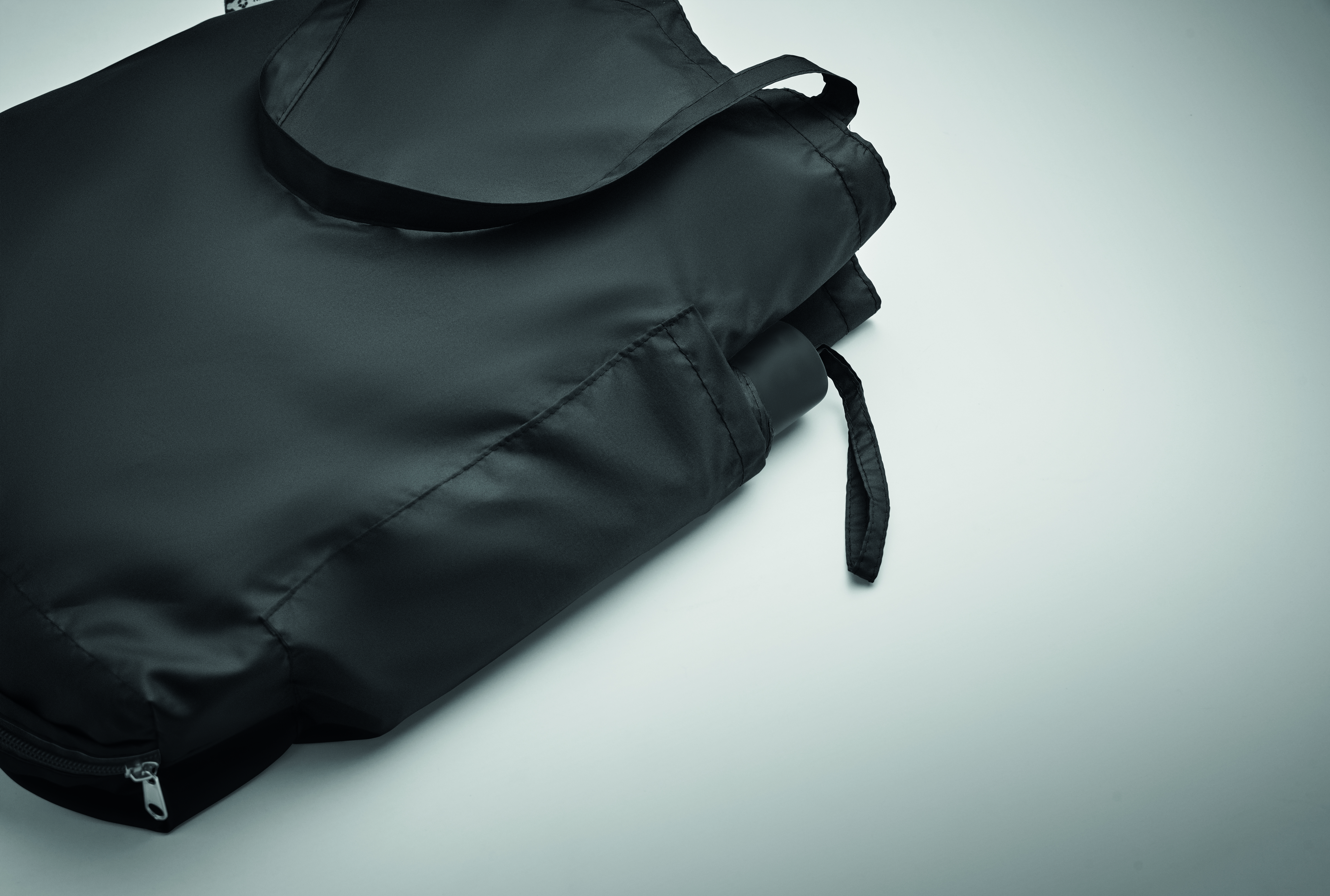 21-calowy, 3-krotnie otwierany i zamykany ręcznie wiatroodporny parasol z materiału 190T RPET pongee, z pokrowcem. Posiada ukrytą komorę zapinaną na zamek błyskawiczny do przechowywania parasola i utrzymywania suchej zawartości torebki. Gdy torba nie jest używana, zwija się, a przegroda na suwak działa jak pokrowiec na parasol.