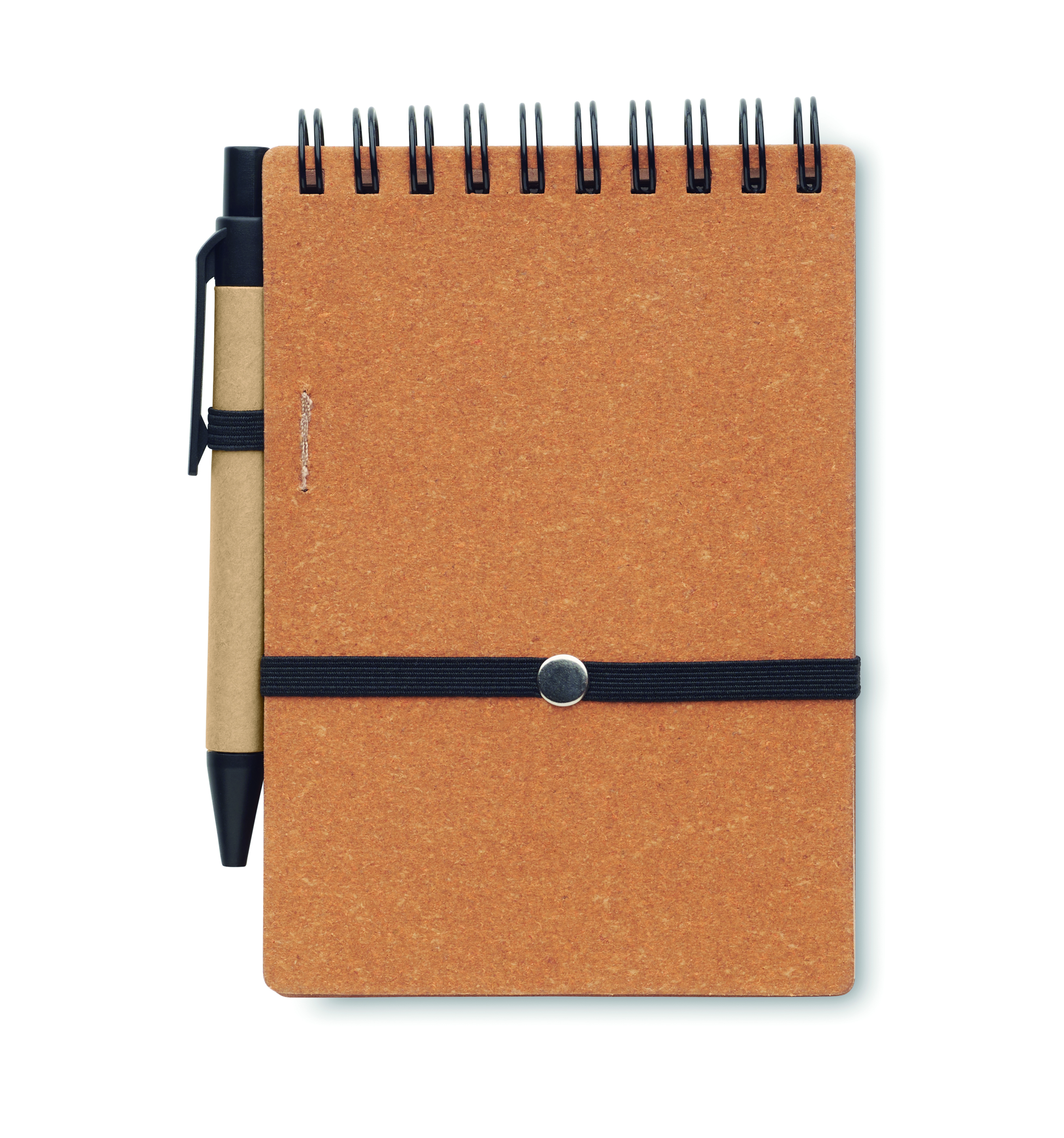 Notes z okładką z papieru z recyklingu i PU (70% papieru z recyklingu i 30% PU). Dwustronny. 140 stron w linie z papieru z recyklingu (70 arkuszy). Dopasowany długopis z przyciskiem wykonany z kartonu z recyklingu i z elementów ABS. Niebieski tusz. Gumka zamykająca i elastyczny uchwyt na długopis. FSC®-certified | FSC MIX CREDIT, P7.1, FSC-C213206