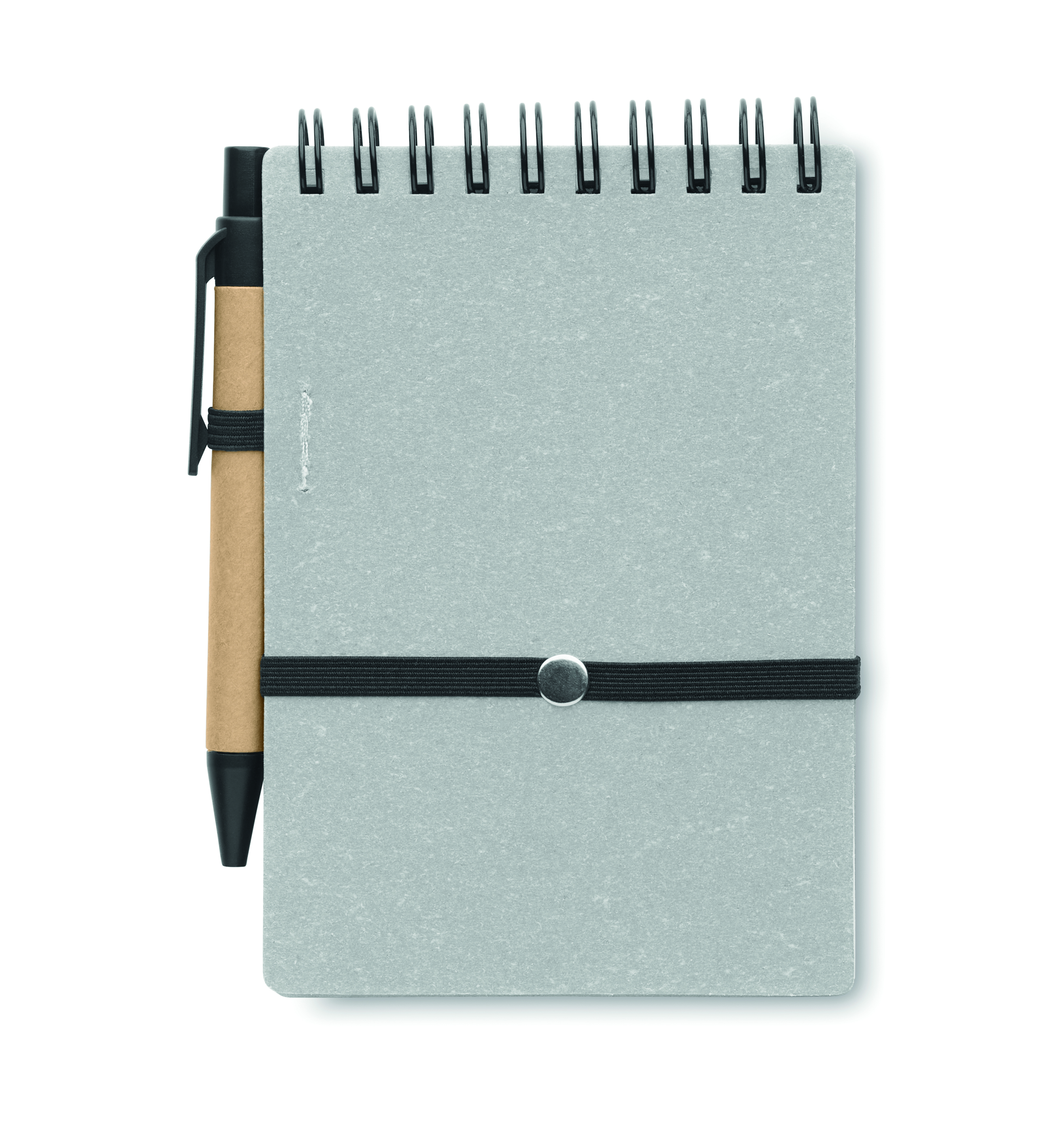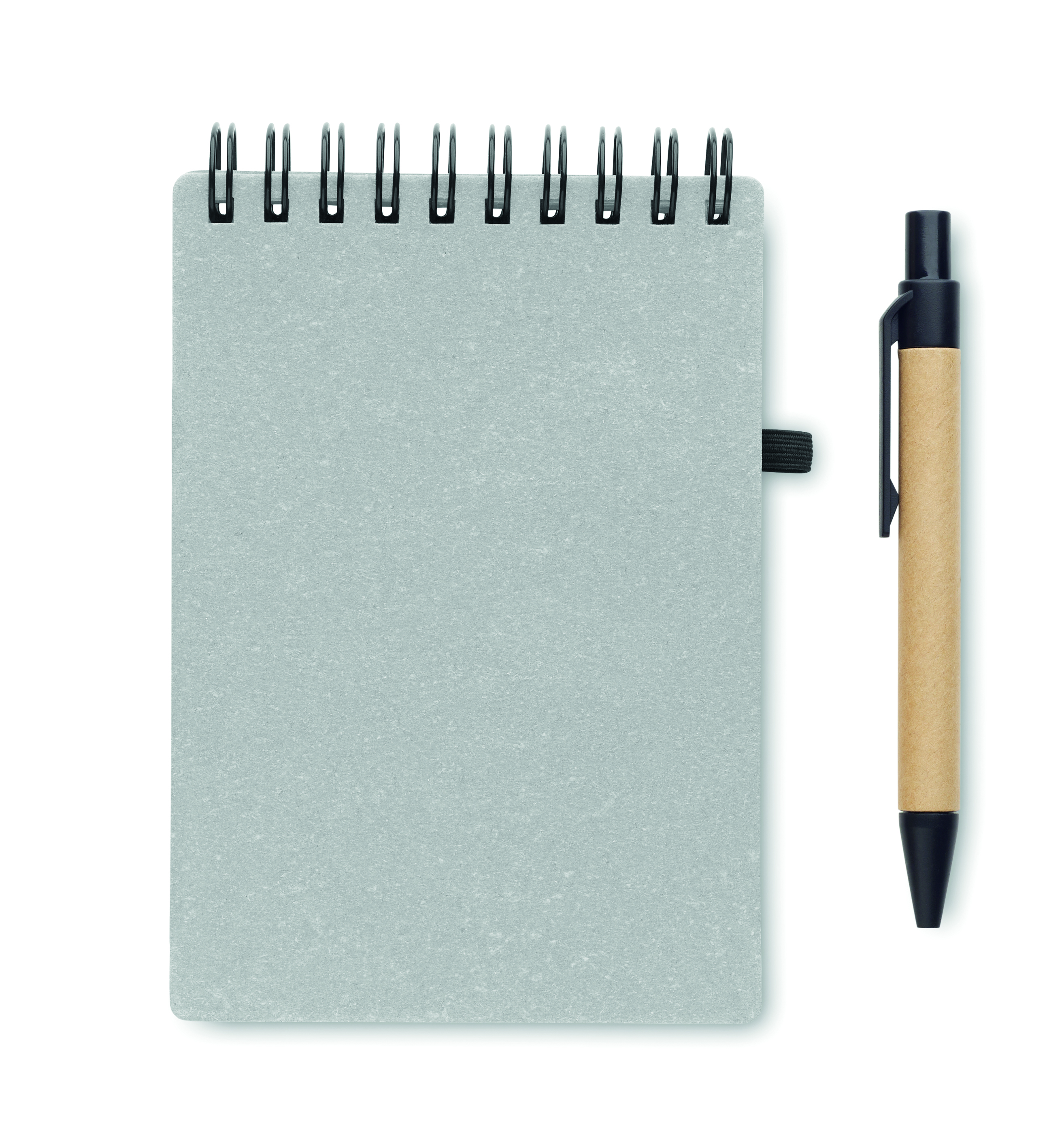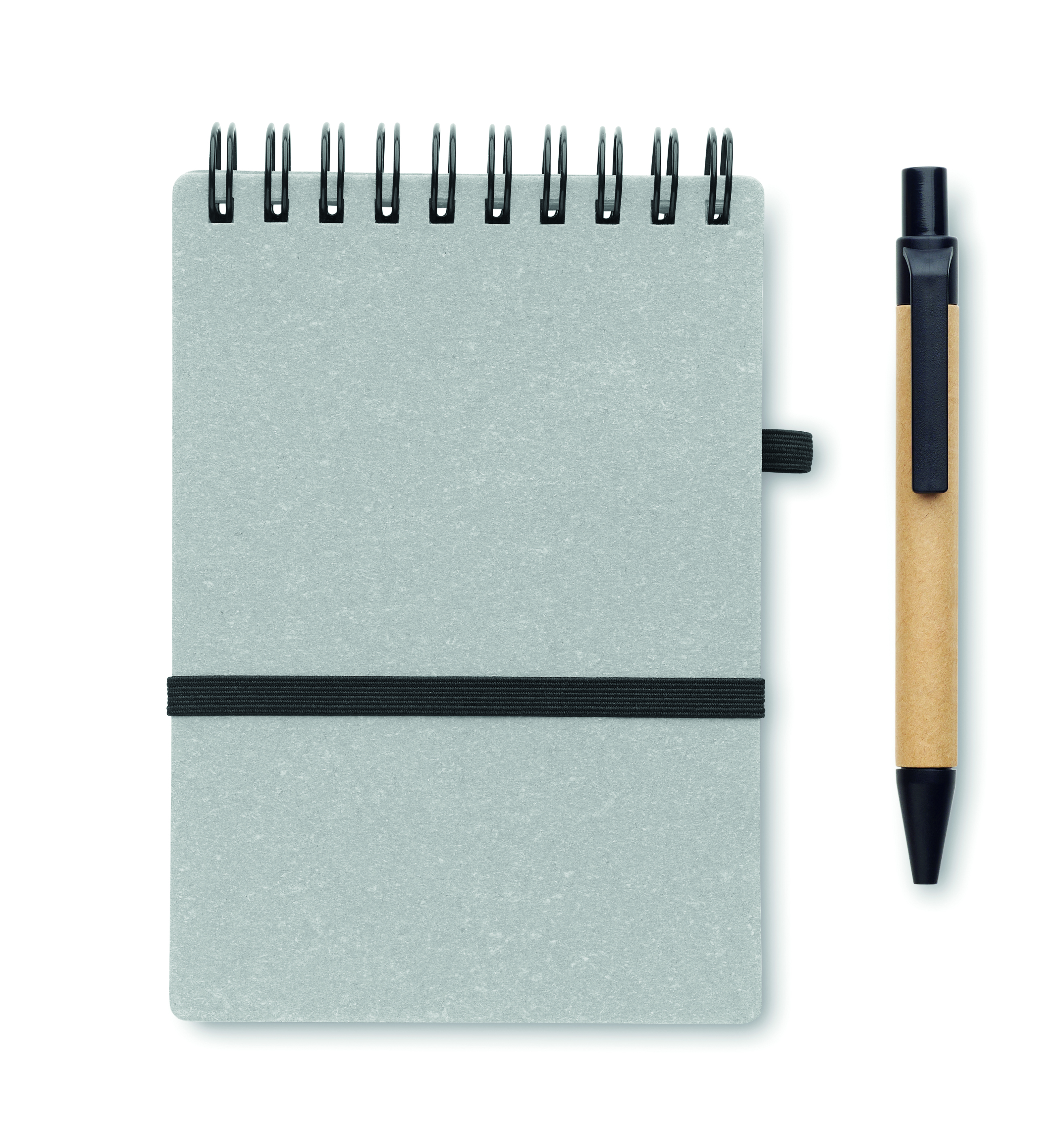 Notes z okładką z papieru z recyklingu i PU (70% papieru z recyklingu i 30% PU). Dwustronny. 140 stron w linie z papieru z recyklingu (70 arkuszy). Dopasowany długopis z przyciskiem wykonany z kartonu z recyklingu i z elementów ABS. Niebieski tusz. Gumka zamykająca i elastyczny uchwyt na długopis. FSC®-certified | FSC MIX CREDIT, P7.1, FSC-C213206
