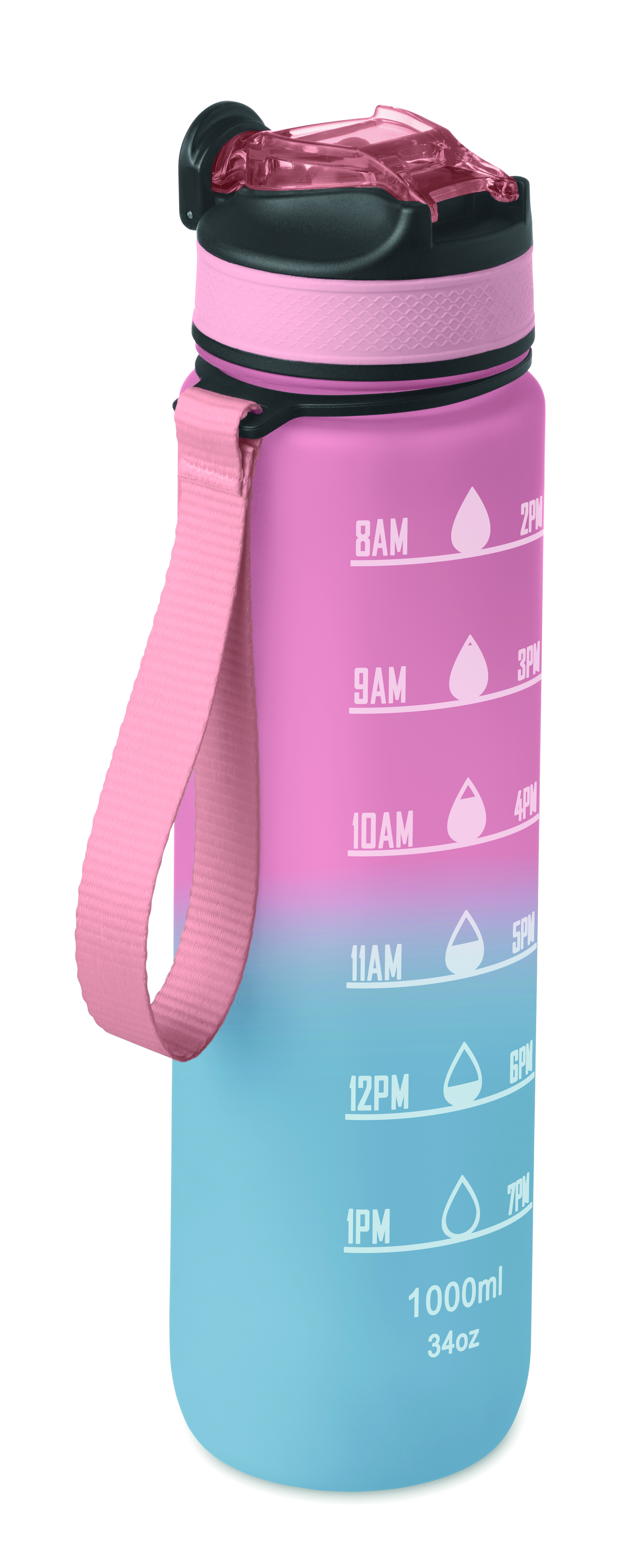 Sportowa butelka na wodę z RPET ze zintegrowaną słomką, miękkim silikonowym ustnikiem, motywacyjnym oznaczeniem czasu, otwieraną jedną ręką klapką, blokadą bezpieczeństwa i paskiem do przenoszenia. Pojemność 1 l. Szczelna.