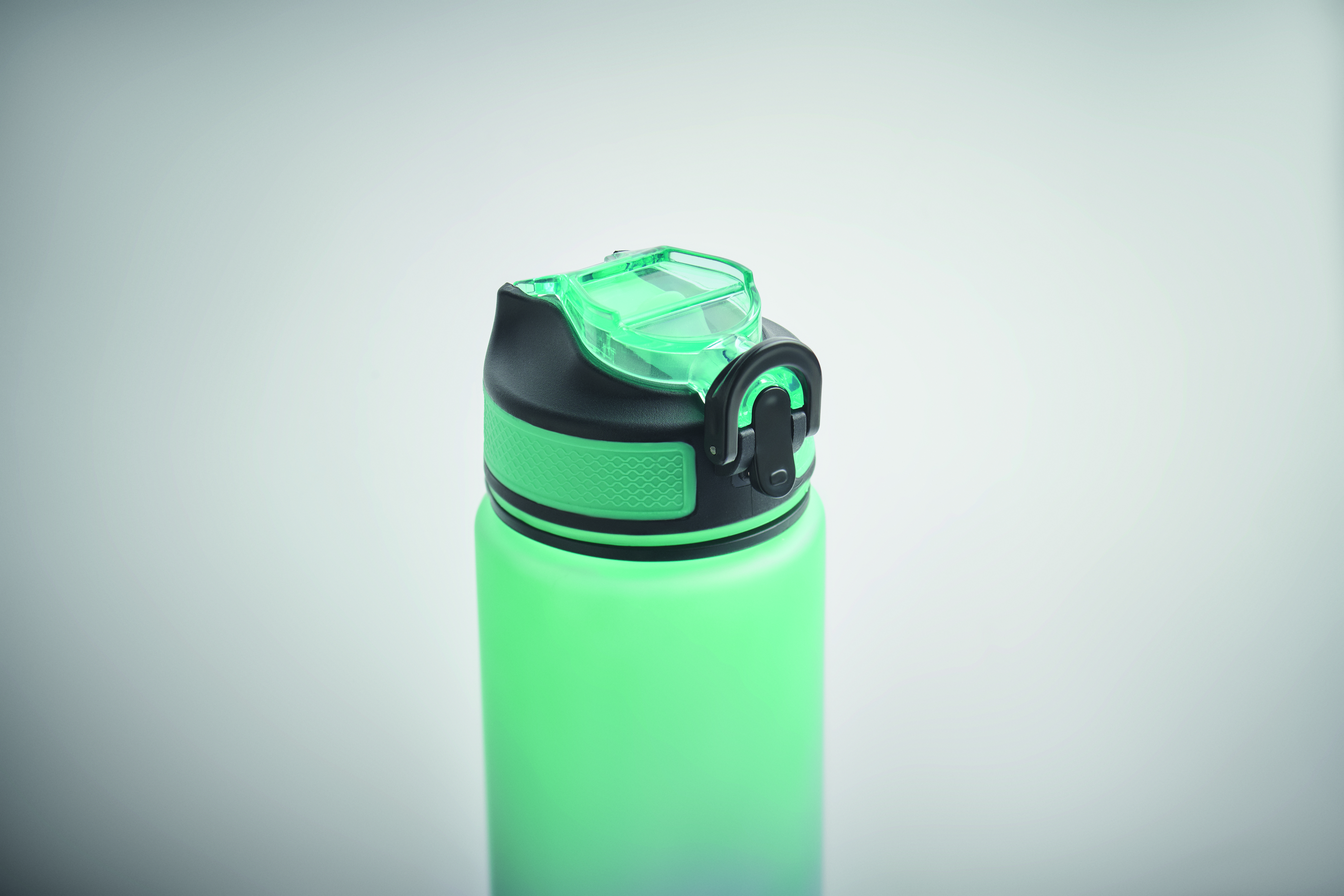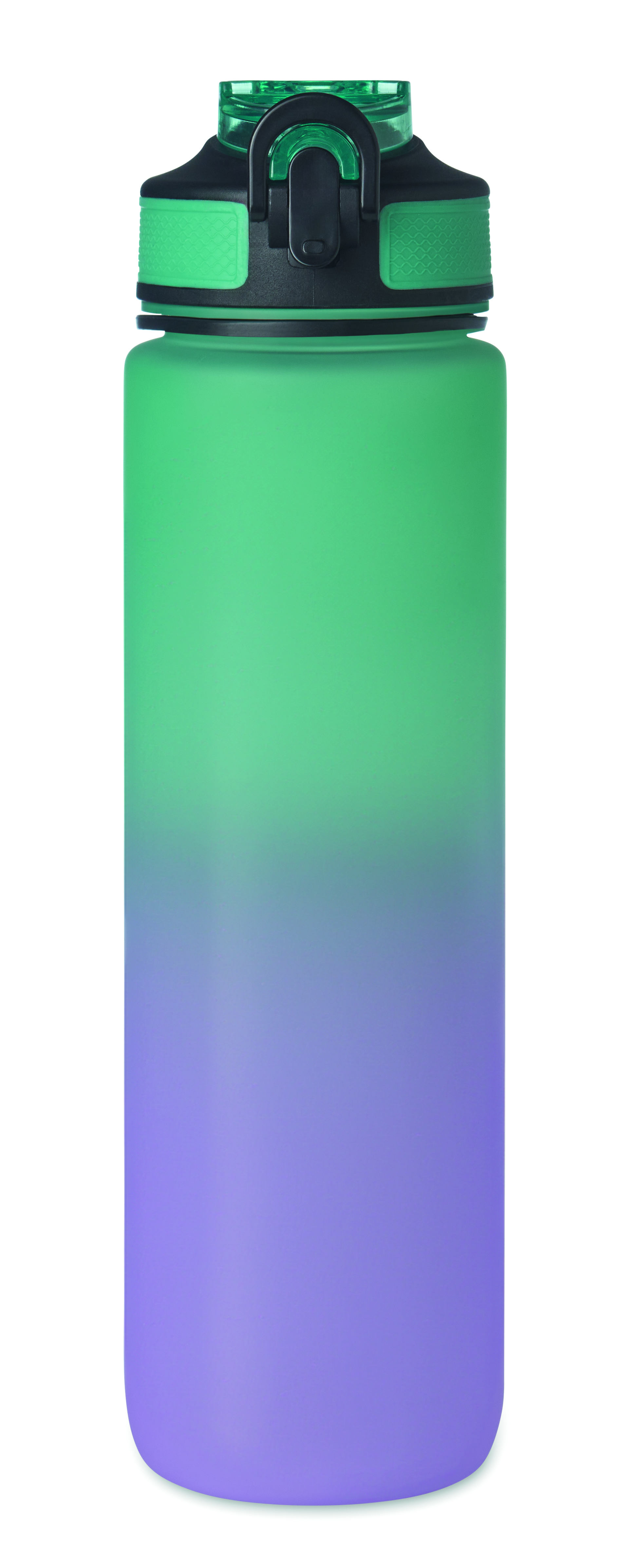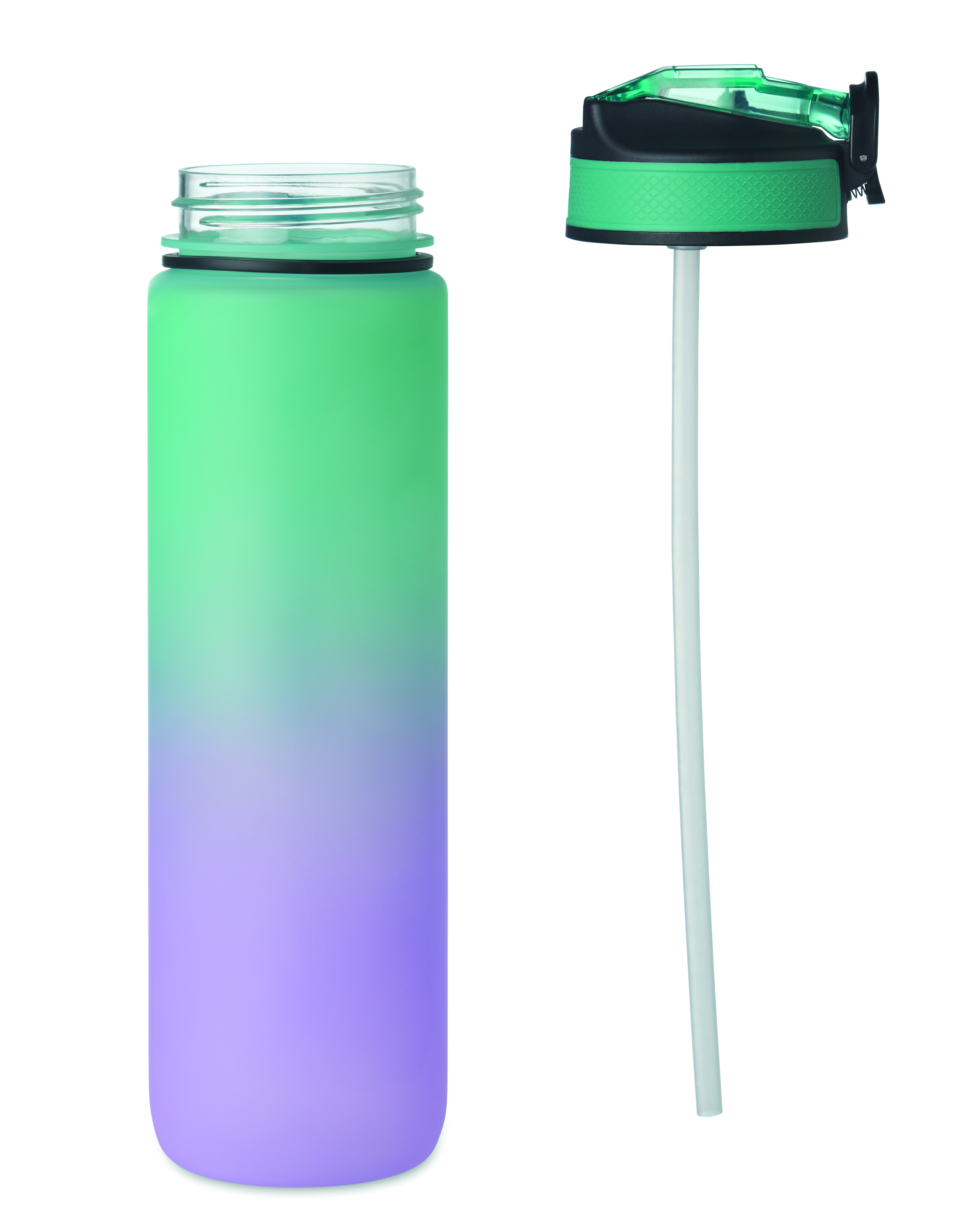 Sportowa butelka na wodę z RPET ze zintegrowaną słomką, miękkim silikonowym ustnikiem, motywacyjnym oznaczeniem czasu, otwieraną jedną ręką klapką, blokadą bezpieczeństwa i paskiem do przenoszenia. Pojemność 1 l. Szczelna.