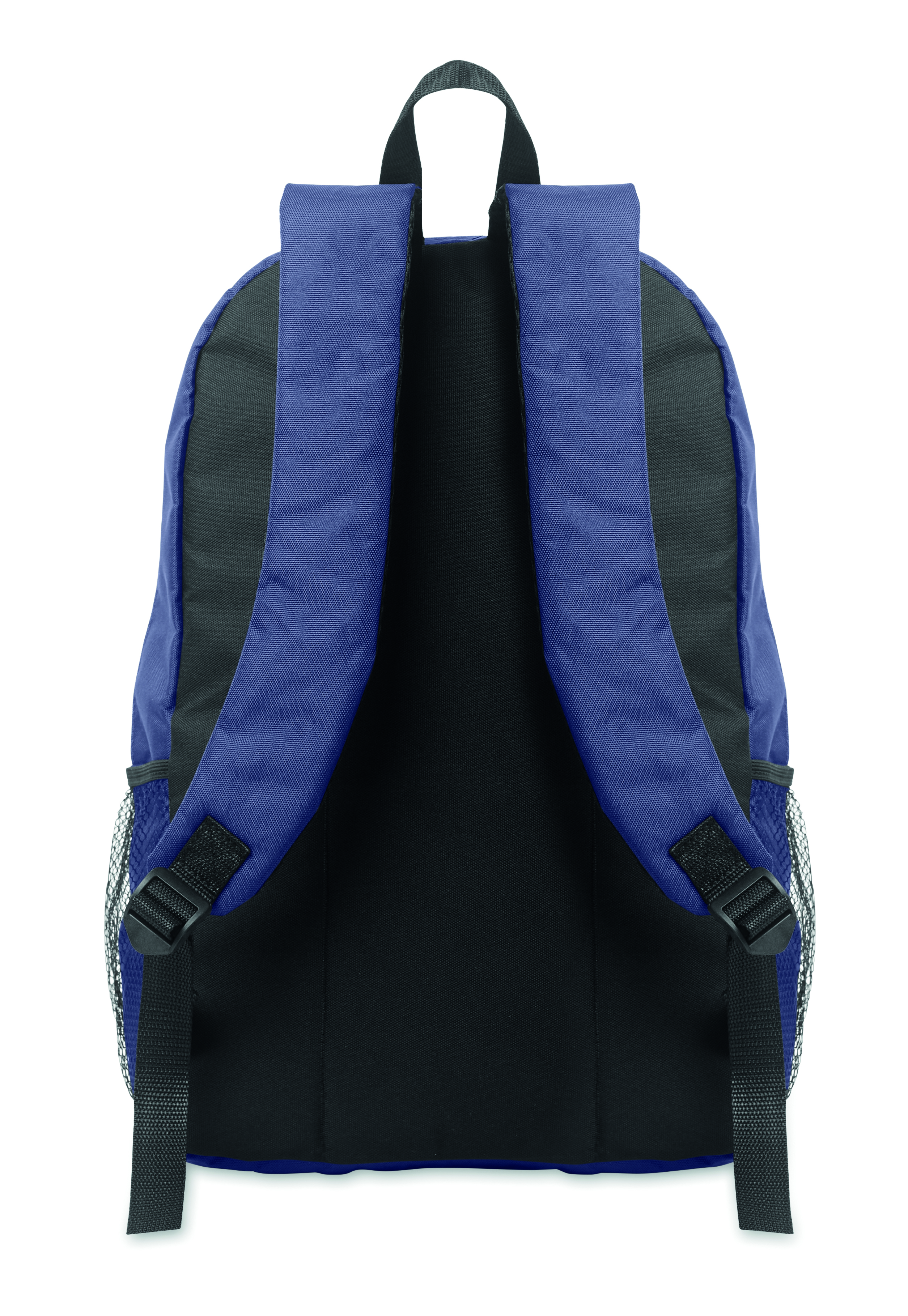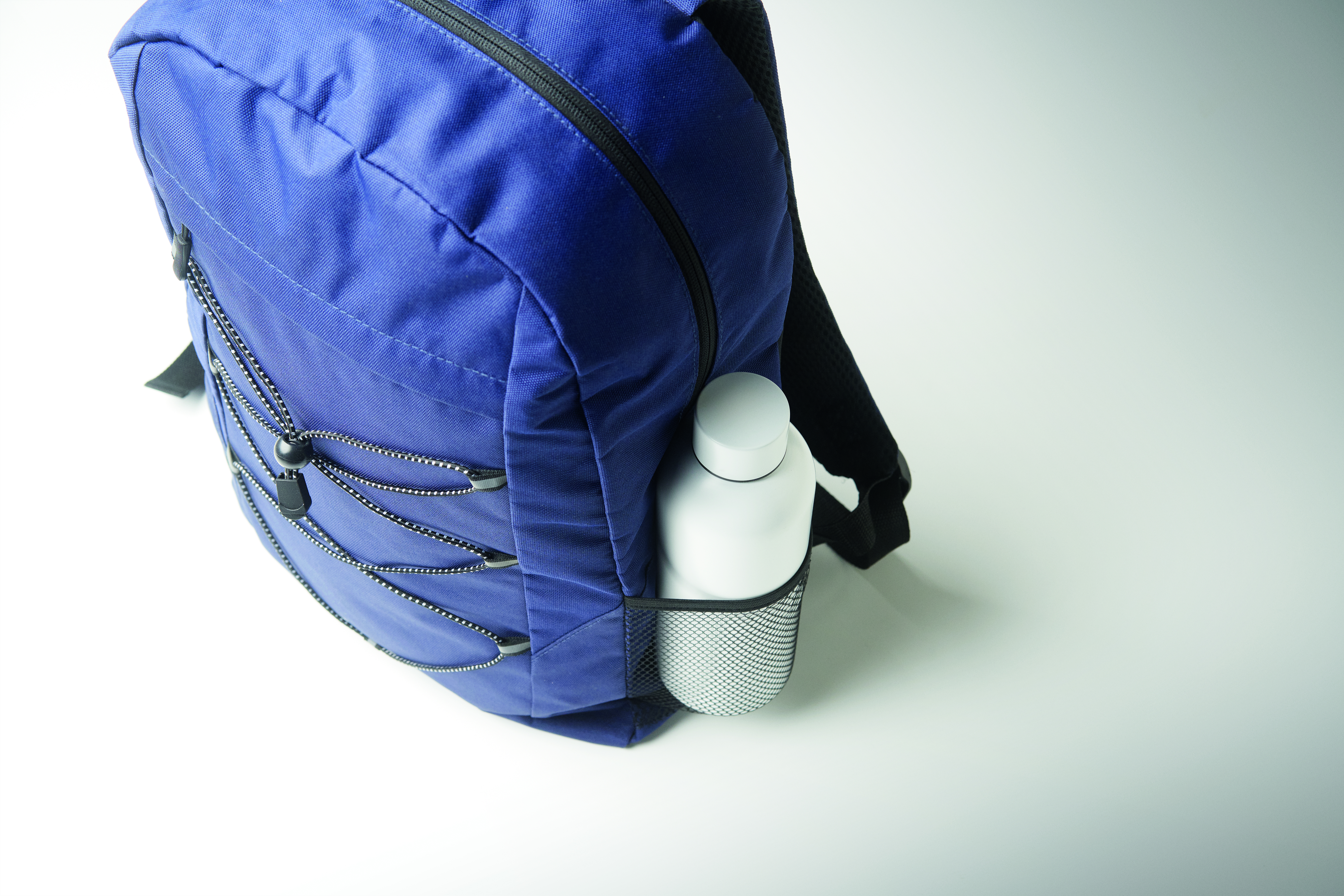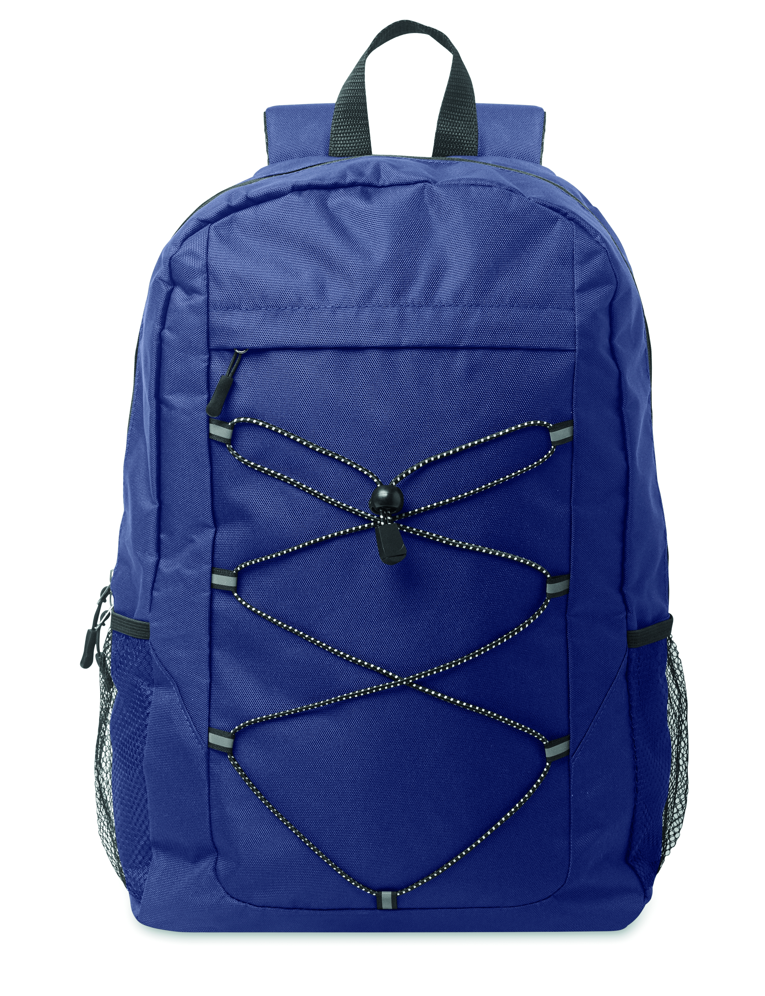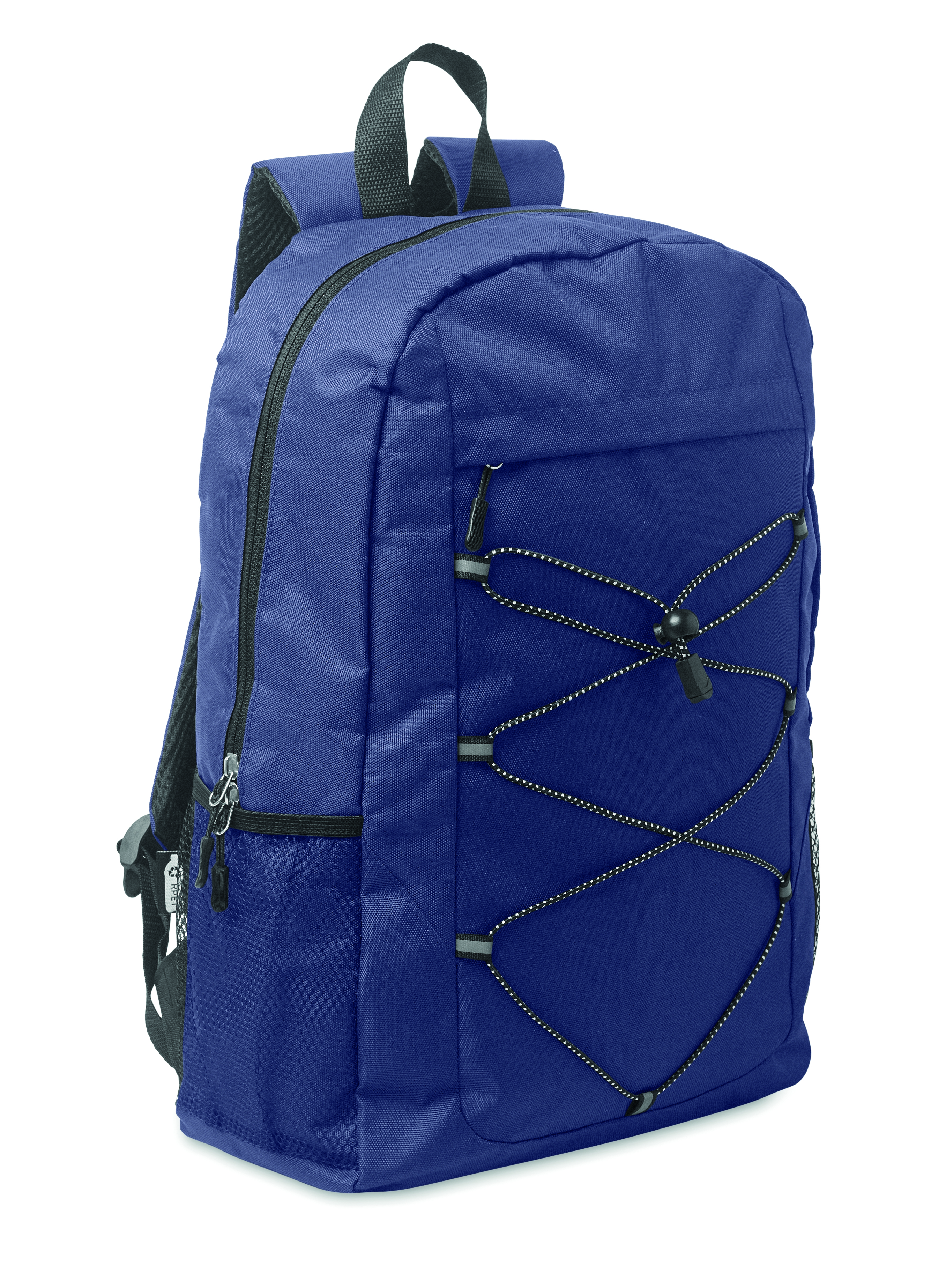 Plecak z poliestru 600D RPET z ozdobnym sznurkiem i przednią kieszenią zapinaną na zamek. Siateczkowe kieszenie po obu stronach.