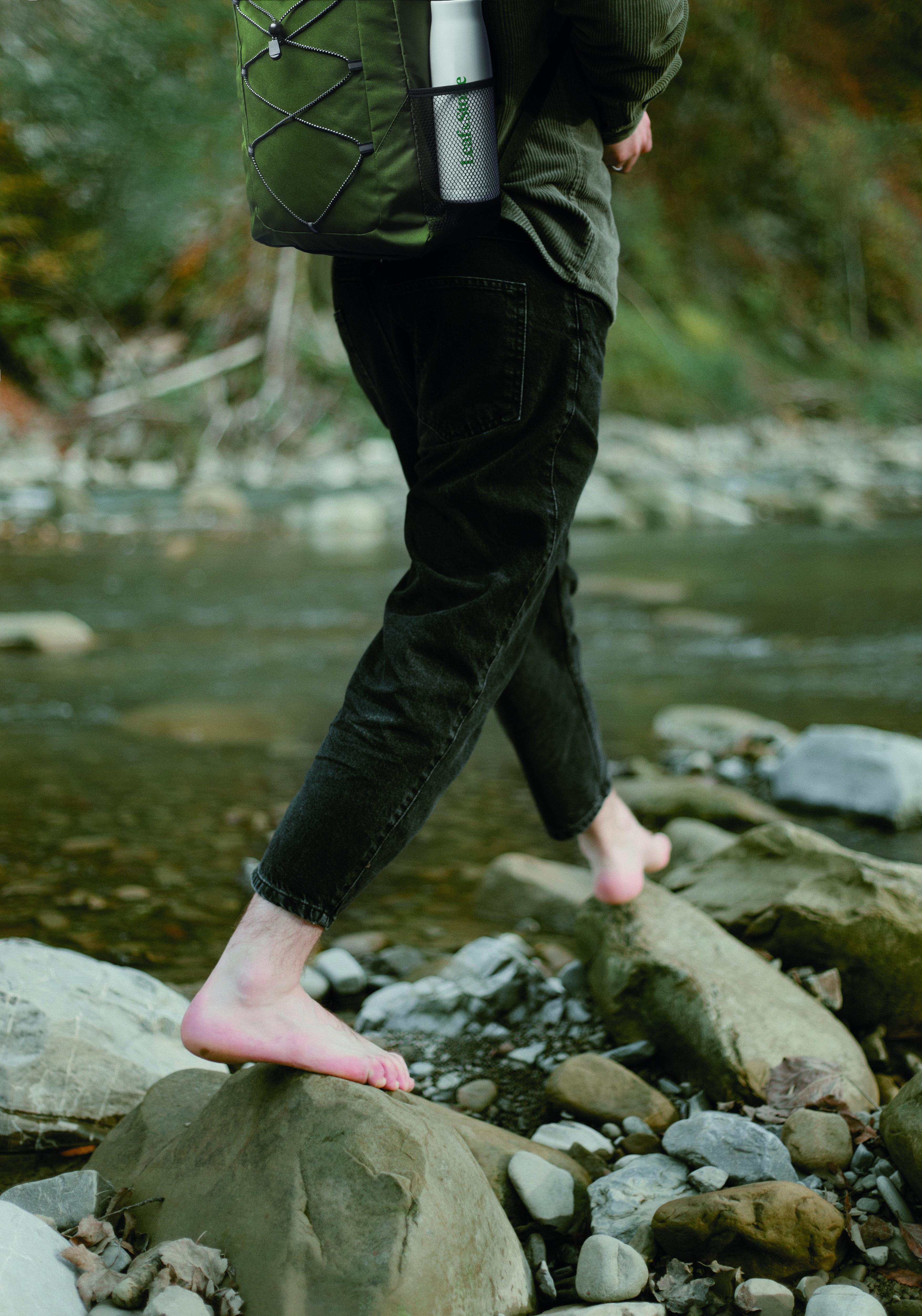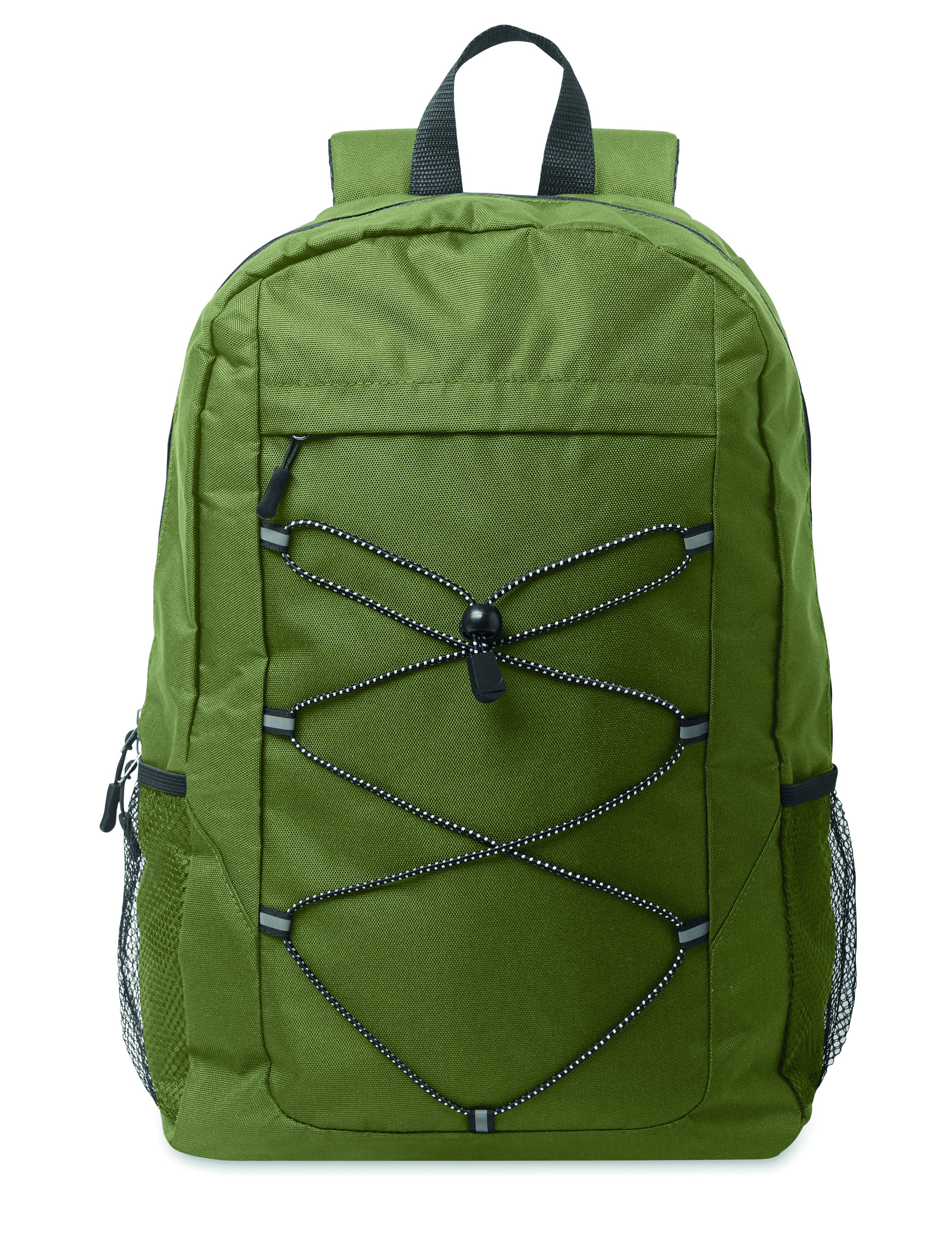 Plecak z poliestru 600D RPET z ozdobnym sznurkiem i przednią kieszenią zapinaną na zamek. Siateczkowe kieszenie po obu stronach.