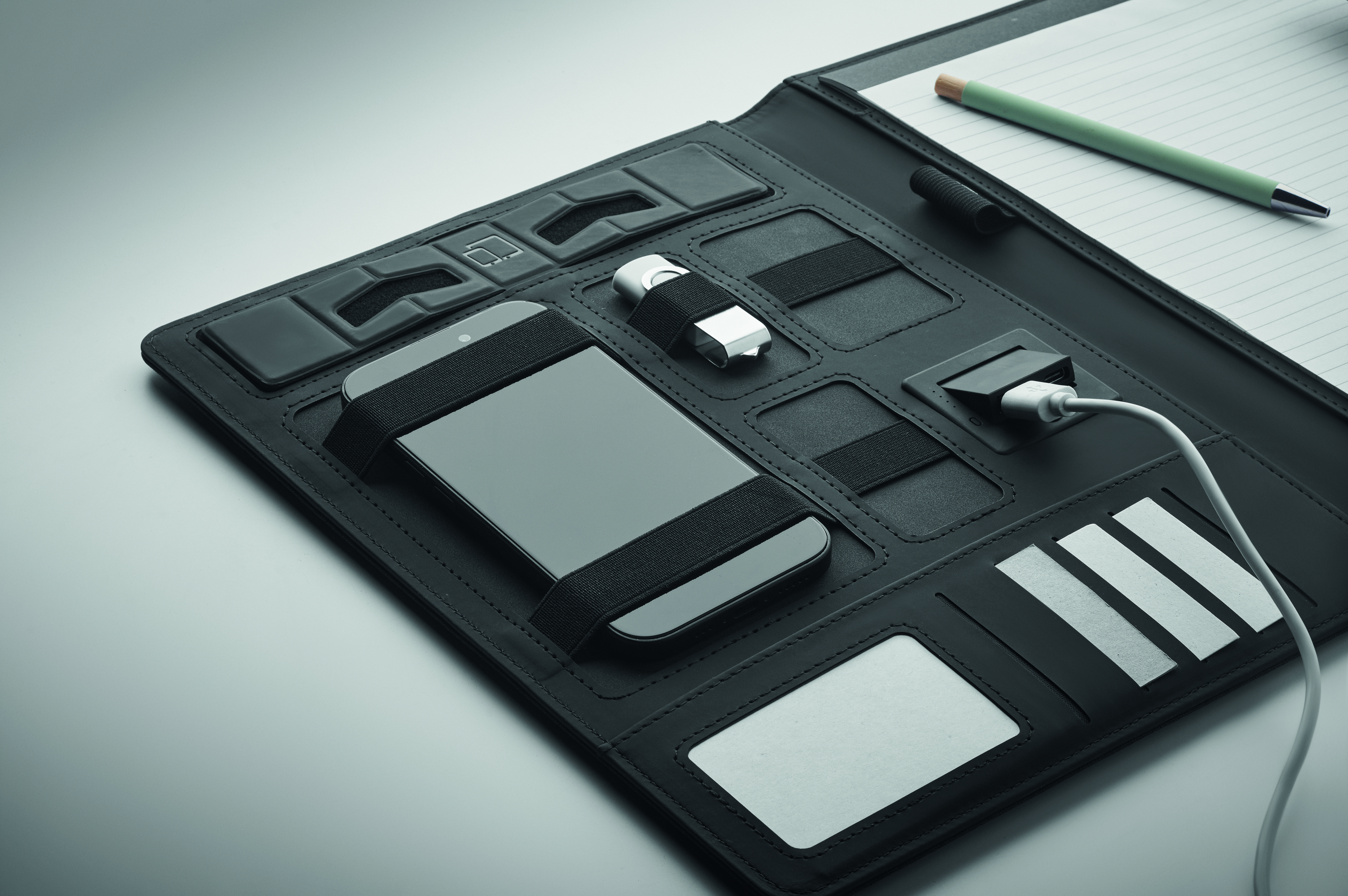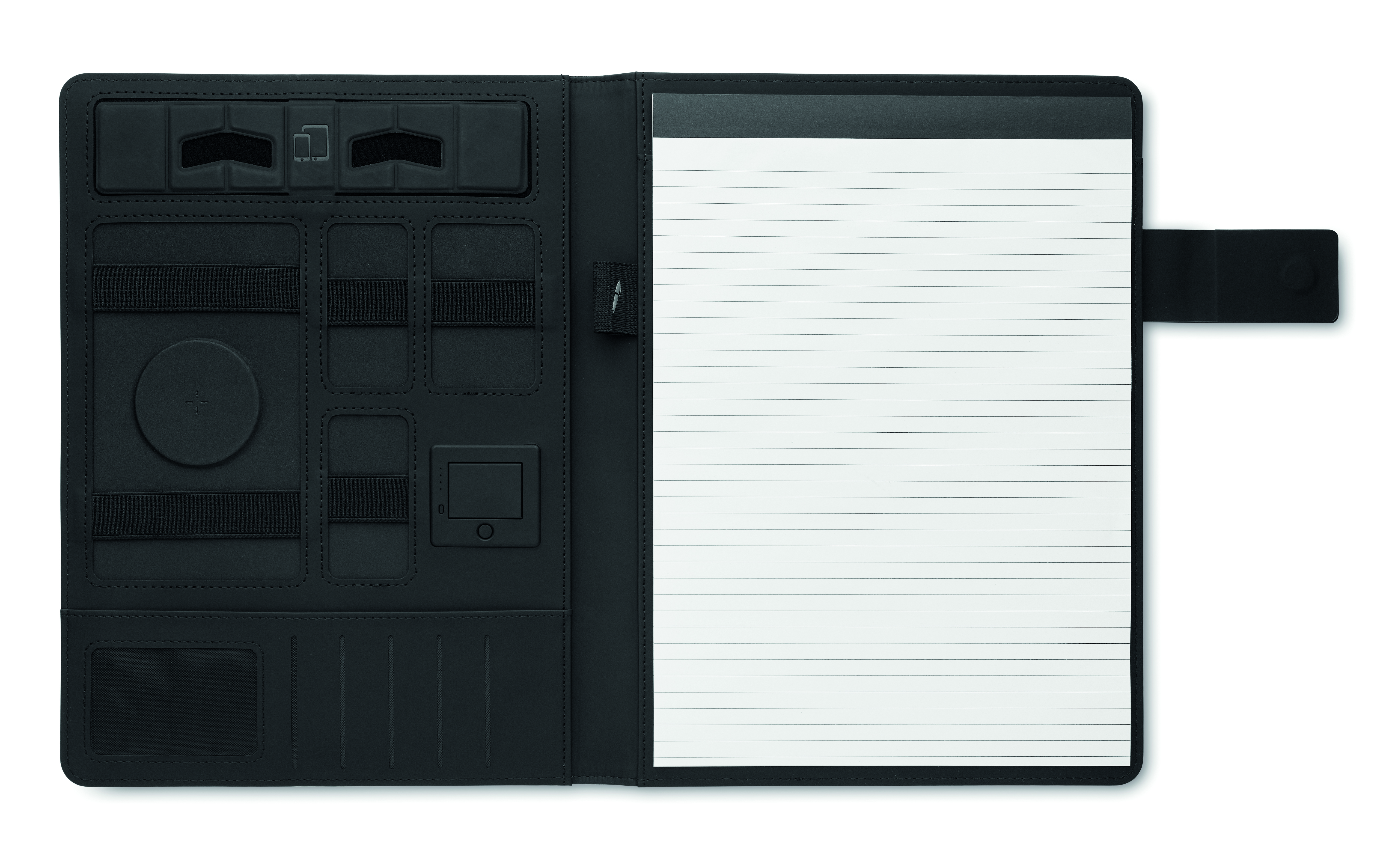 Teczka konferencyjna A4 z płócienną okładką z PU. Power bank 5000 mAh i magnetyczna ładowarka bezprzewodowa 15 W. notatnik z 20 kartkami w linie. Wiele wewnętrznych przegródek. Magnetyczne zamknięcie. Elastyczny uchwyt na długopis.