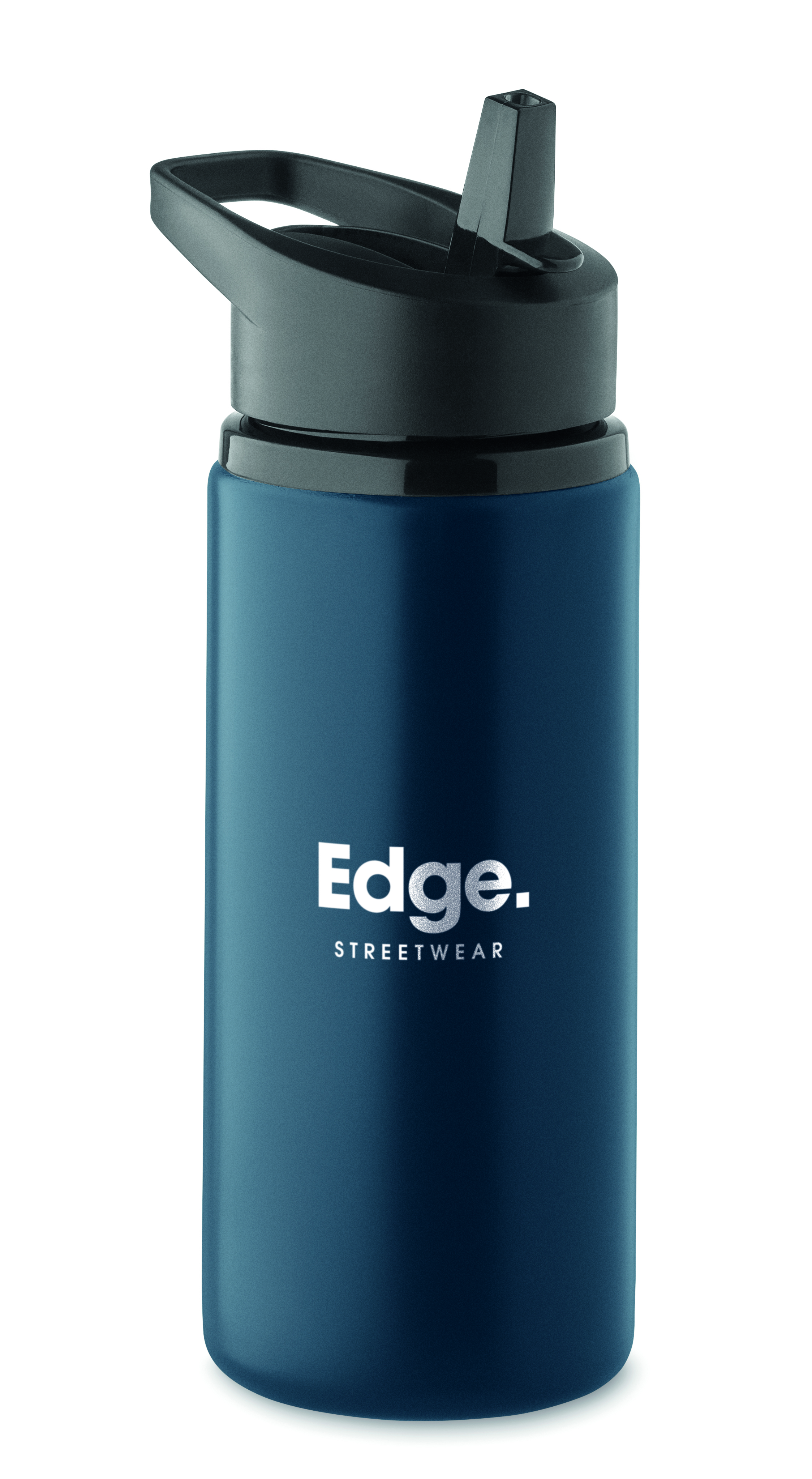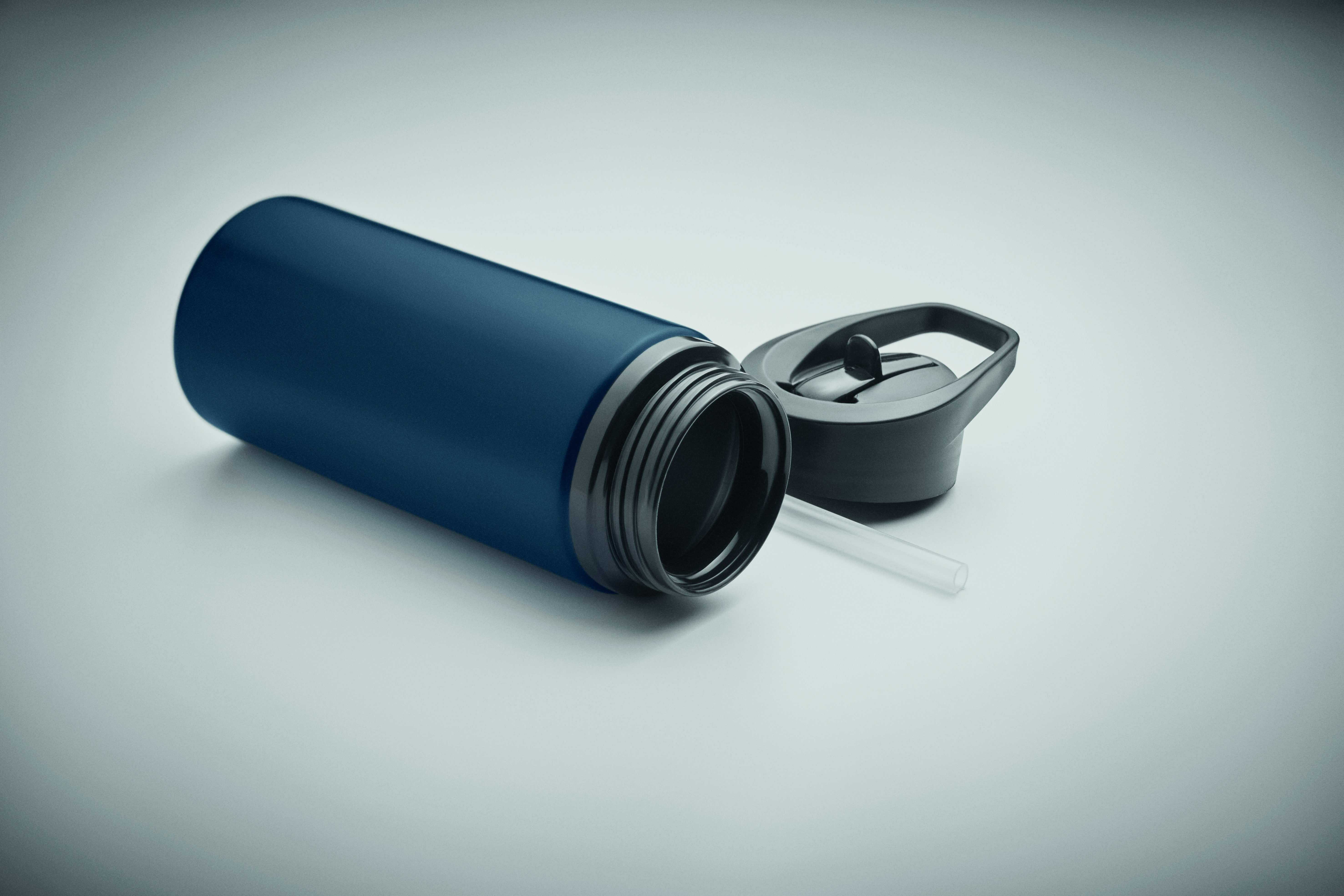 Jednościenna butelka z recyklingowanej stali nierdzewnej (90% stali nierdzewnej z recyklingu i 10% stali nierdzewnej) ze składanym ustnikiem, słomką i pokrywką z uchwytem do przenoszenia. Pojemność: 500 ml. Ponieważ jest to butelka z pojedynczą ścianką, może dochodzić do wymiany ciepła.