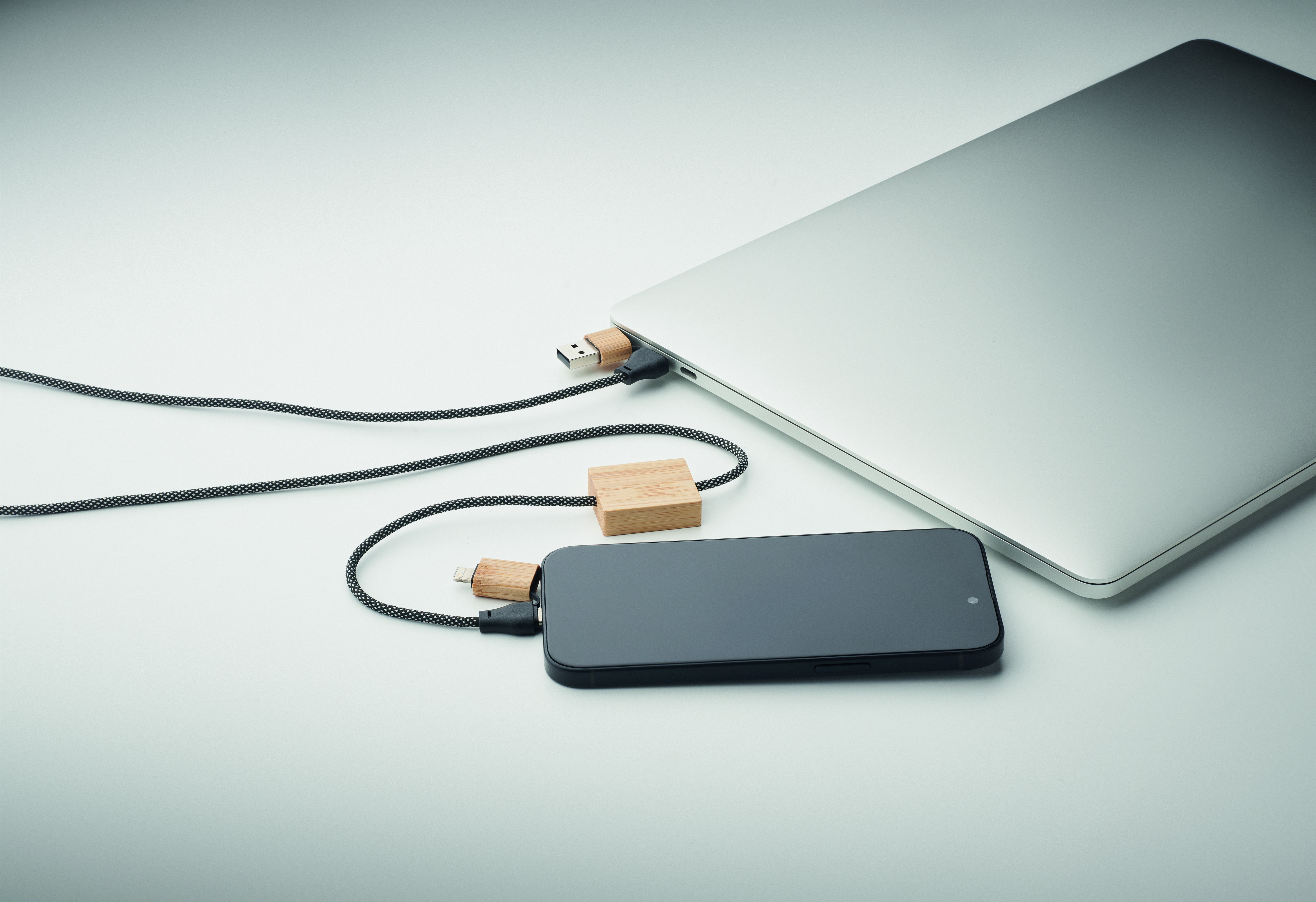 Kabel do ładowania 60W z RPET z bambusowymi detalami. Wejście: 2-w-1 Type-C i Type-A. Wyjście: Typ-C i 2 w 1.