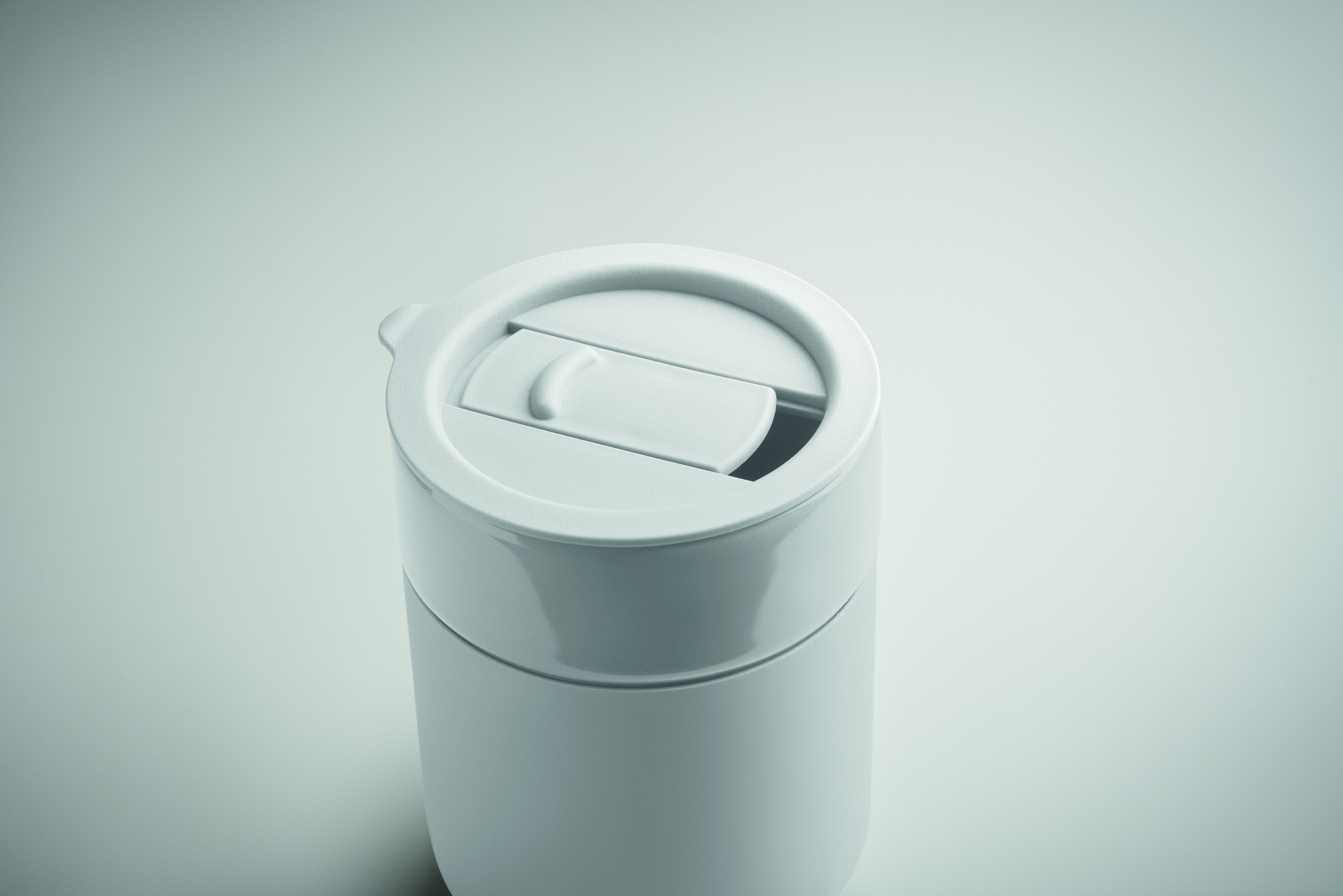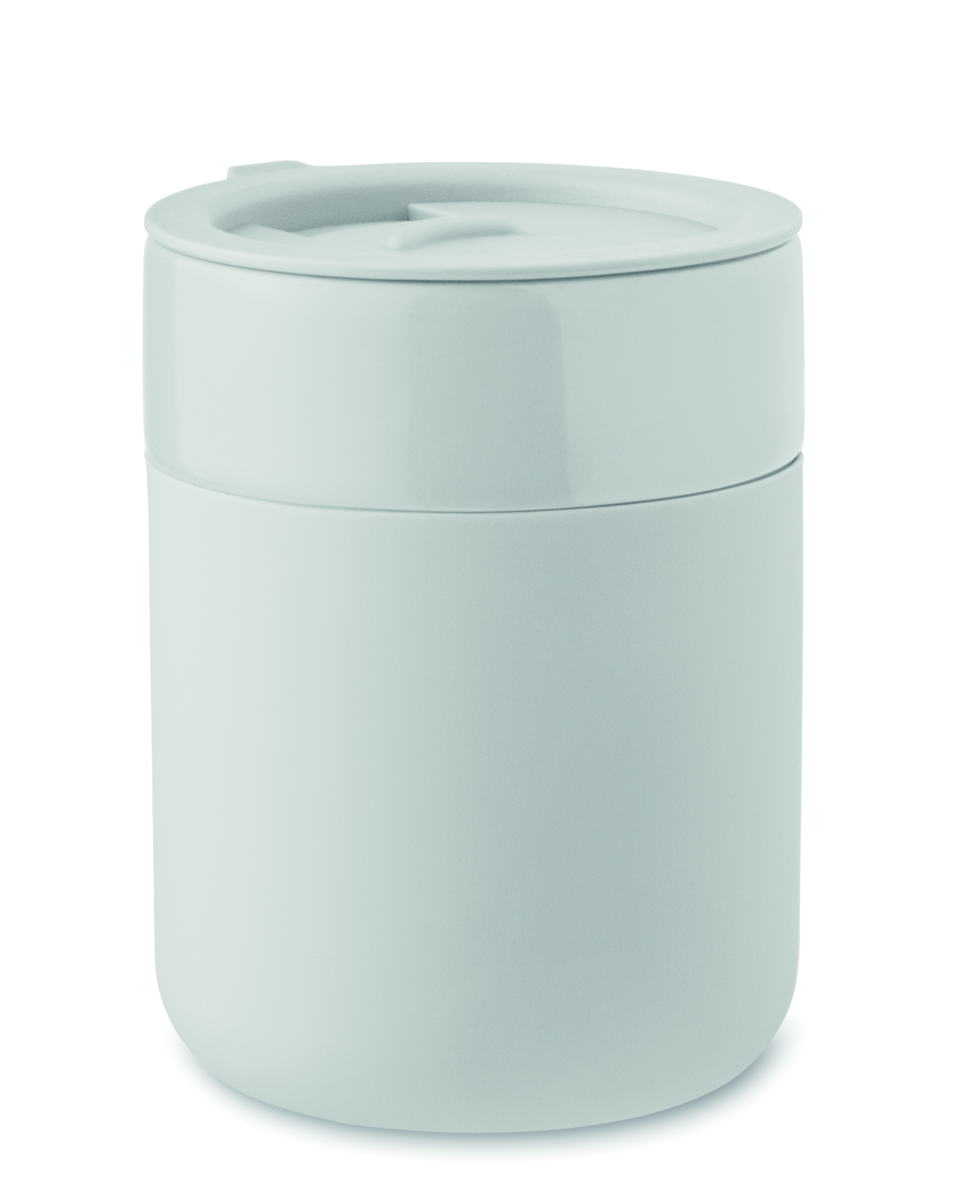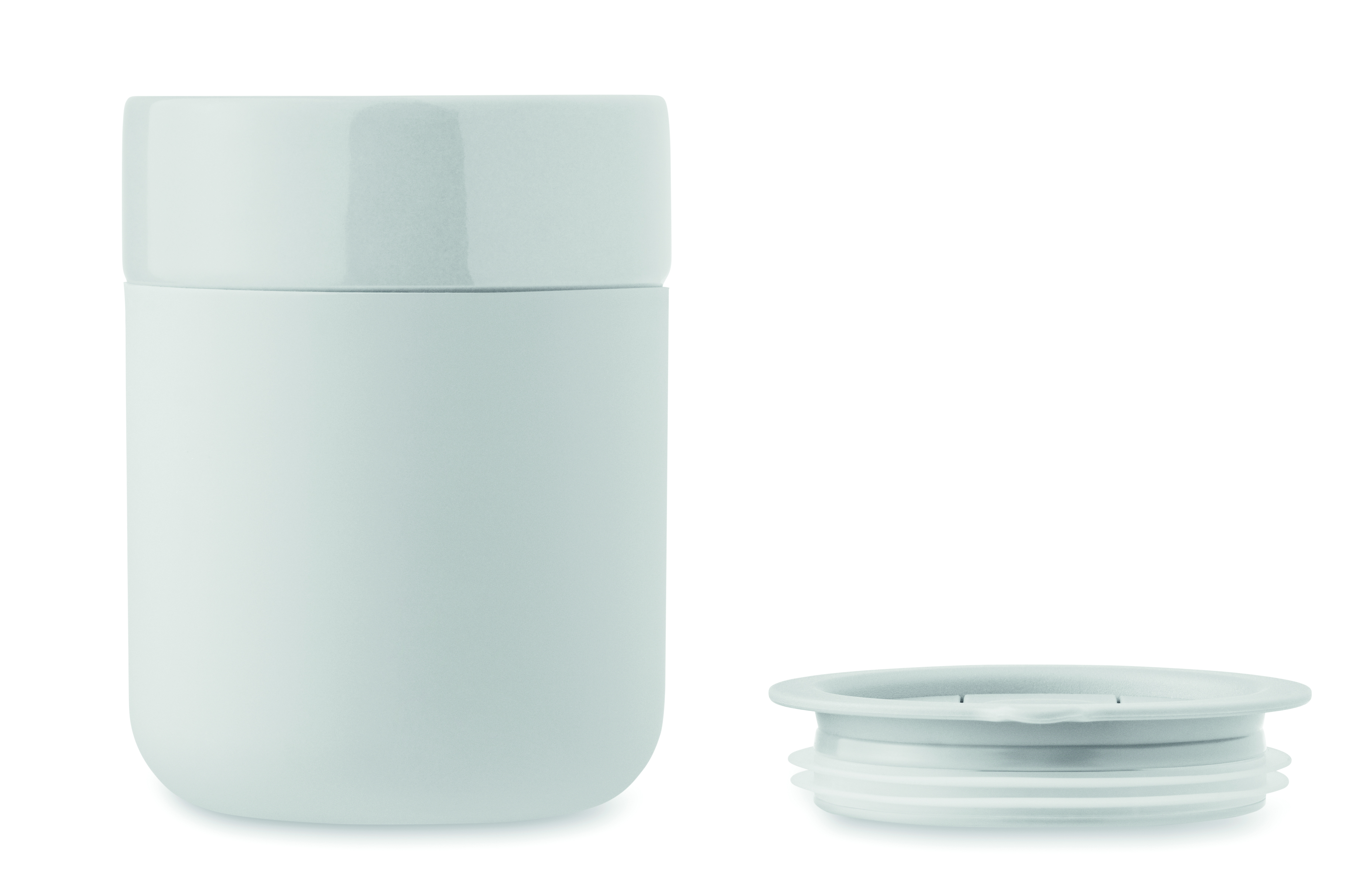 Ceramiczny kubek ze zdejmowalnym silikonowym rękawem i pokrywką z PP. Pojemność: 330 ml.