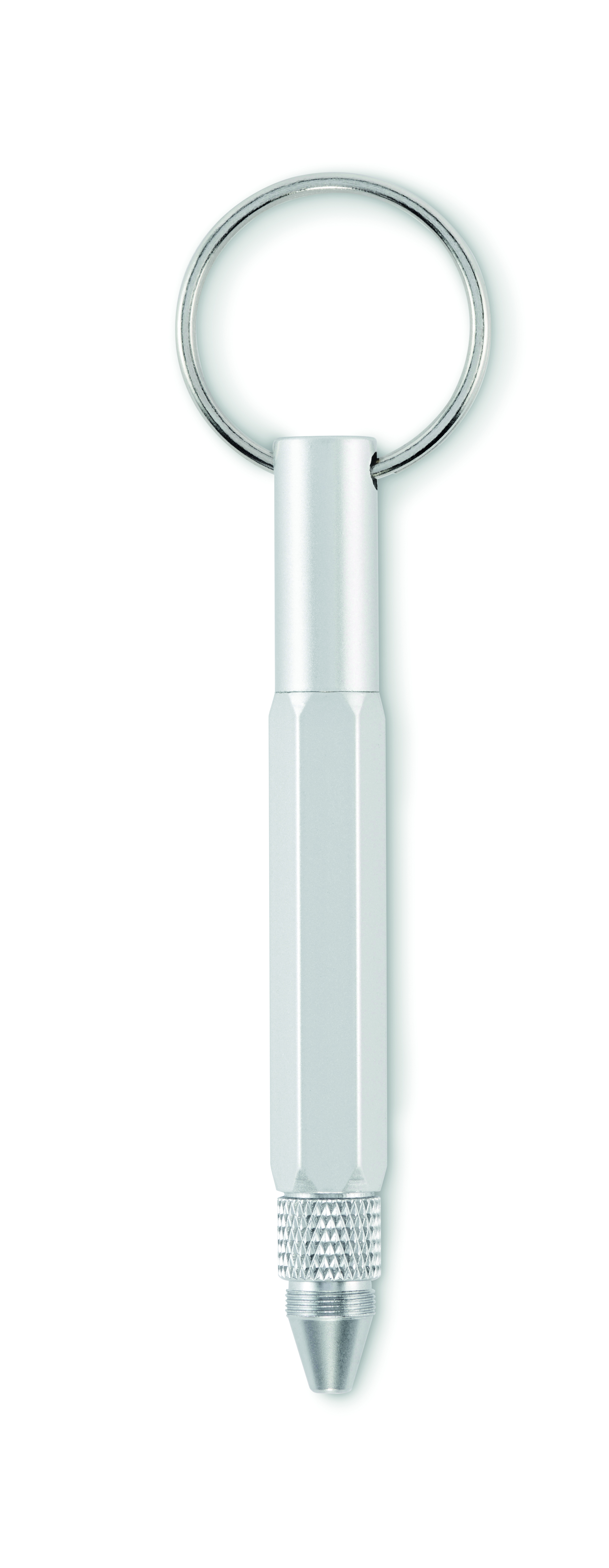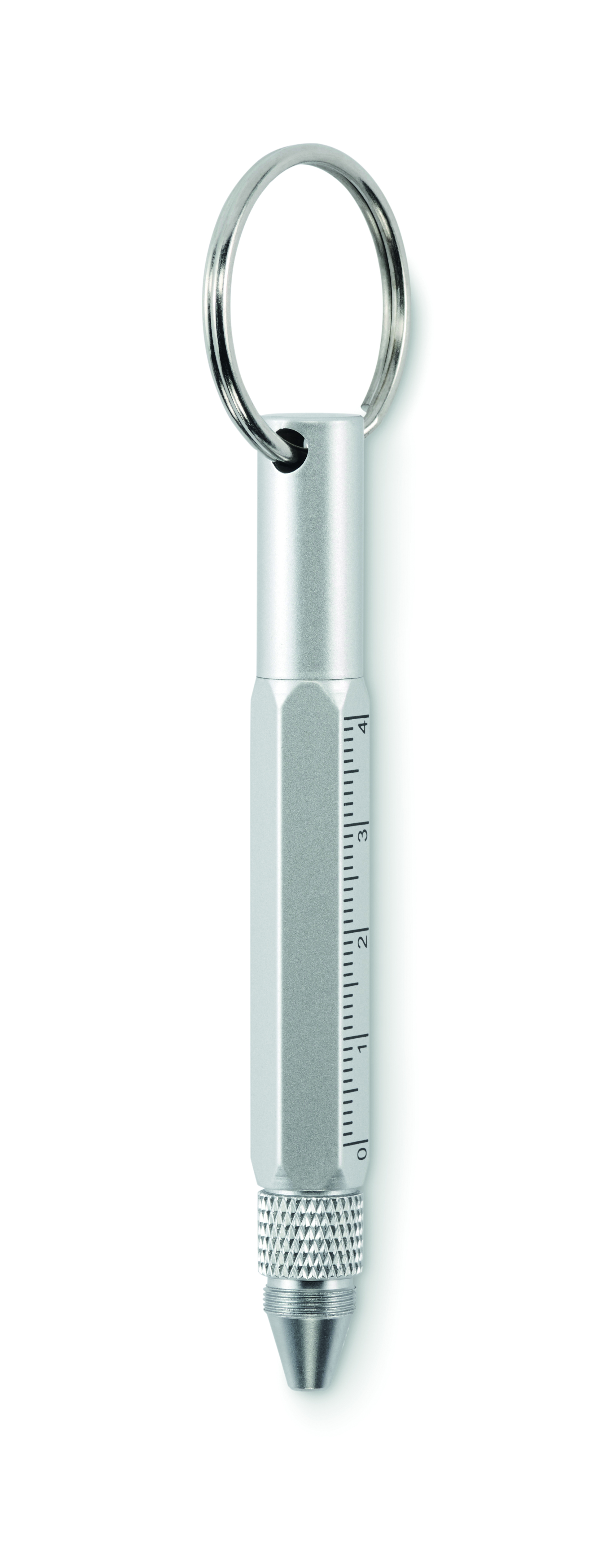 Brelok do kluczy z przekręcanym długopisem z aluminium pochodzącego z recyklingu z linijką 4 cm i 1,5 cala, rysikiem i śrubokrętem 2 w 1 z łbem krzyżakowym i płaskim. Czarny tusz.