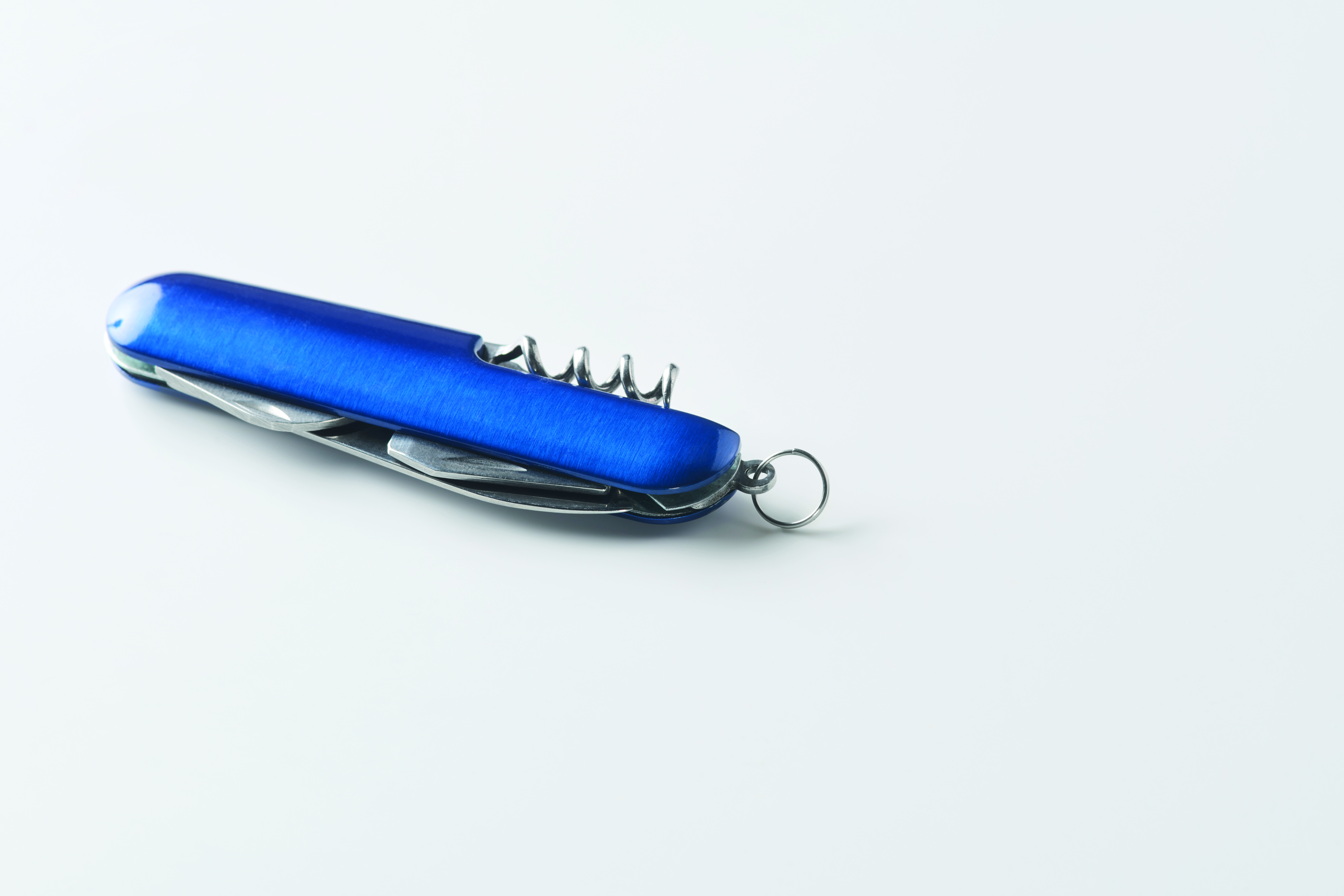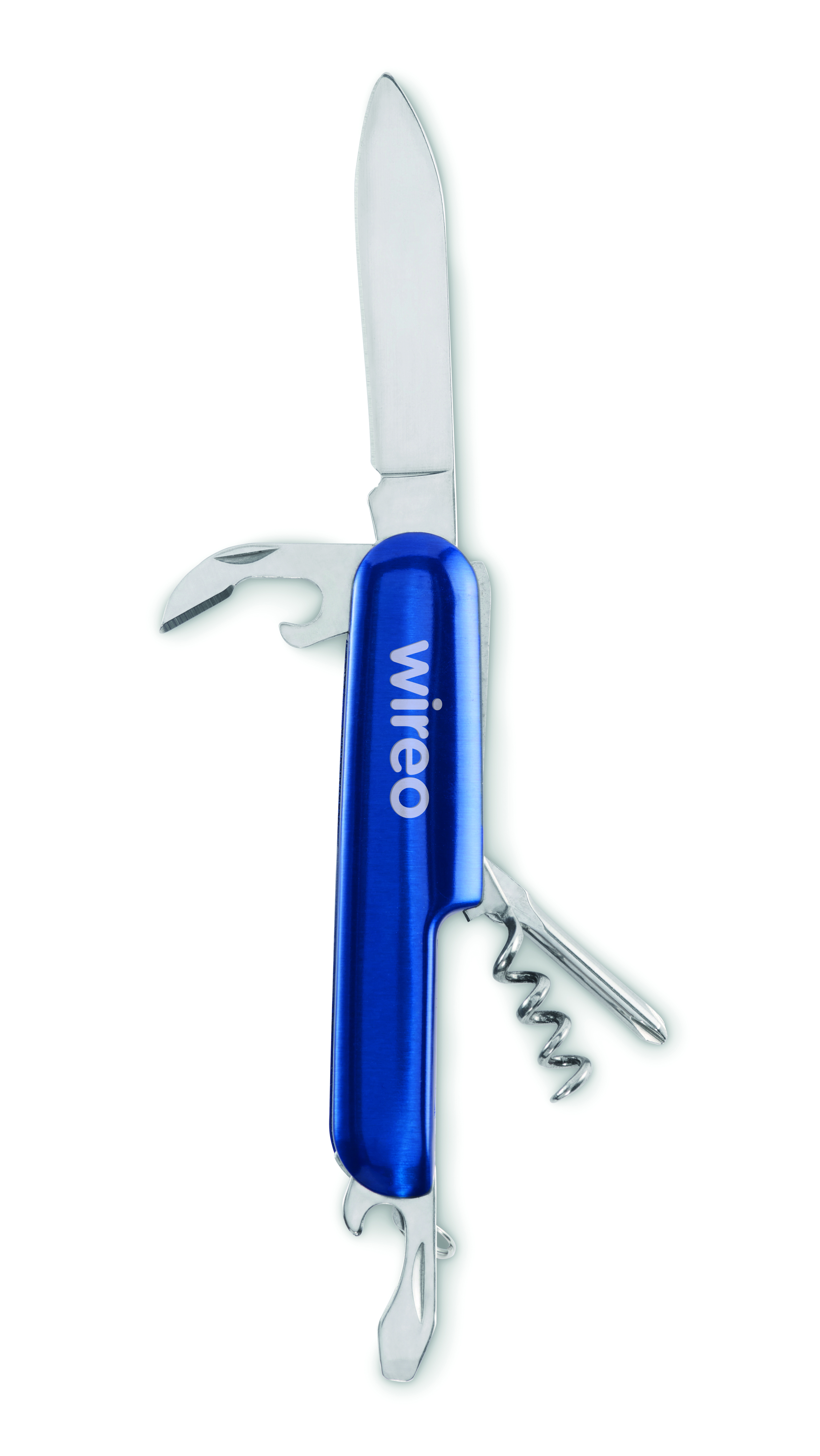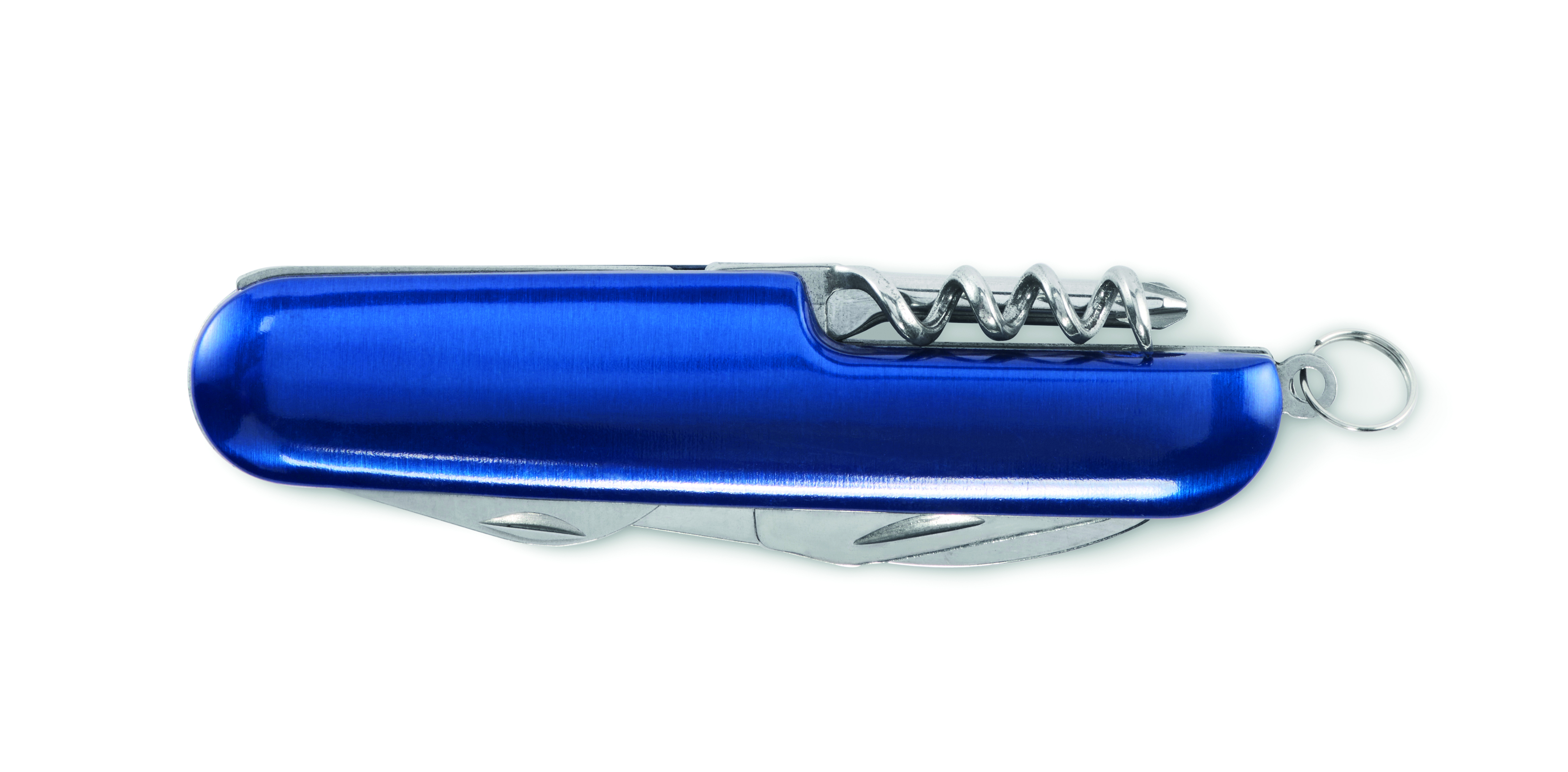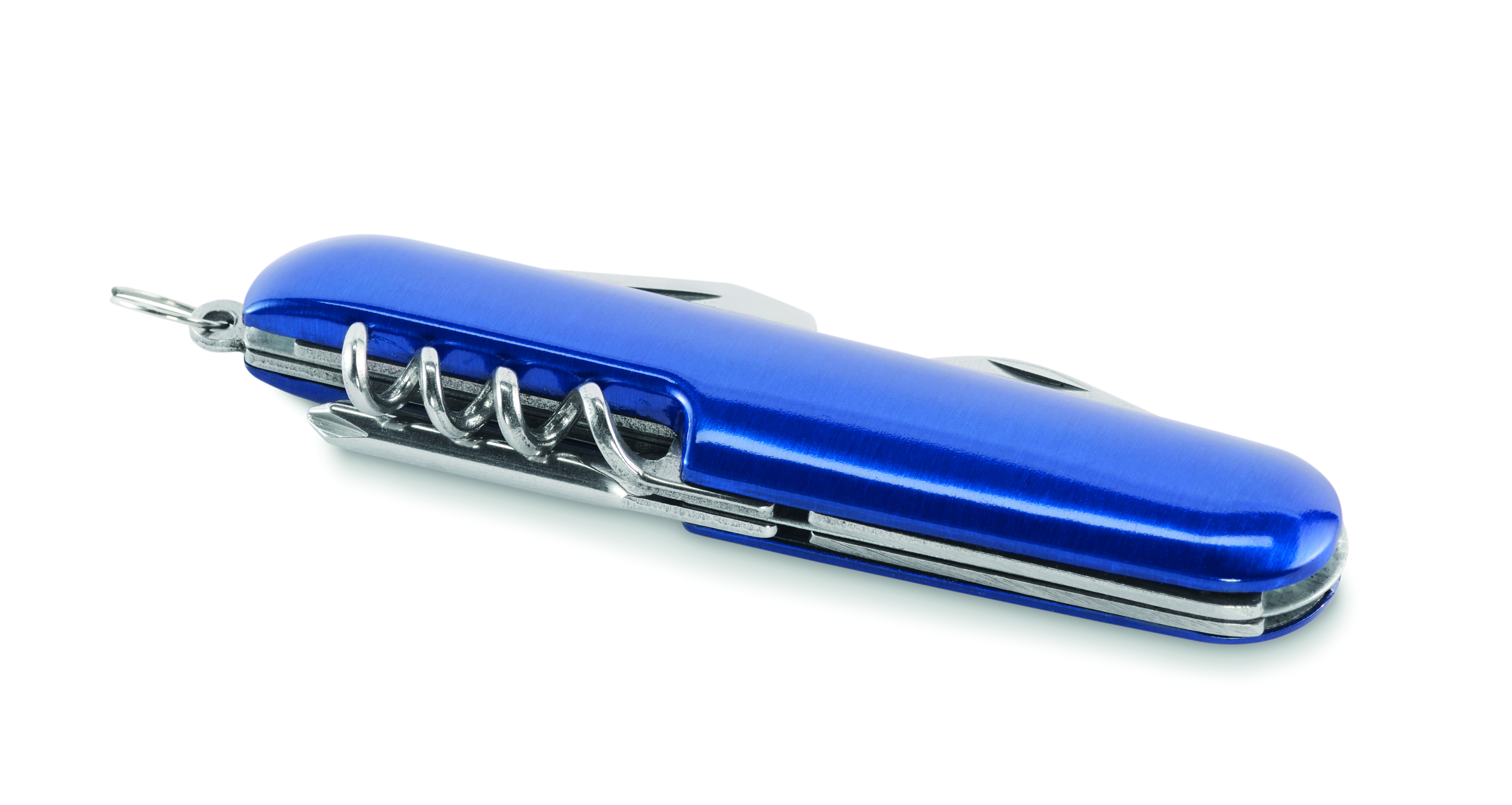 Wielofunkcyjny scyzoryk z aluminium pochodzącego z recyklingu. 5 funkcji: duże ostrze, otwieracz do butelek, śrubokręt, korkociąg i otwieracz do puszek.