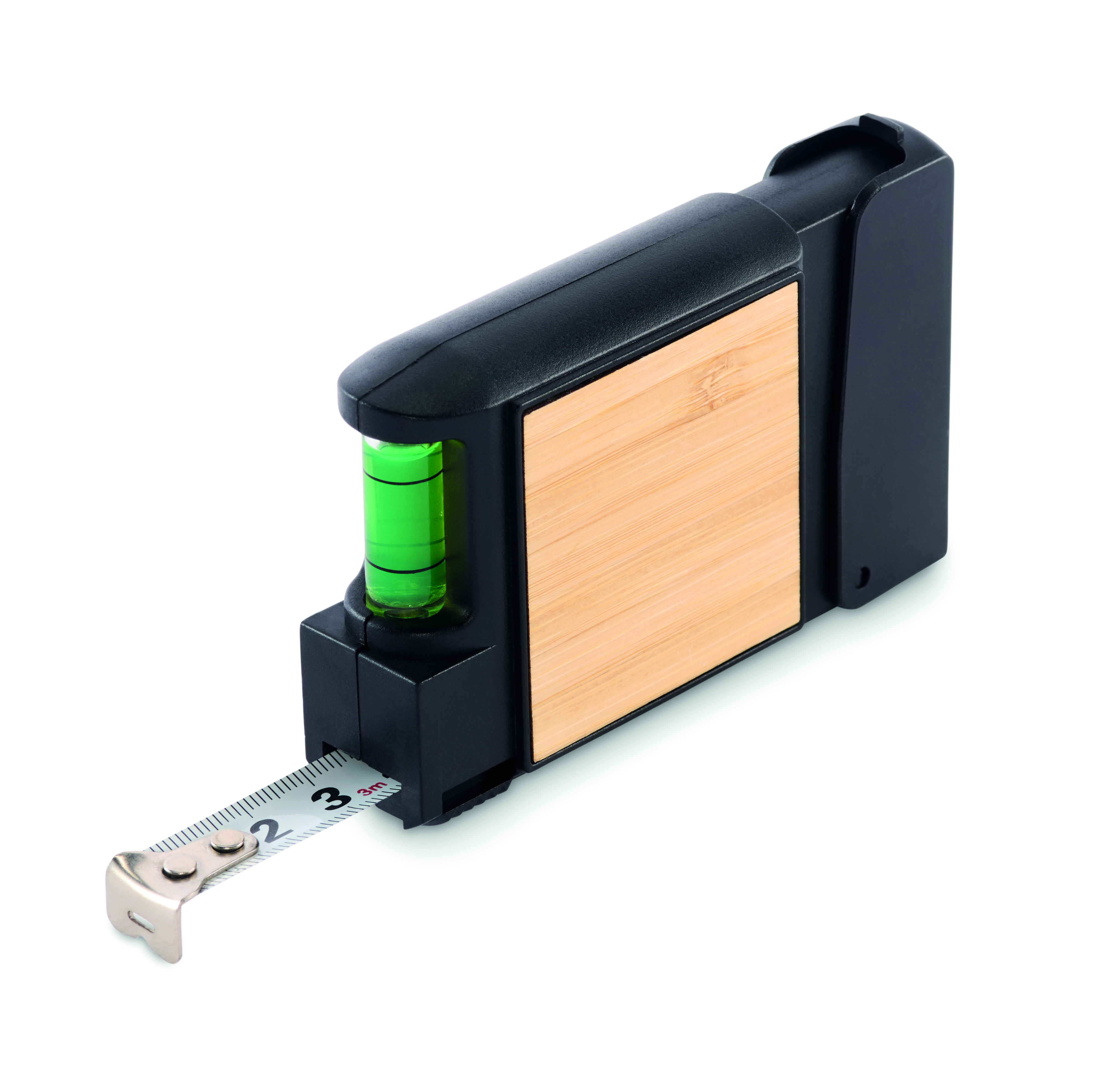 Wielofunkcyjna miarka 3M z bambusowymi detalami, poziomicą i zestawem wkrętów z 5 końcówkami.