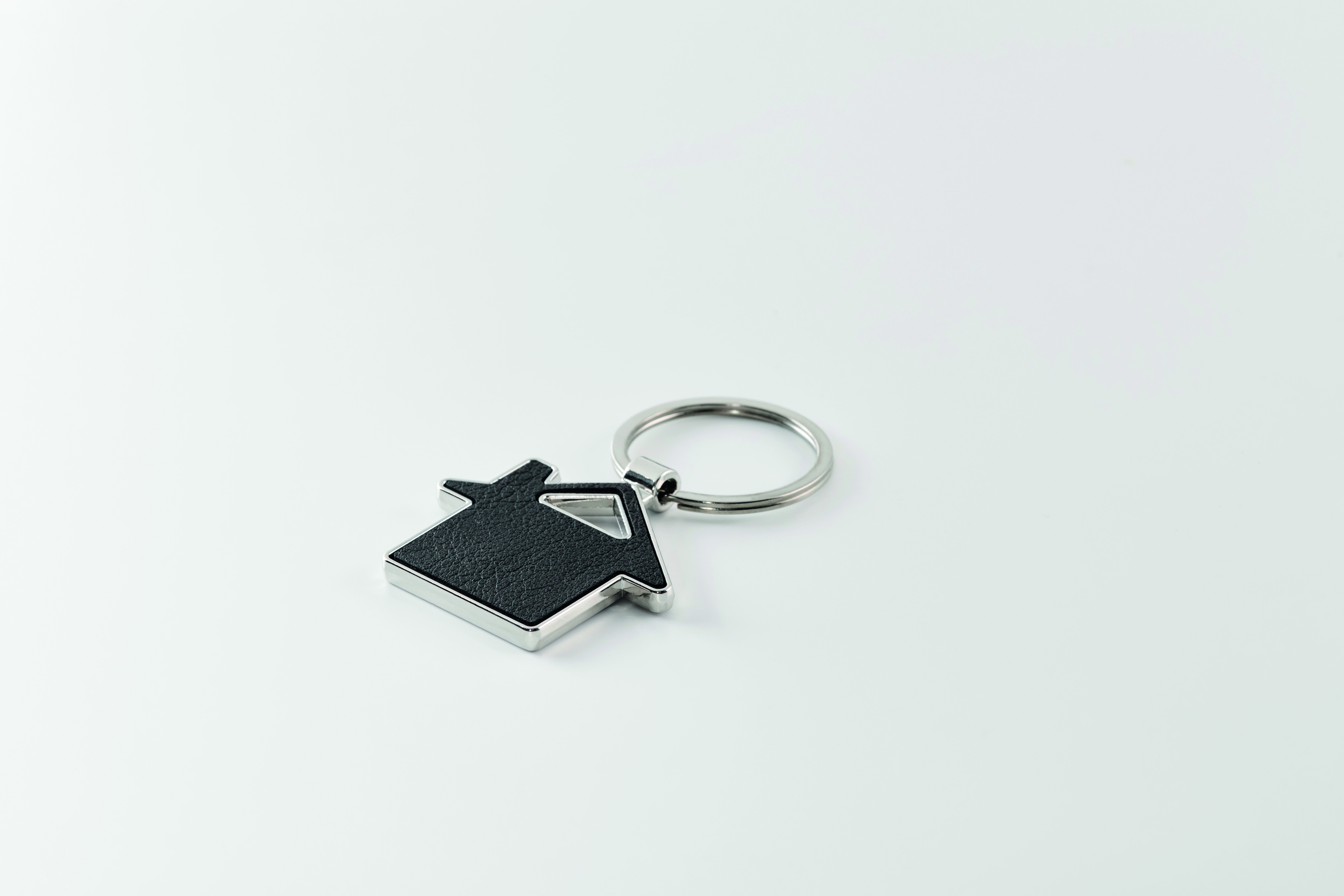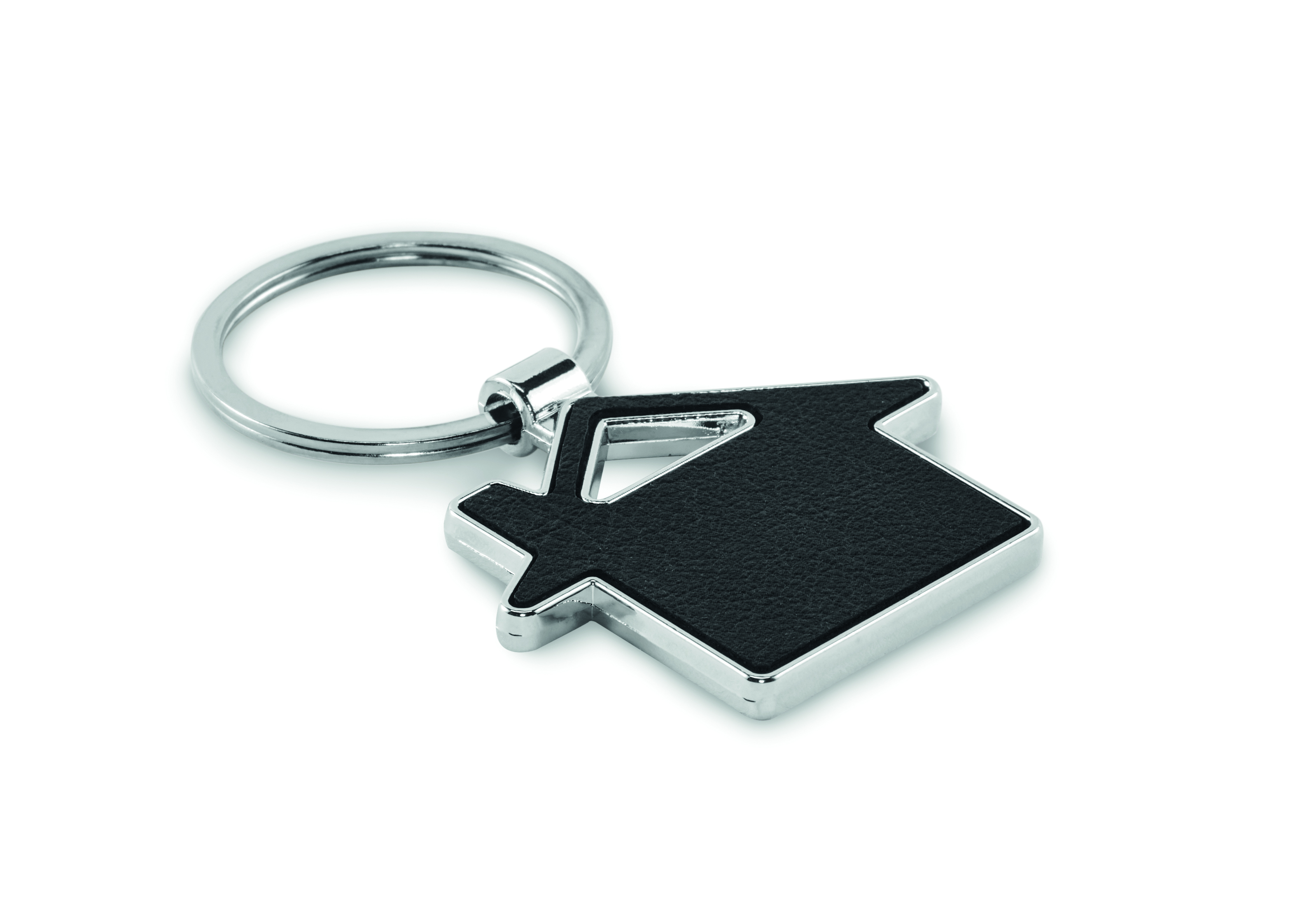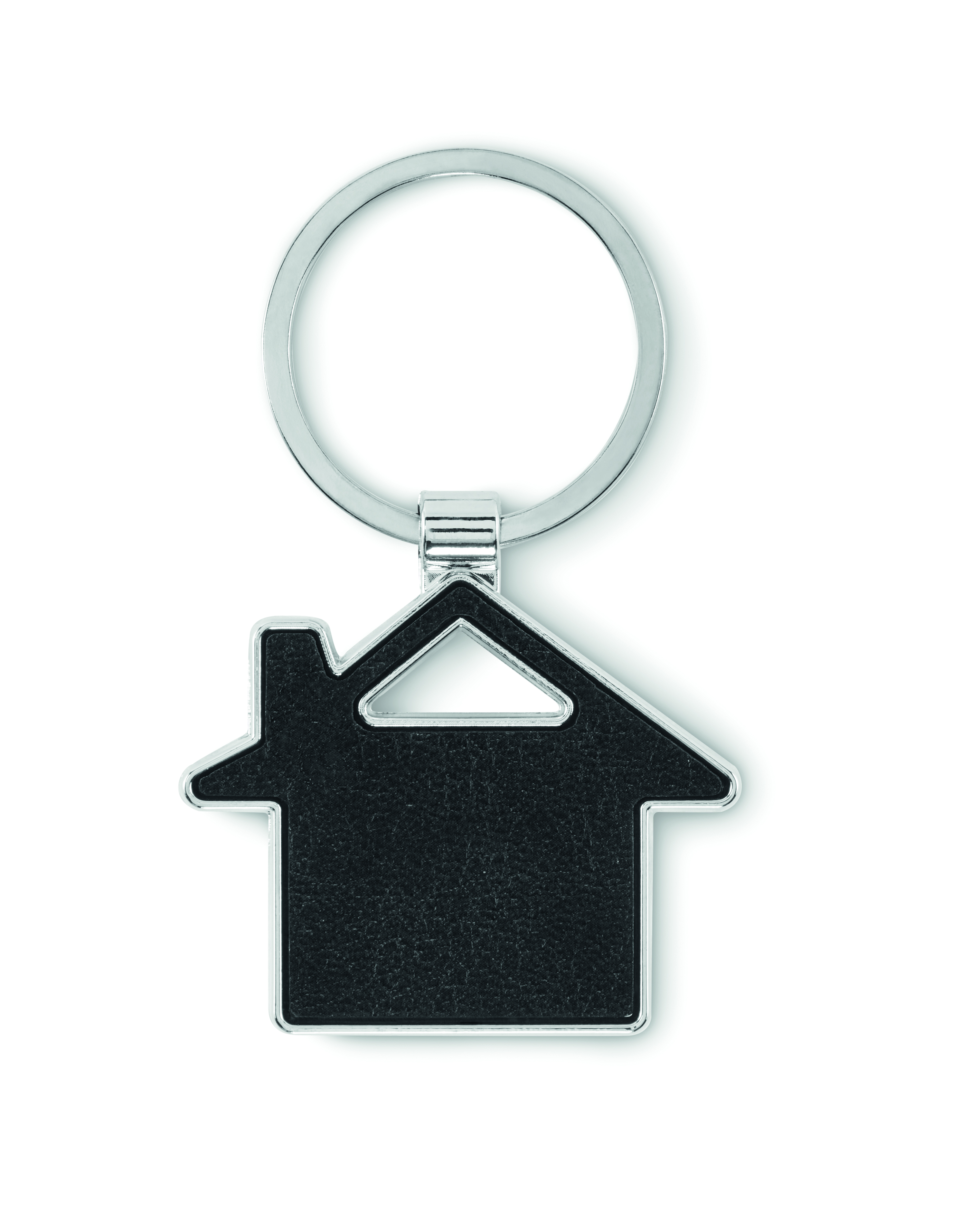 Metalowy brelok w kształcie domu z wkładką z recyklingowanej skóry PU.