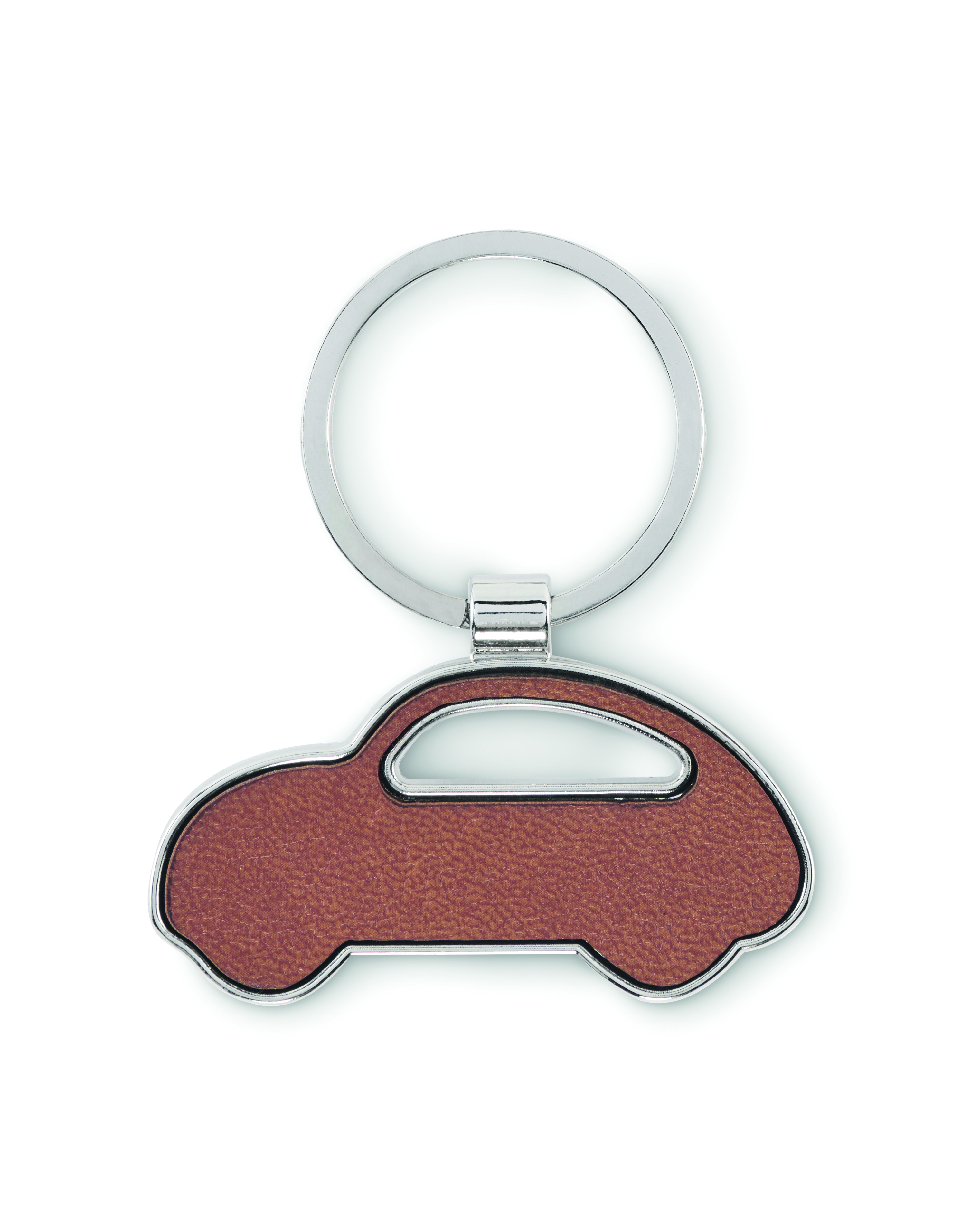 Metalowy brelok w kształcie samochodu z wkładką ze skóry PU pochodzącej z recyklingu.