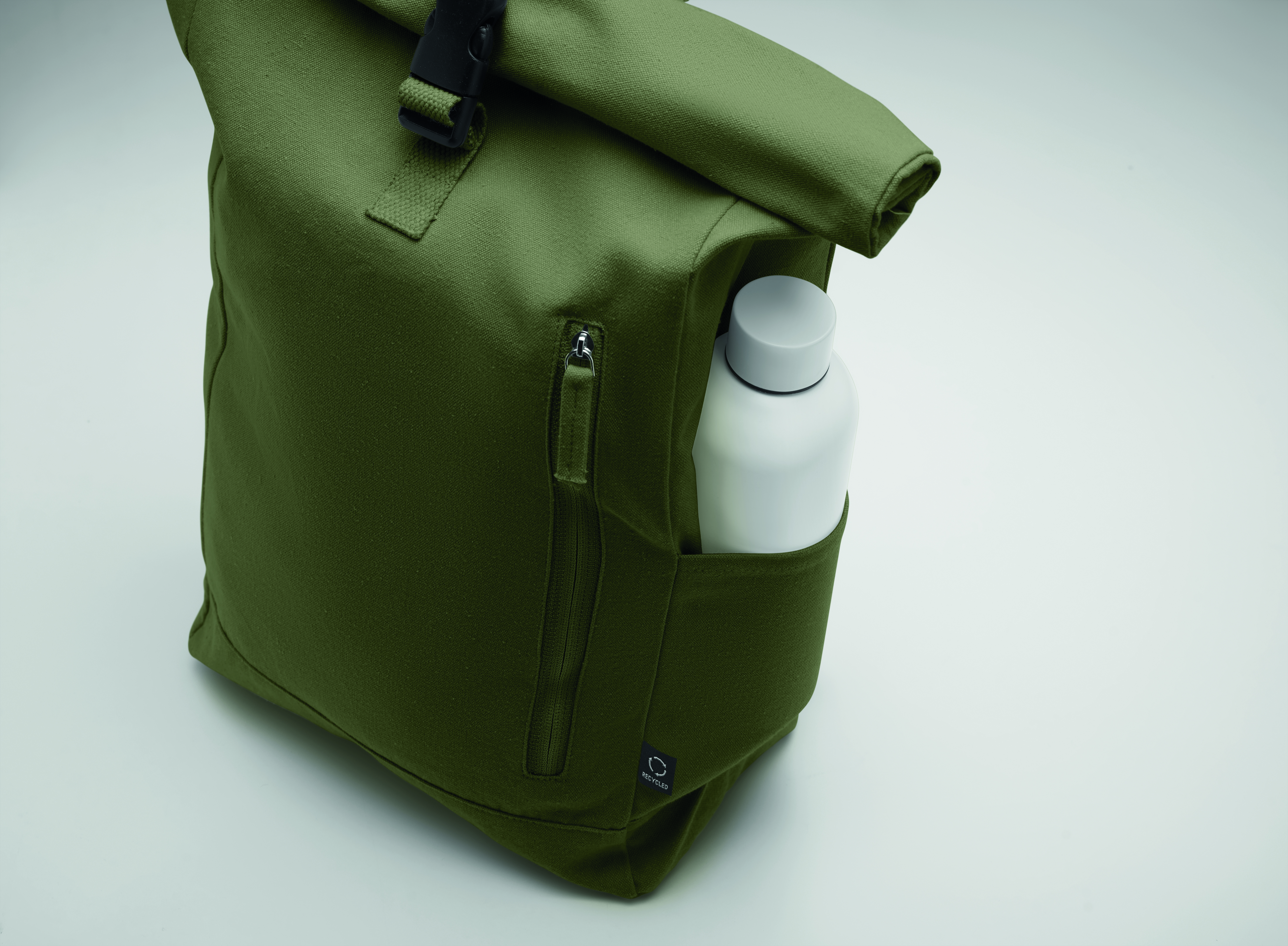 Plecak z zapięciem na rzep wykonany z bawełny z recyklingu o gramaturze 390 gr/m² (80%) i poliestru z recyklingu (20%). Przednia kieszeń zapinana na zamek.