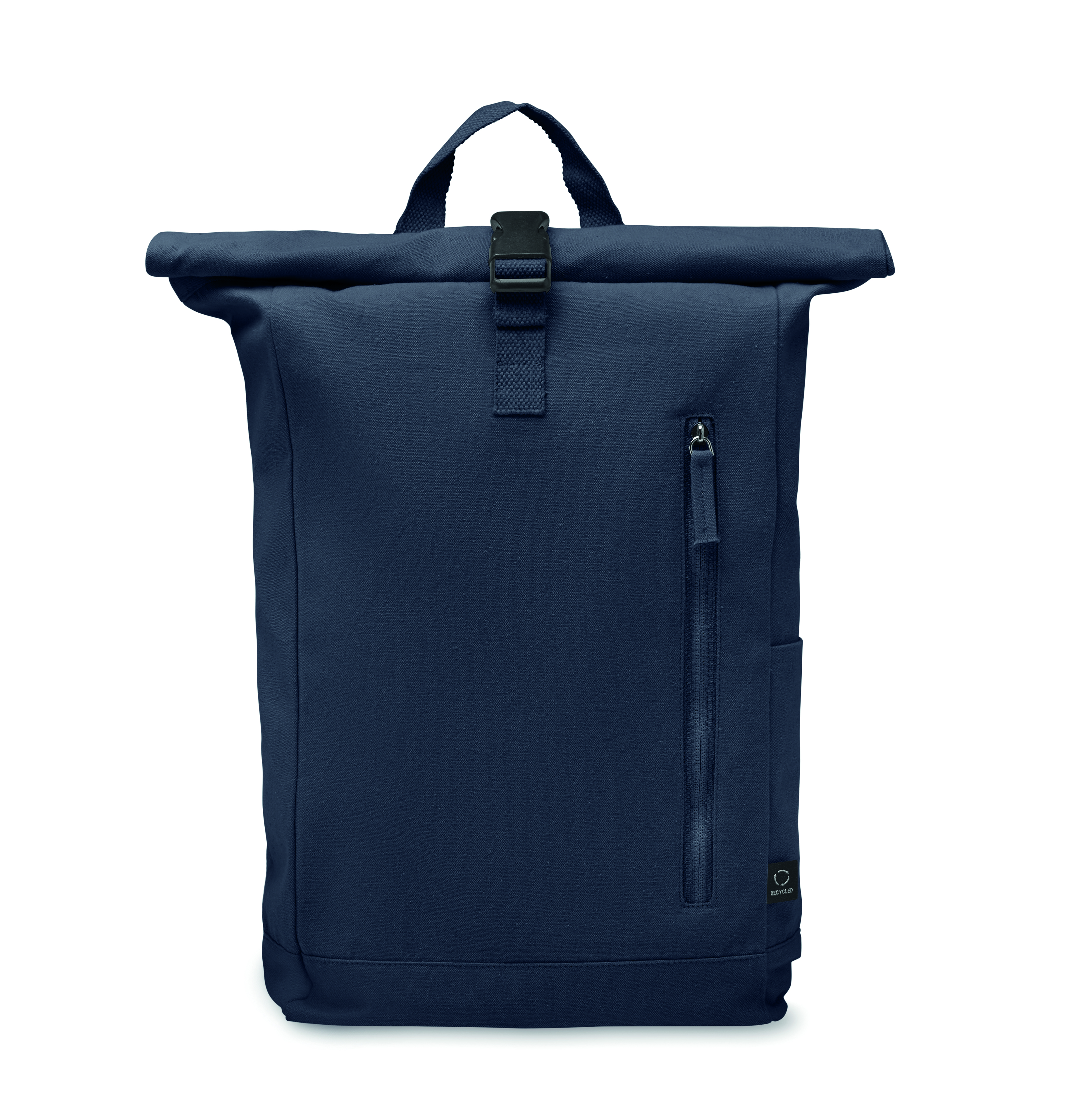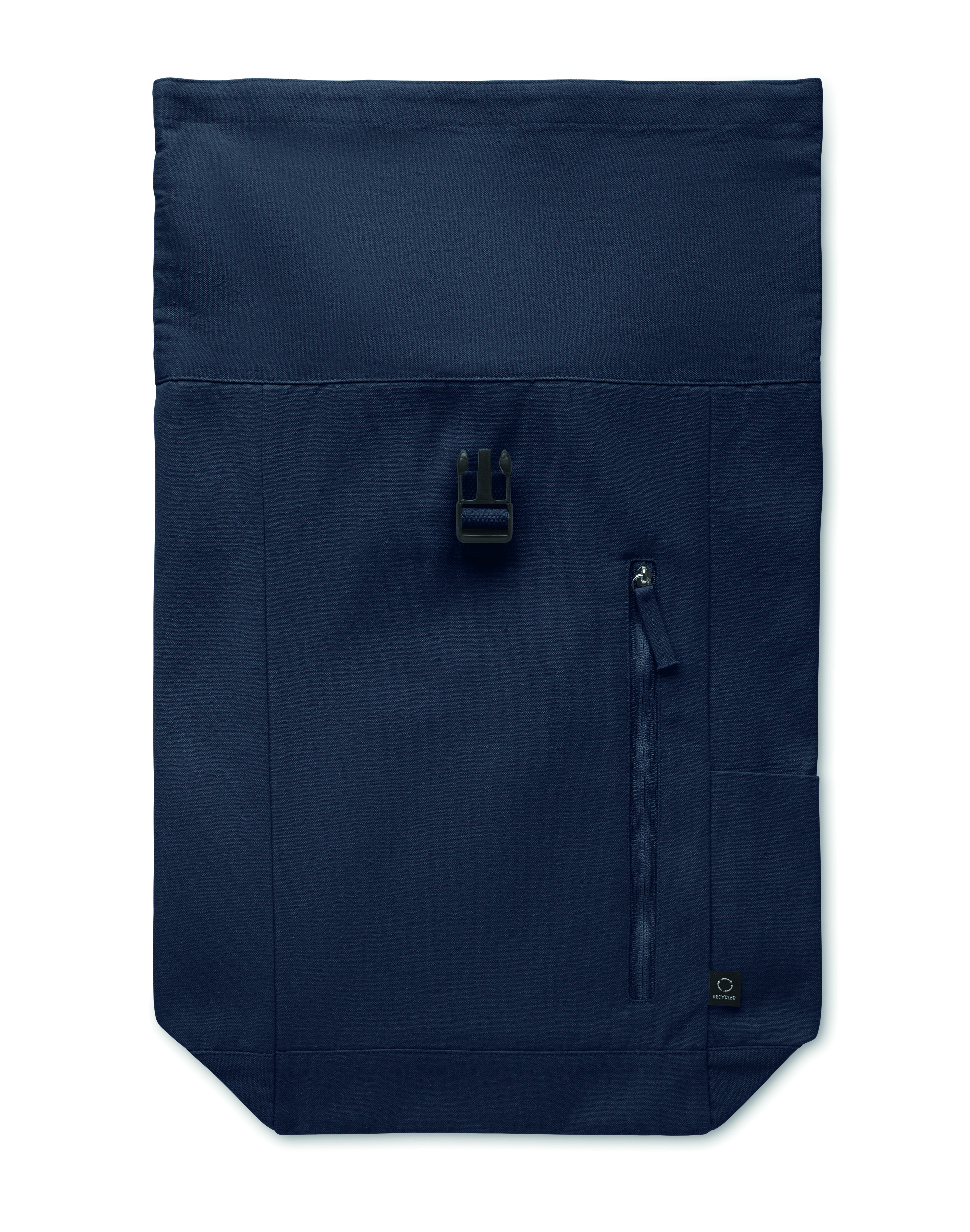 Plecak z zapięciem na rzep wykonany z bawełny z recyklingu o gramaturze 390 gr/m² (80%) i poliestru z recyklingu (20%). Przednia kieszeń zapinana na zamek.