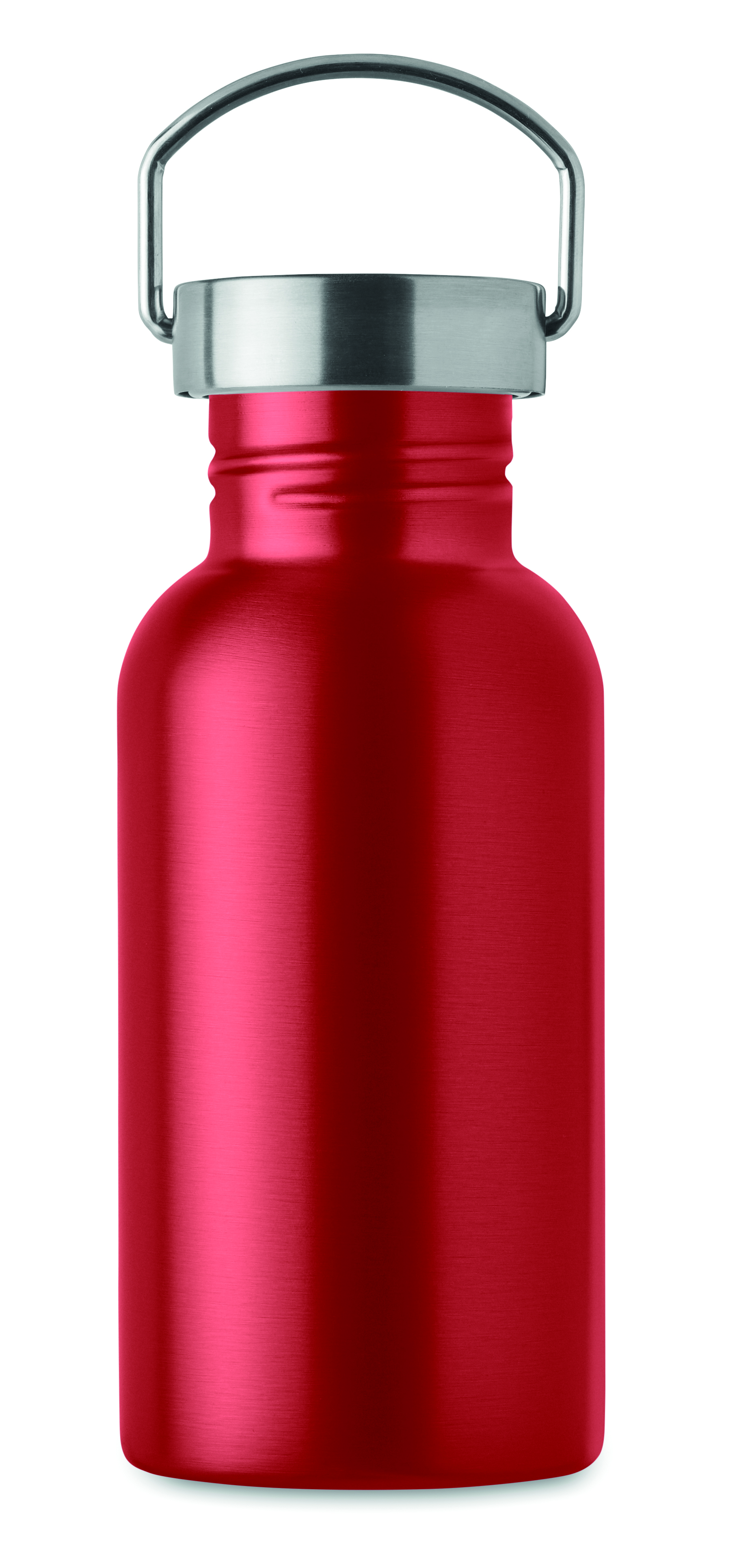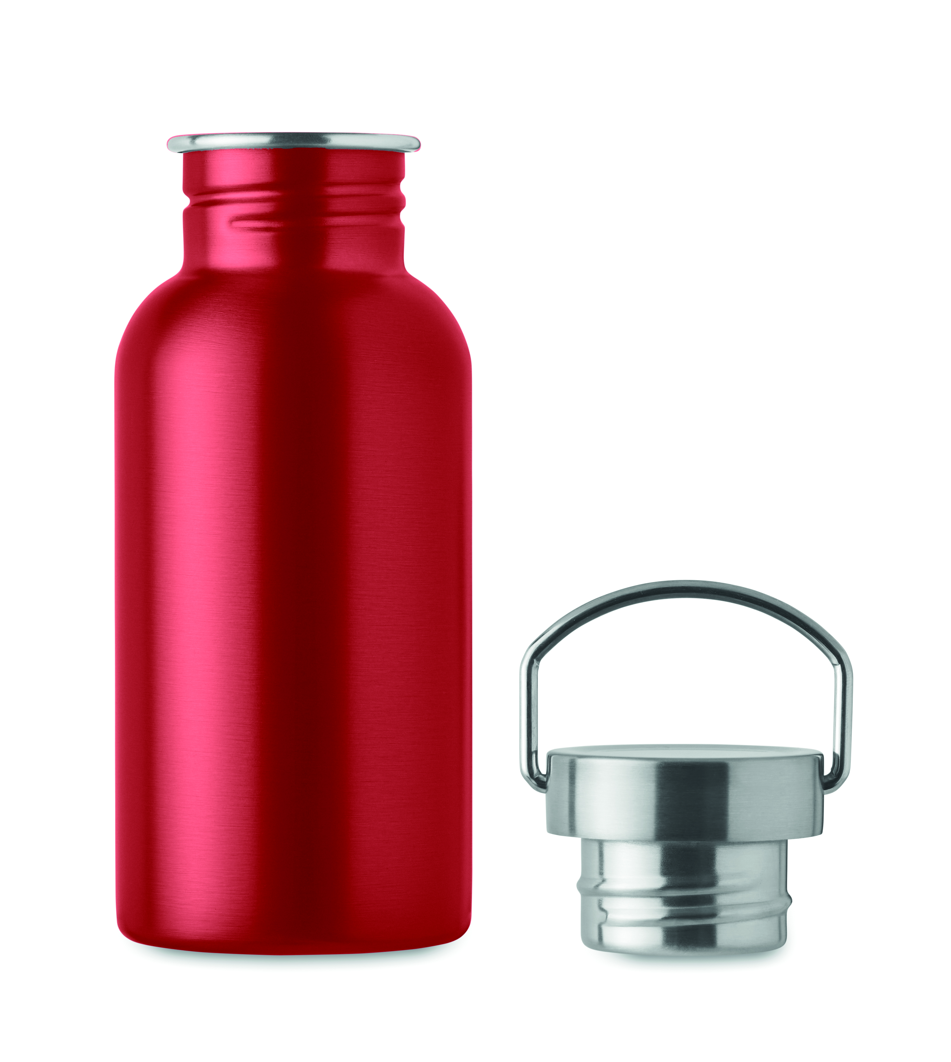 Jednościenna butelka z recyklingowanej stali nierdzewnej (90% stali nierdzewnej z recyklingu i 10% stali nierdzewnej) z pokrywką i uchwytem. Nie przecieka. Pojemność: 500 ml. Ponieważ jest to butelka z pojedynczą ścianką, może dochodzić do wymiany ciepła.