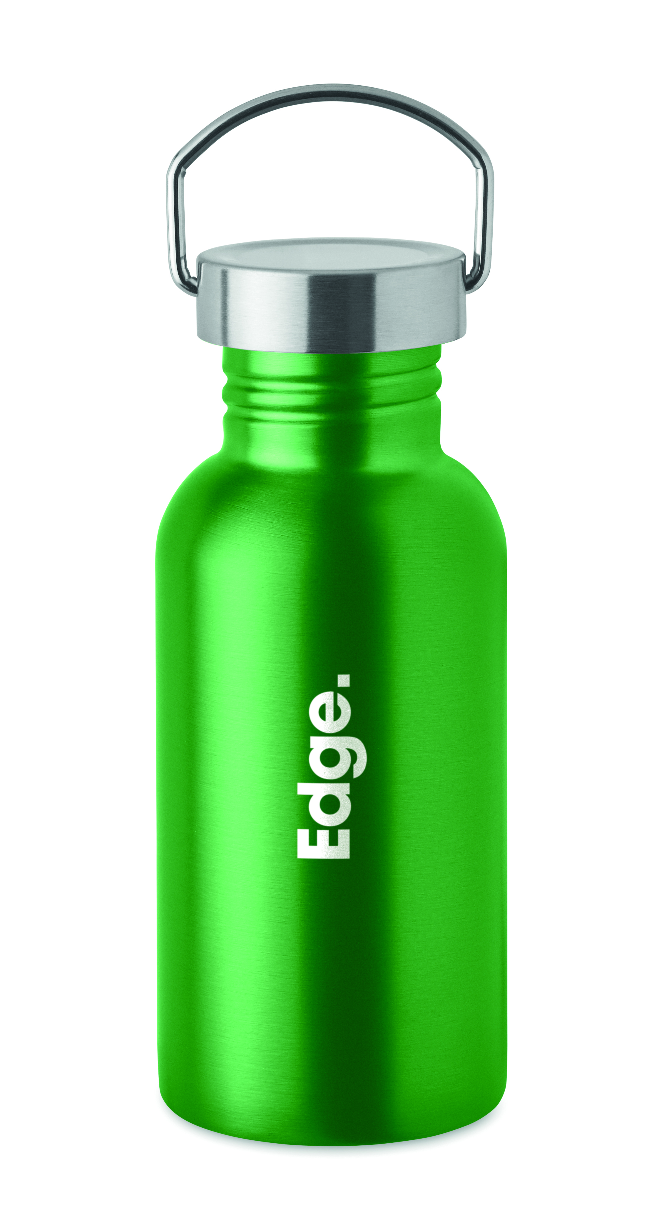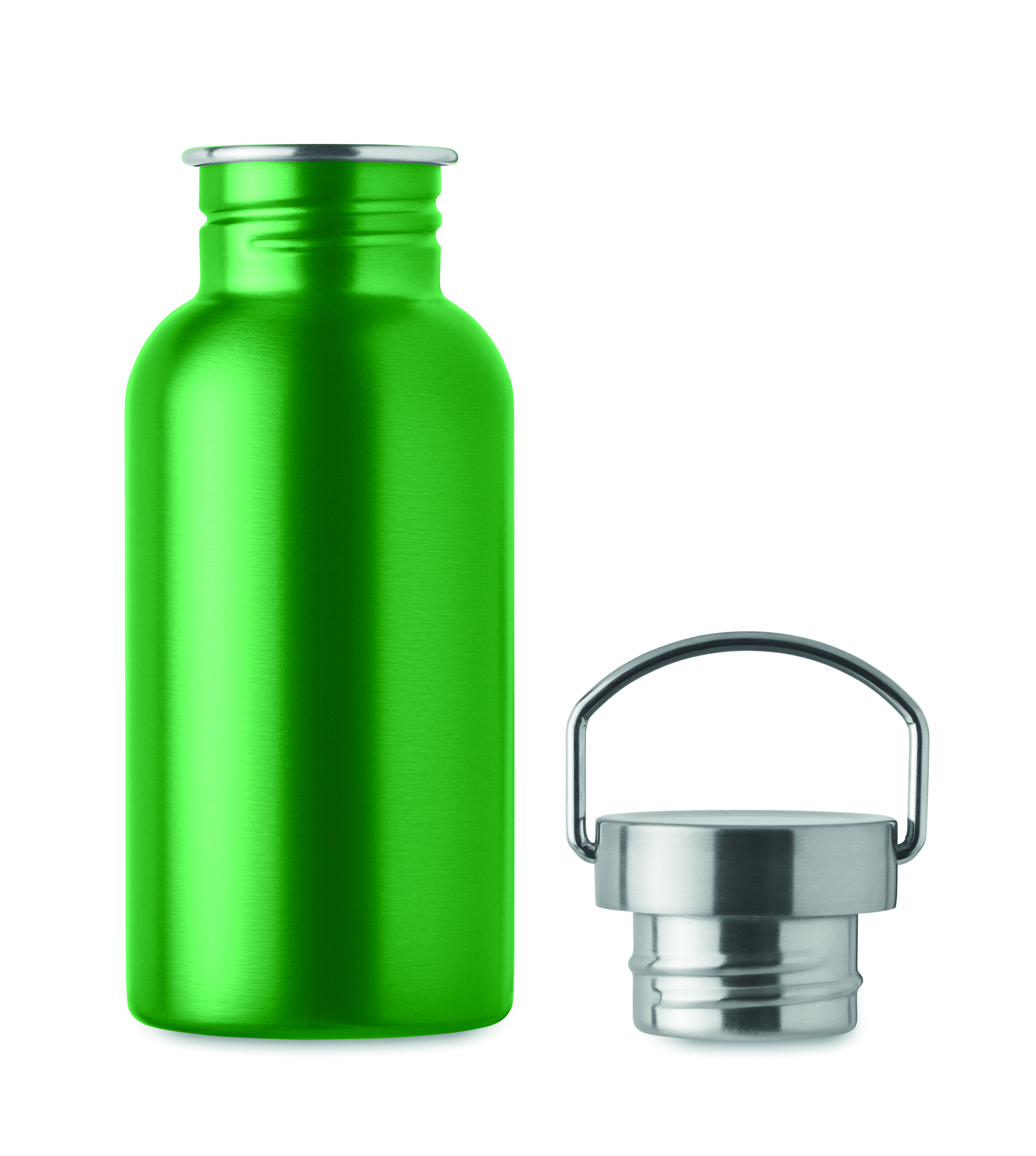 Jednościenna butelka z recyklingowanej stali nierdzewnej (90% stali nierdzewnej z recyklingu i 10% stali nierdzewnej) z pokrywką i uchwytem. Nie przecieka. Pojemność: 500 ml. Ponieważ jest to butelka z pojedynczą ścianką, może dochodzić do wymiany ciepła.