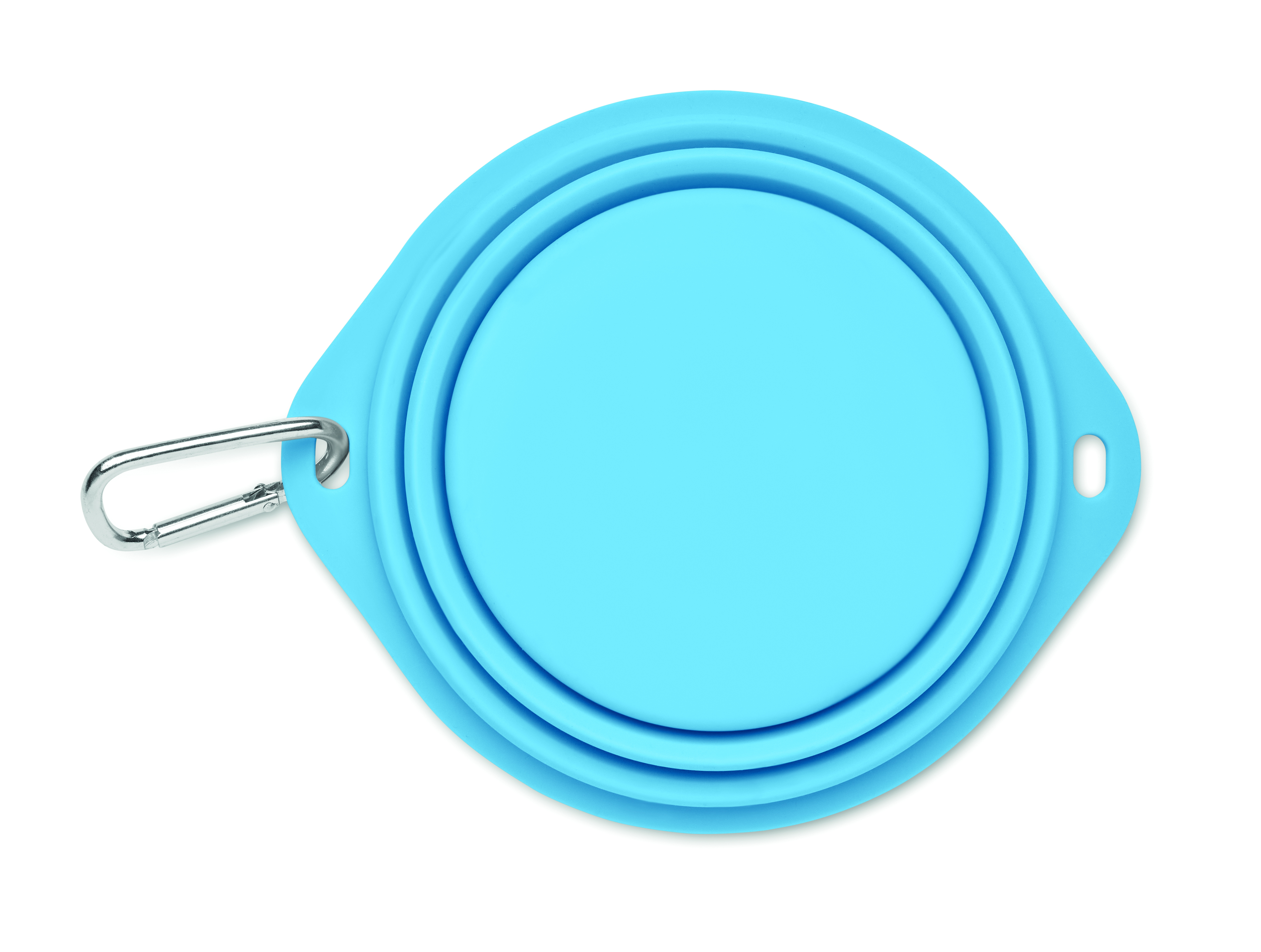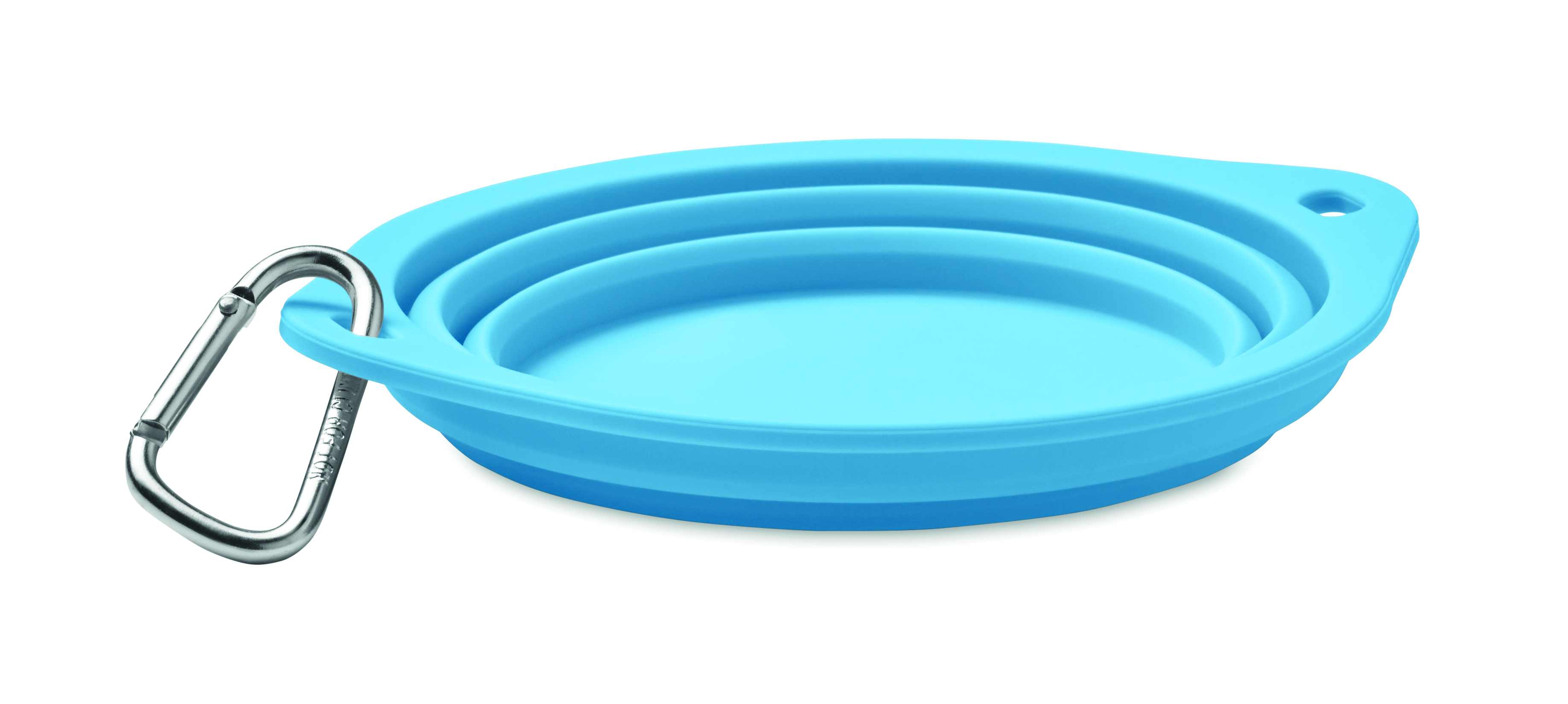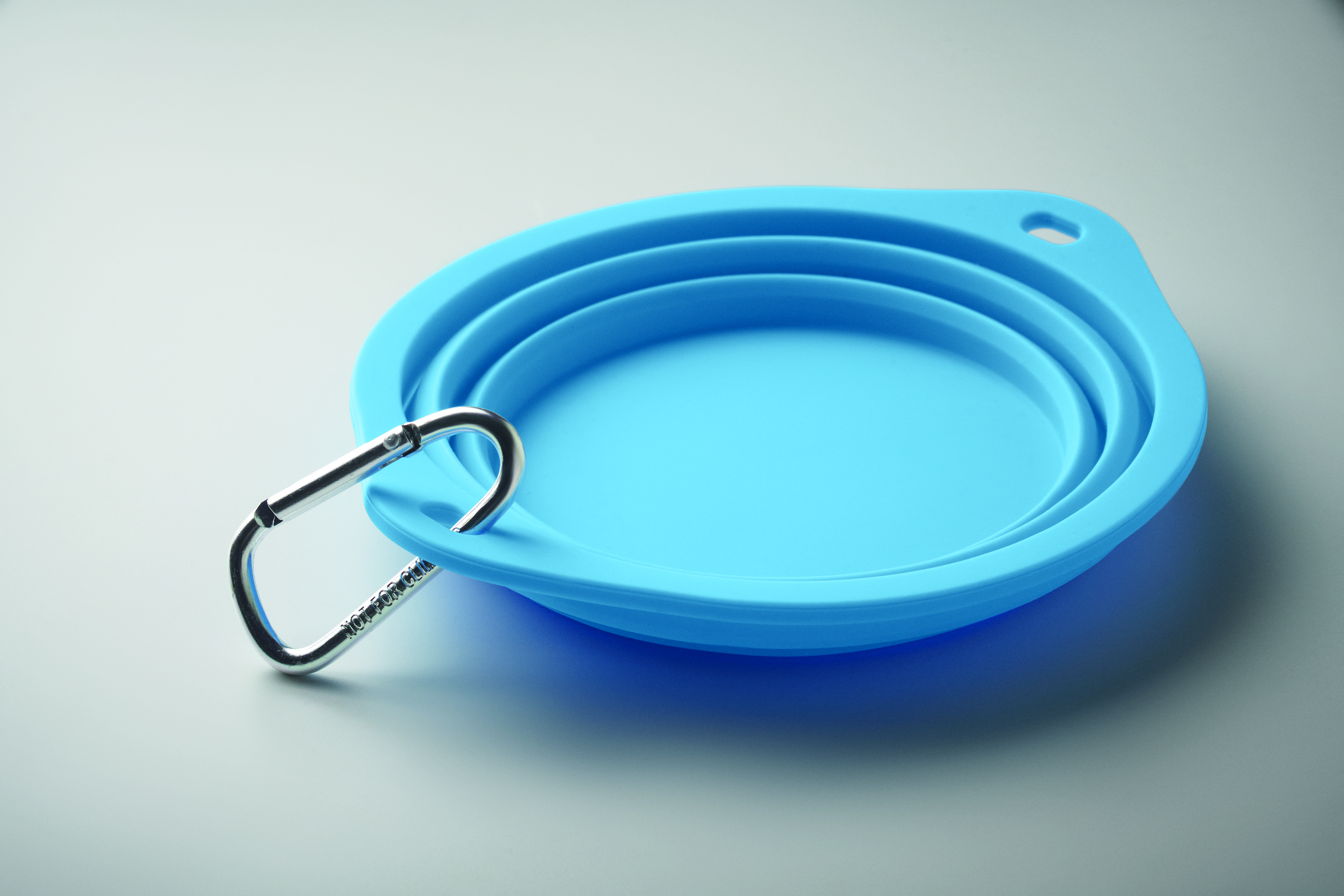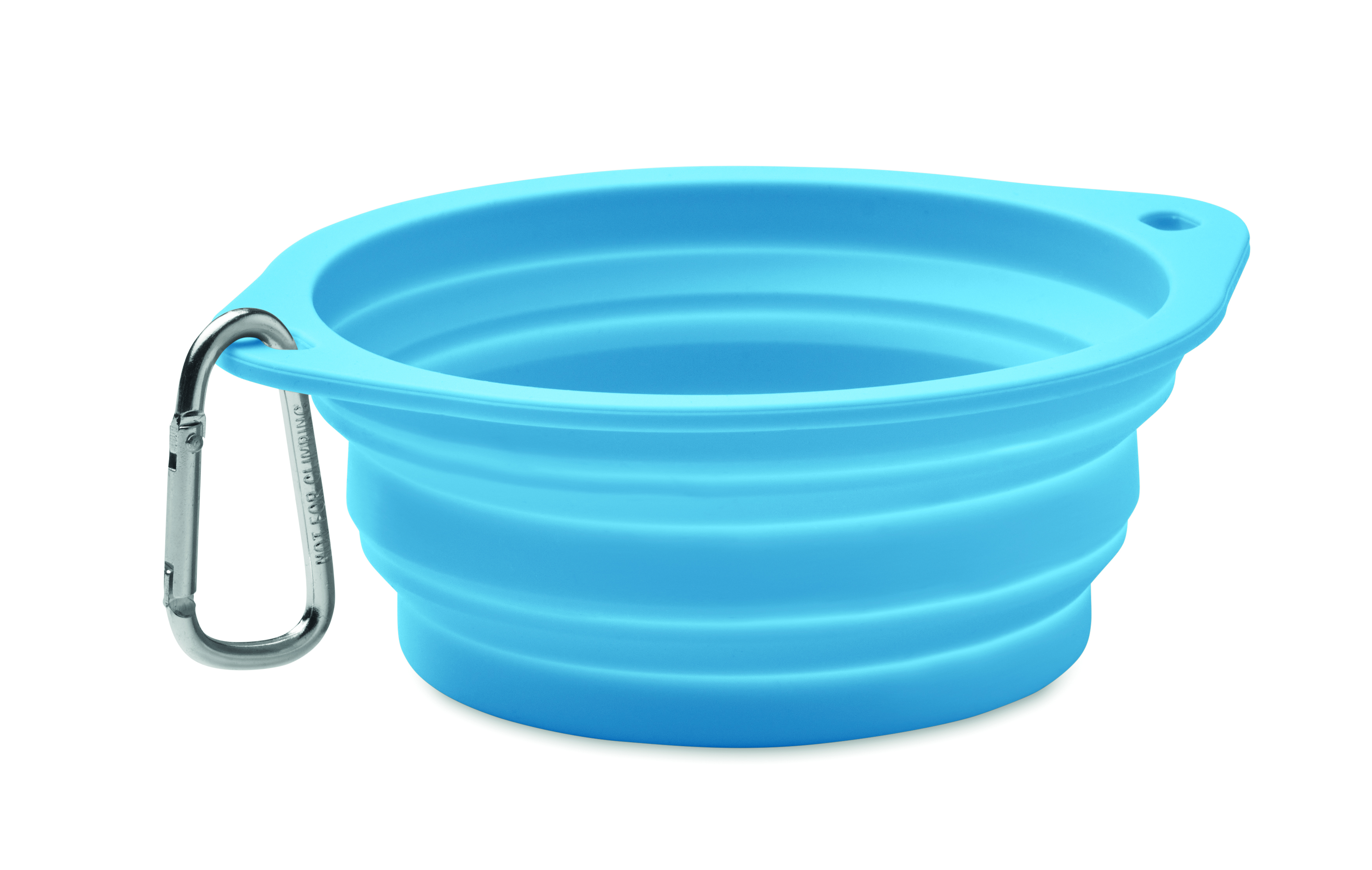 Składana, przenośna silikonowa miska na jedzenie lub picie dla zwierząt z karabińczykiem. Pojemność: 350 ml.