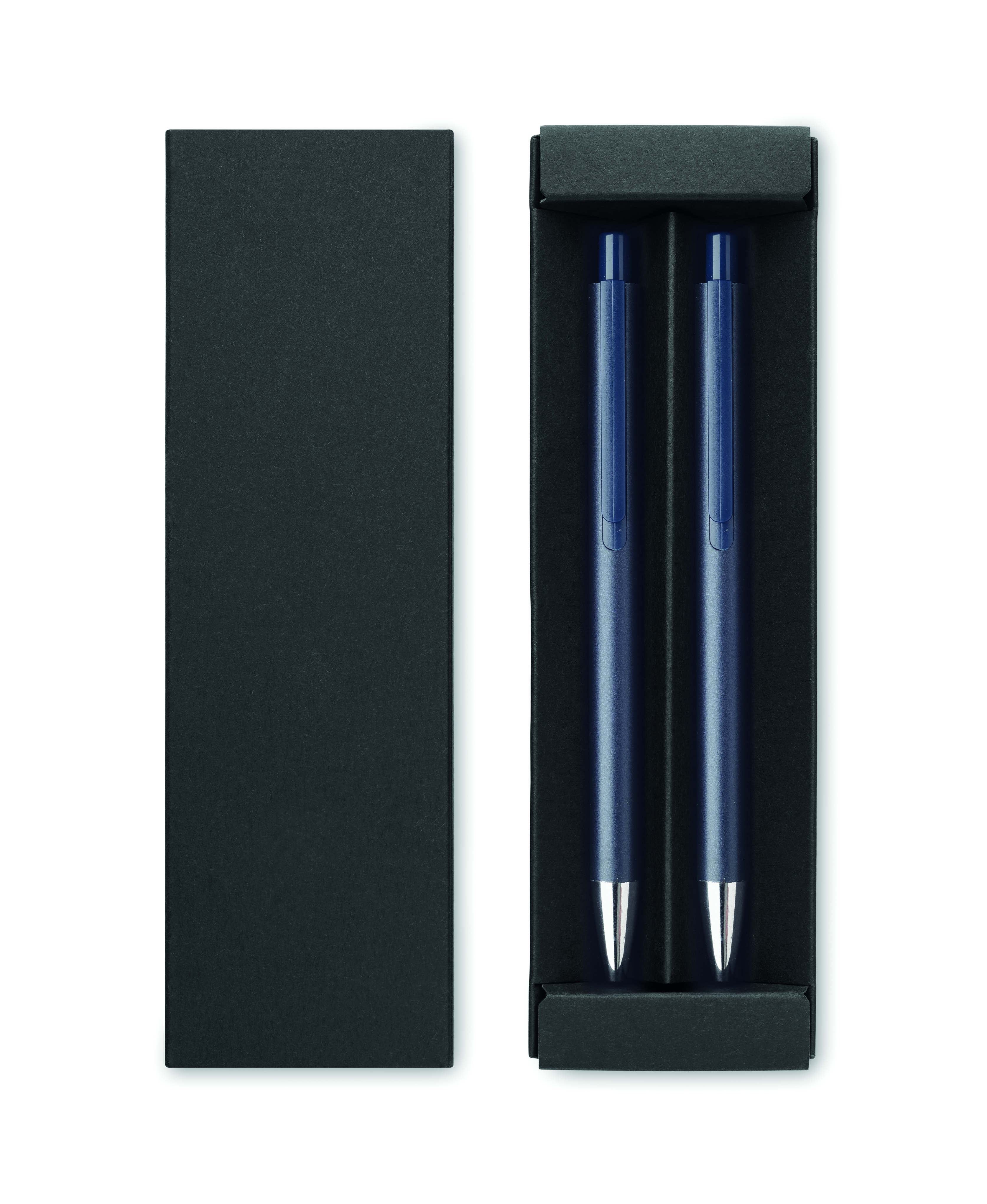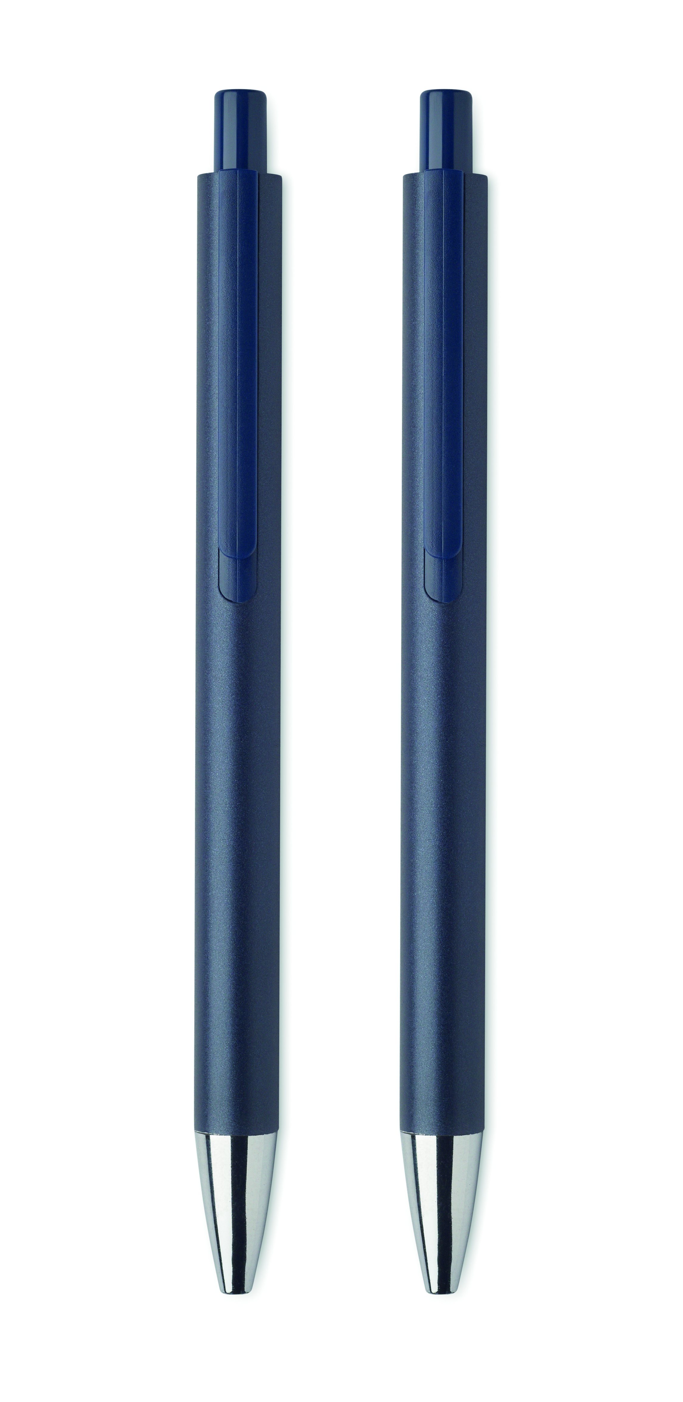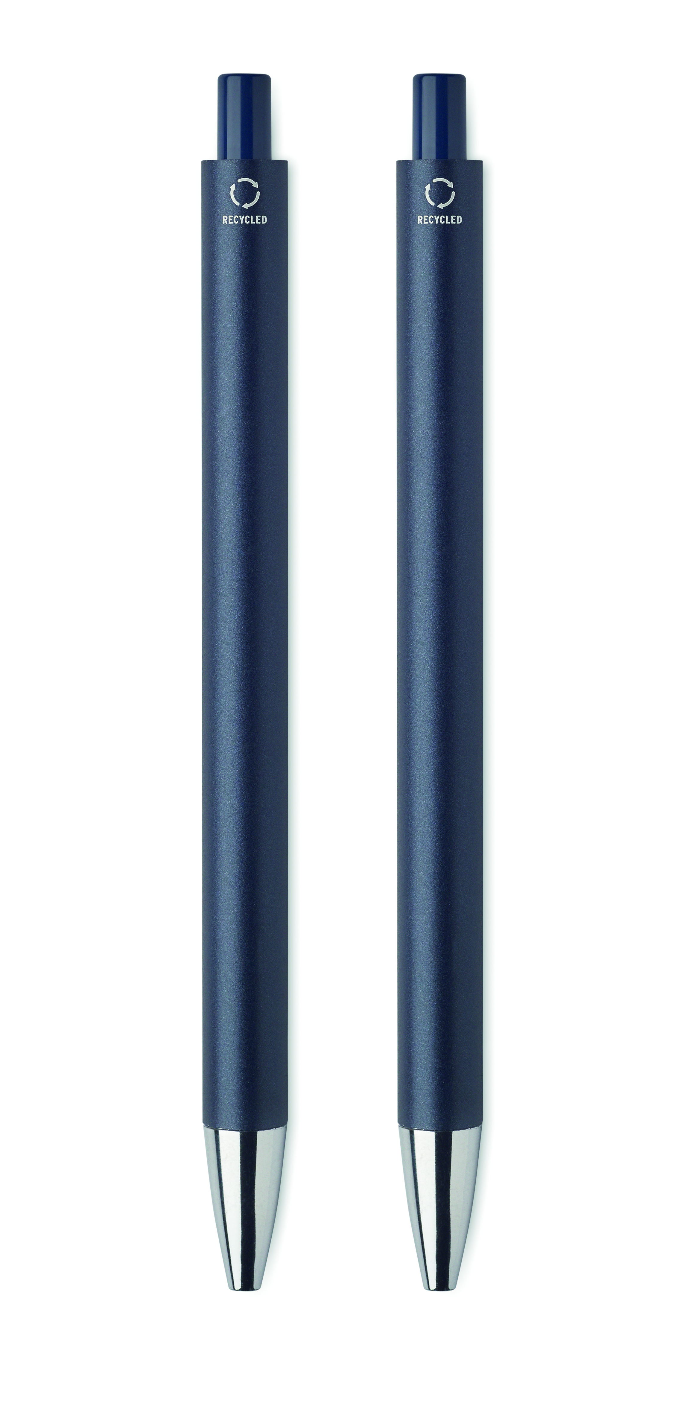 Zestaw długopisów z recyklingowanego aluminium z 1 długopisem i 1 grafitowym ołówkiem wiecznym. Niebieski tusz długopisu. Prezentowany w pudełku z papieru z recyklingu.