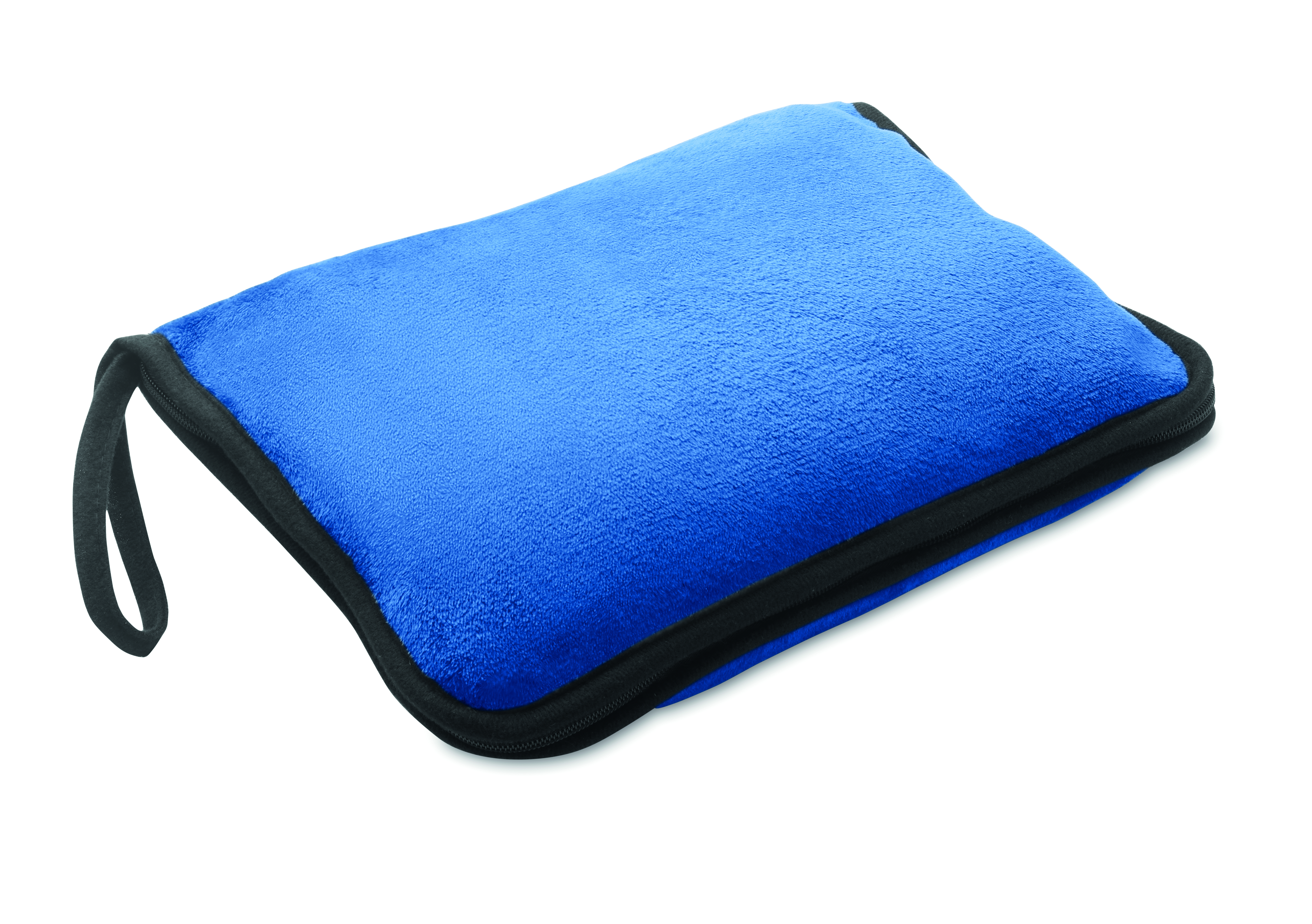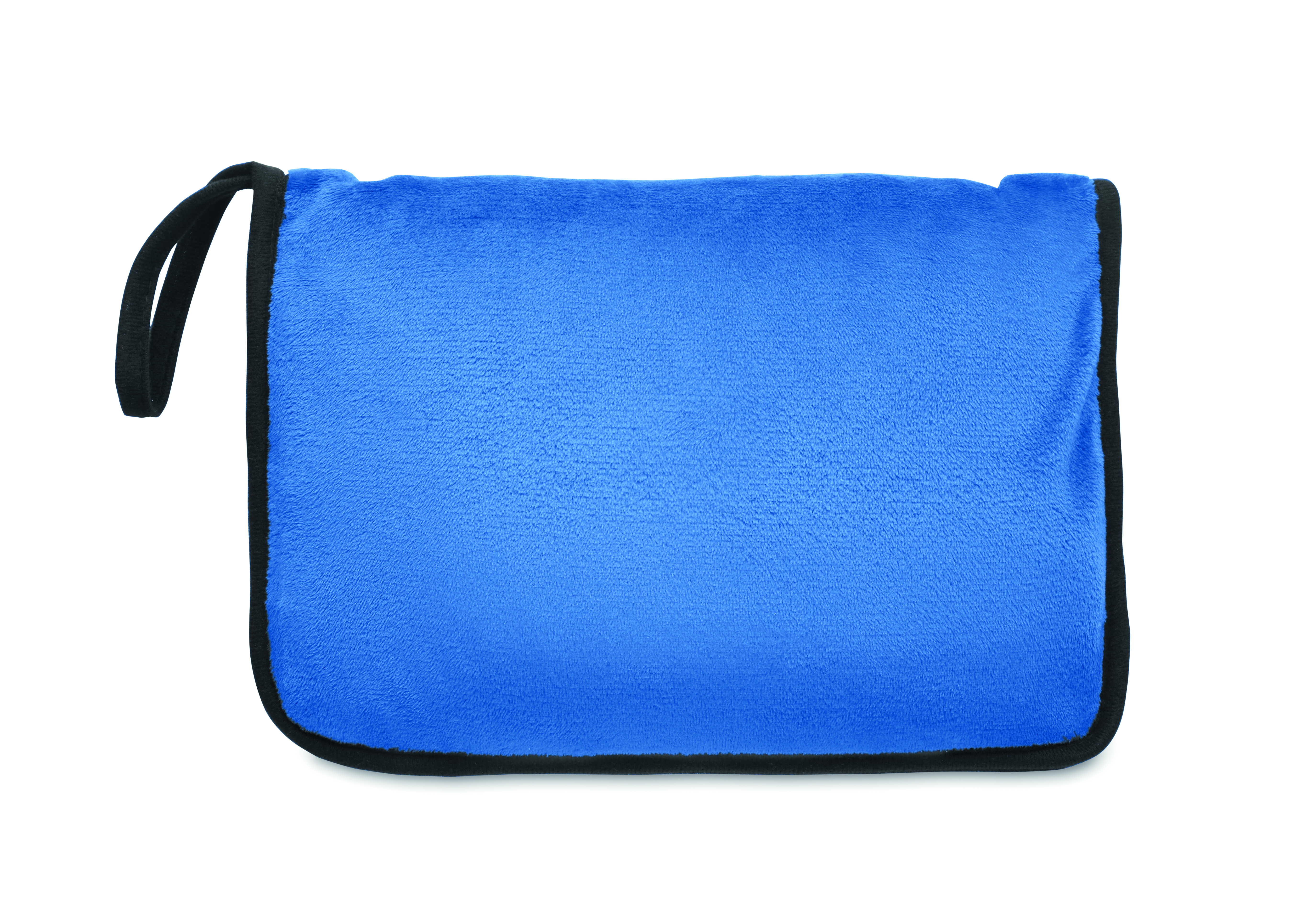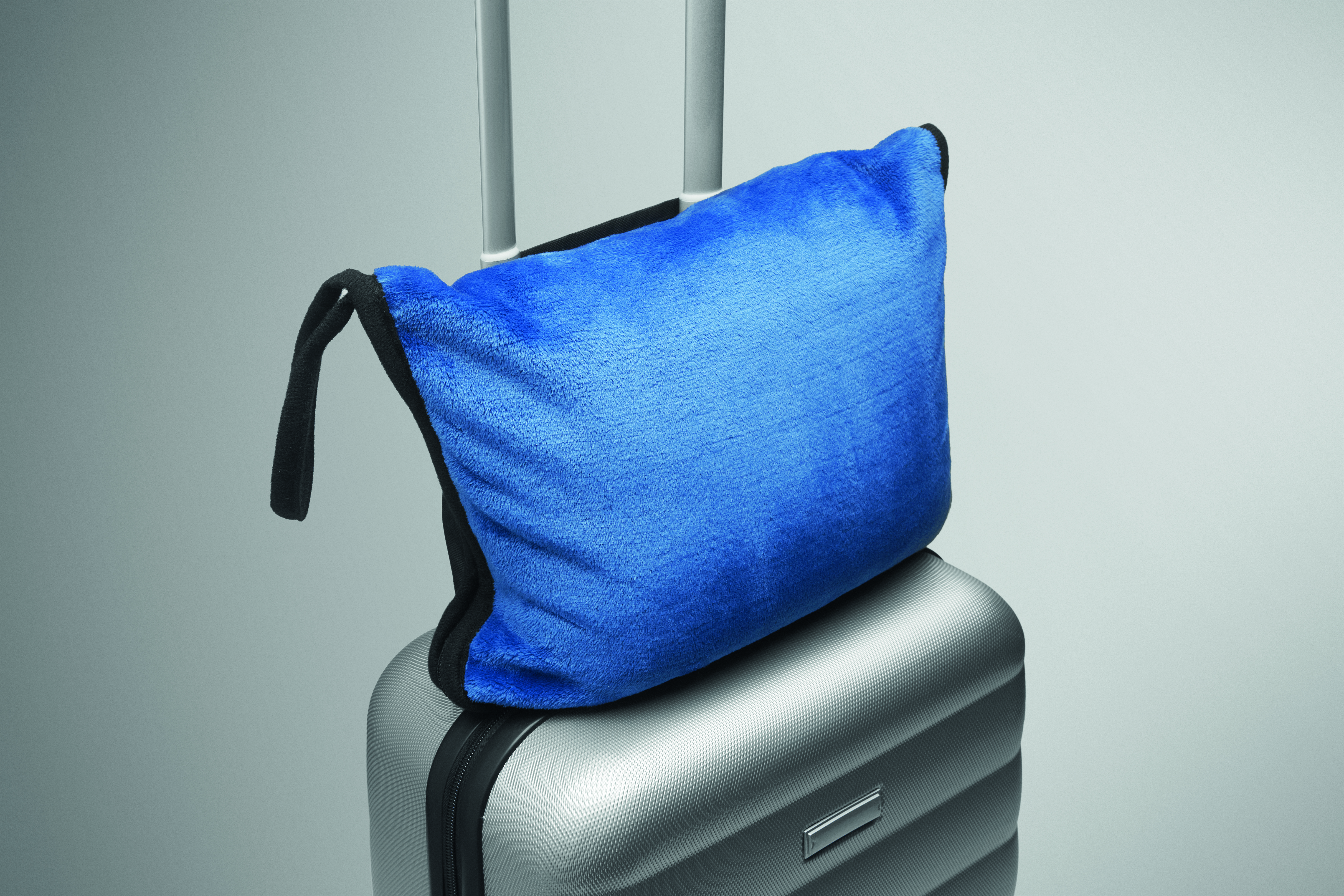 Flanelowy koc podróżny lub poduszka 2 w 1 o gramaturze 220 gr/m². Produkt można złożyć. W zestawie pasek do bagażu i uchwyt z poliestru 600D RPET.