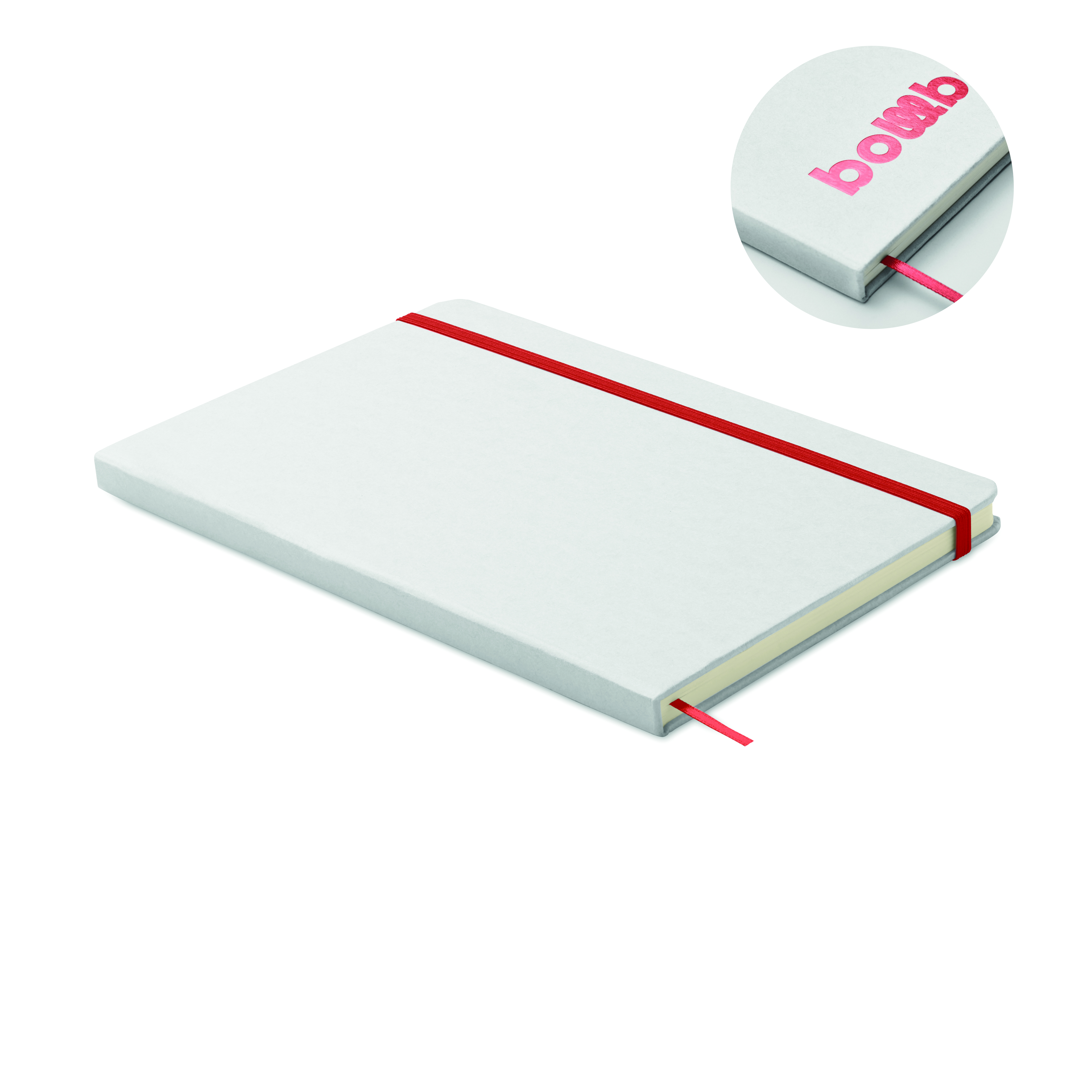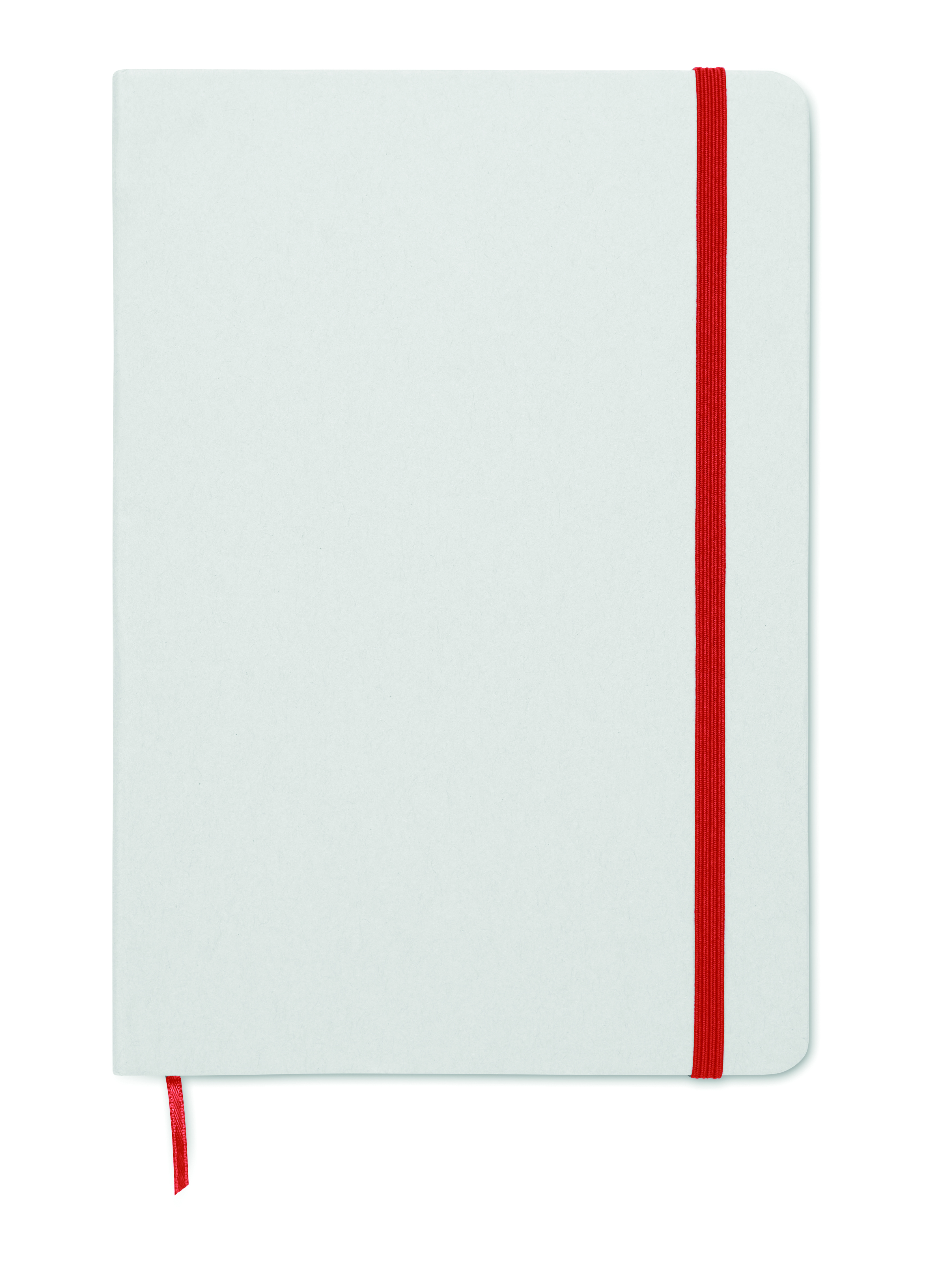 Notatnik A5 z twardą okładką wykonany w 70% z kartonu po mleku i w 30% z papieru z recyklingu. Białą okładka w kartonowej oprawie . 160 stron w linie (80 kartek). Gumka zamykająca, wstążkowa zakładka dopasowana do uwidocznionego koloru. Po grawerowaniu laserowym kolor jest widoczny.