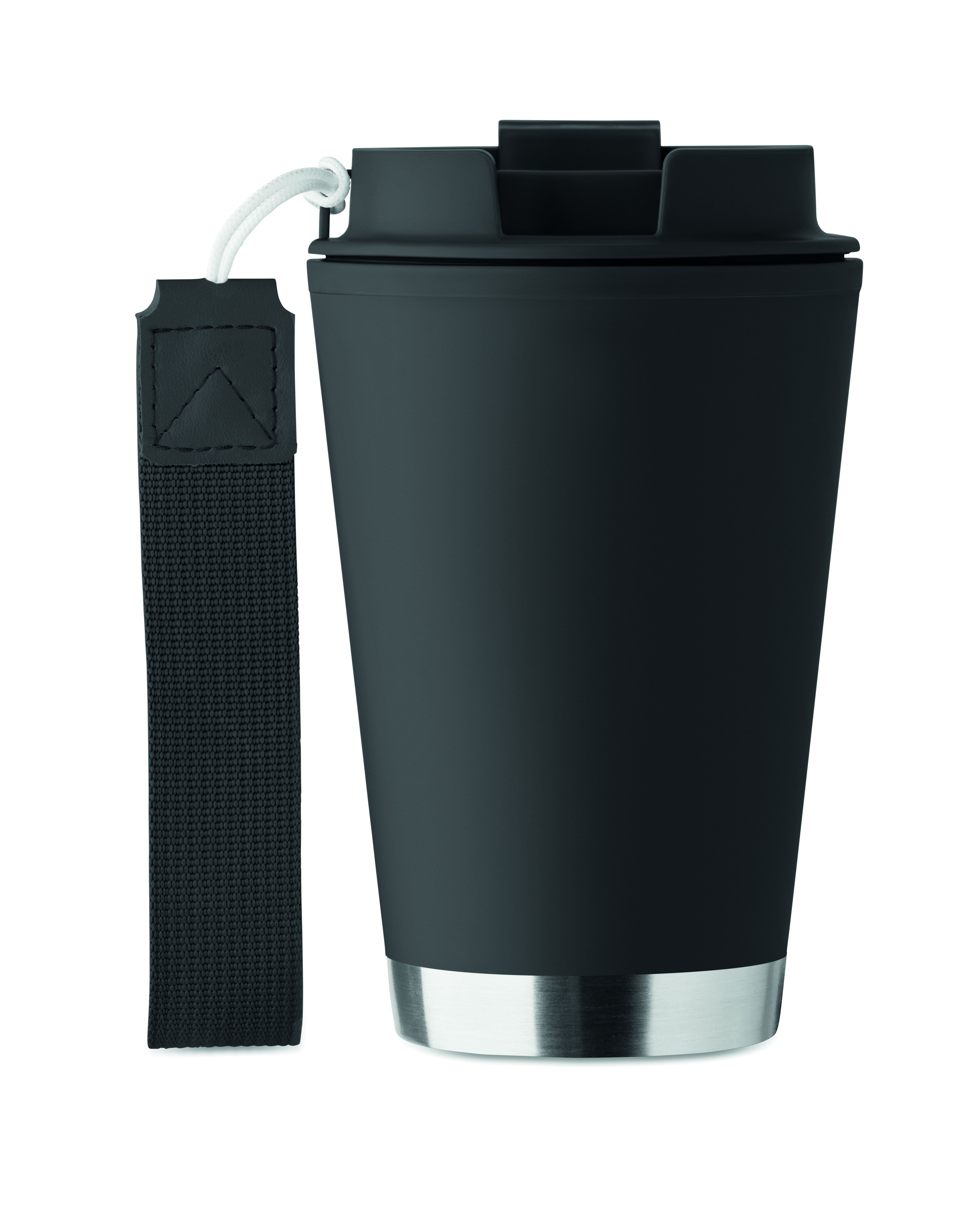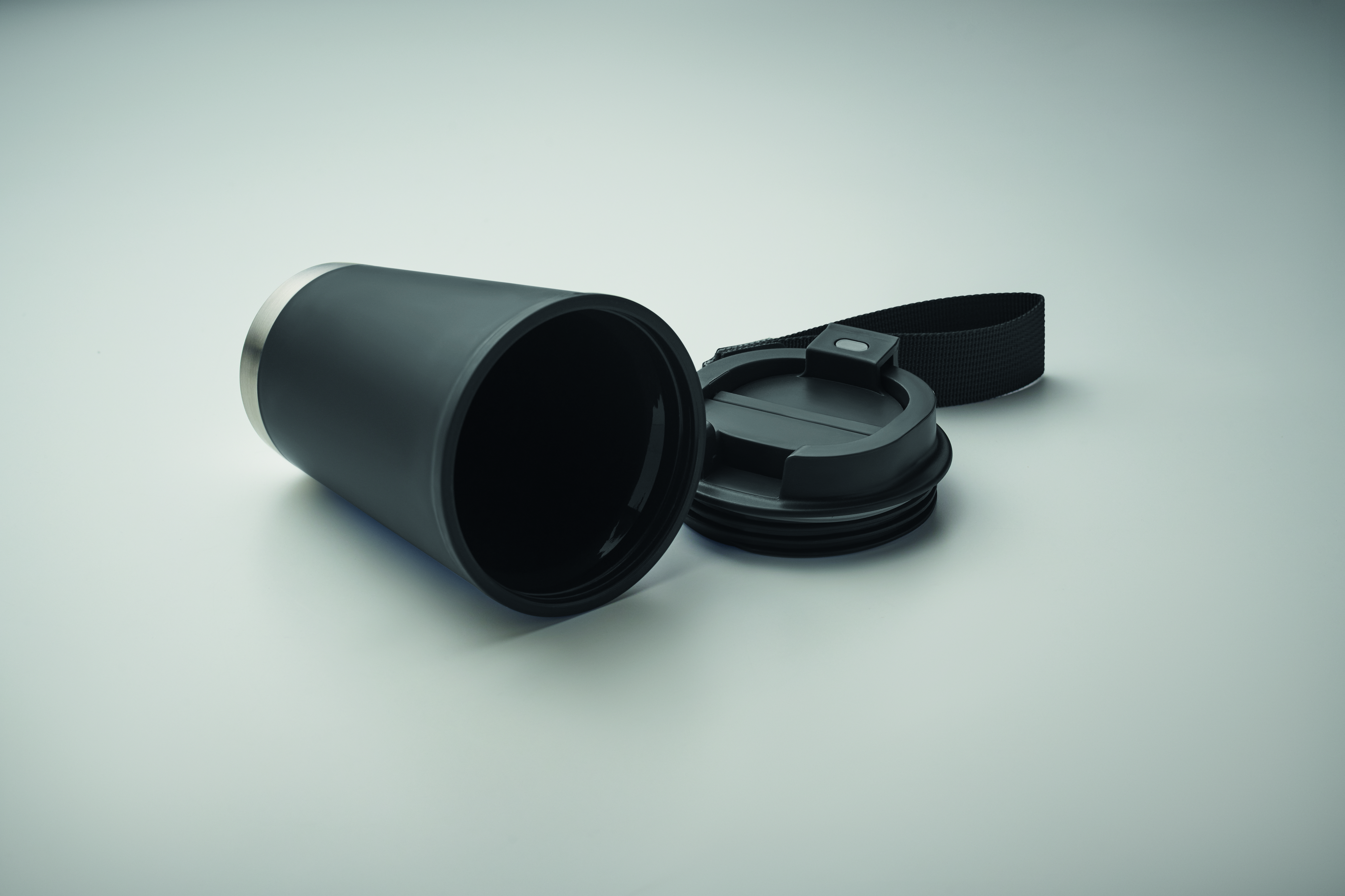 Dwuścienny kubek z wewnętrzną ścianką z PP, zewnętrzną ścianką z PP pochodzącego z recyklingu, detalami ze stali nierdzewnej pochodzącej z recyklingu i paskiem na nadgarstek z RPET. Pojemność: 300 ml.