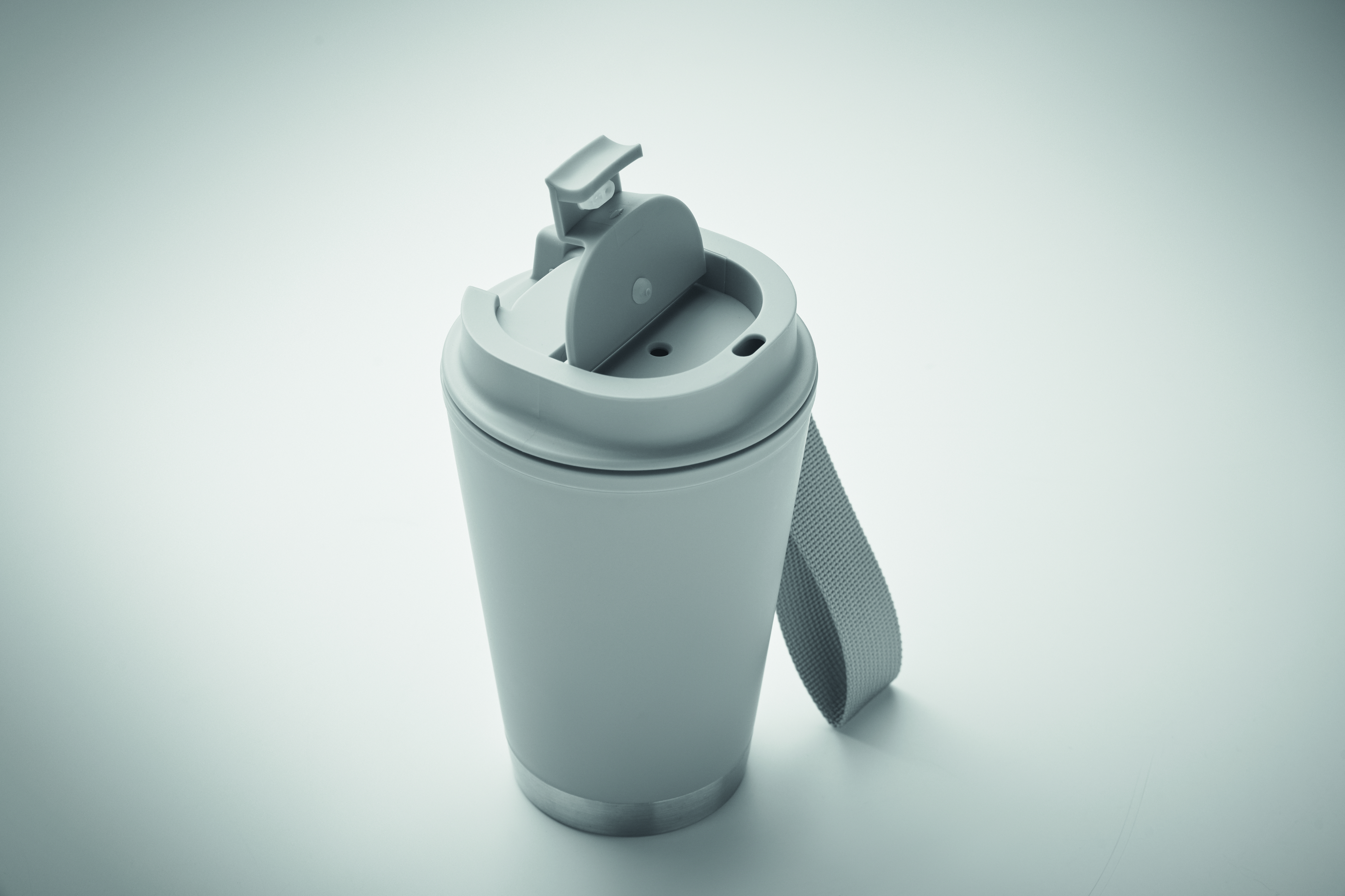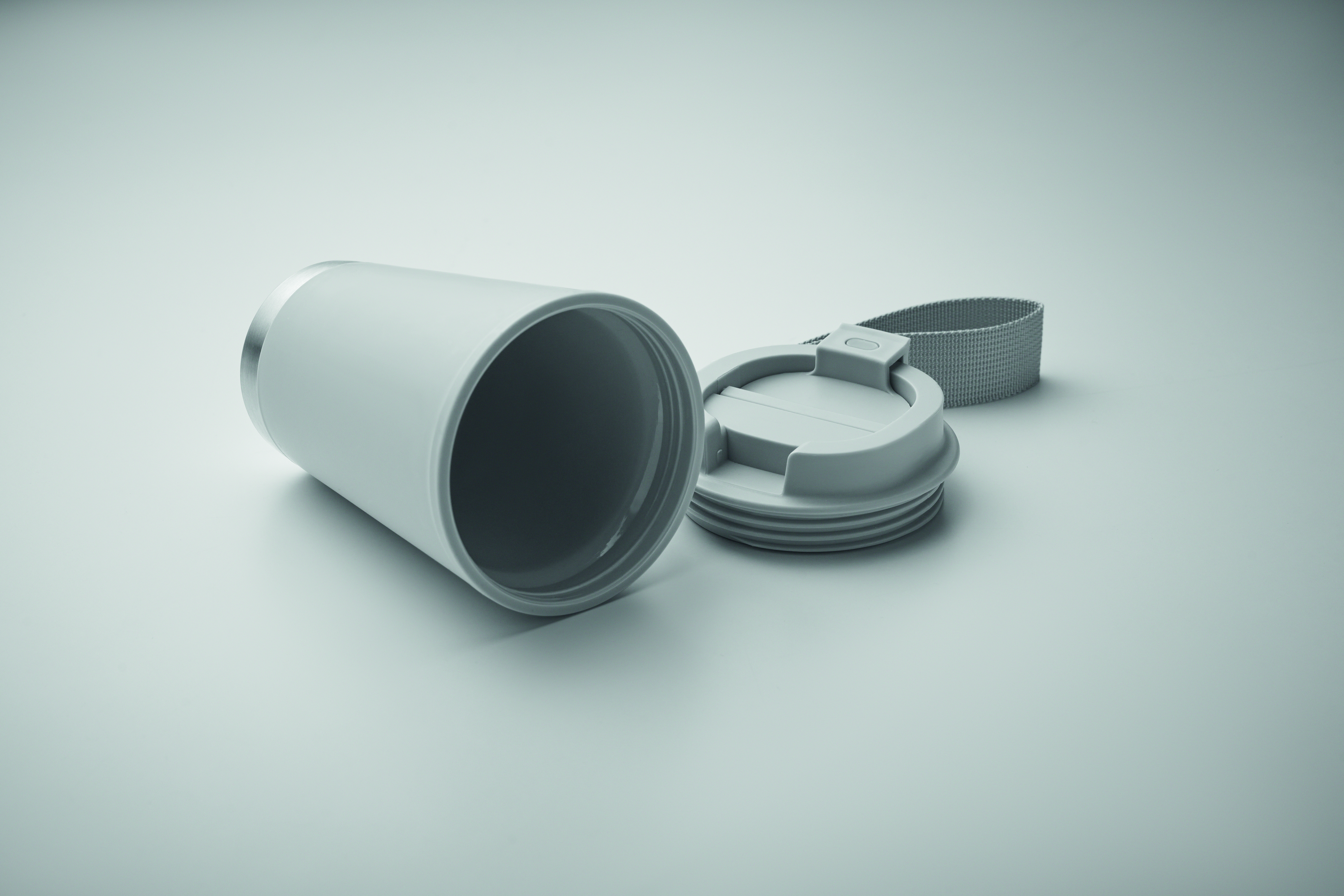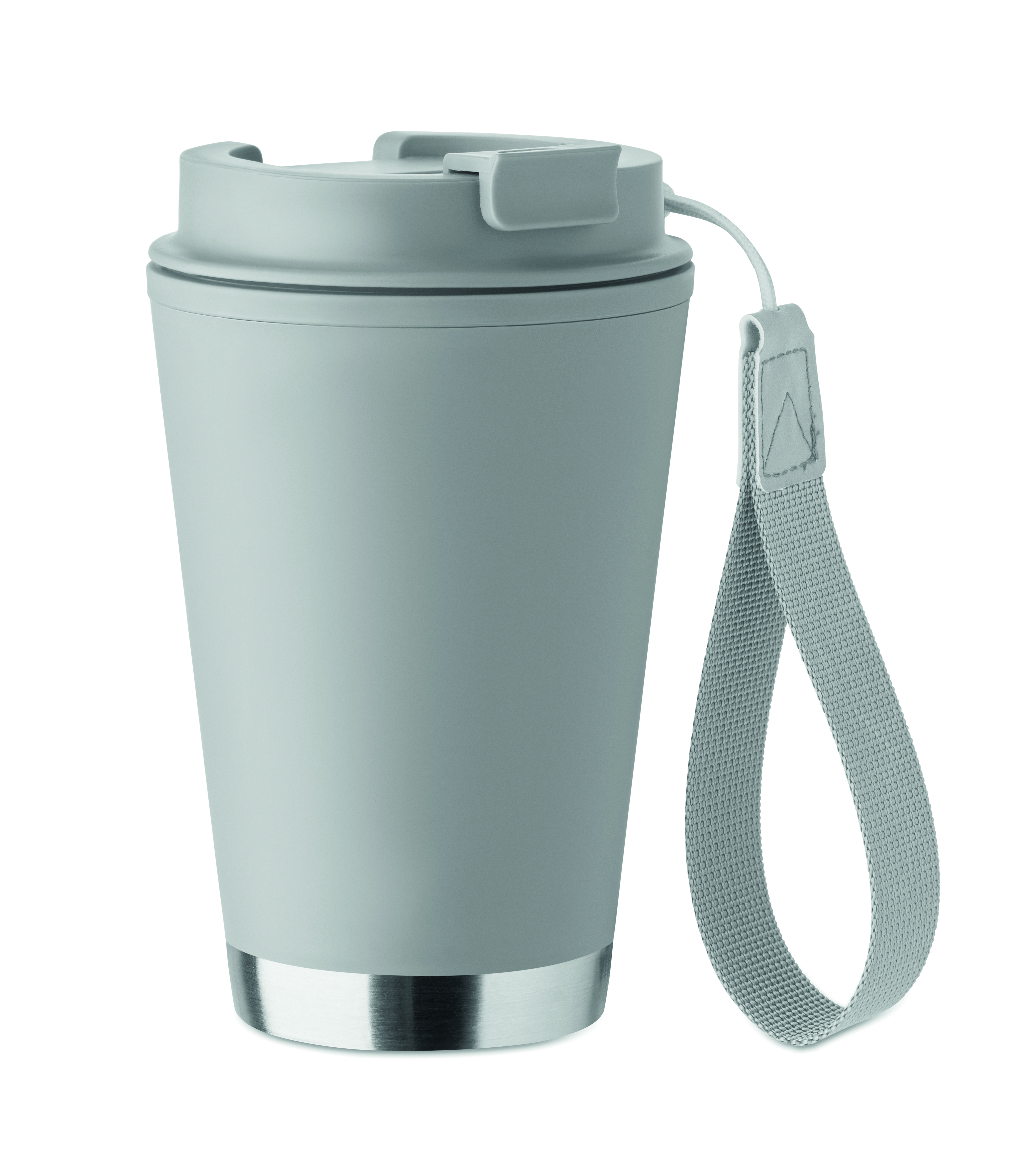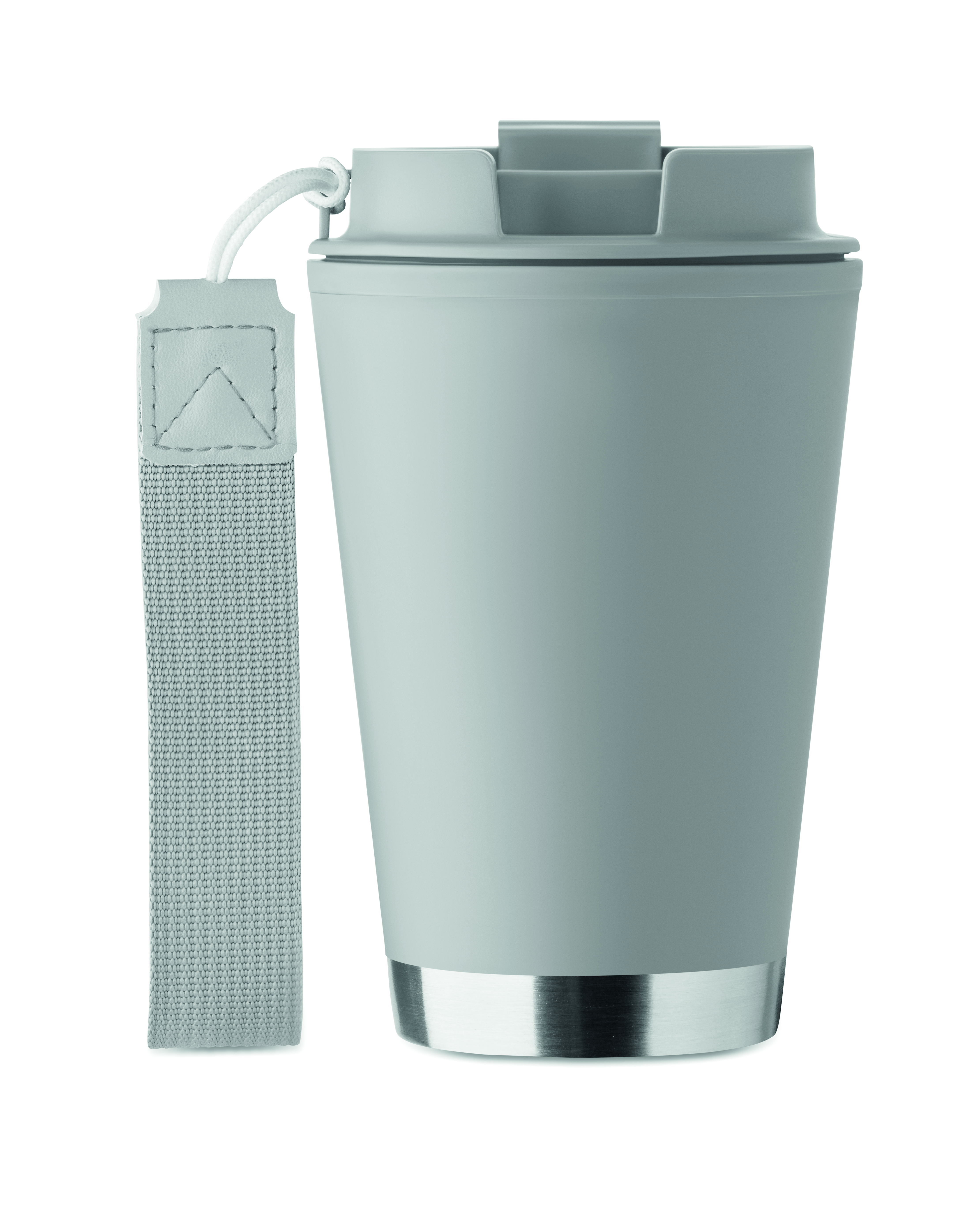 Dwuścienny kubek z wewnętrzną ścianką z PP, zewnętrzną ścianką z PP pochodzącego z recyklingu, detalami ze stali nierdzewnej pochodzącej z recyklingu i paskiem na nadgarstek z RPET. Pojemność: 300 ml.