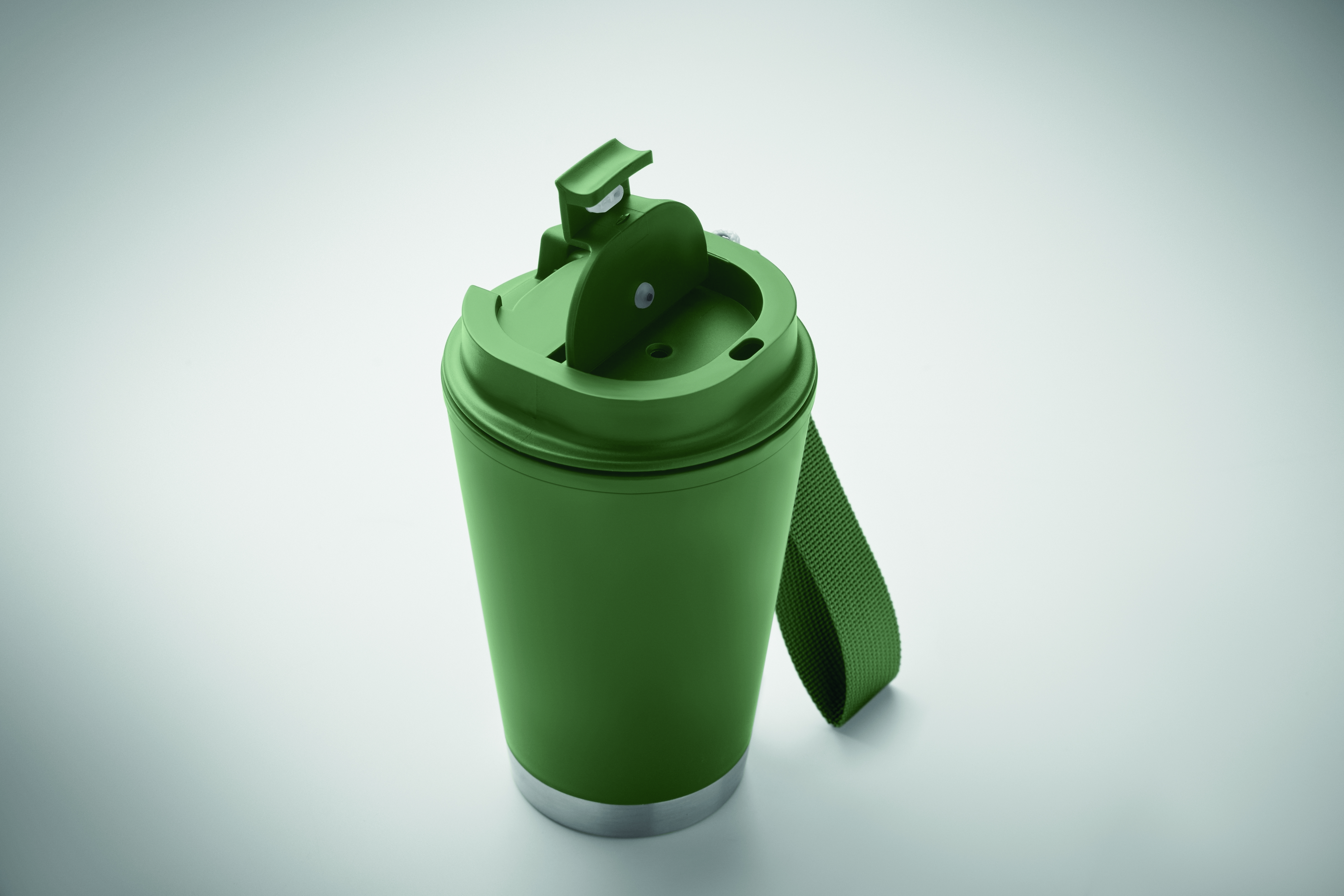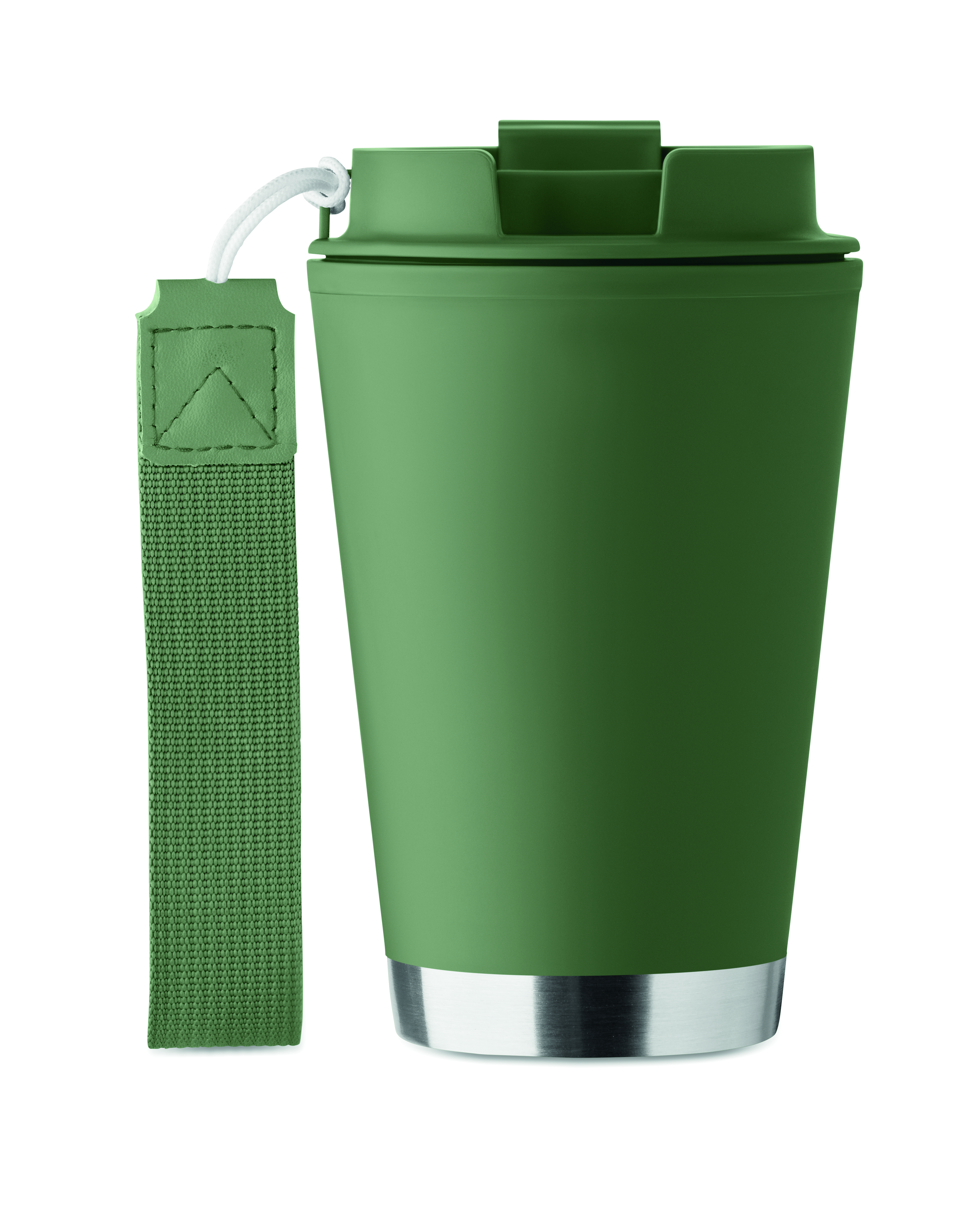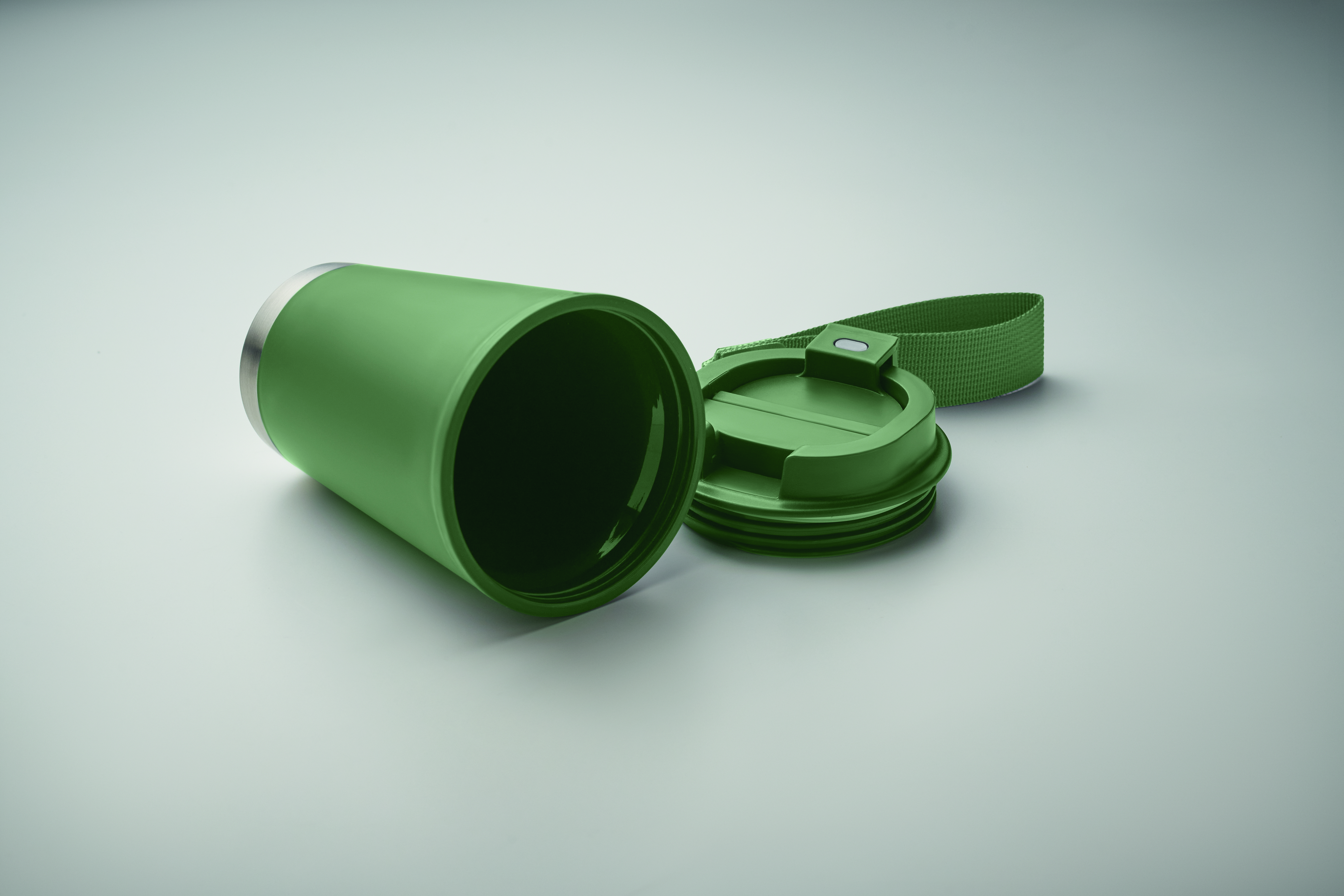 Dwuścienny kubek z wewnętrzną ścianką z PP, zewnętrzną ścianką z PP pochodzącego z recyklingu, detalami ze stali nierdzewnej pochodzącej z recyklingu i paskiem na nadgarstek z RPET. Pojemność: 300 ml.