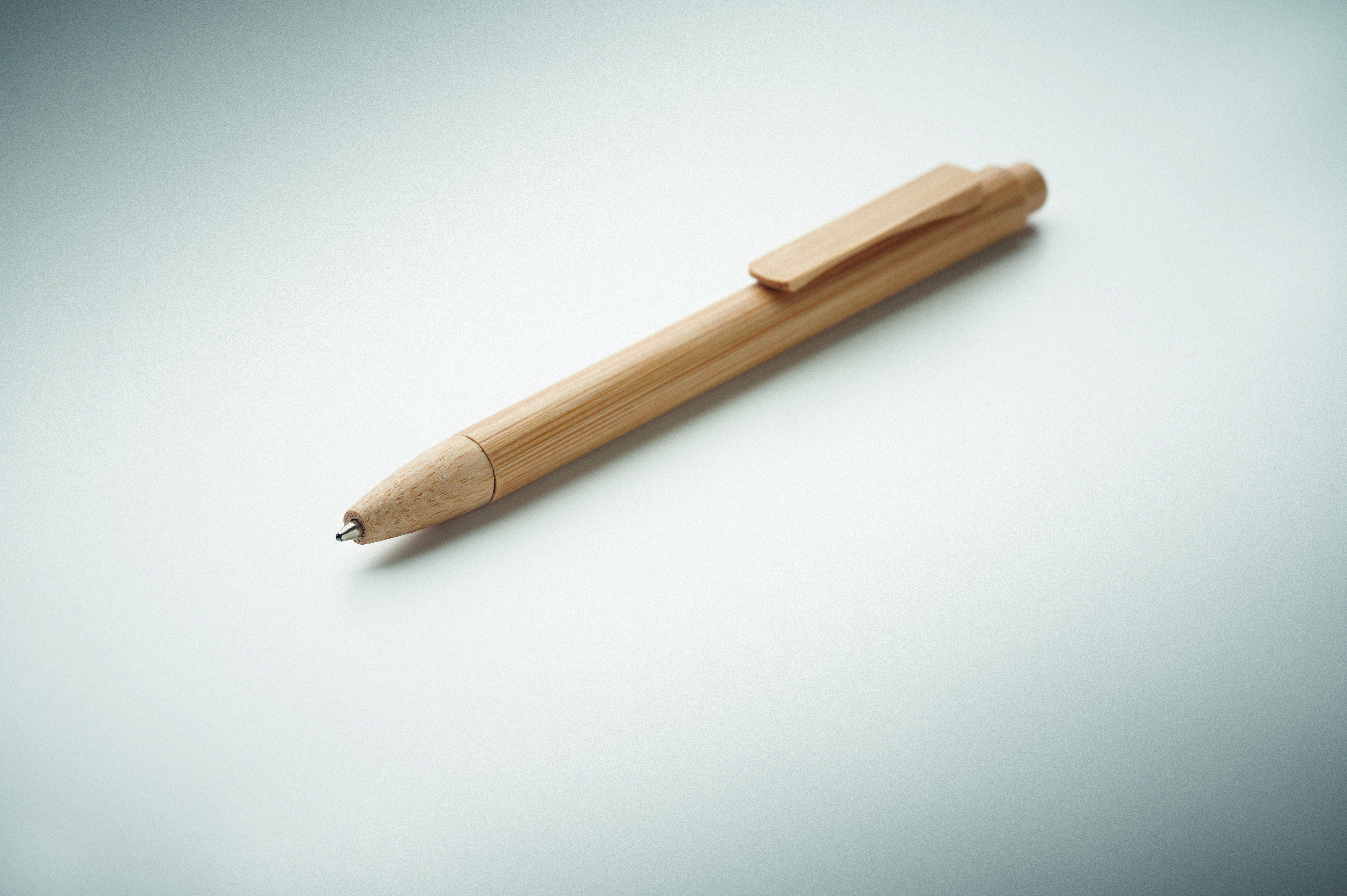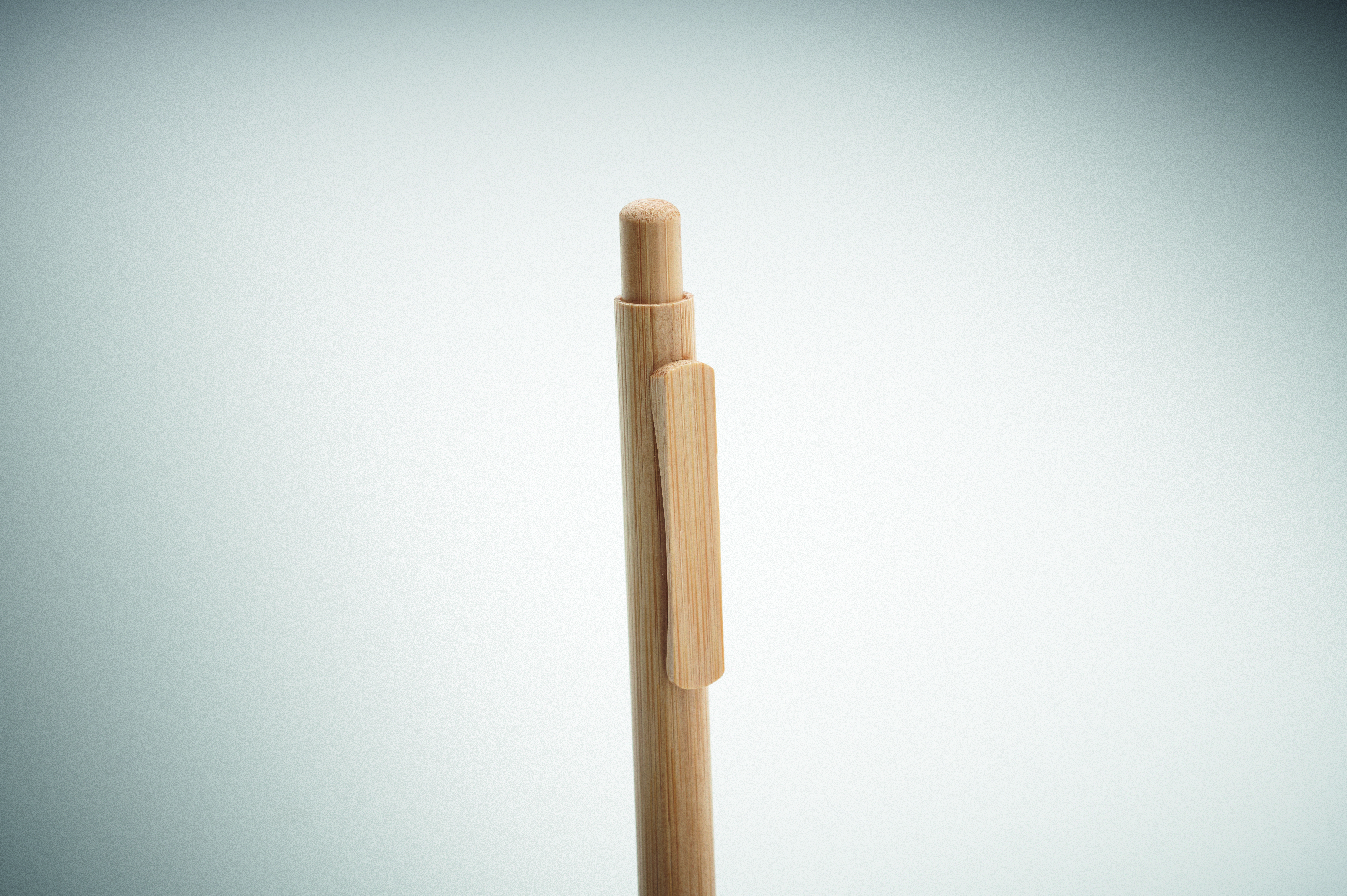 Przyciskany długopis z bambusowym korpusem, końcówką, klipsem i obudową. Niebieski tusz.