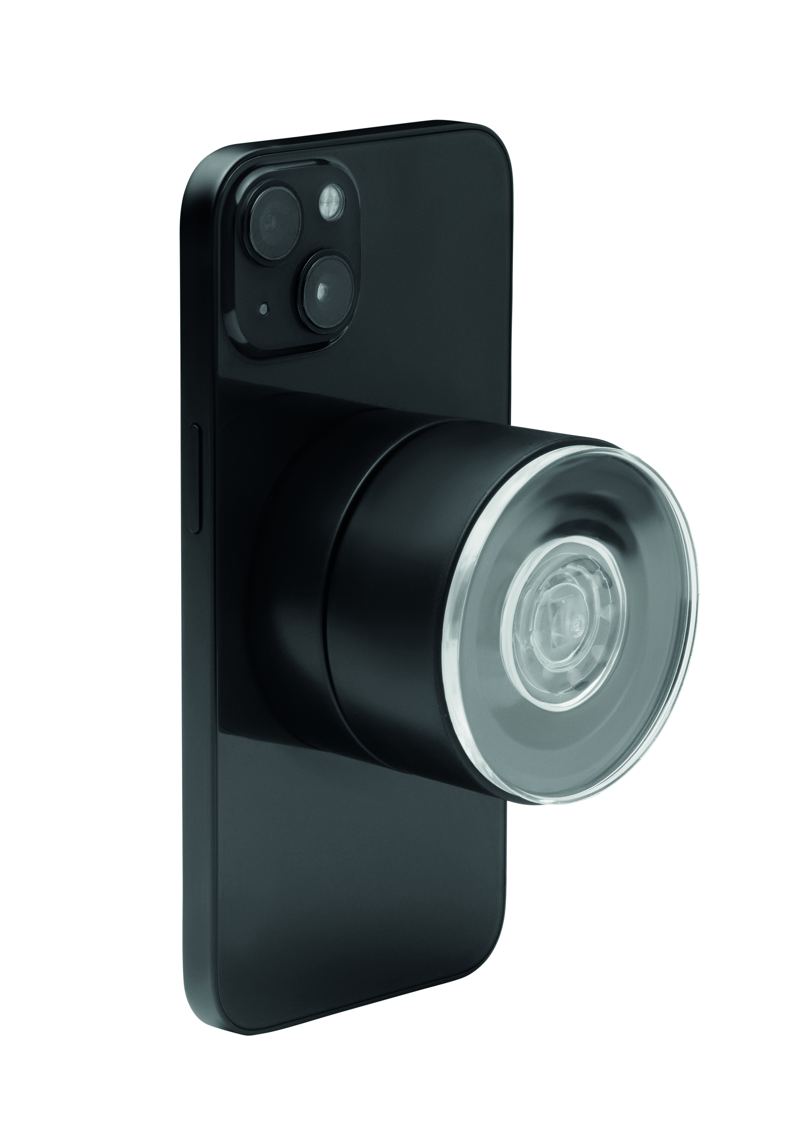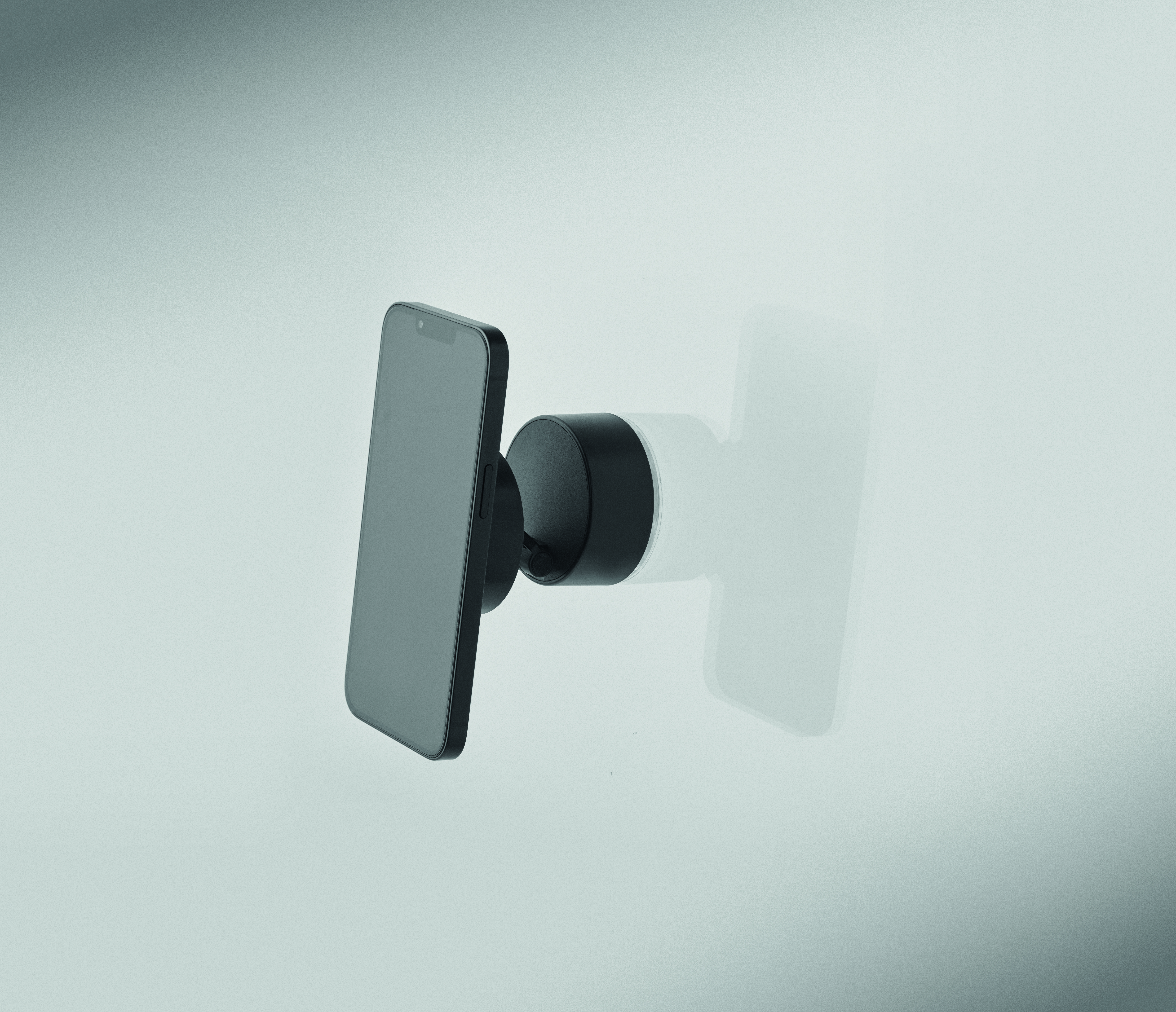 Magnetyczny uchwyt na telefon z ABS. Mocowanie przyssawkowe. Kompatybilny z iPhone® 12 i nowszymi. Zawiera dodatkowy magnetyczny metalowy pierścień do obsługi ładowania innych niemagnetycznych telefonów z możliwością ładowania bezprzewodowego.