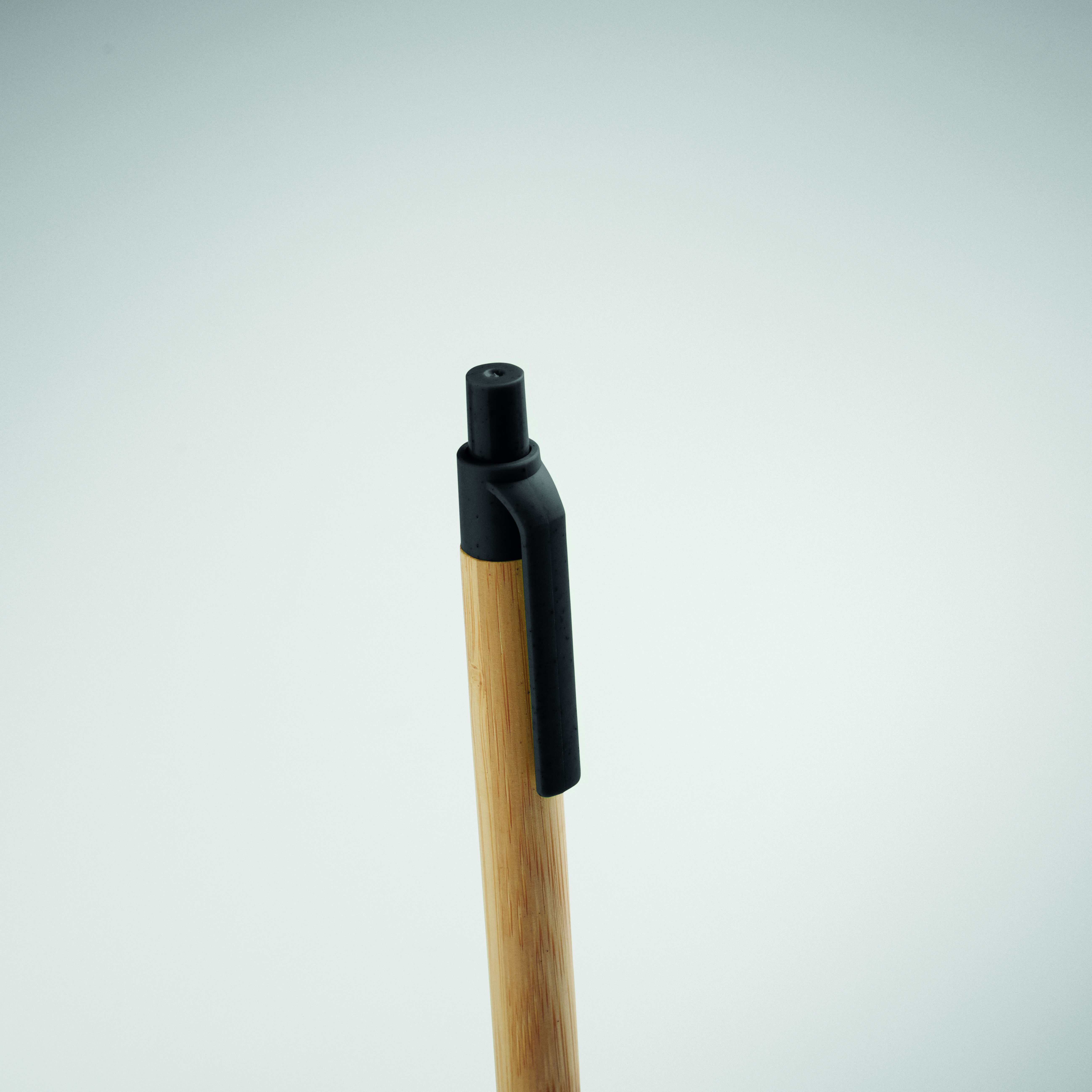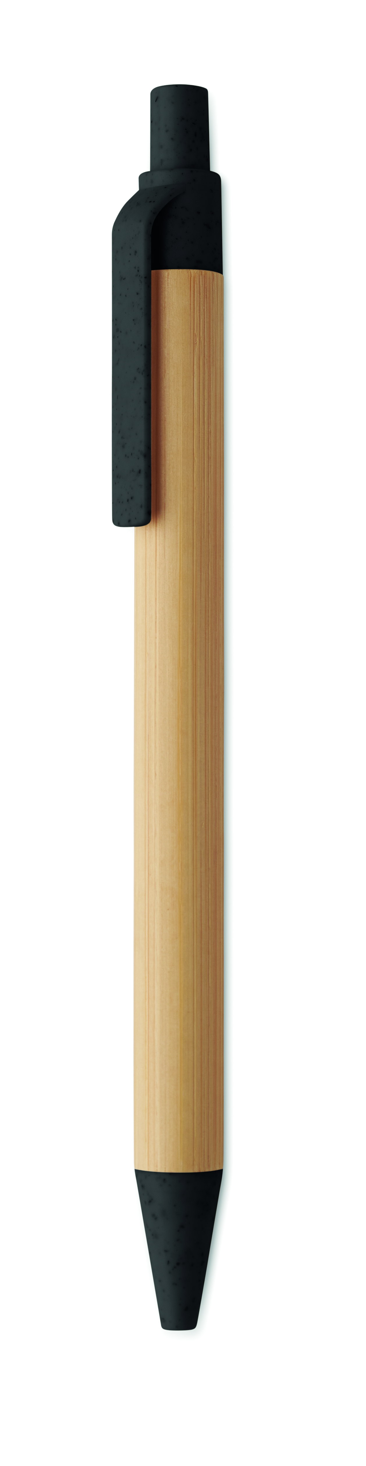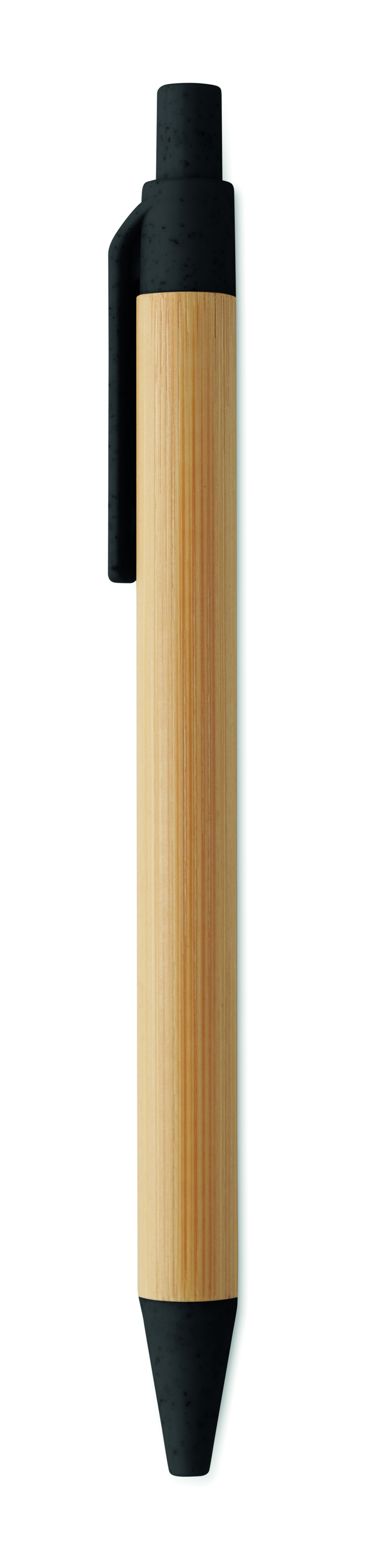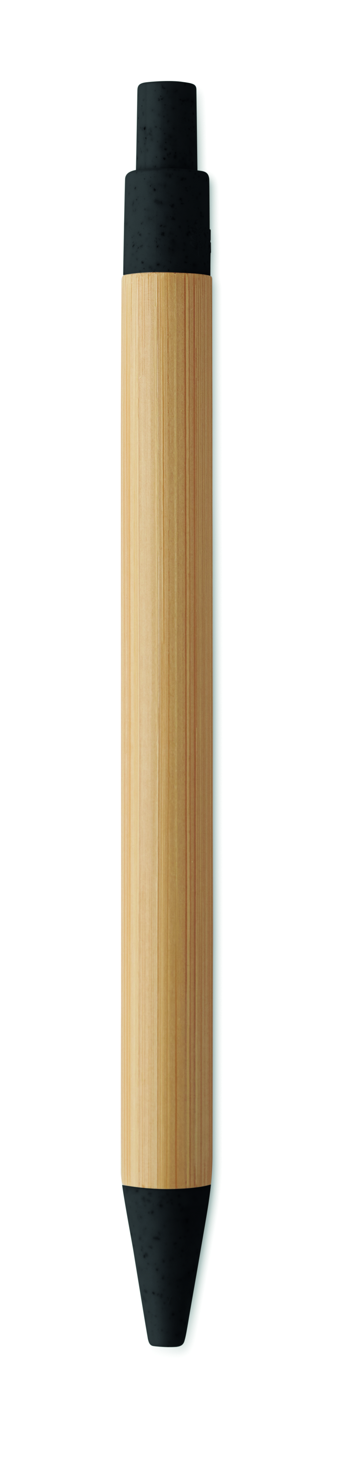 Przyciskany długopis z bambusowym korpusem i końcówkami ze słomy pszenicznej (50%) i plastiku ABS (50%). Niebieski tusz.