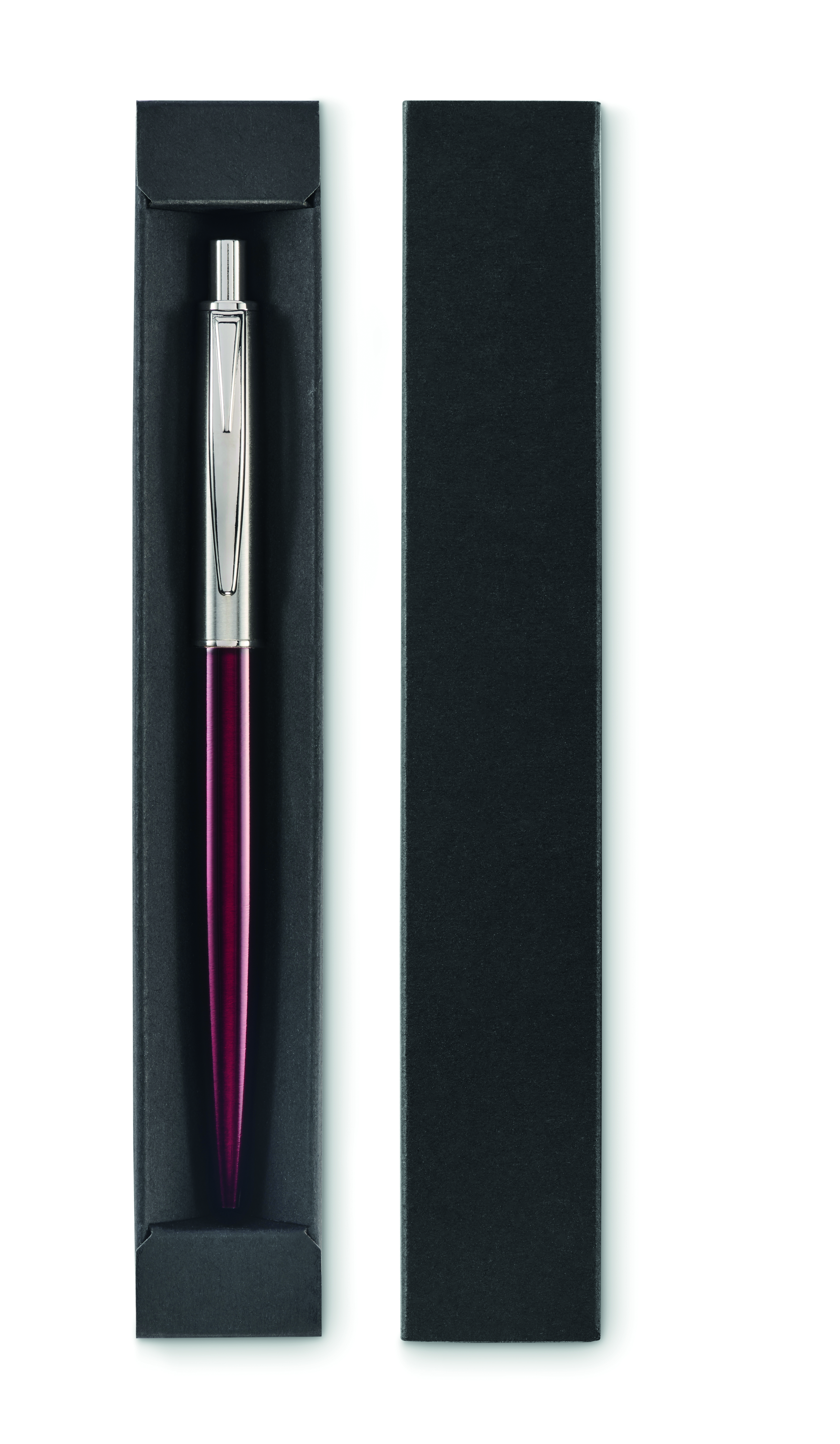 Przyciskany długopis z korpusem z recyklingowanej stali nierdzewnej. Niebieski tusz. Prezentowany w czarnym pudełku.