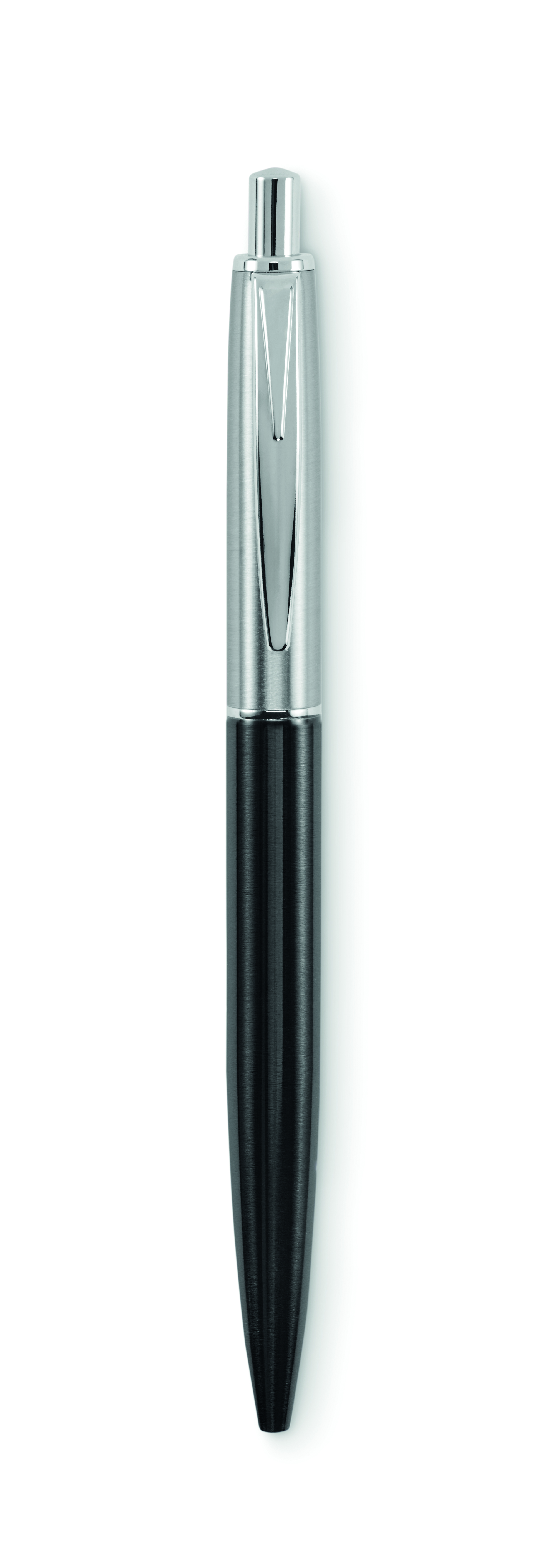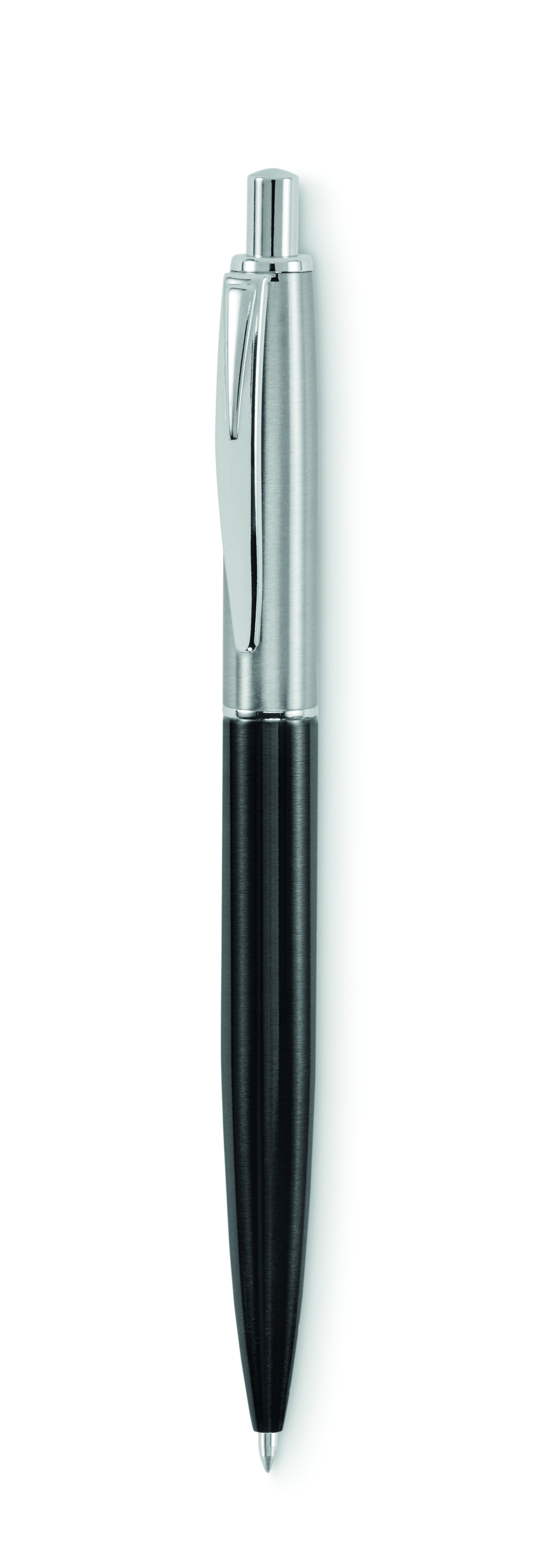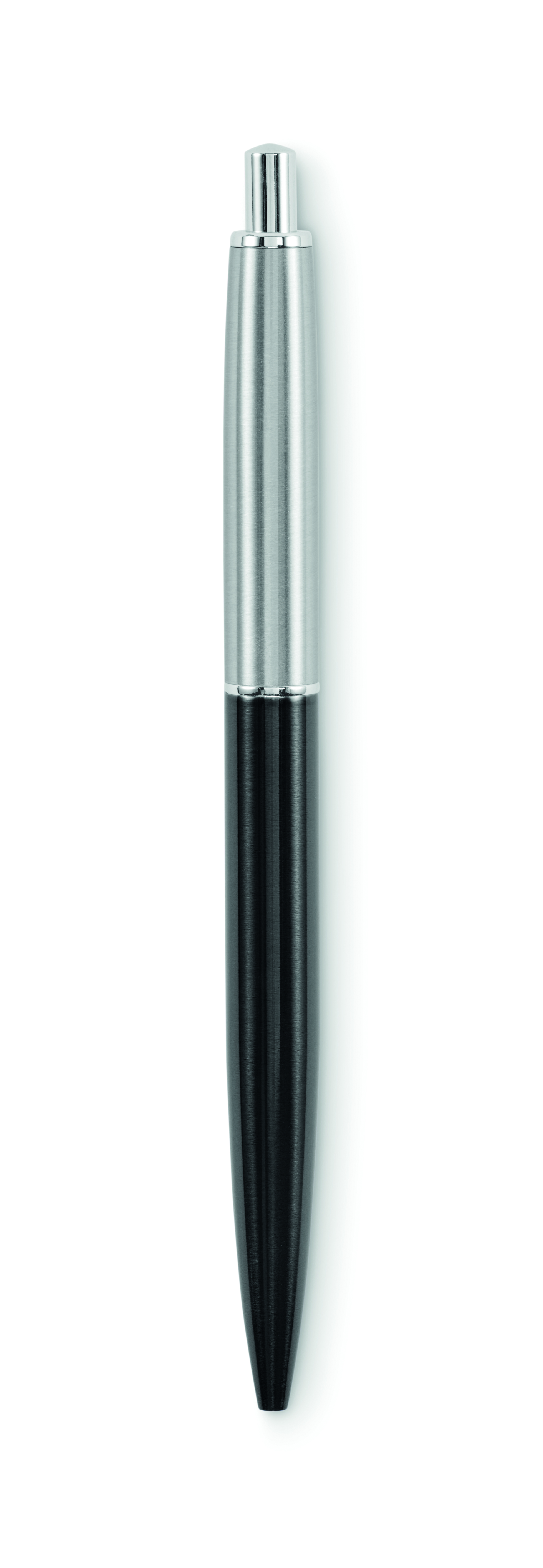 Przyciskany długopis z korpusem z recyklingowanej stali nierdzewnej. Niebieski tusz. Prezentowany w czarnym pudełku.