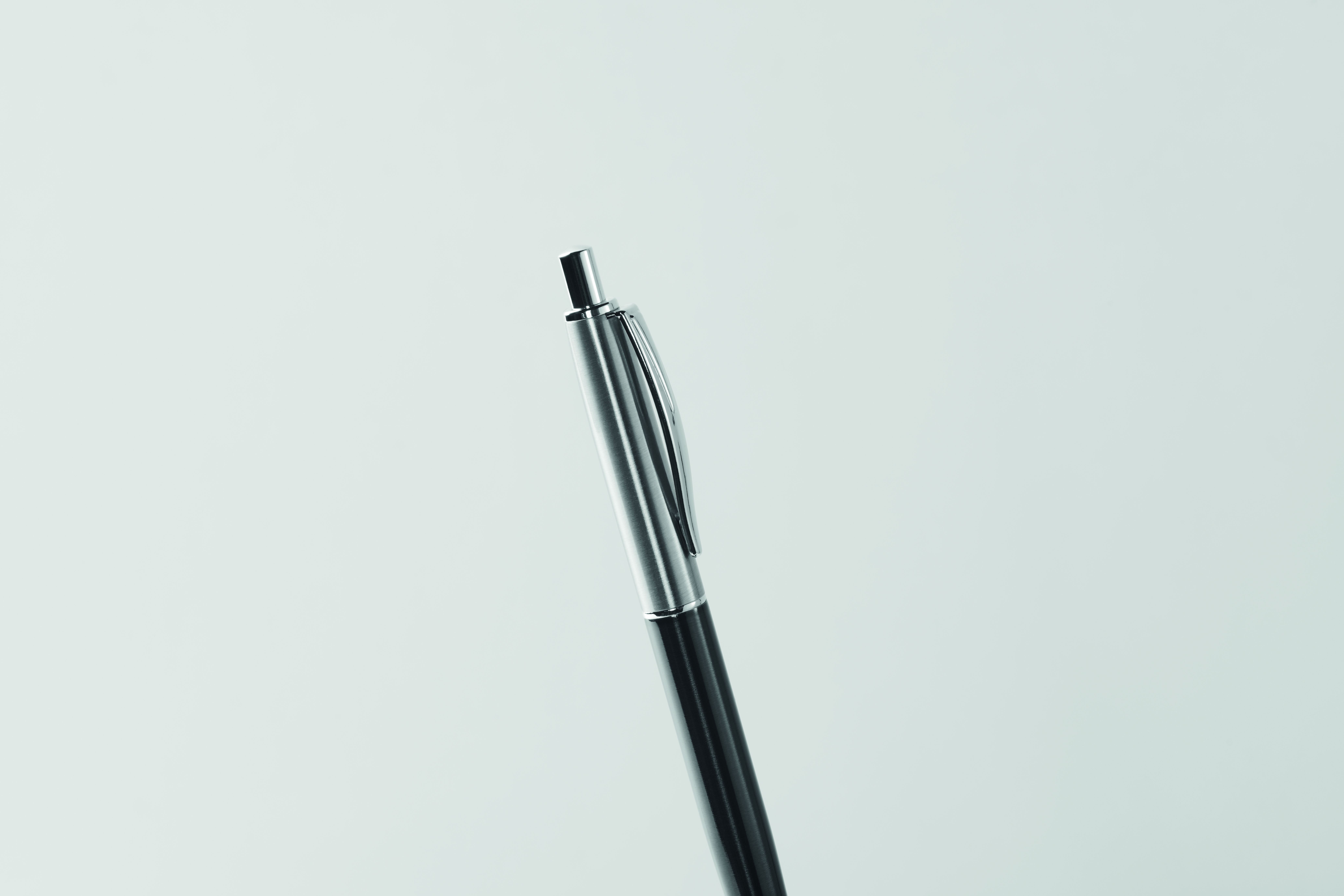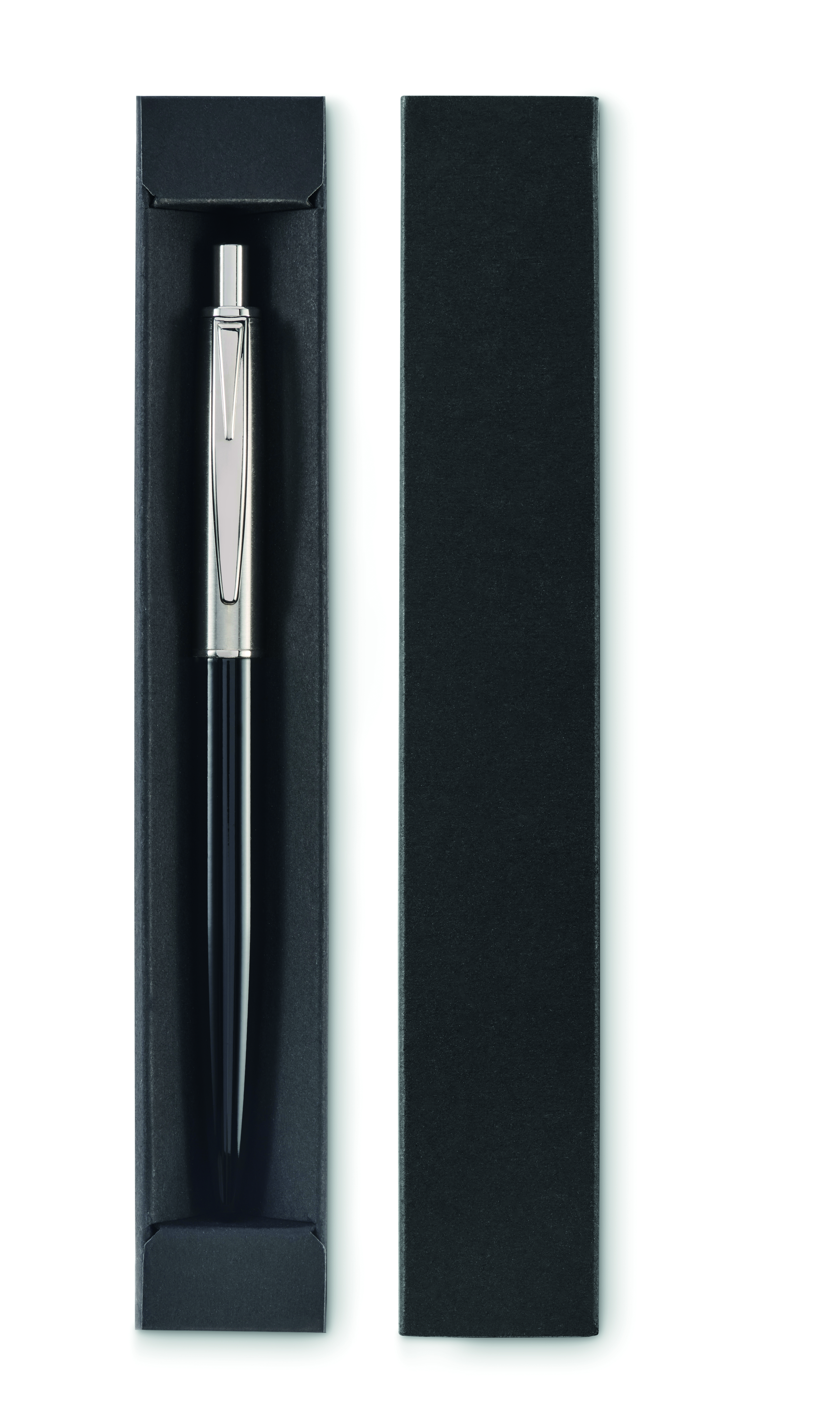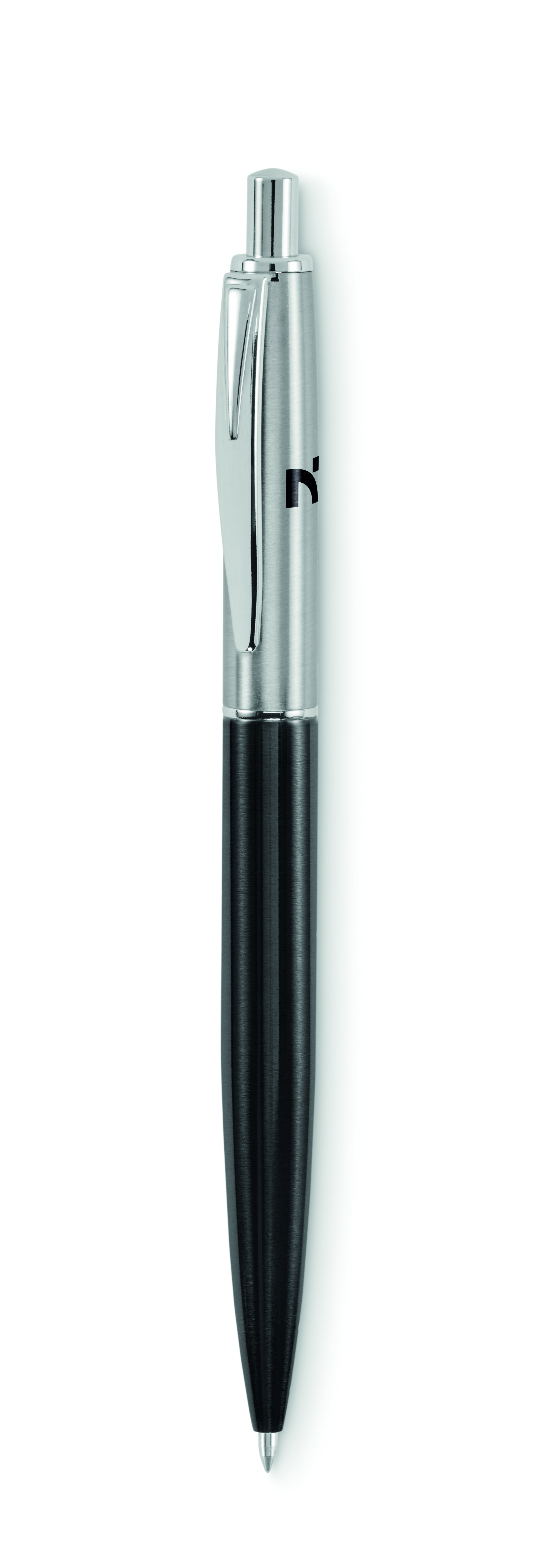 Przyciskany długopis z korpusem z recyklingowanej stali nierdzewnej. Niebieski tusz. Prezentowany w czarnym pudełku.