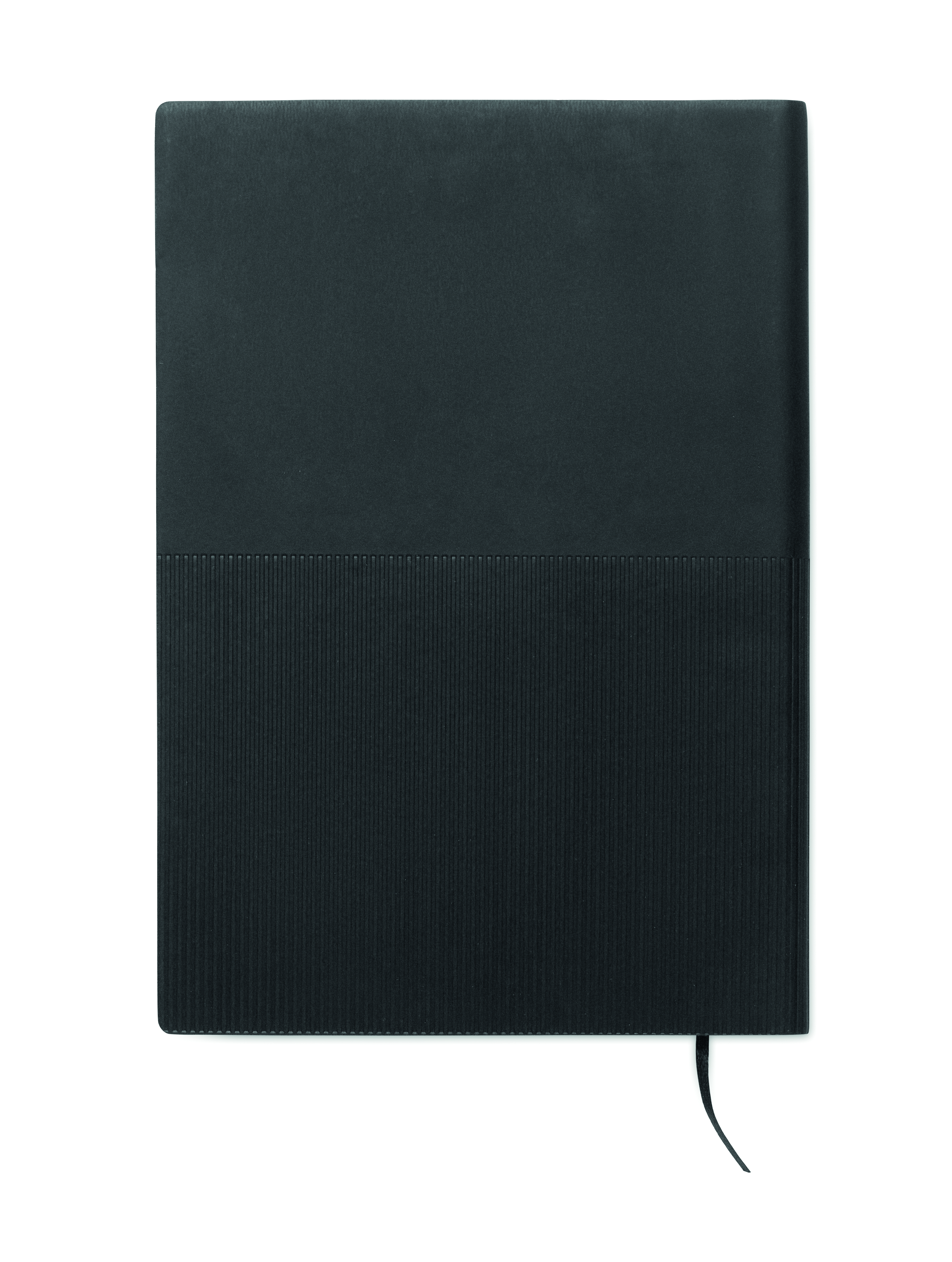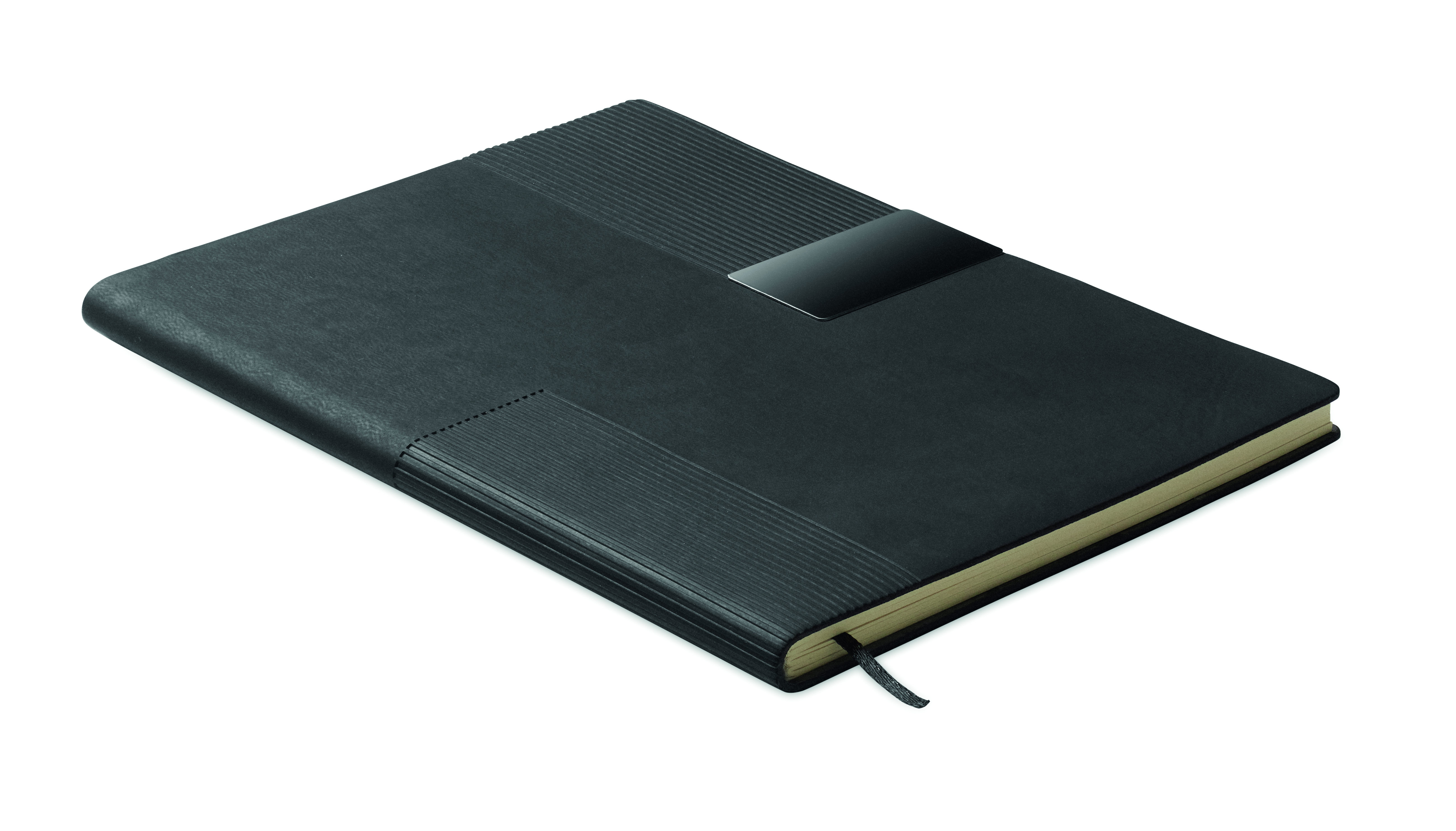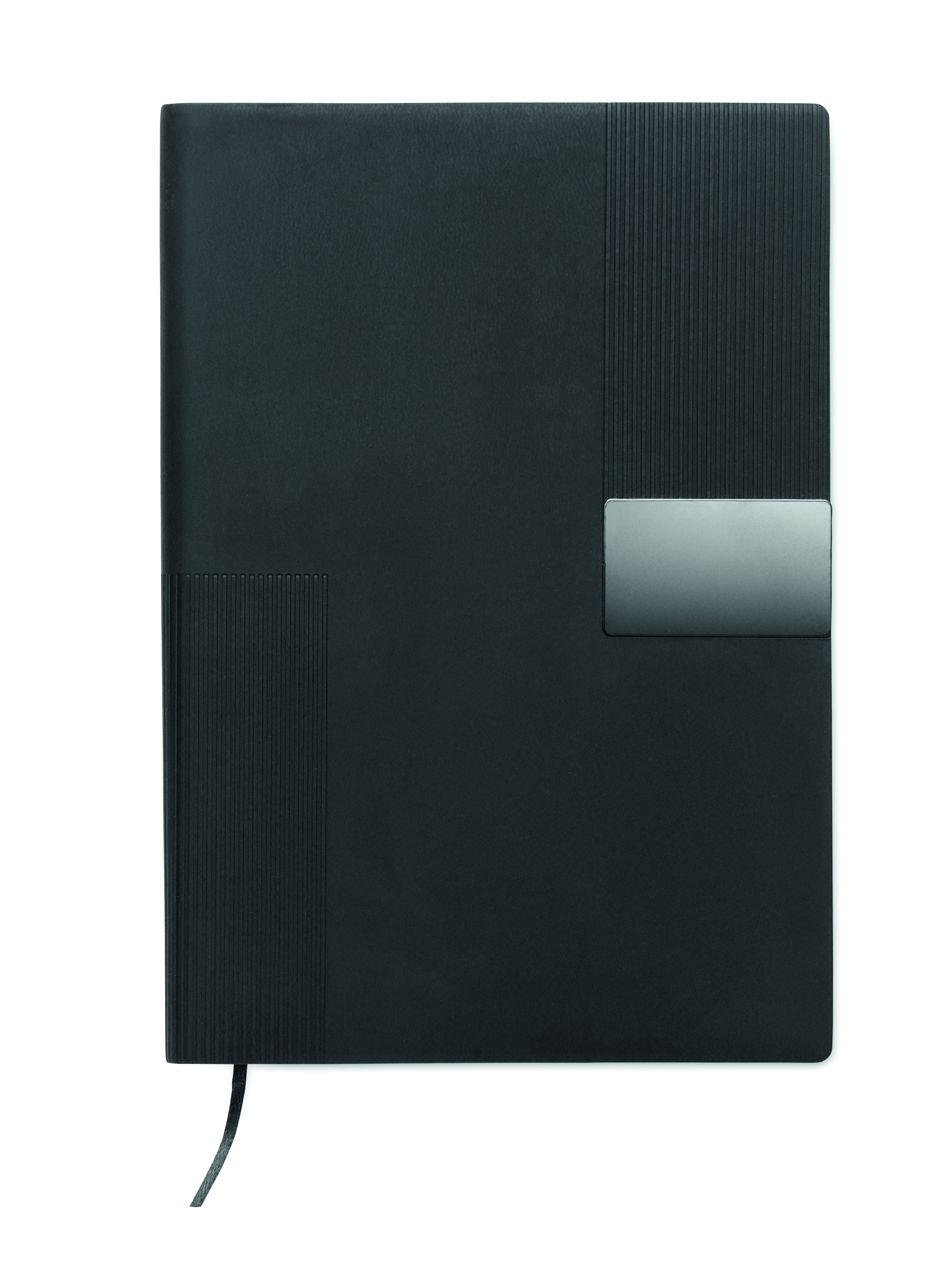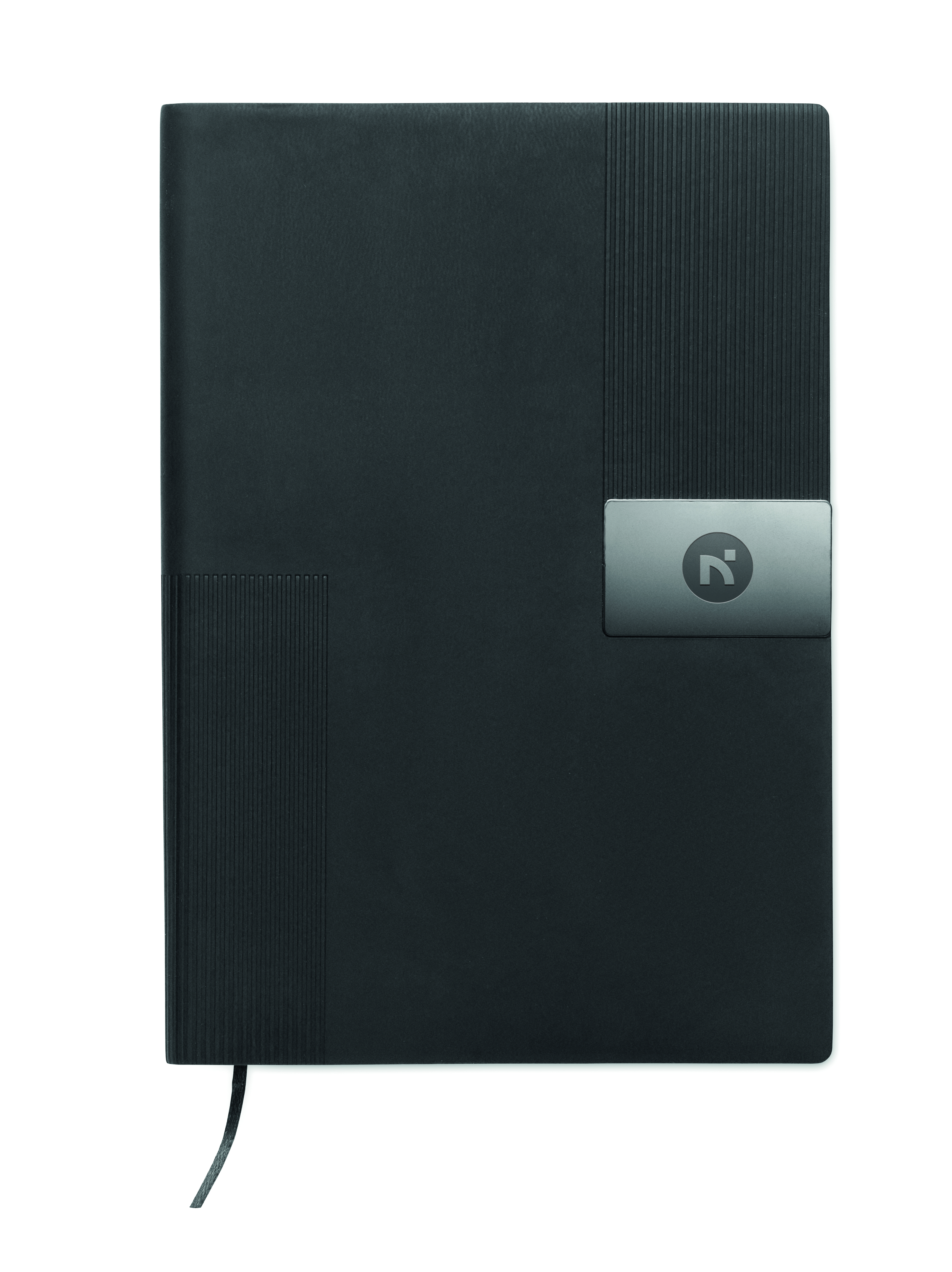 Notatnik A5 z miękką okładką z PU. 160 stron w linie z papieru z recyklingu (80 arkuszy). Dopasowana gumka i zakładka ze wstążki. Metalowy detal z przodu.
