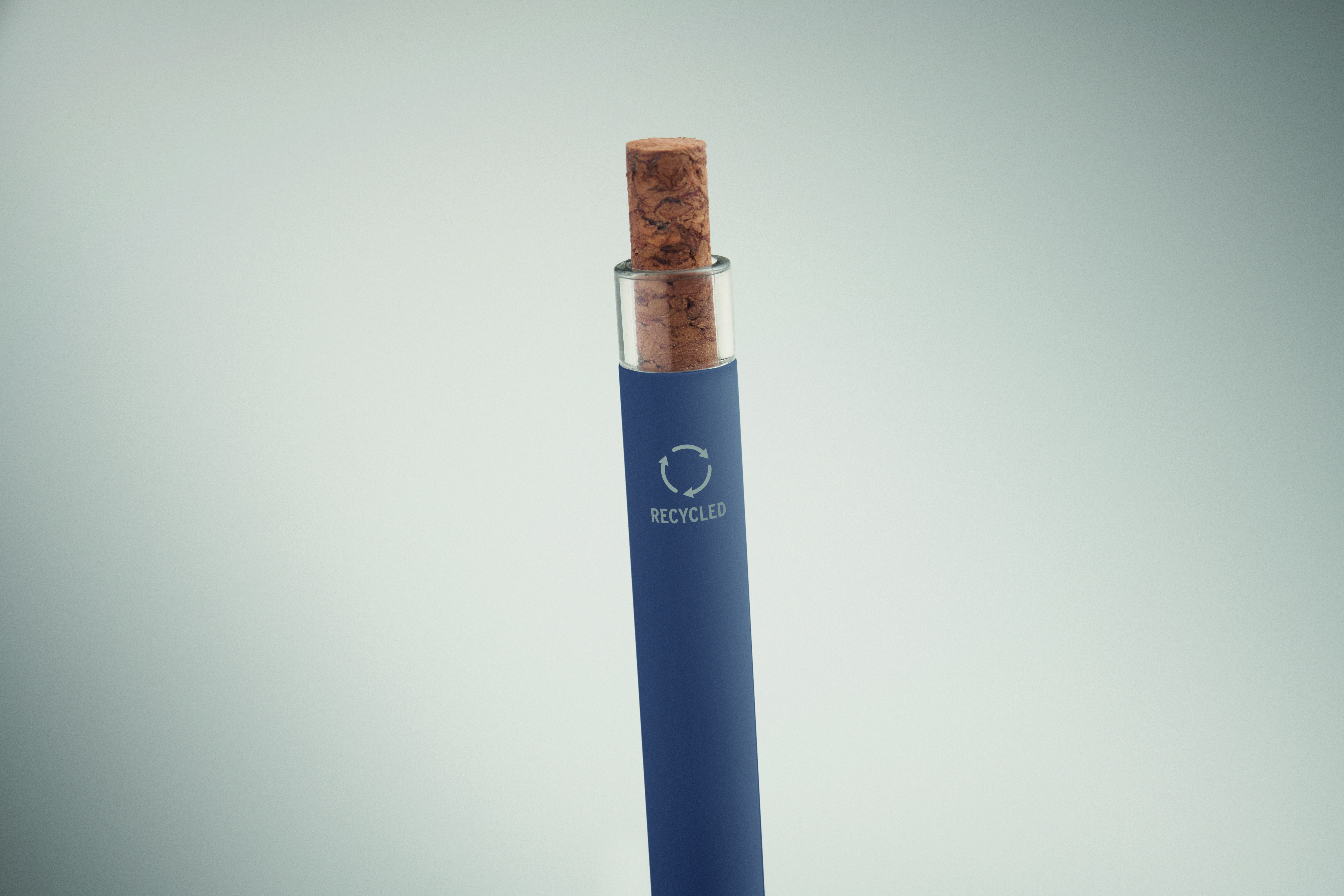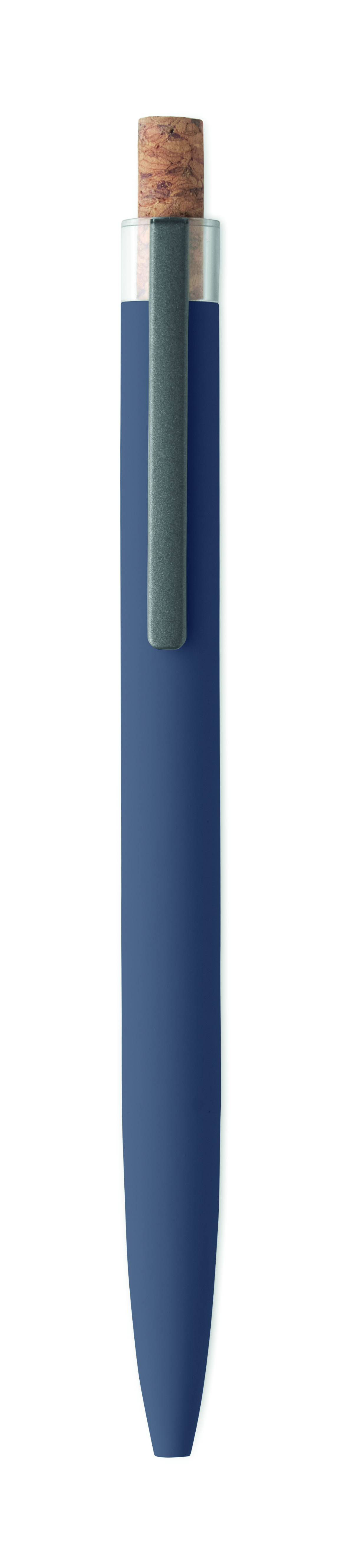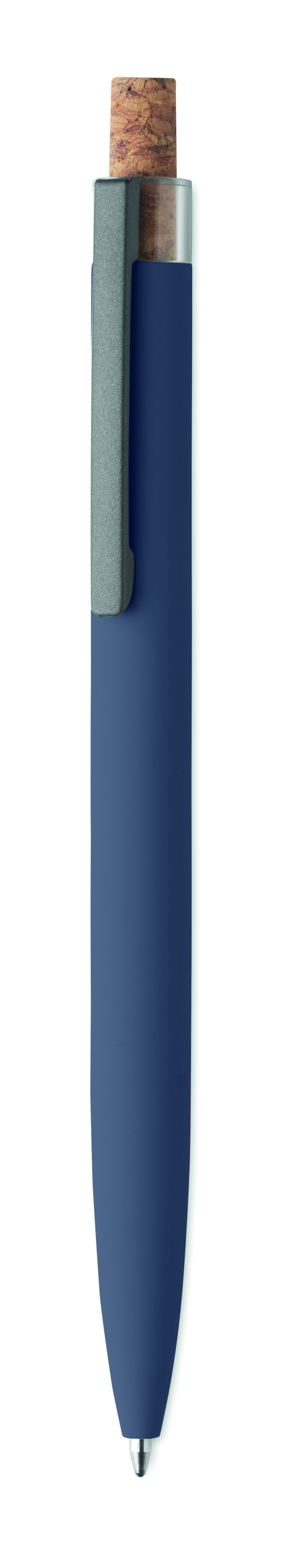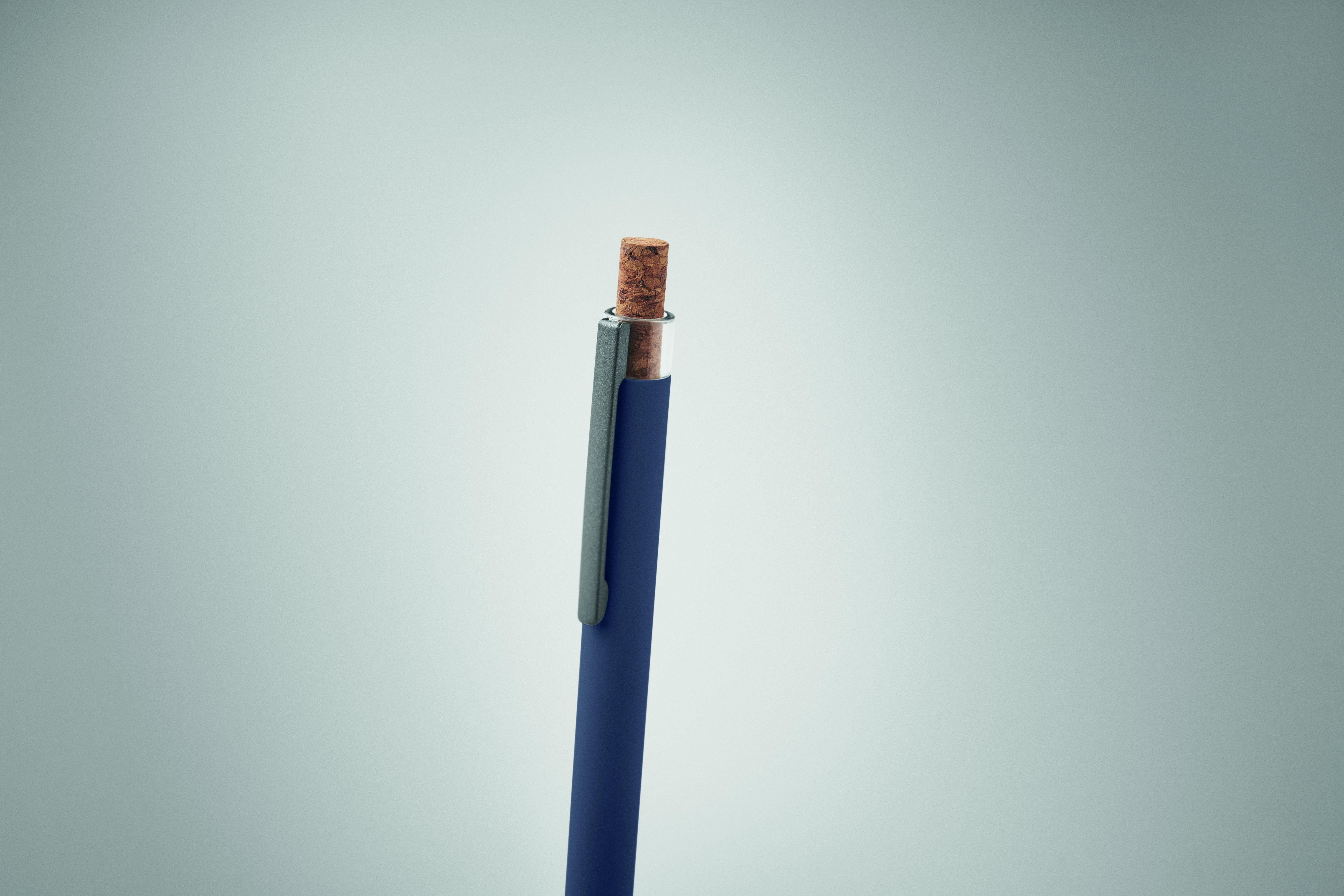 Długopis z aluminium pochodzącego z recyklingu z korkowym przyciskiem i metalowym klipem. Niebieski tusz.