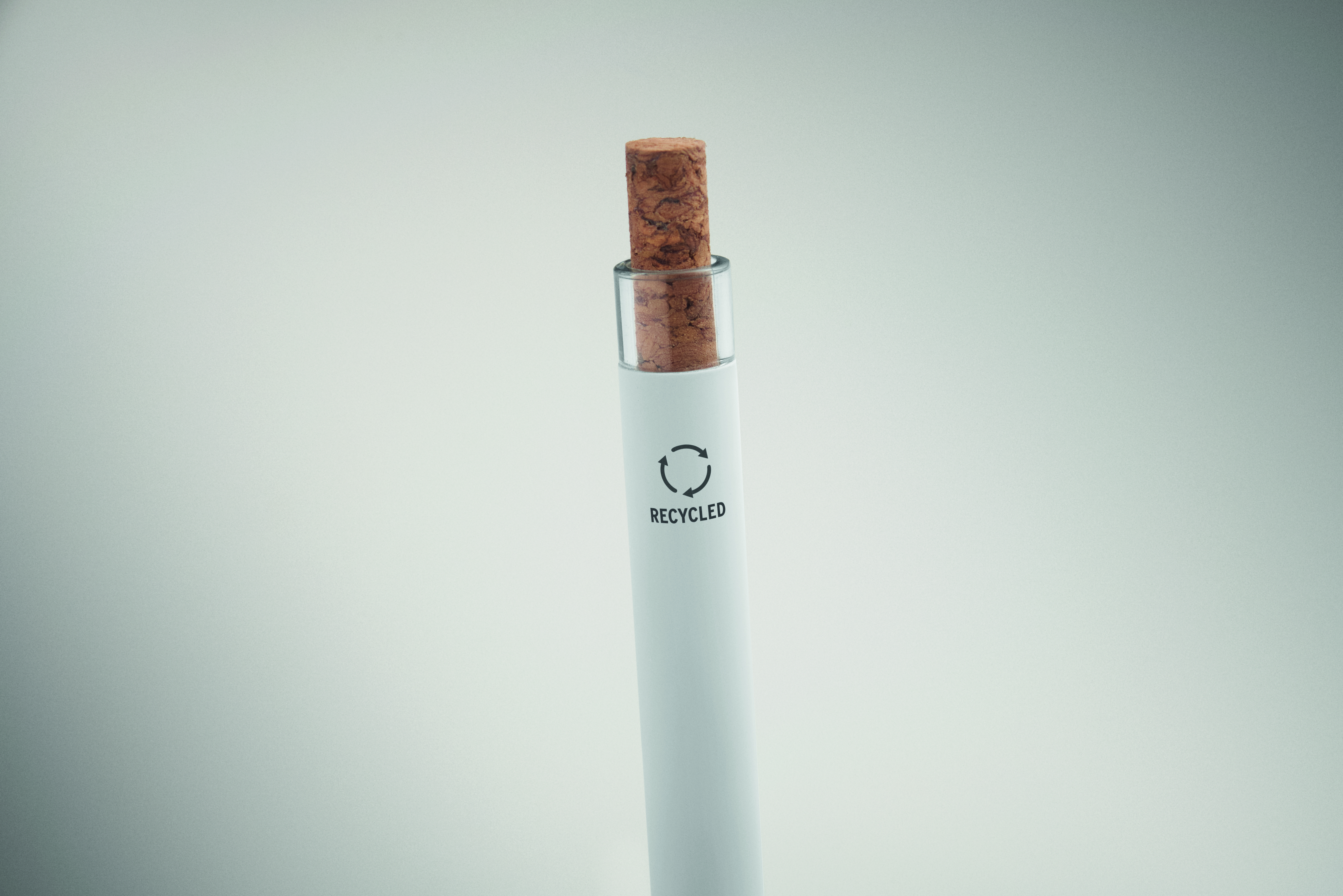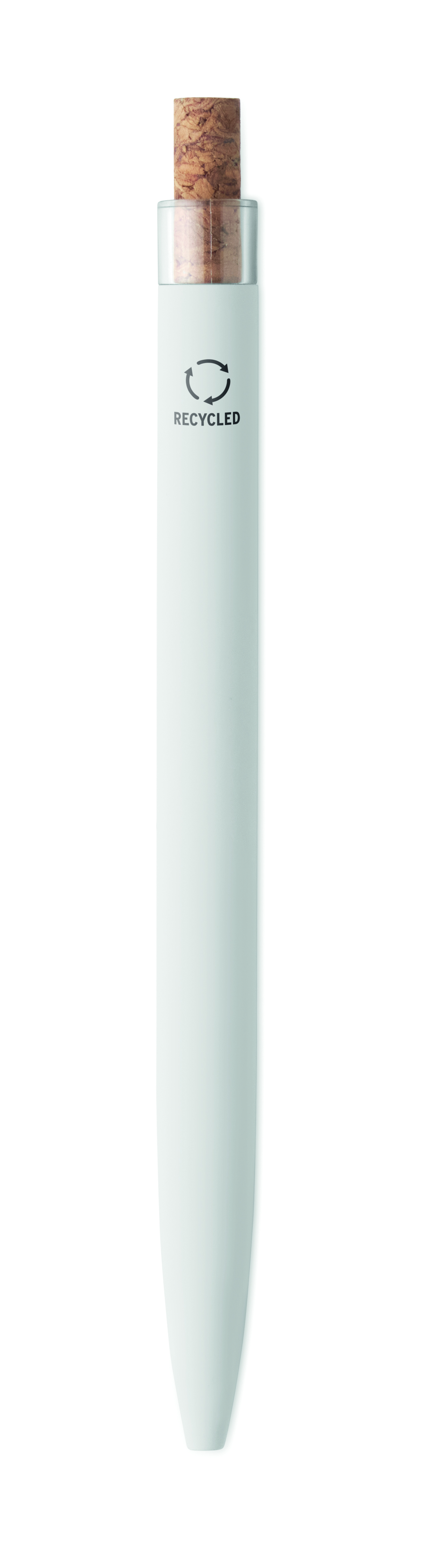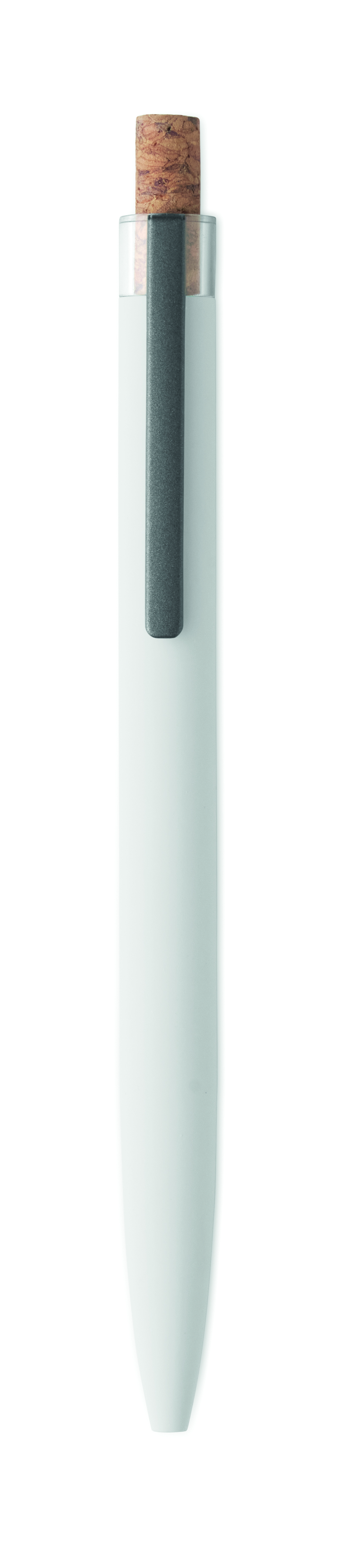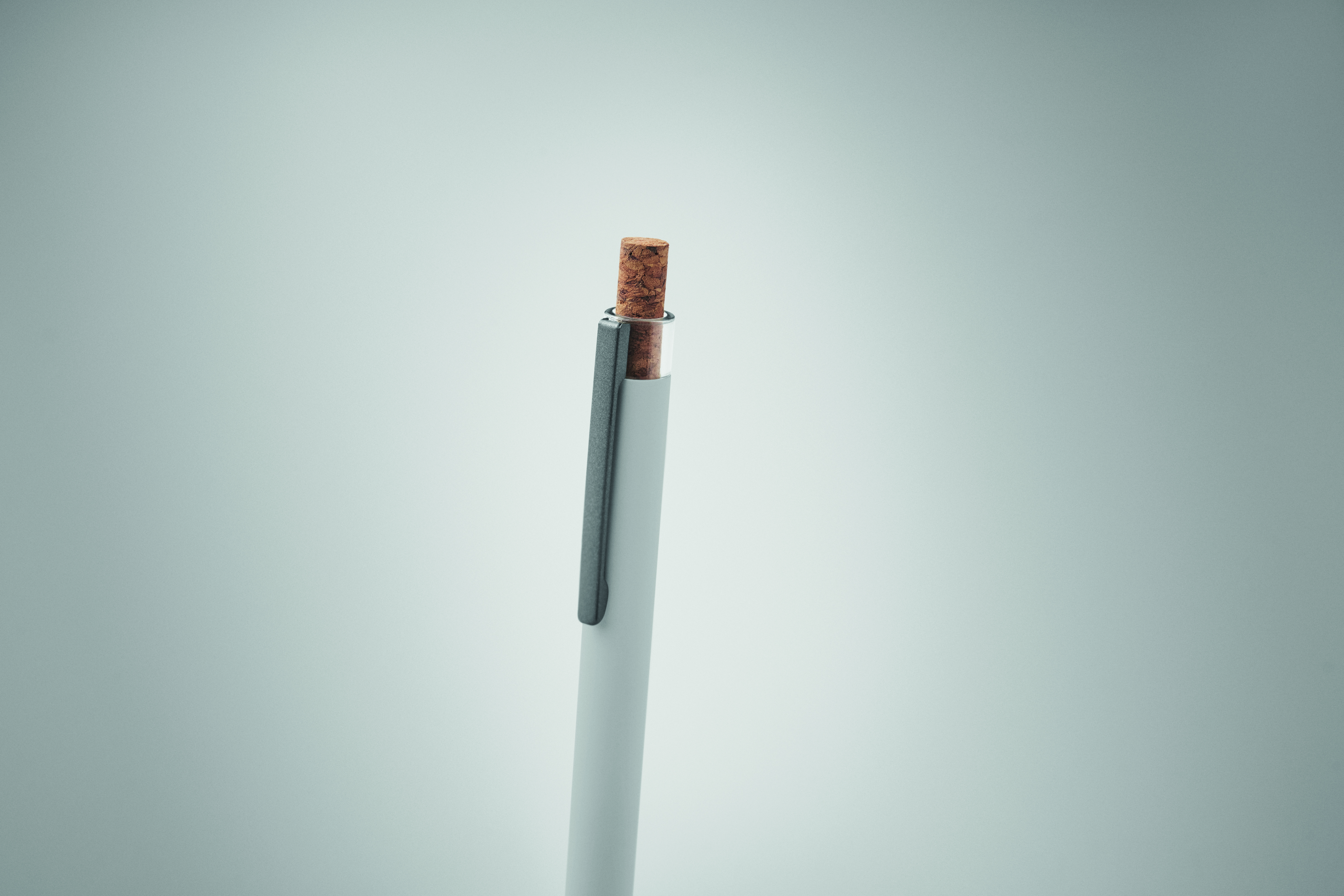 Długopis z aluminium pochodzącego z recyklingu z korkowym przyciskiem i metalowym klipem. Niebieski tusz.