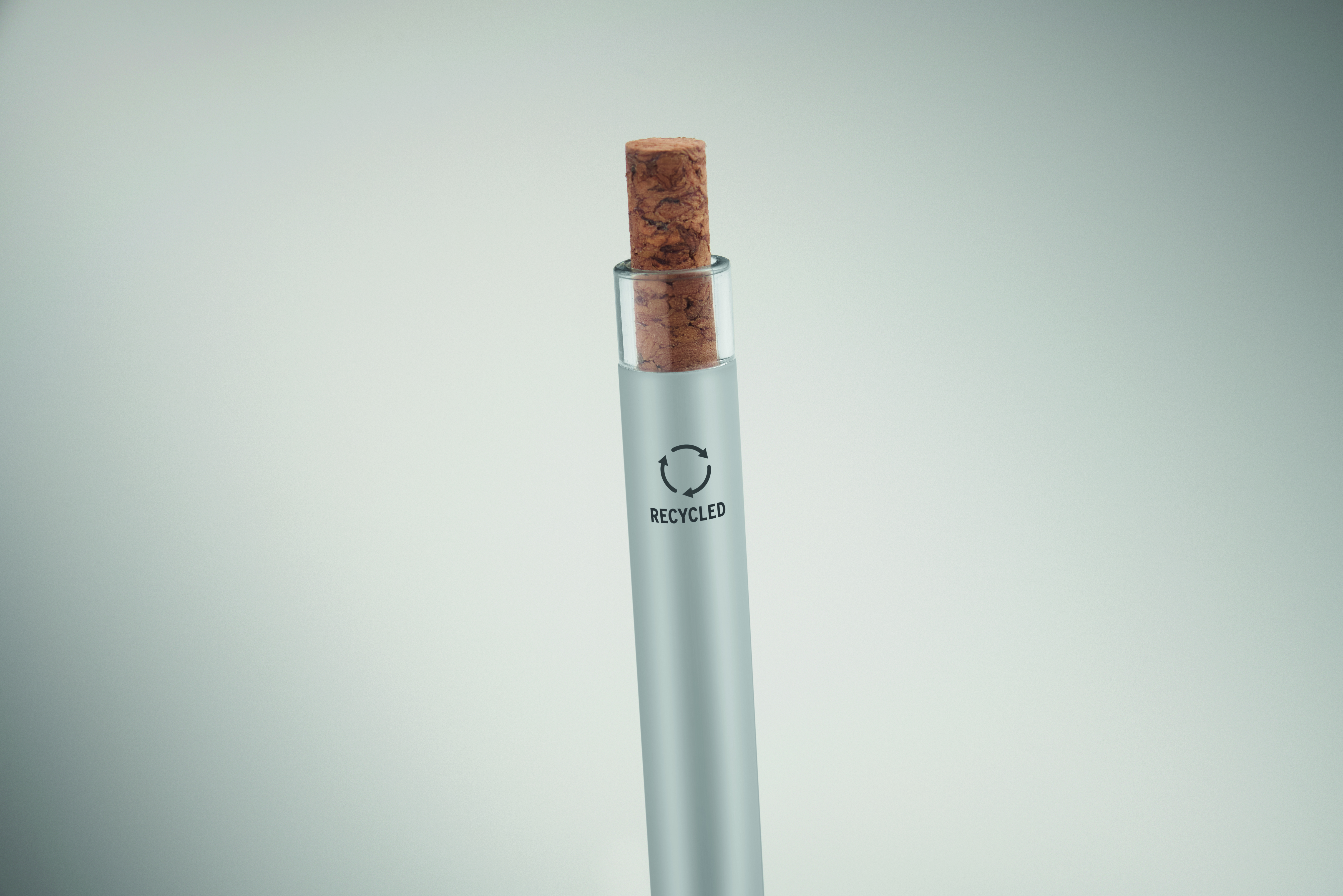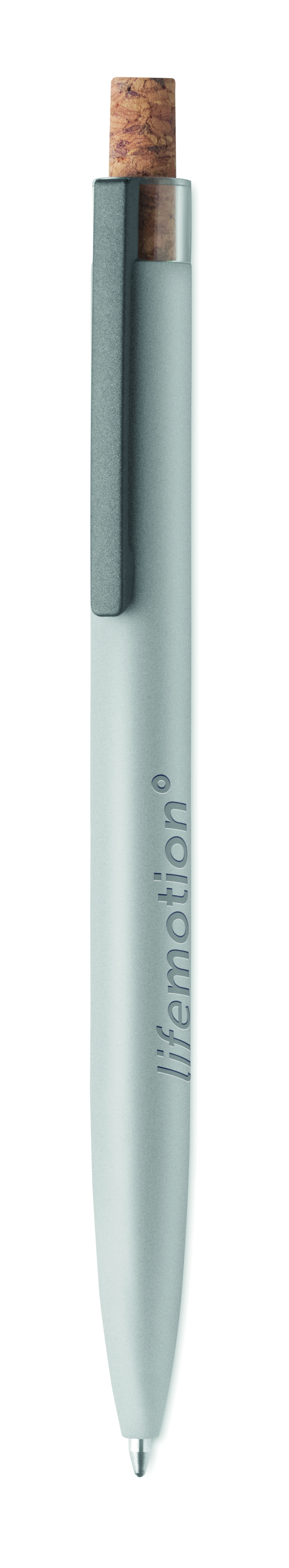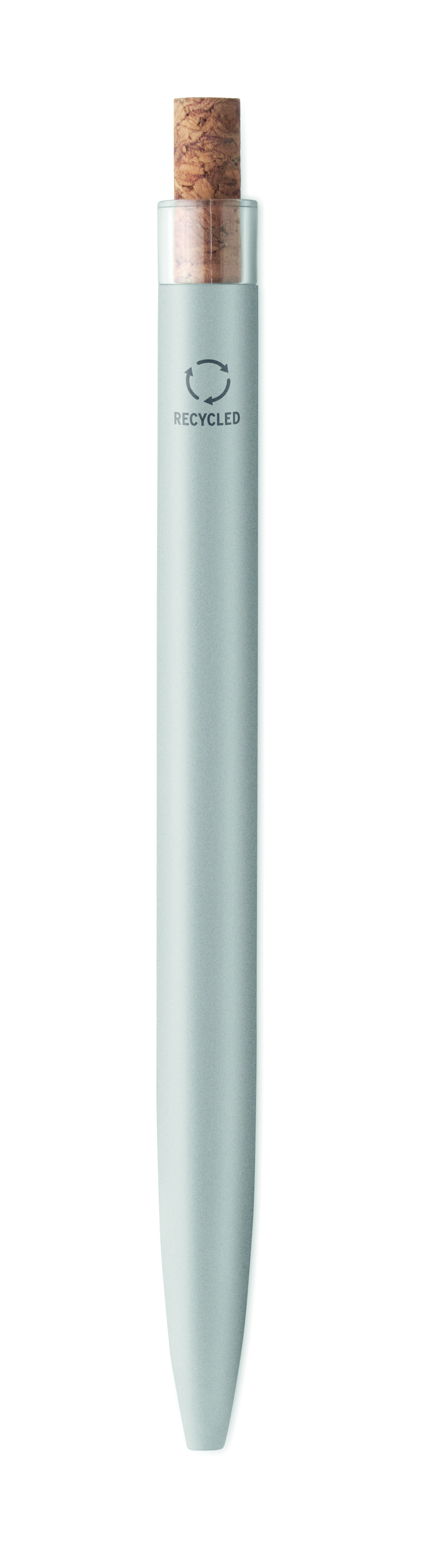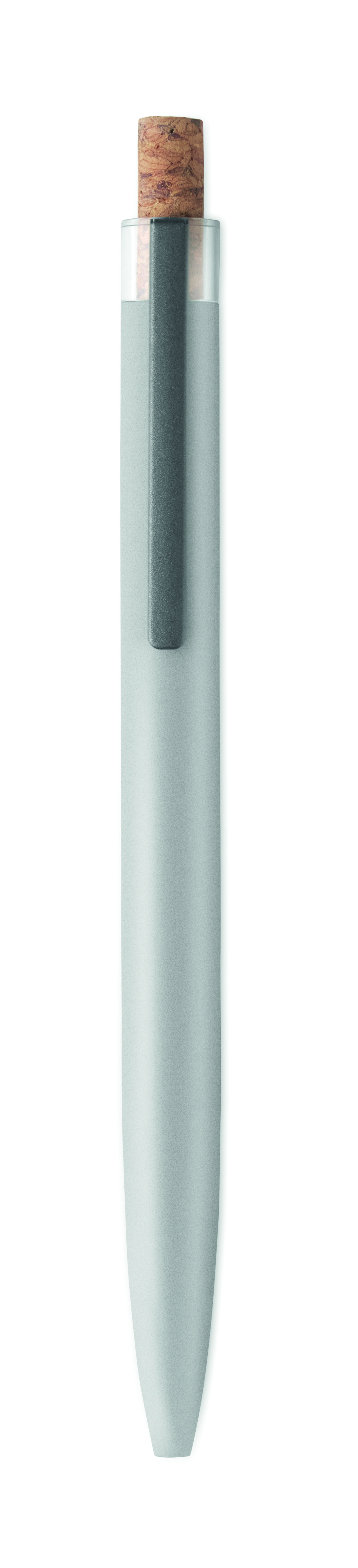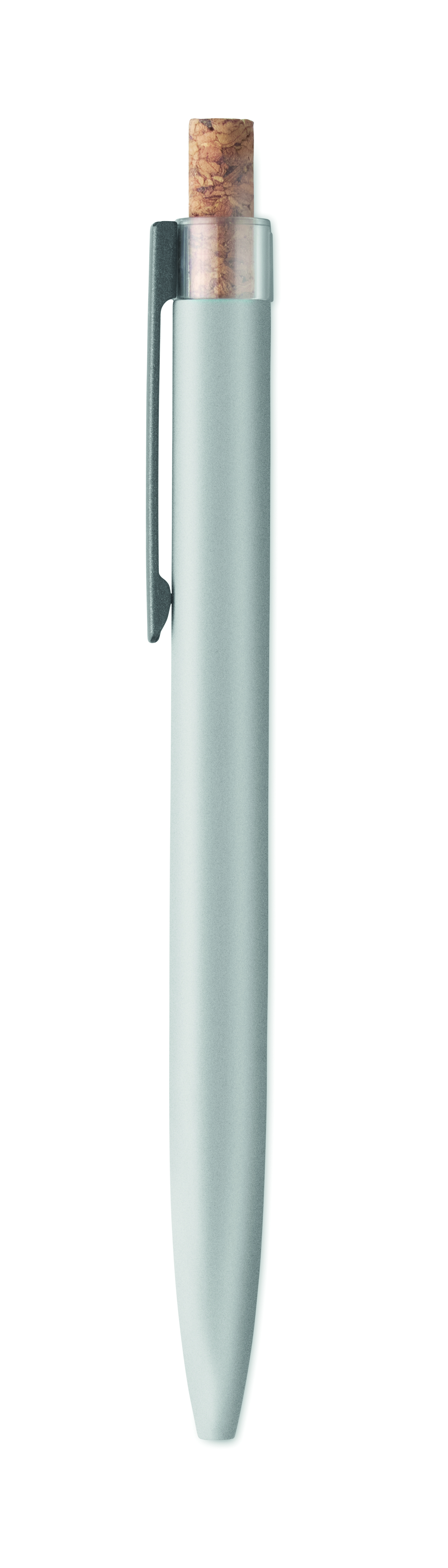 Długopis z aluminium pochodzącego z recyklingu z korkowym przyciskiem i metalowym klipem. Niebieski tusz.