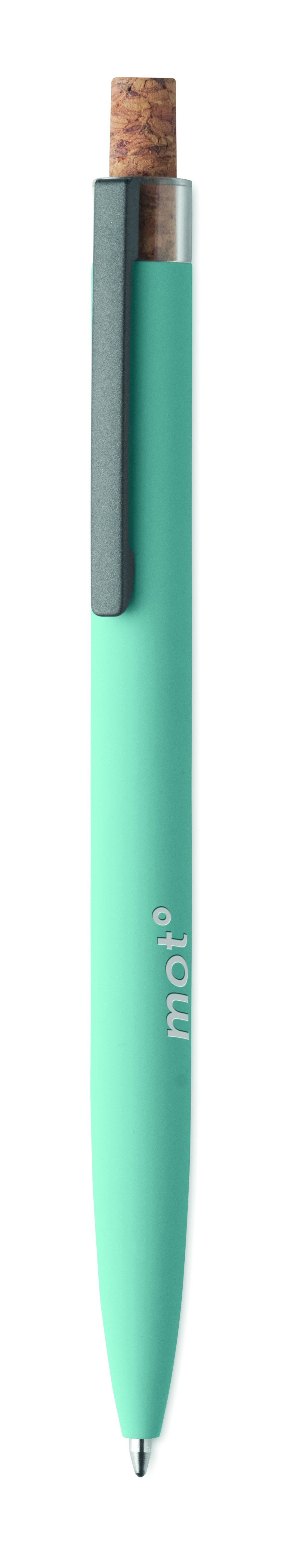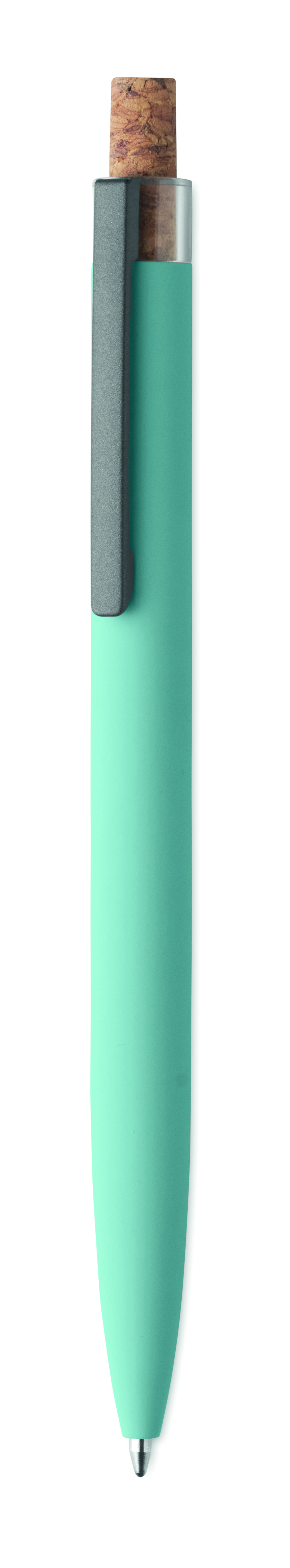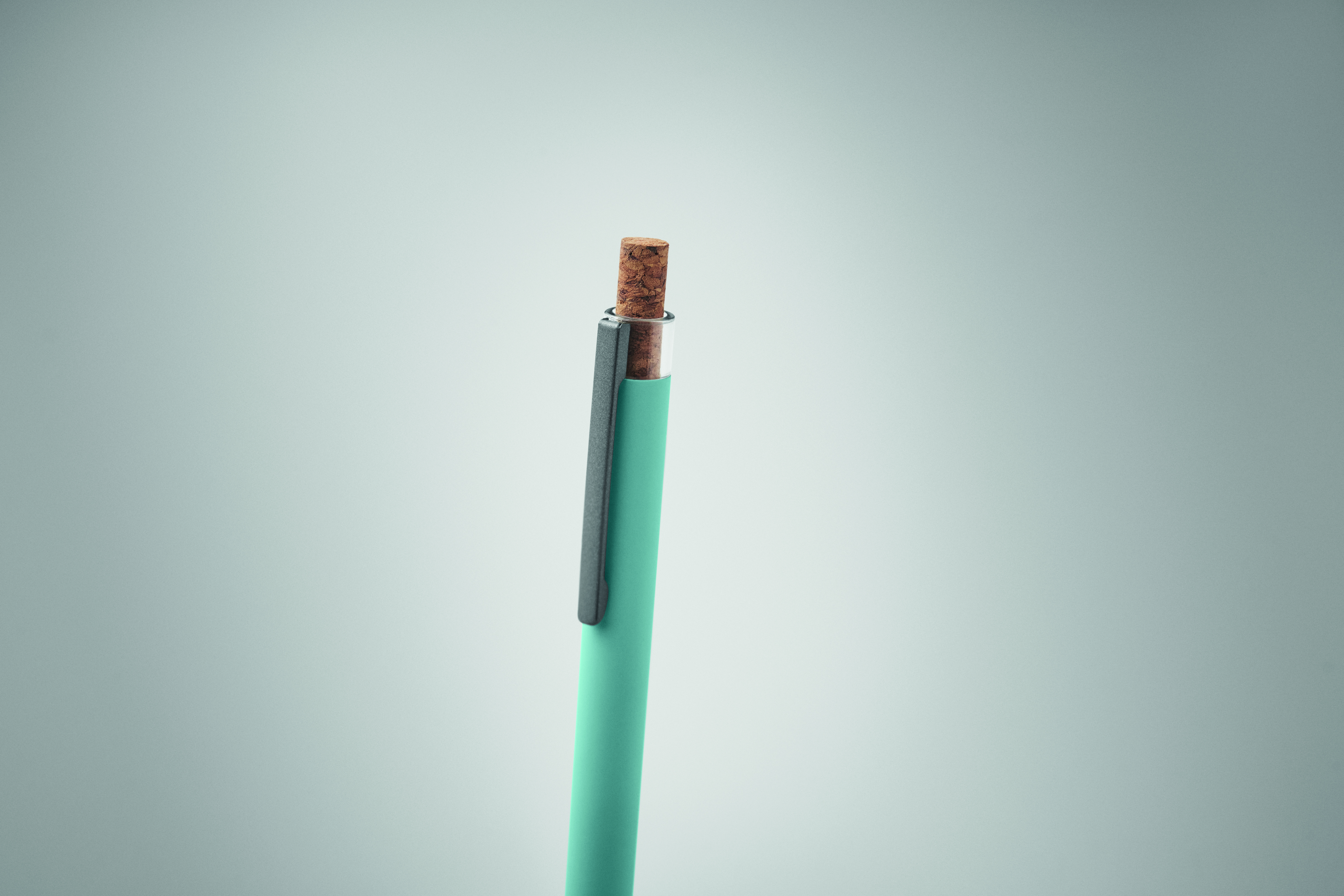 Długopis z aluminium pochodzącego z recyklingu z korkowym przyciskiem i metalowym klipem. Niebieski tusz.