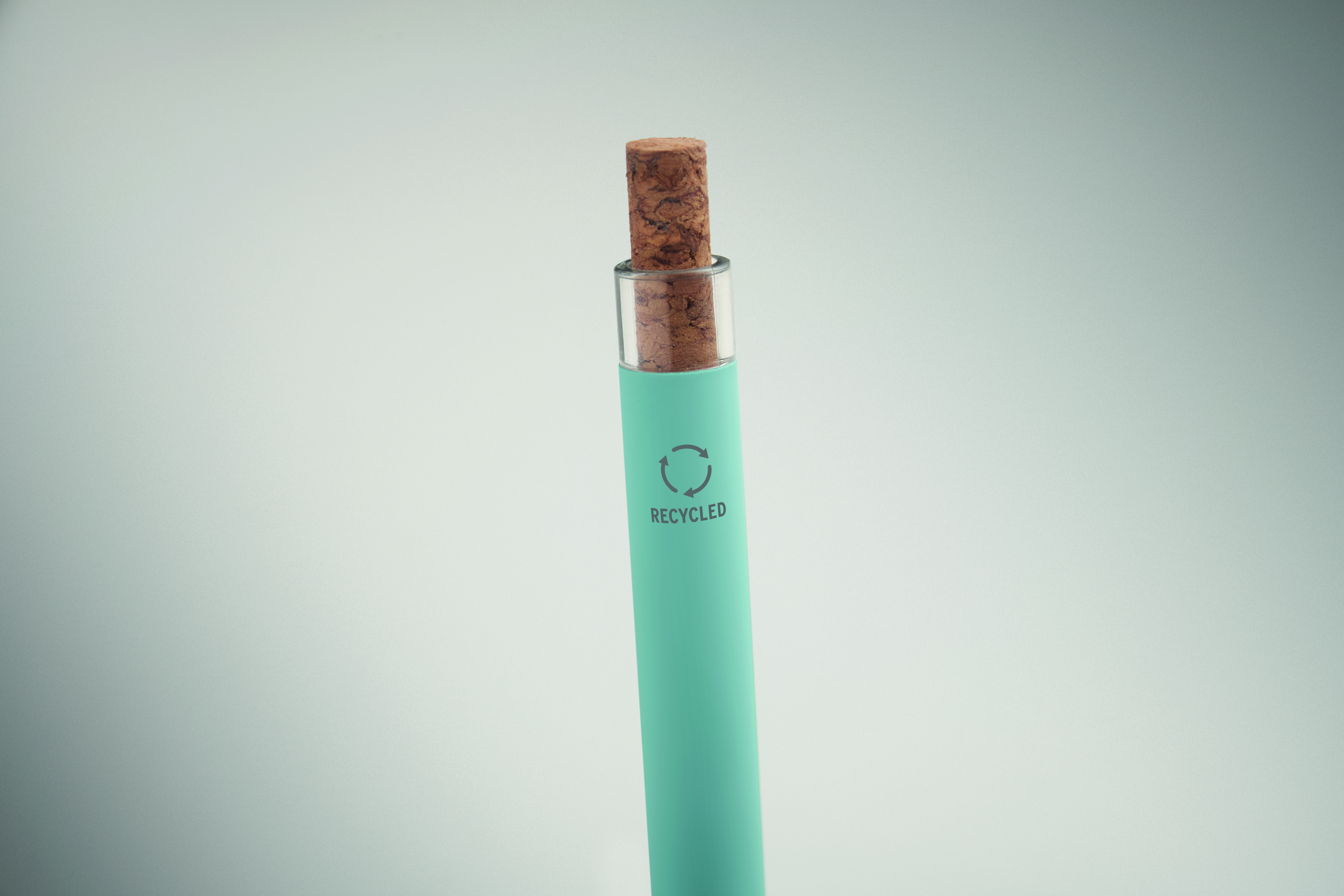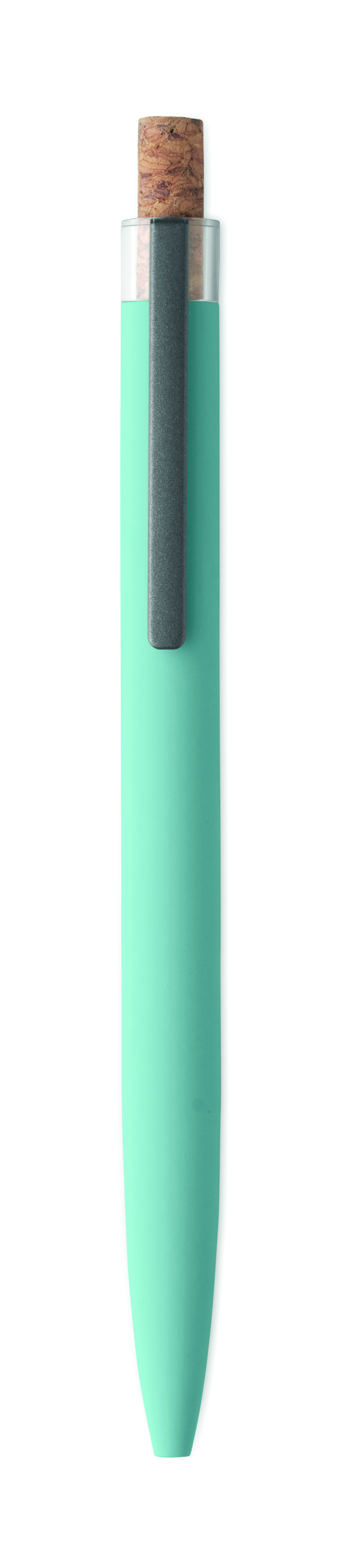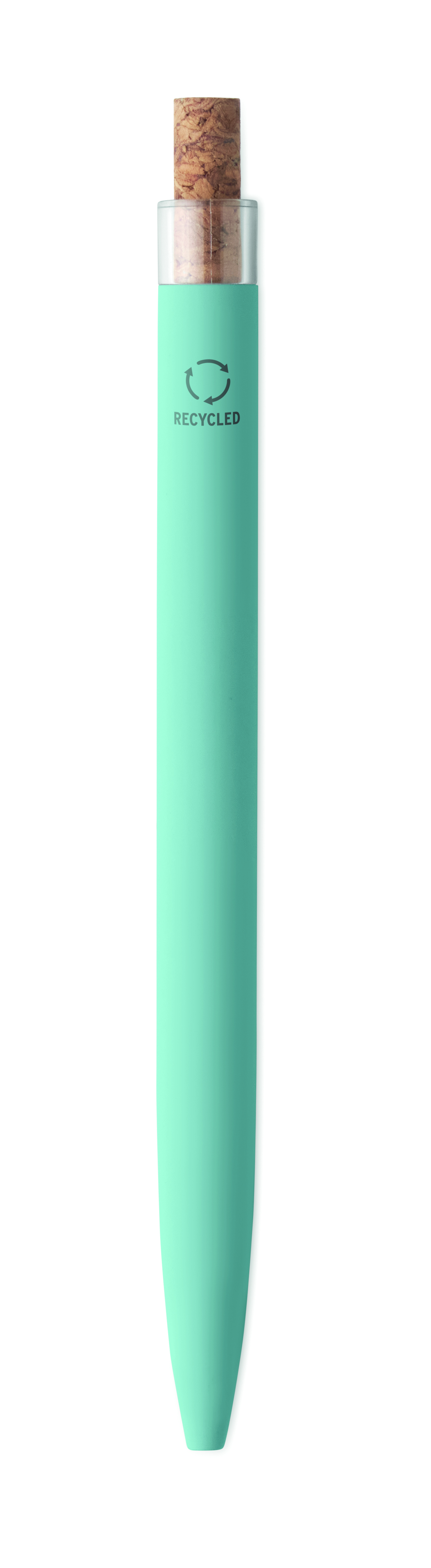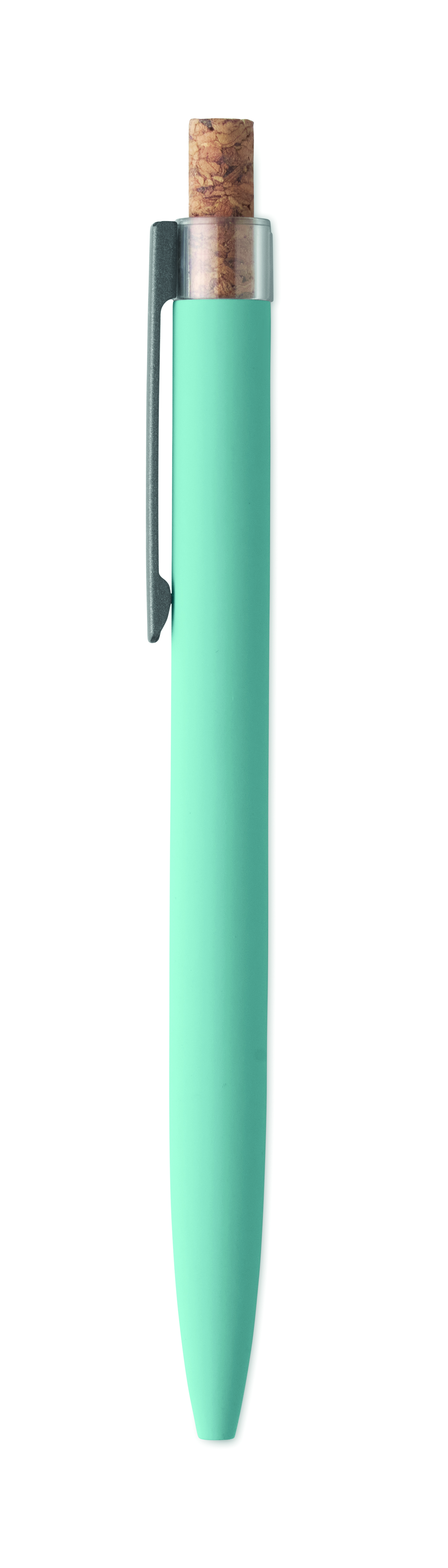 Długopis z aluminium pochodzącego z recyklingu z korkowym przyciskiem i metalowym klipem. Niebieski tusz.