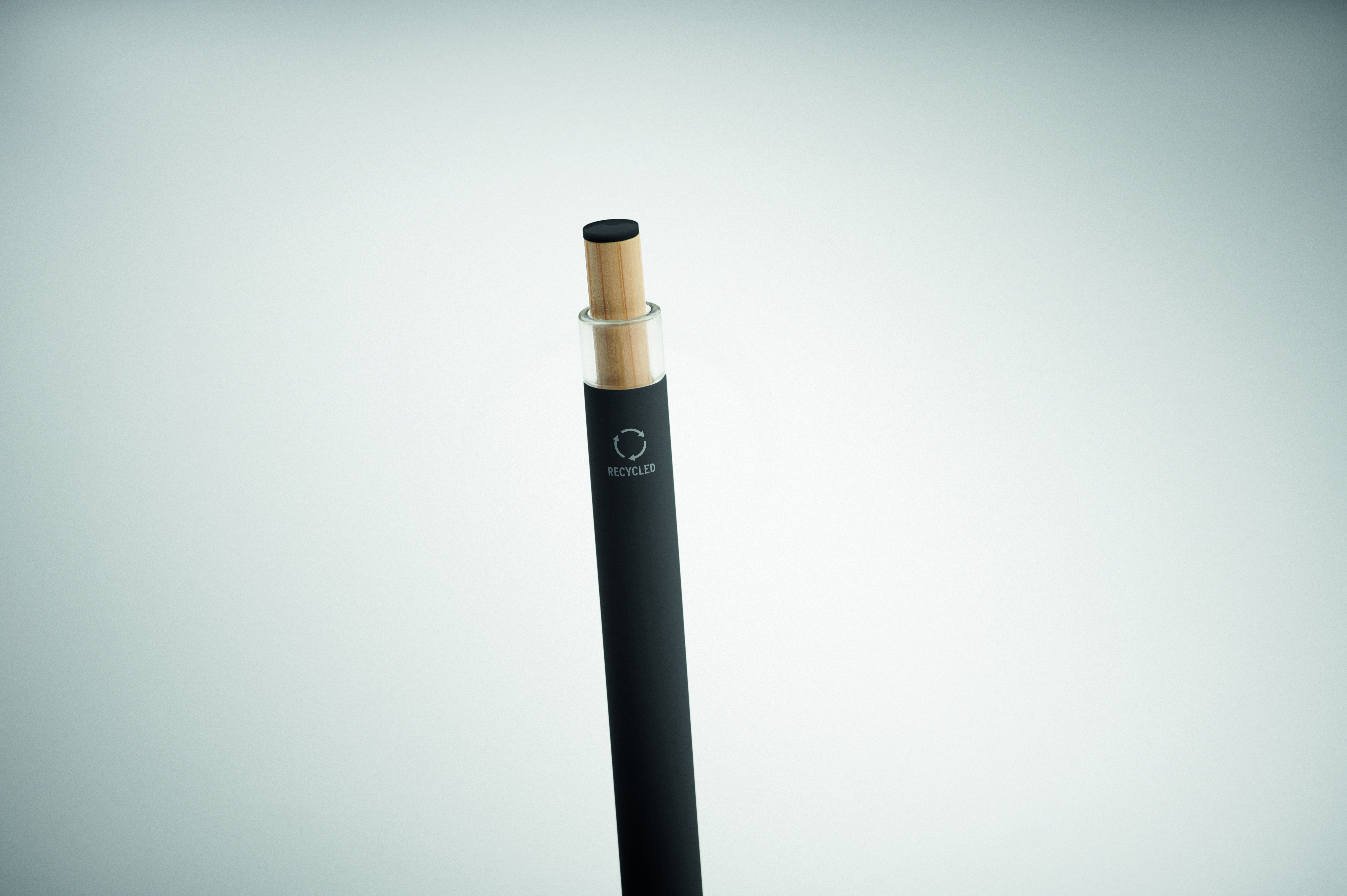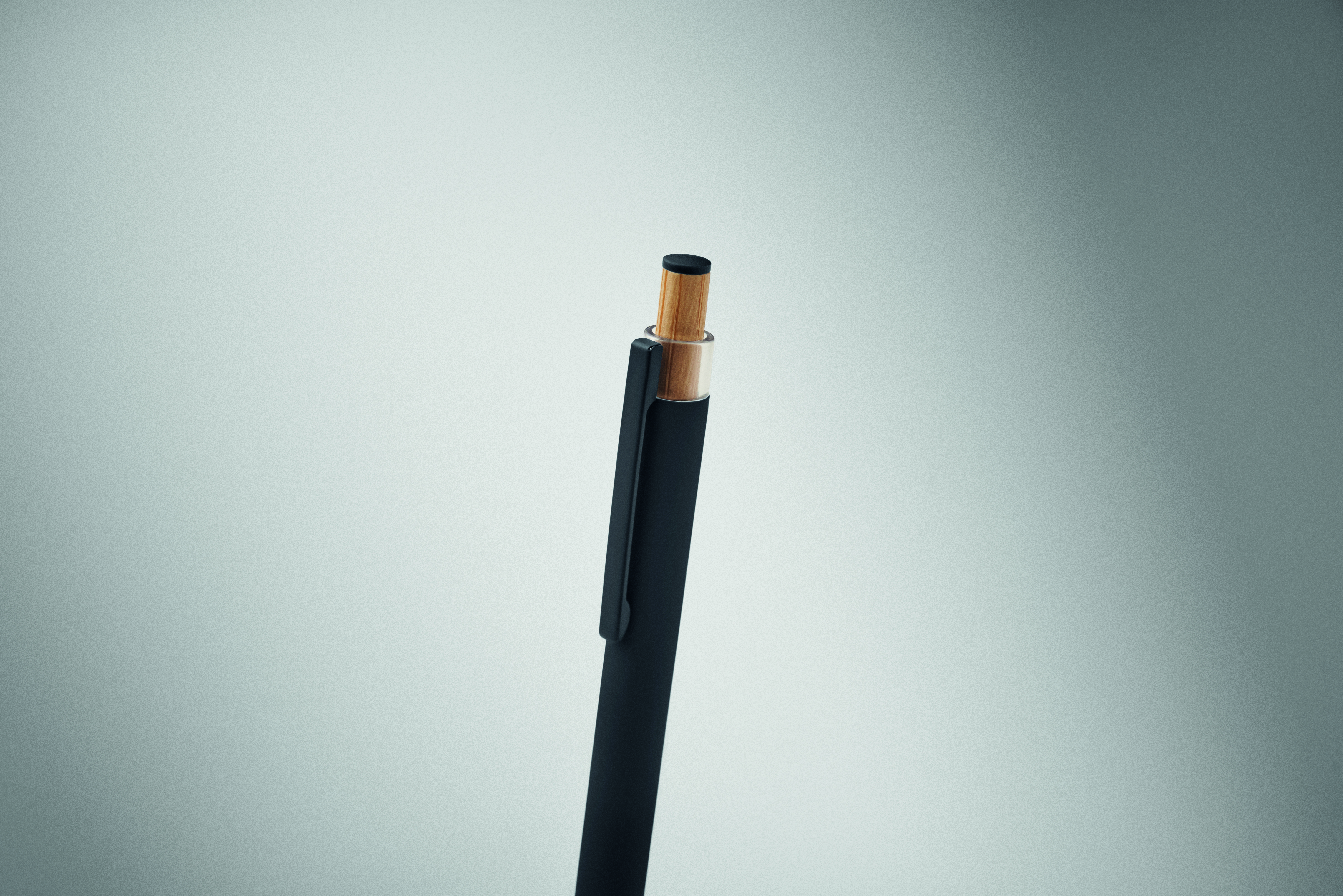 Aluminiowy długopis z recyklingu z bambusowym przyciskiem i dopasowanym kolorystycznie klipsem. Niebieski tusz.