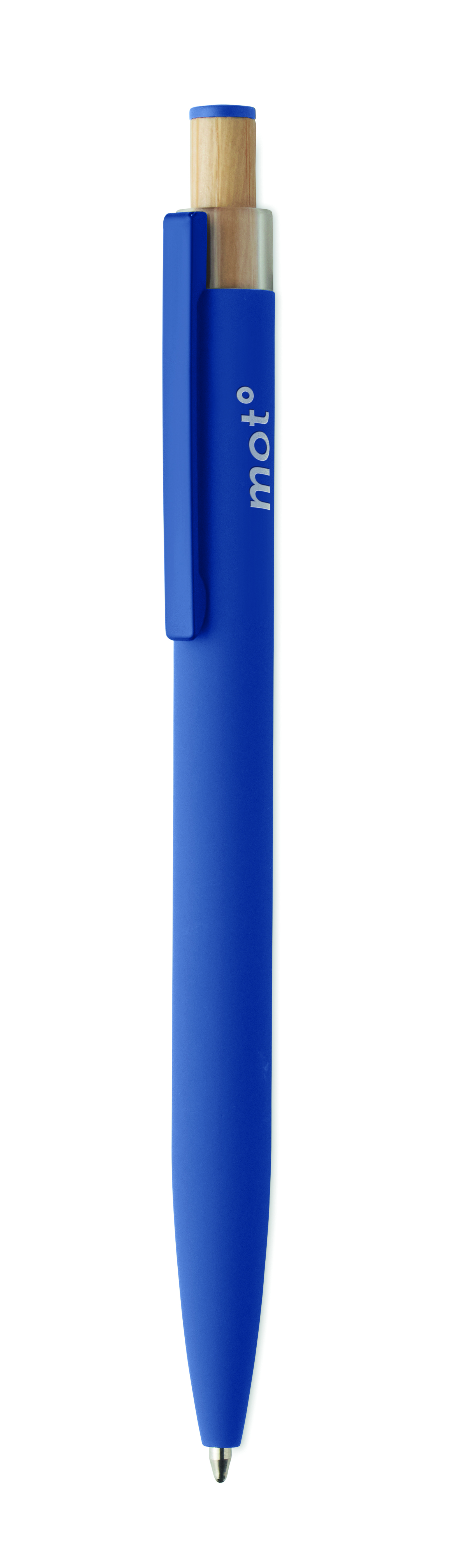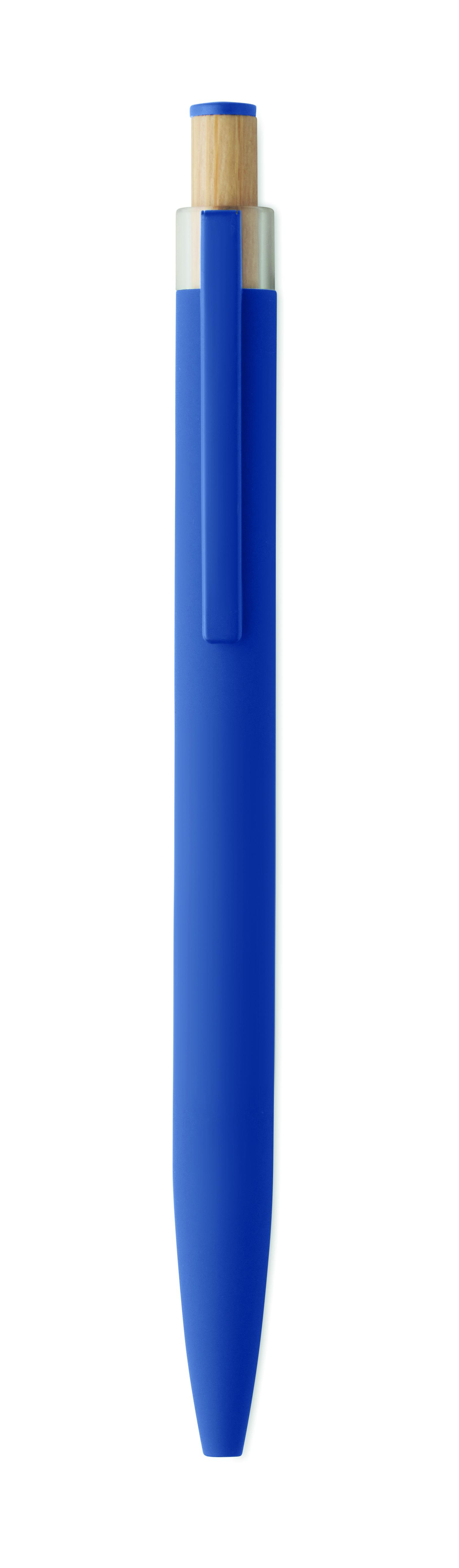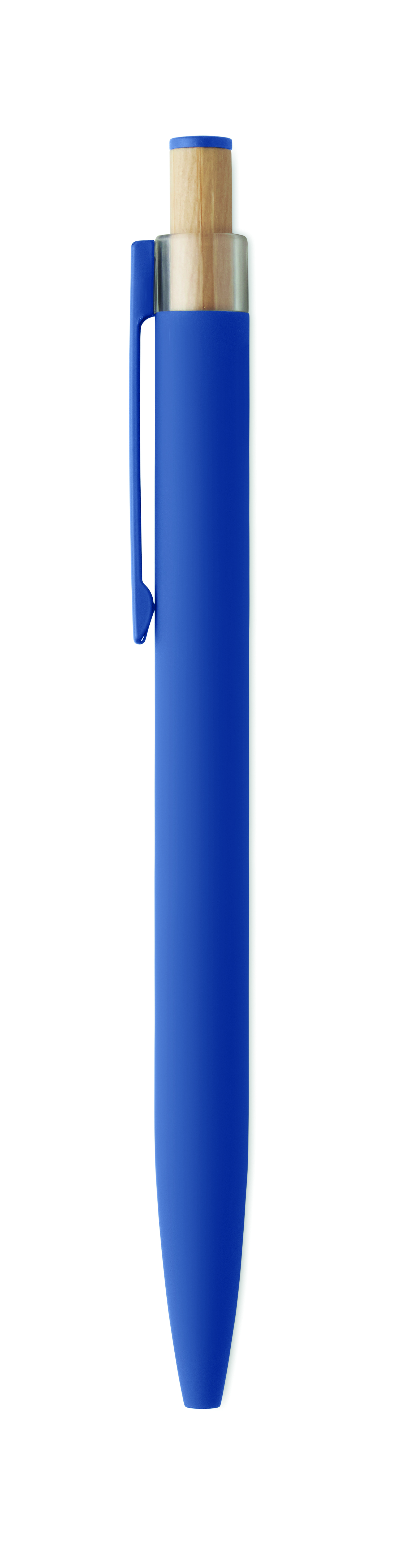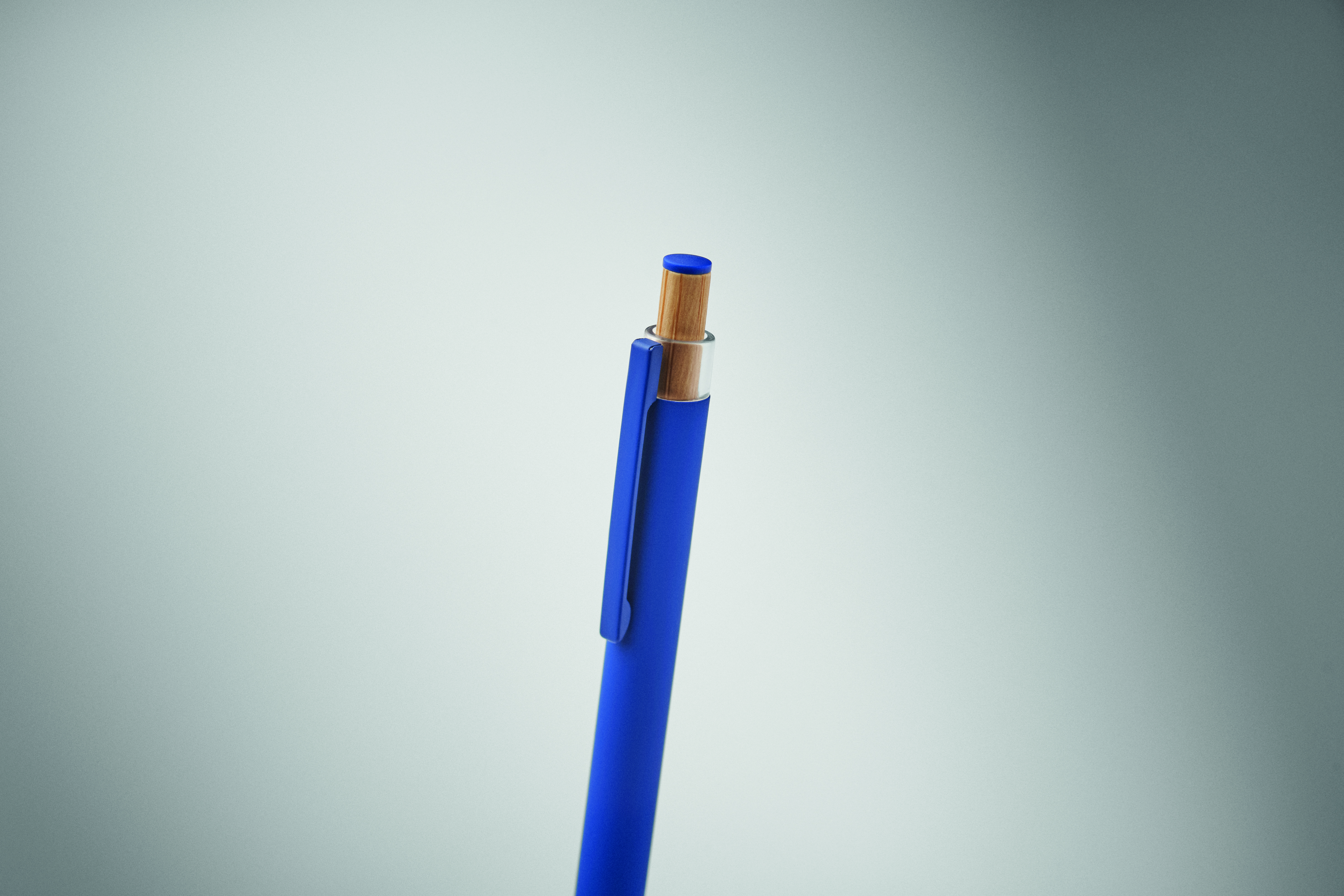Aluminiowy długopis z recyklingu z bambusowym przyciskiem i dopasowanym kolorystycznie klipsem. Niebieski tusz.
