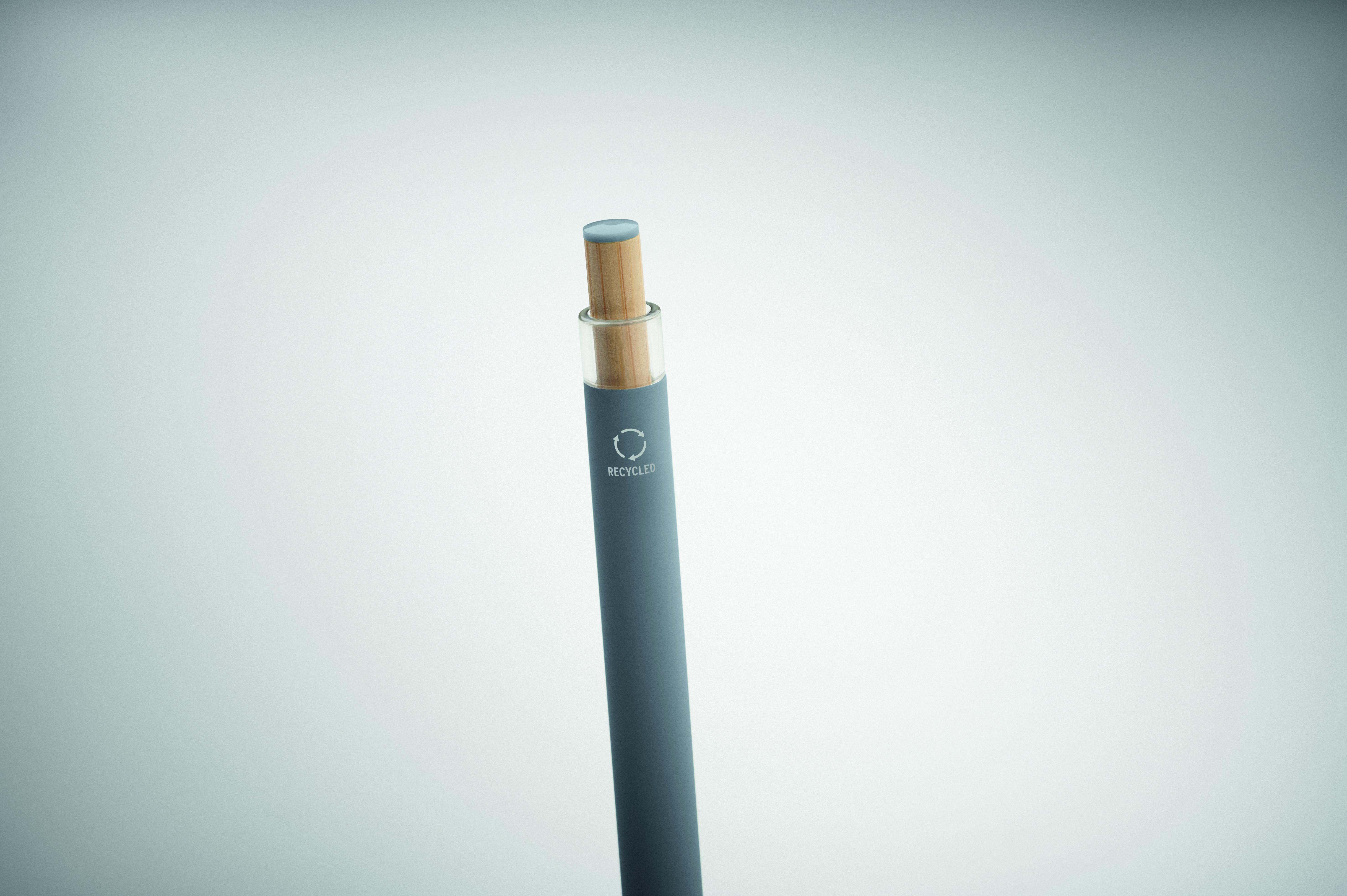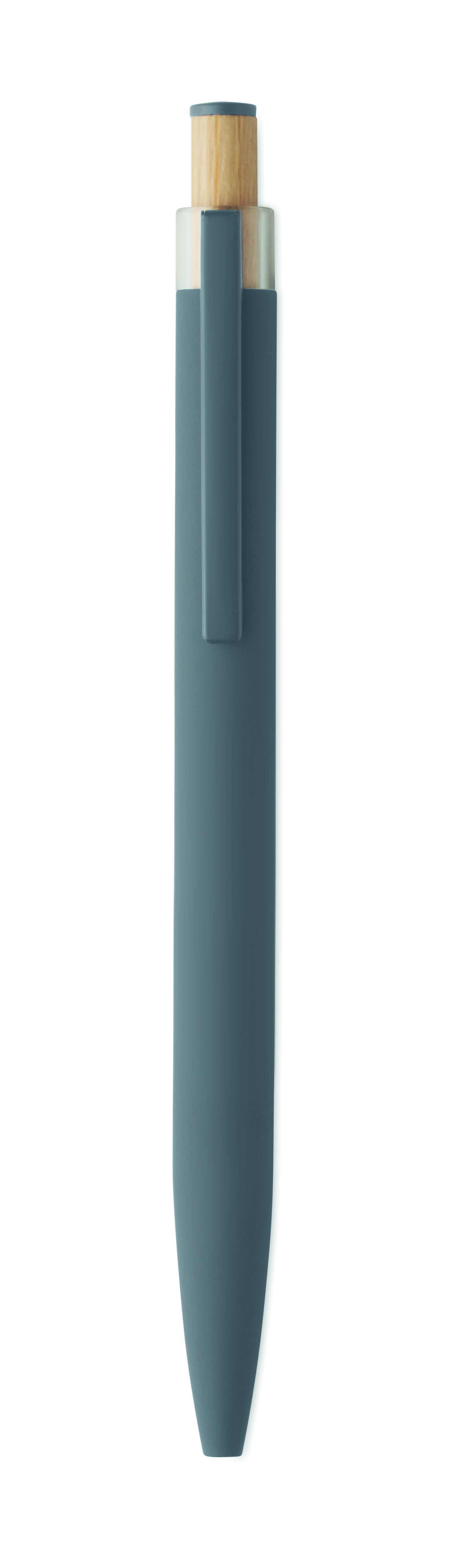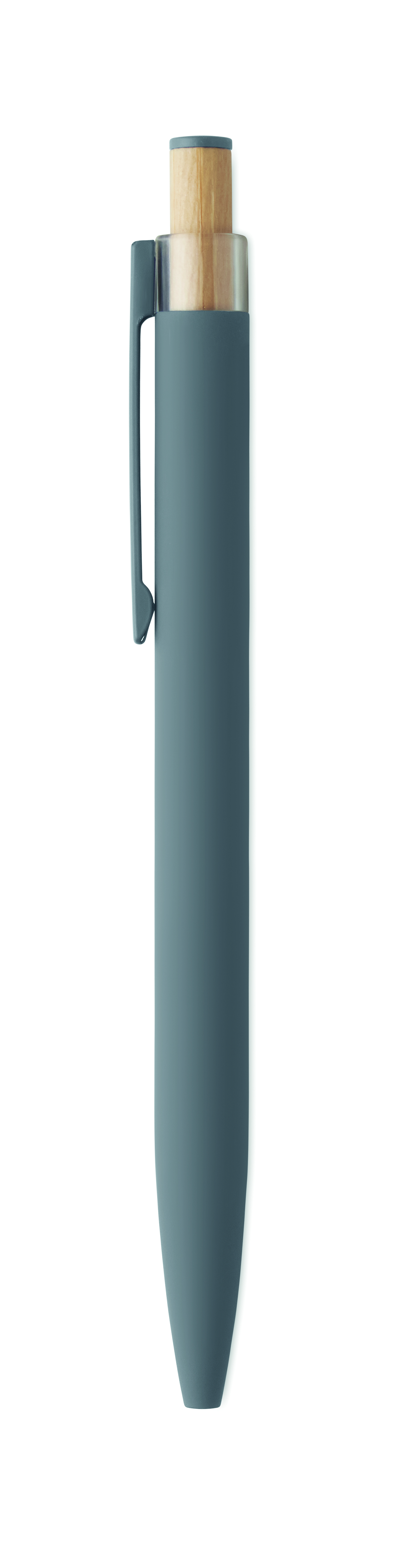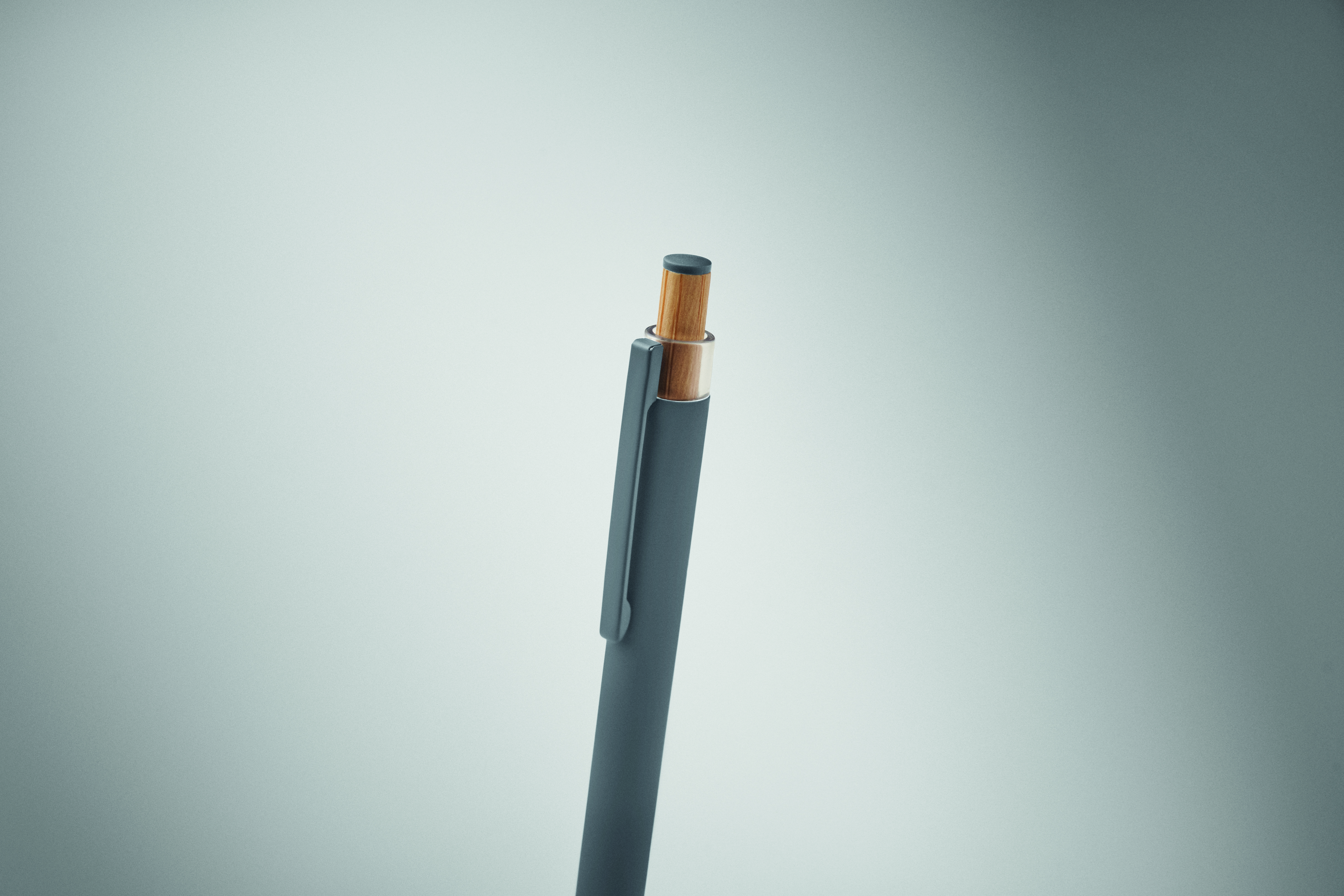 Aluminiowy długopis z recyklingu z bambusowym przyciskiem i dopasowanym kolorystycznie klipsem. Niebieski tusz.