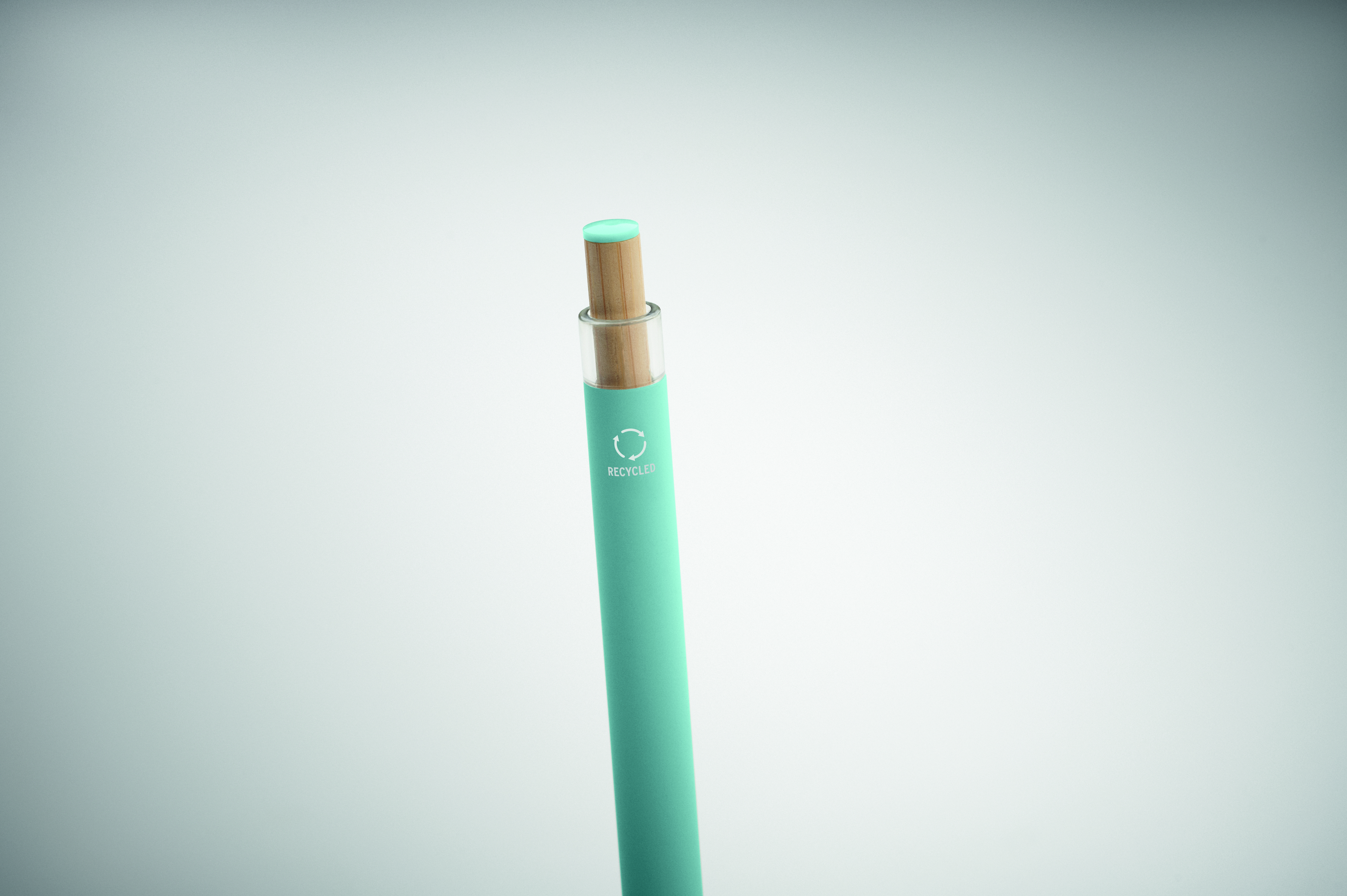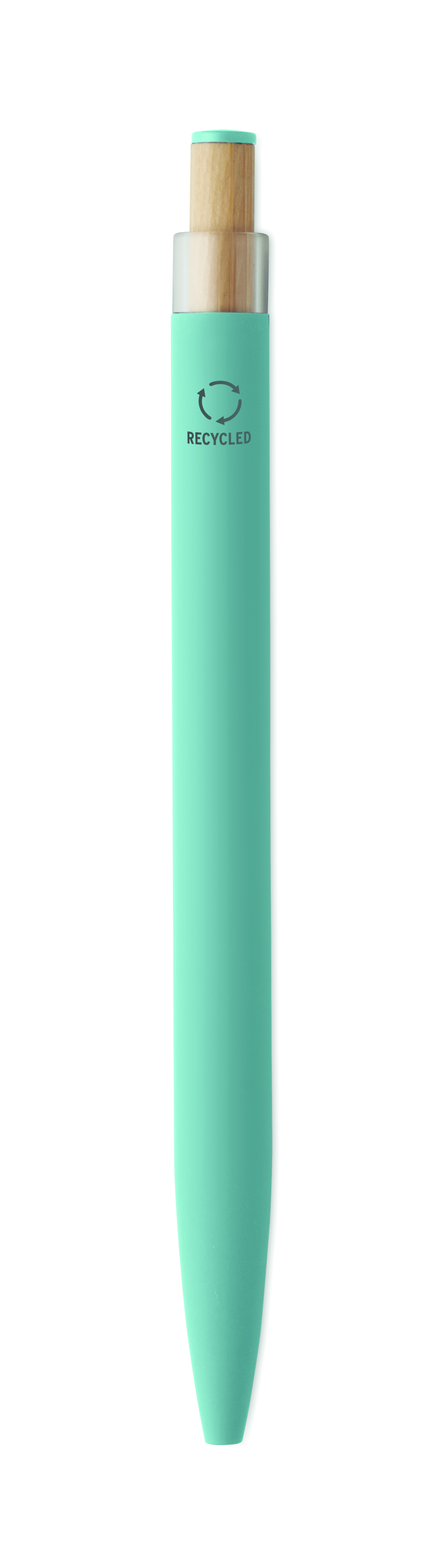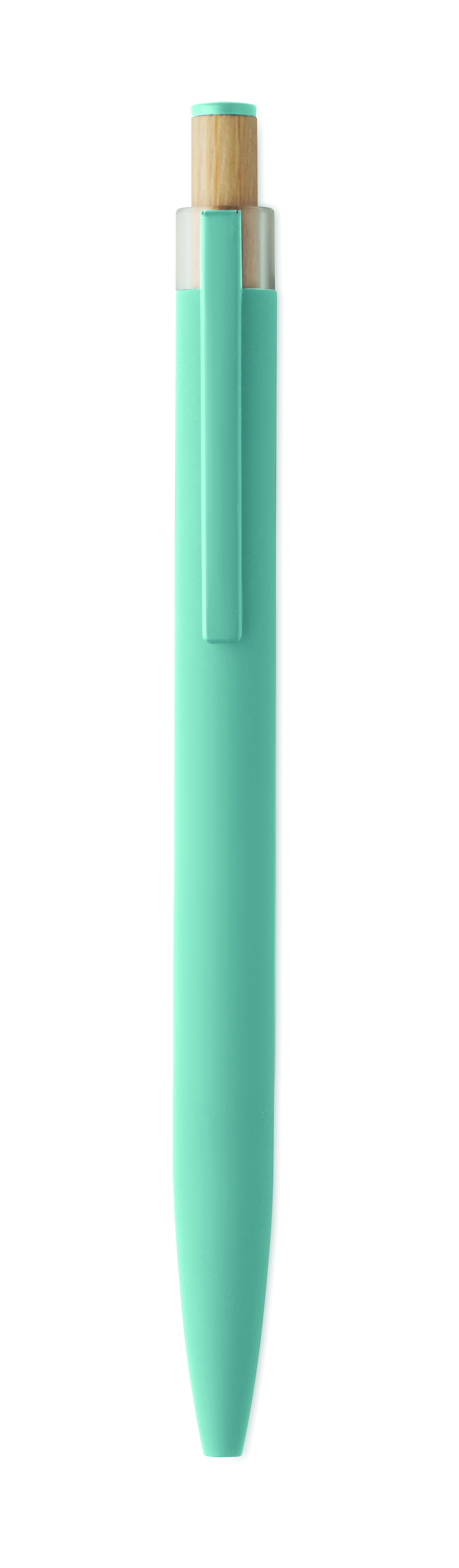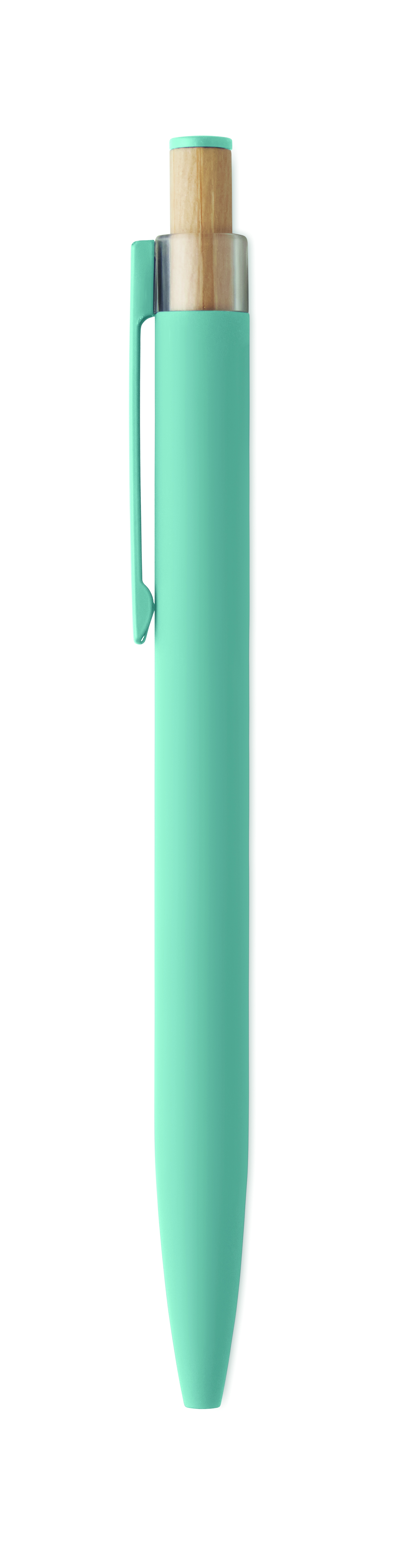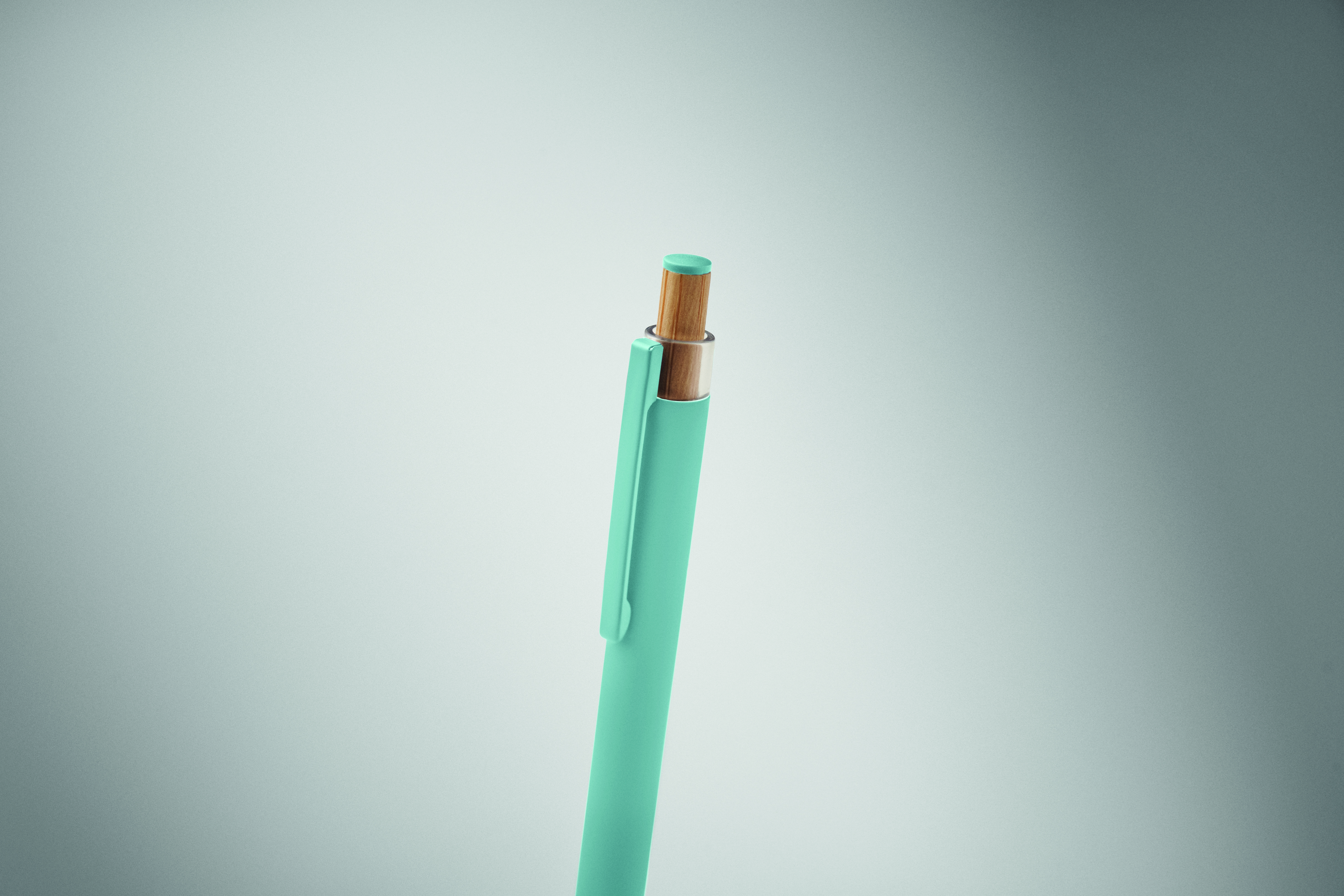 Aluminiowy długopis z recyklingu z bambusowym przyciskiem i dopasowanym kolorystycznie klipsem. Niebieski tusz.