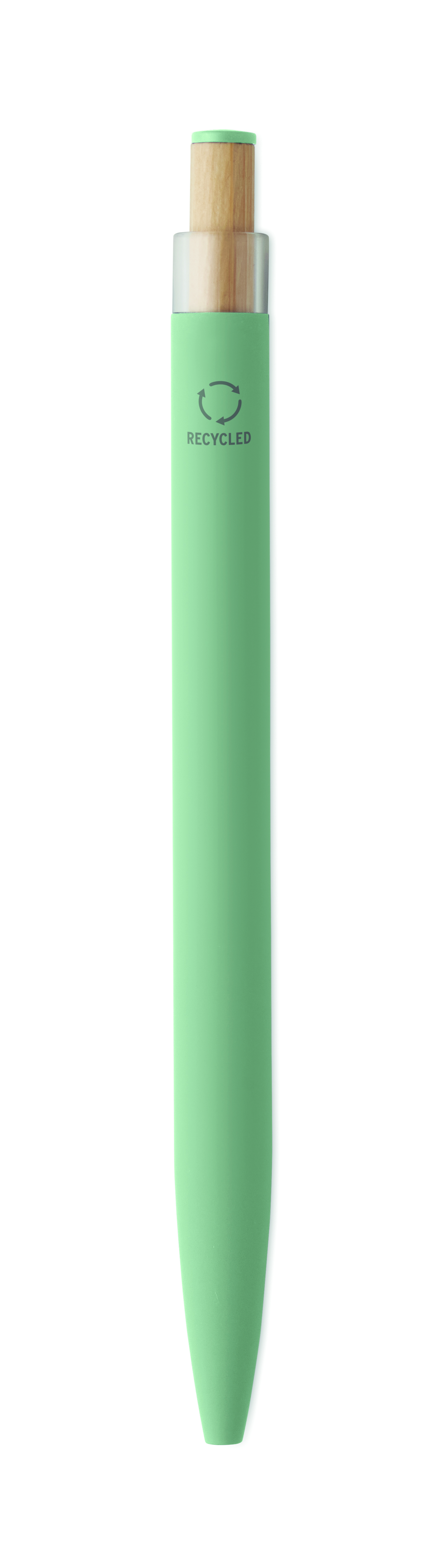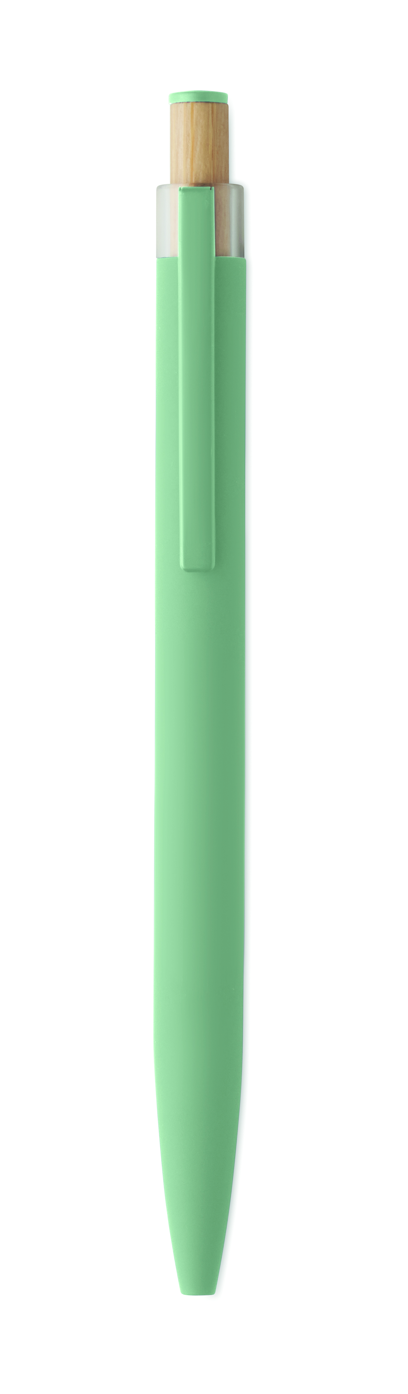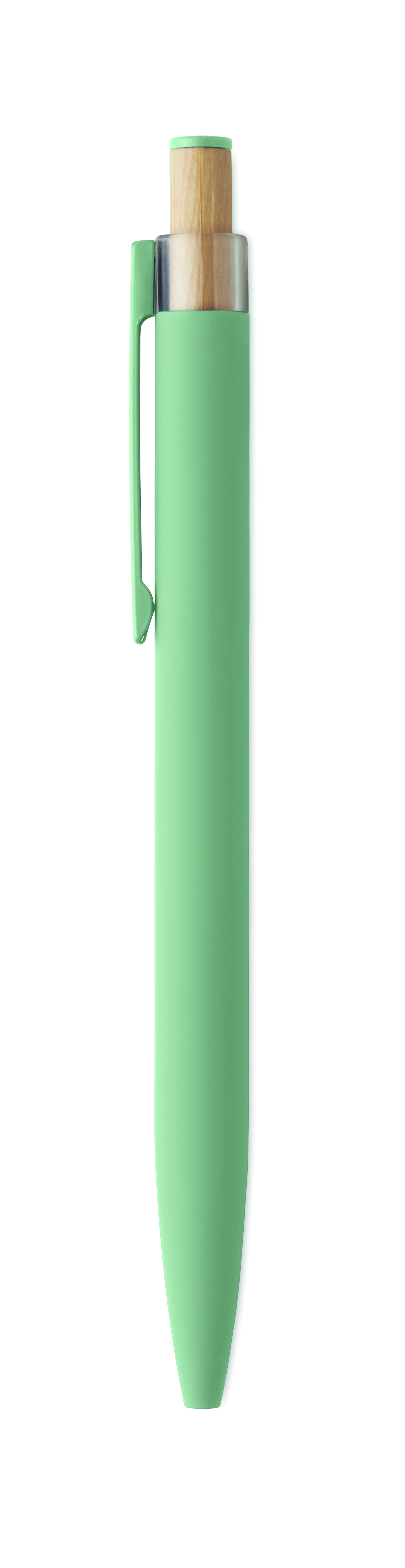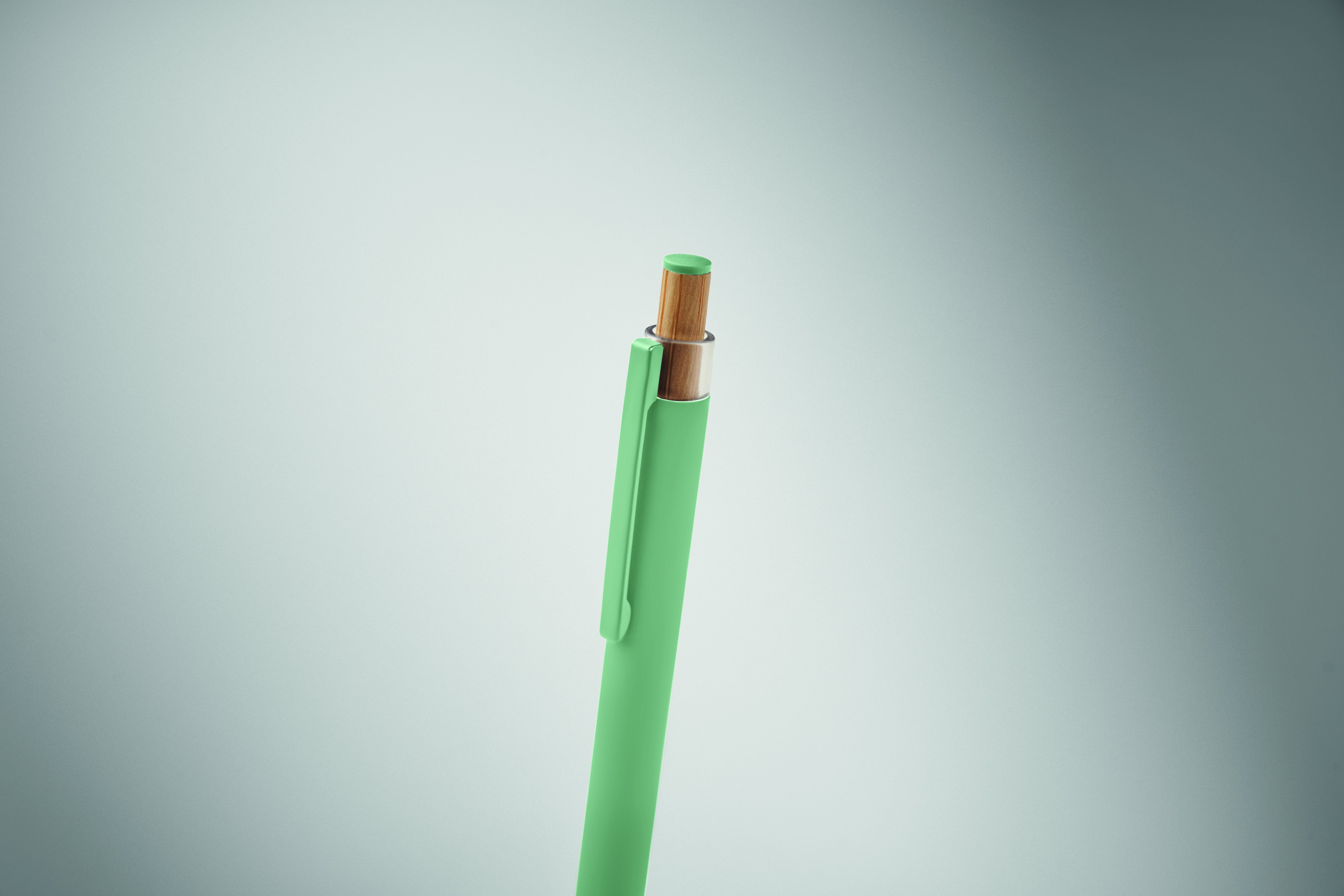 Aluminiowy długopis z recyklingu z bambusowym przyciskiem i dopasowanym kolorystycznie klipsem. Niebieski tusz.