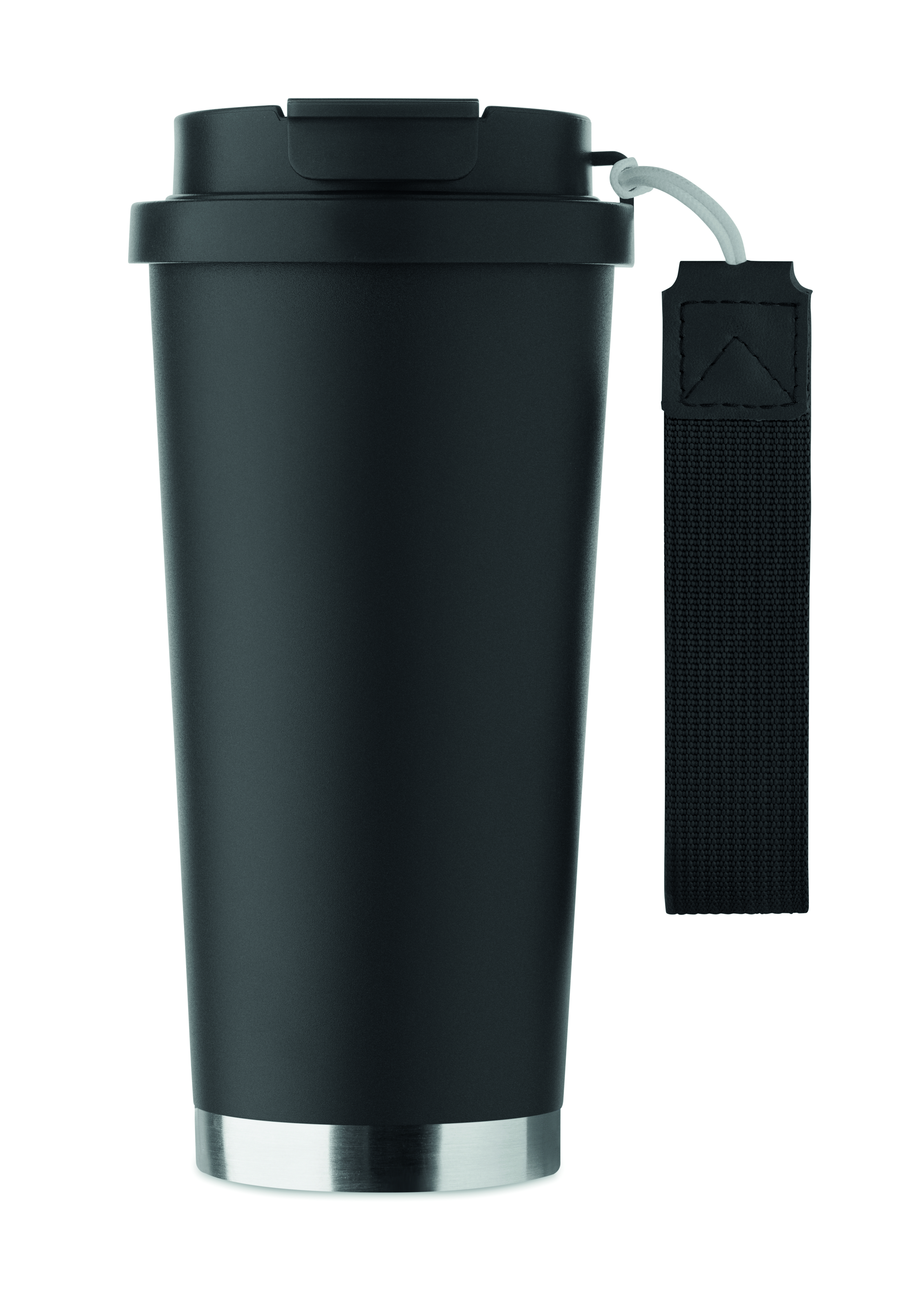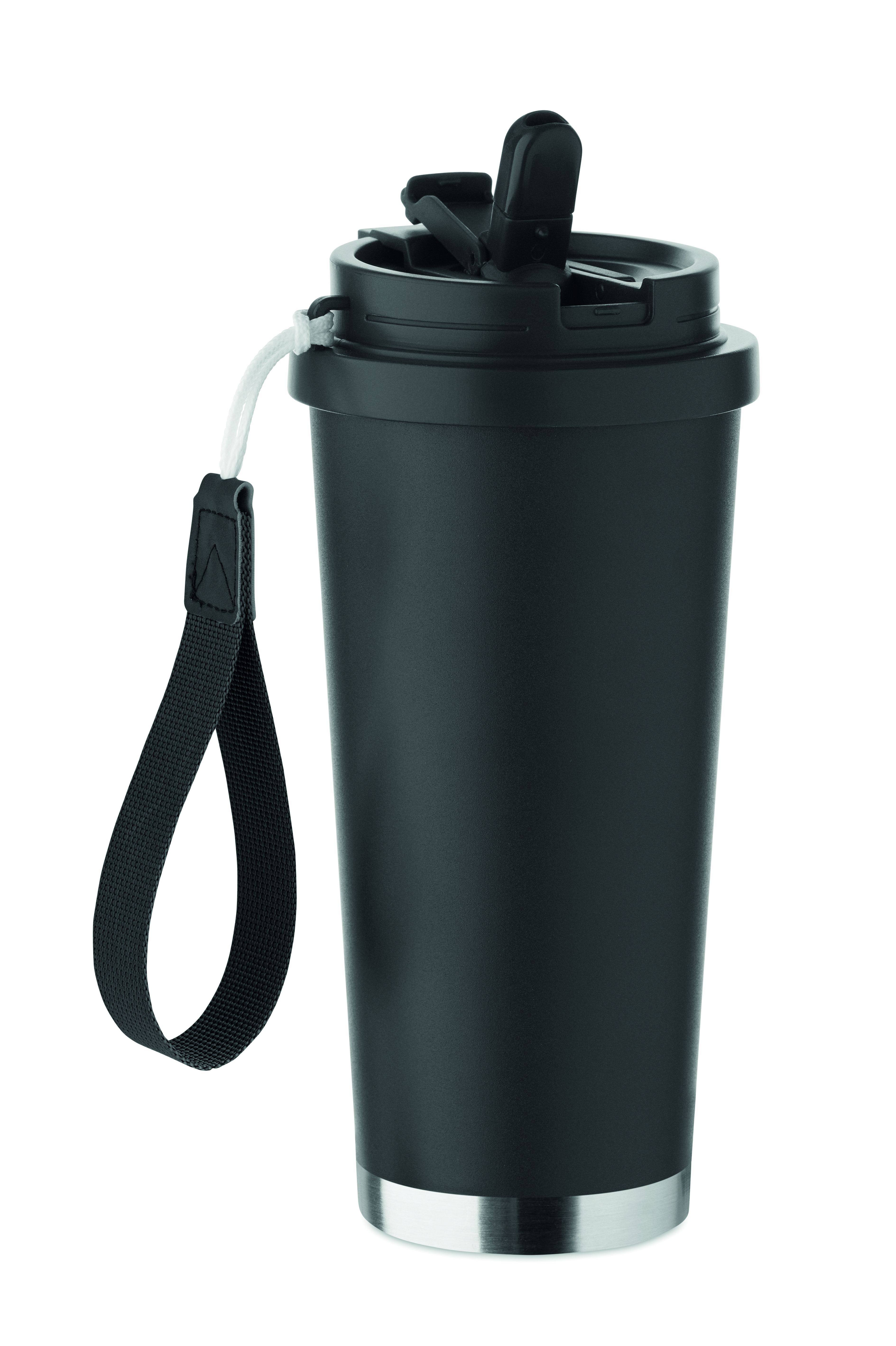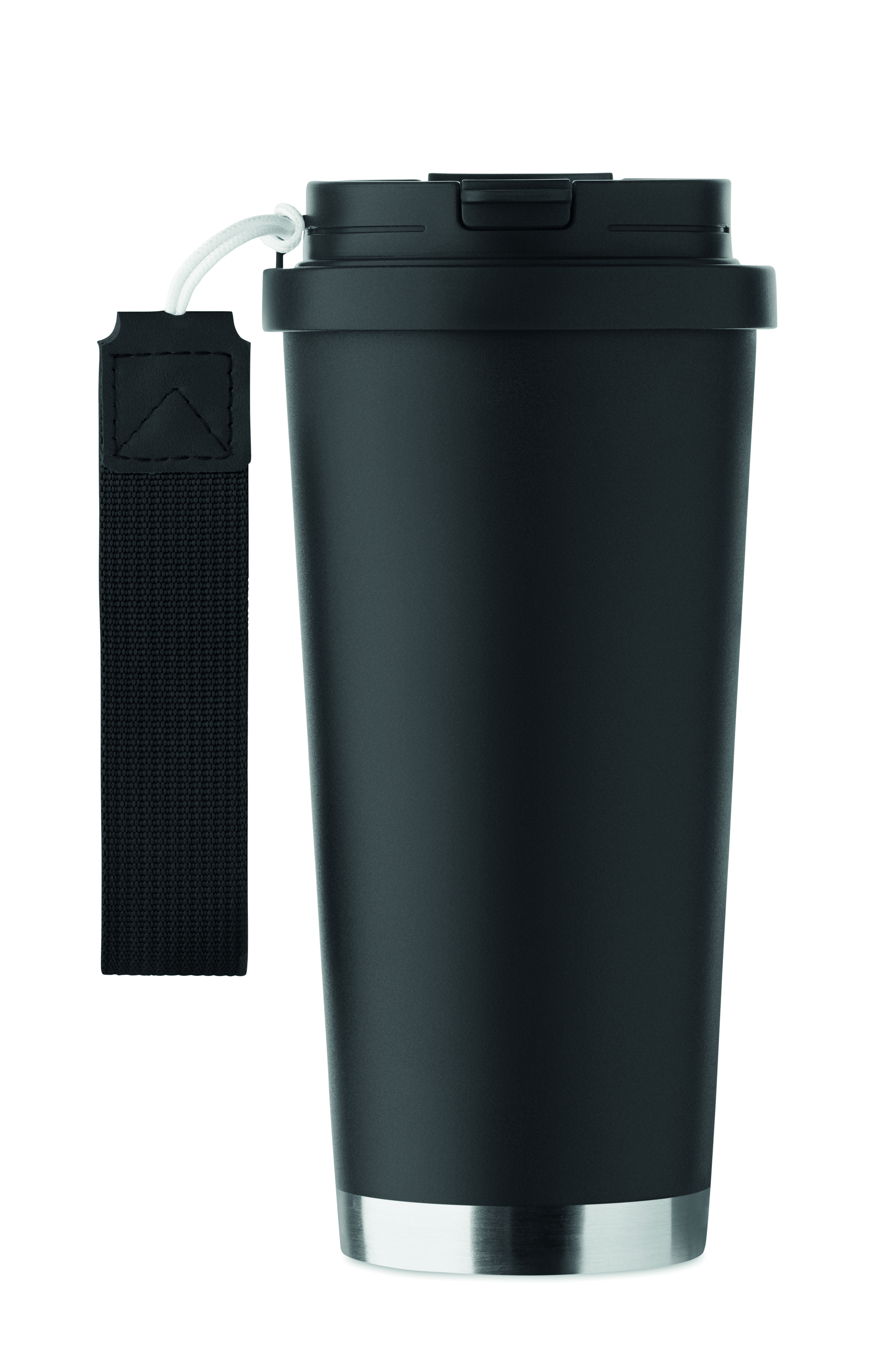 Kubek z podwójnymi ściankami z recyklingowanej stali nierdzewnej z pokrywką z PP (2 w 1: otwór do picia i pokrywka ze słomką) i paskiem do przenoszenia z RPET. Nie przecieka. Pojemność: 500 ml.