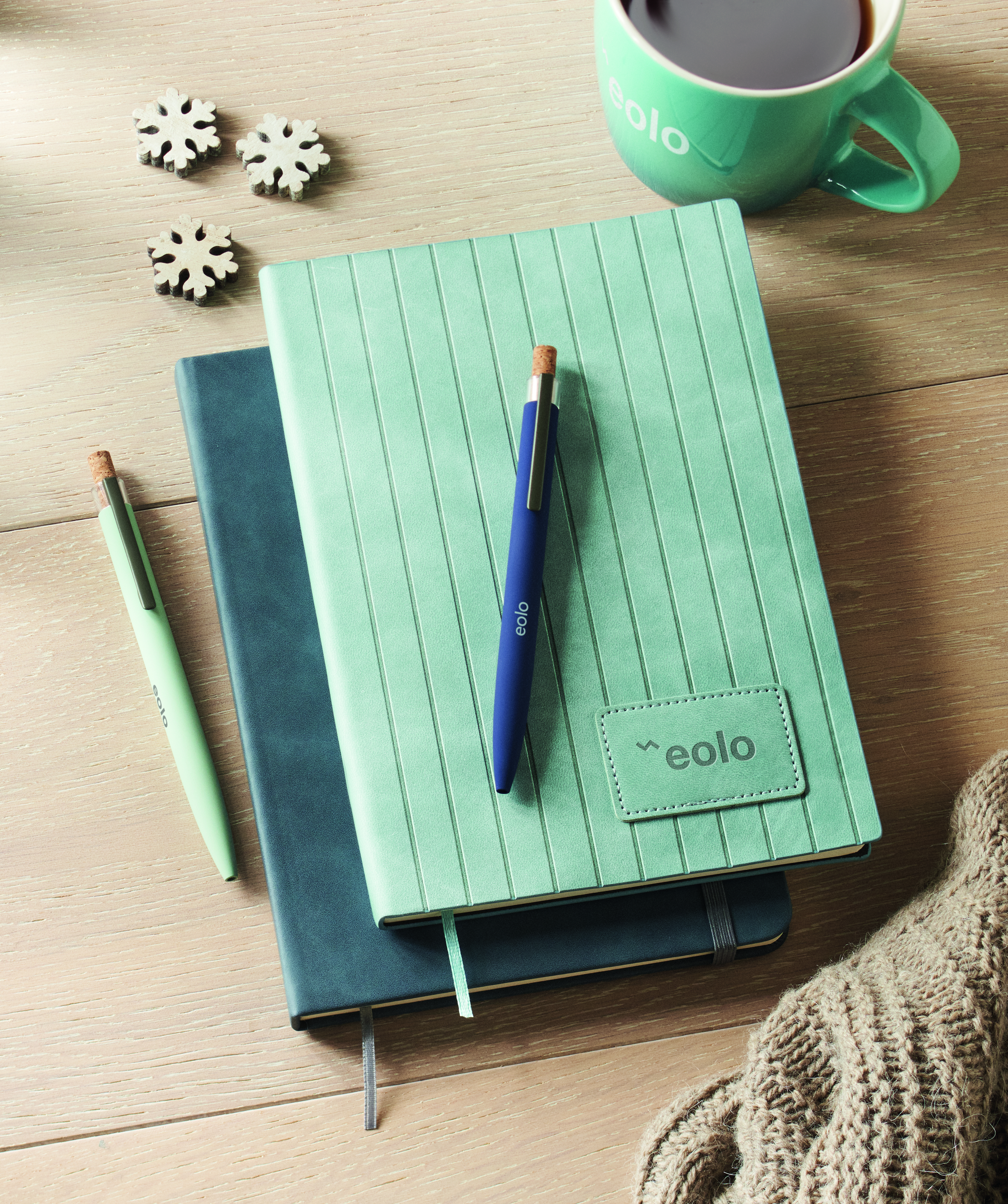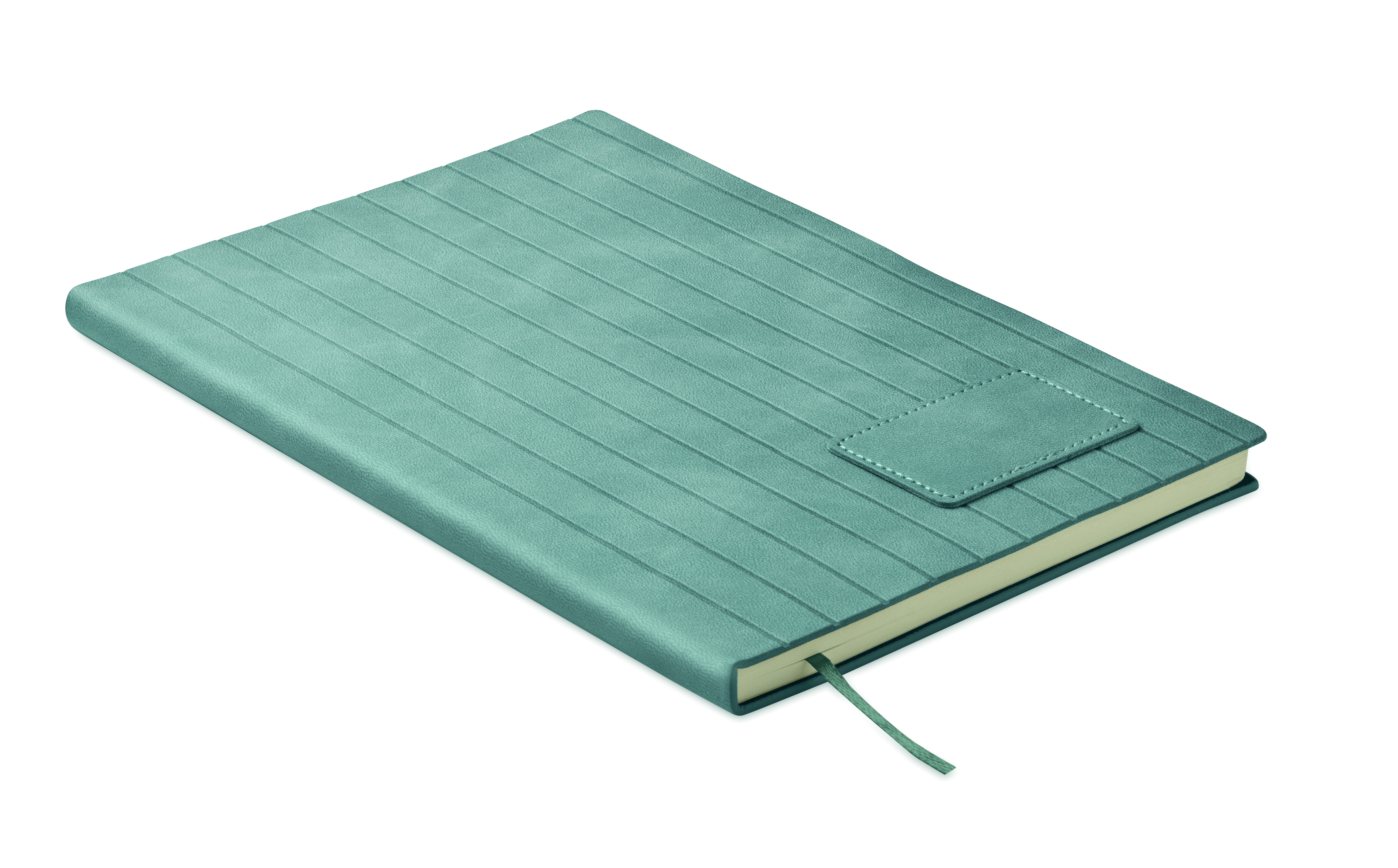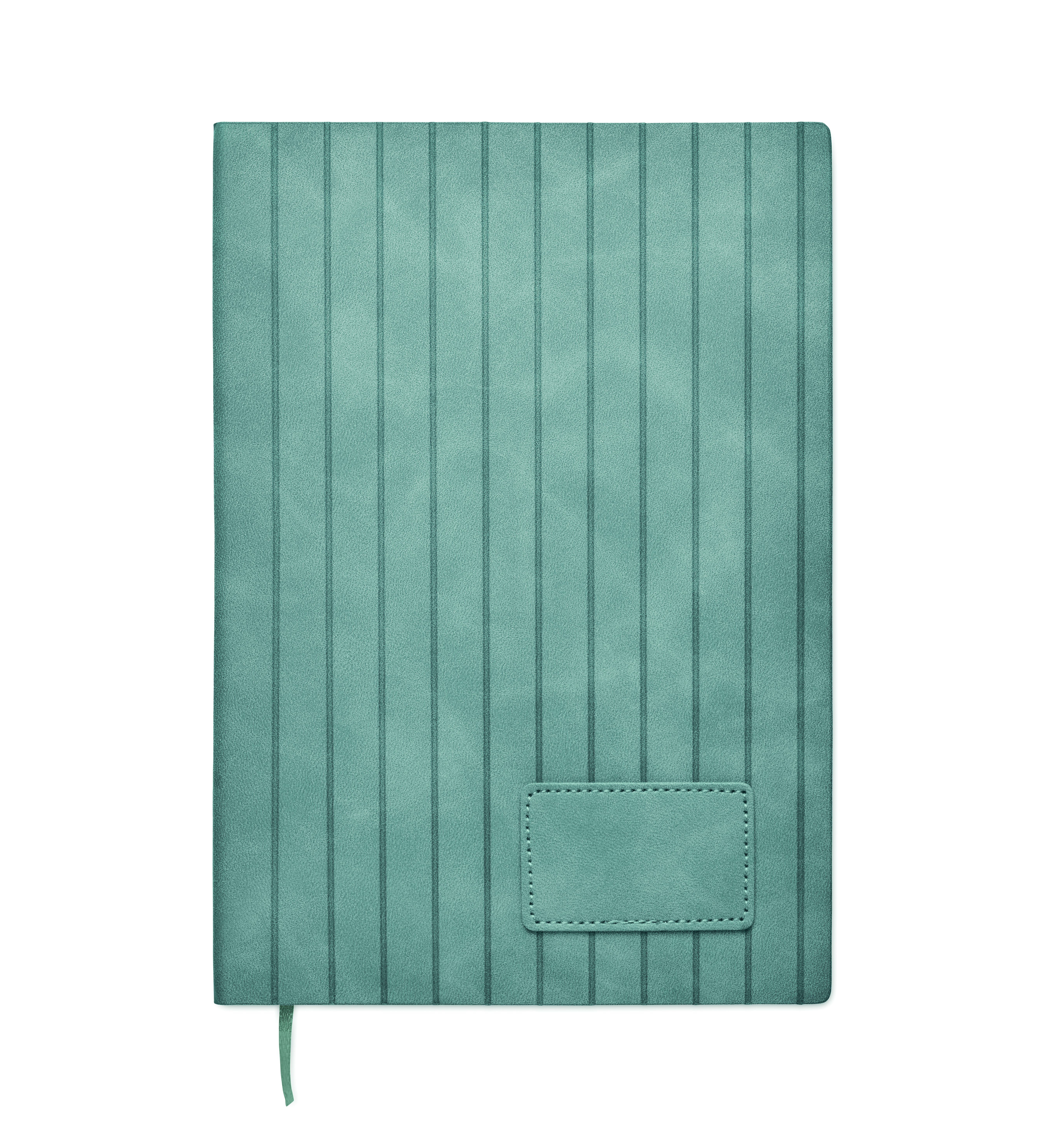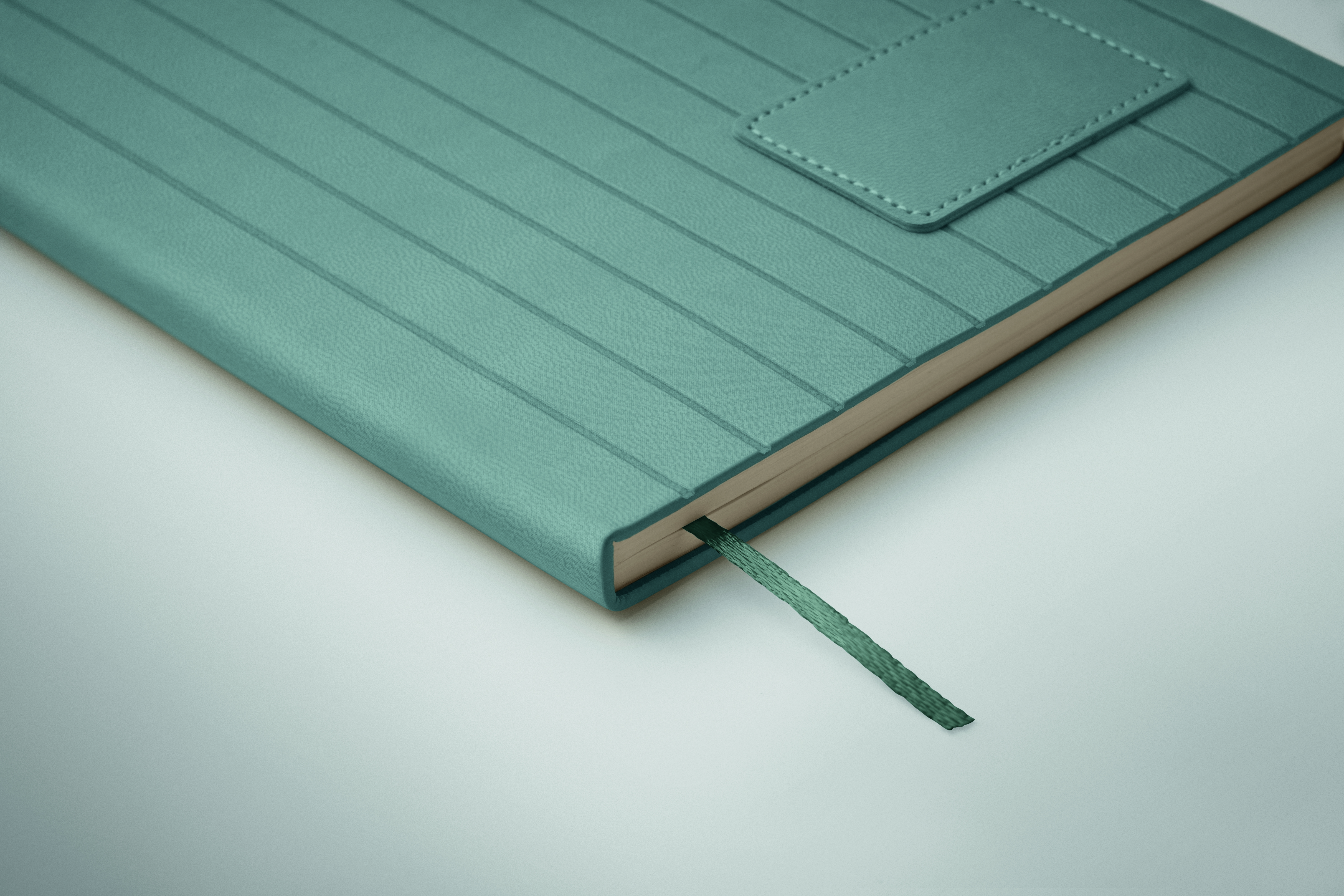 Notatnik A5 z miękką, prążkowaną okładką z PU wykonaną w 40% z materiałów pochodzących z recyklingu i w 60% z PU, z gładką naszywką z PU. 160 stron w linie, papier z recyklingu o gramaturze 70 g/m² (80 arkuszy). Dopasowany kolorystycznie znacznik strony z tasiemki.